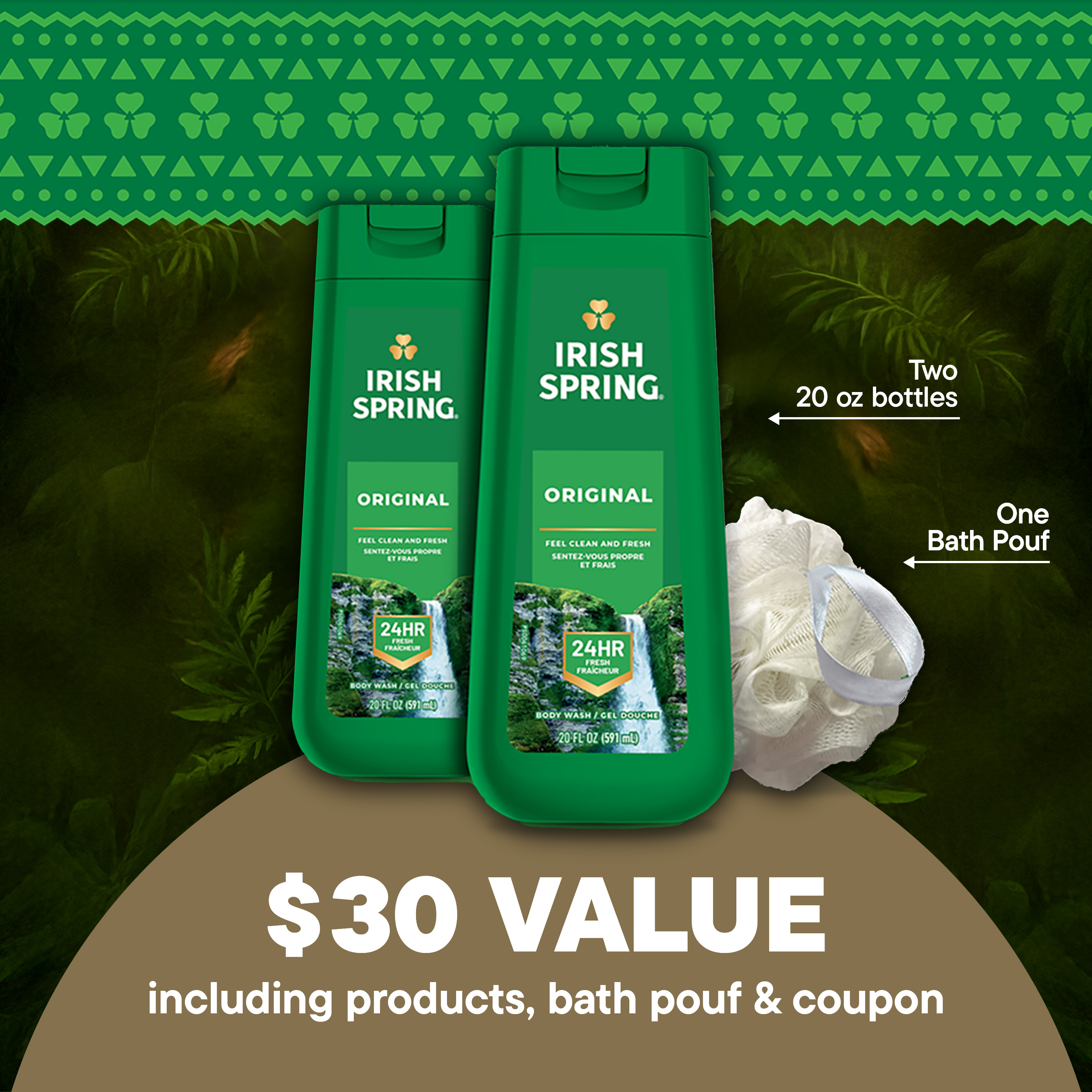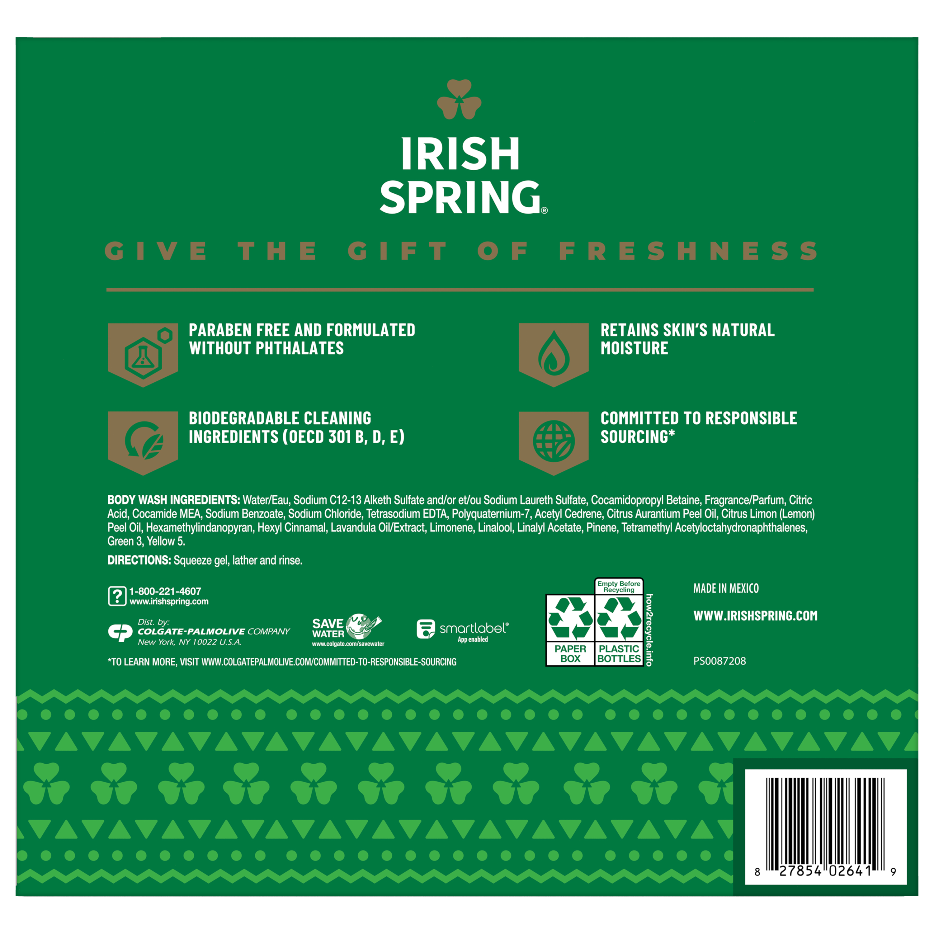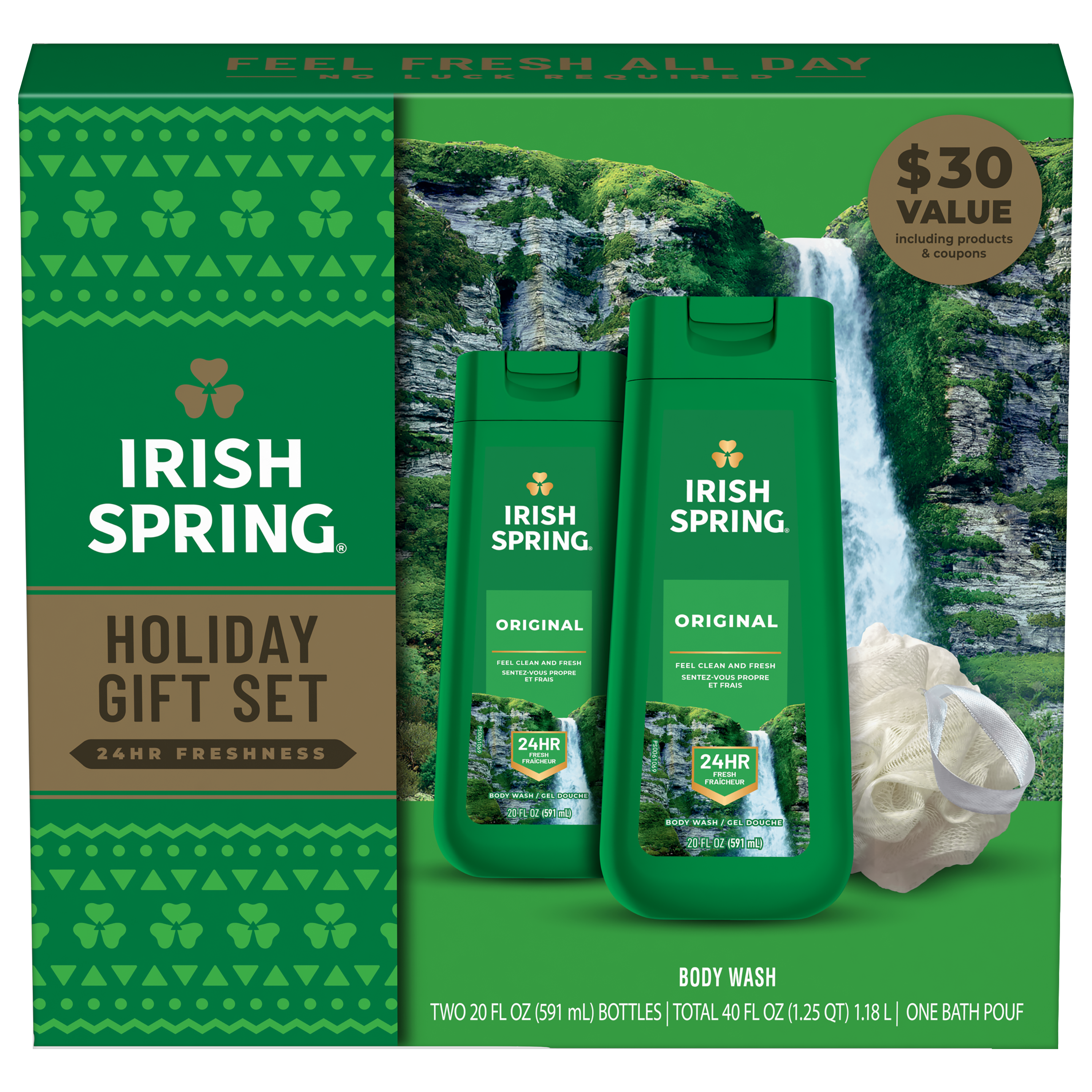 SKU 61053312 Consumer Unit - GTIN 00827854026419 Case - GTIN 10827854026416 Product Category Personal Care Product Sub Category Body Wash Product Equity (Brand) Irish Spring Product Sub Brand Irish Spring BW Product Title Irish Spring Original Body Wash Gift Set, Paraben Free, 2 x 20 fl oz Bottles Plus Bath Pouf Product Description Elevate your daily routine or holiday gifting with the Irish Spring Original Gift Set, designed to deliver fresh, clean confidence all day long. This men’s holiday set includes two 20 fl oz bottles of Irish Spring Original Body Wash and a durable bath pouf to gently exfoliate. Each bottle is infused with a crisp fragrance blend of bergamot, green notes, and a hint of mint for a revitalizing shower experience. The formula helps retain your skin’s natural moisture. Irish Spring body wash is paraben free and suitable for use on both face and body, simplifying your shower routine. The gift set is valued at $30, including products and coupons, making it an excellent choice for gifting to friends, family, or yourself. Give the gift of invigorating scent and refreshed skin this holiday season with this Irish Spring men’s body wash gift set. Bullet 1 Gift set includes two 20 fl oz bottles of Irish Spring Original Body Wash plus a bath pouf for a complete shower routine Bullet 2 Our men’s body wash features a crisp, clean scent with refreshing bergamot, green notes, and a hint of mint for daily freshness Bullet 3 The perfect gift for anyone on your list, this holiday gift set delivers 24-hour freshness and helps retain your skin’s natural moisture Bullet 4 Great holiday or winter gift set for men or anyone who loves 24-hour freshness and classic scents Bullet 5 This men’s bath set is paraben free and formulated without phthalates Walmart RPC 16360905918 Walmart URL (Computed) https://www.walmart.com/ip/a/16360905918
