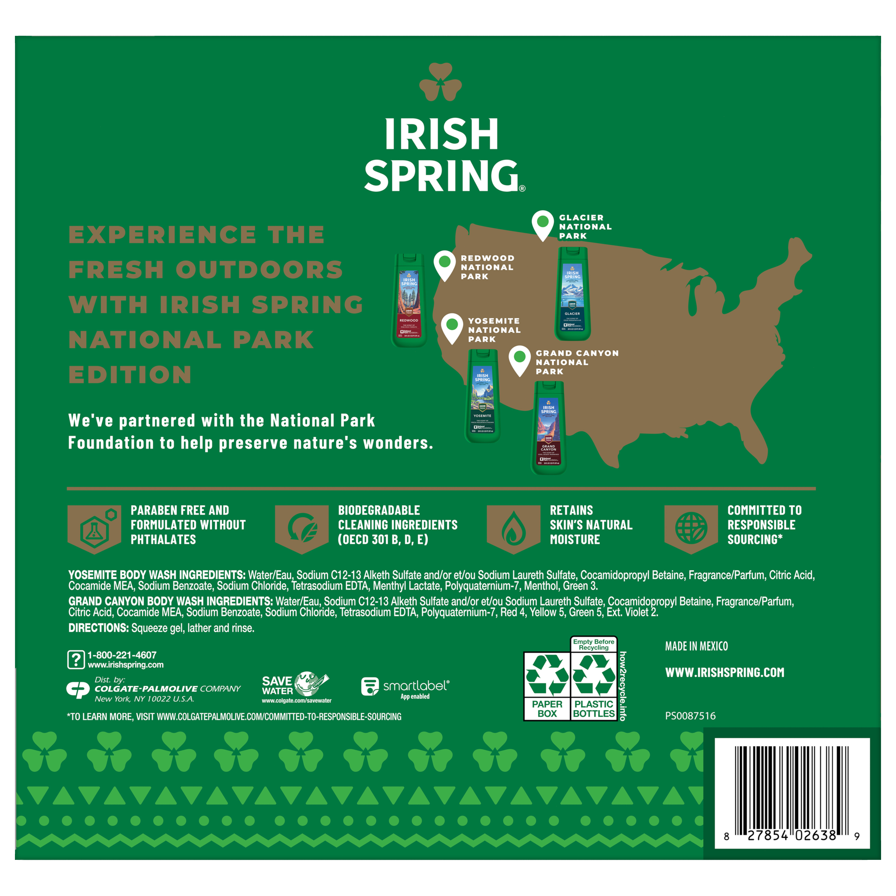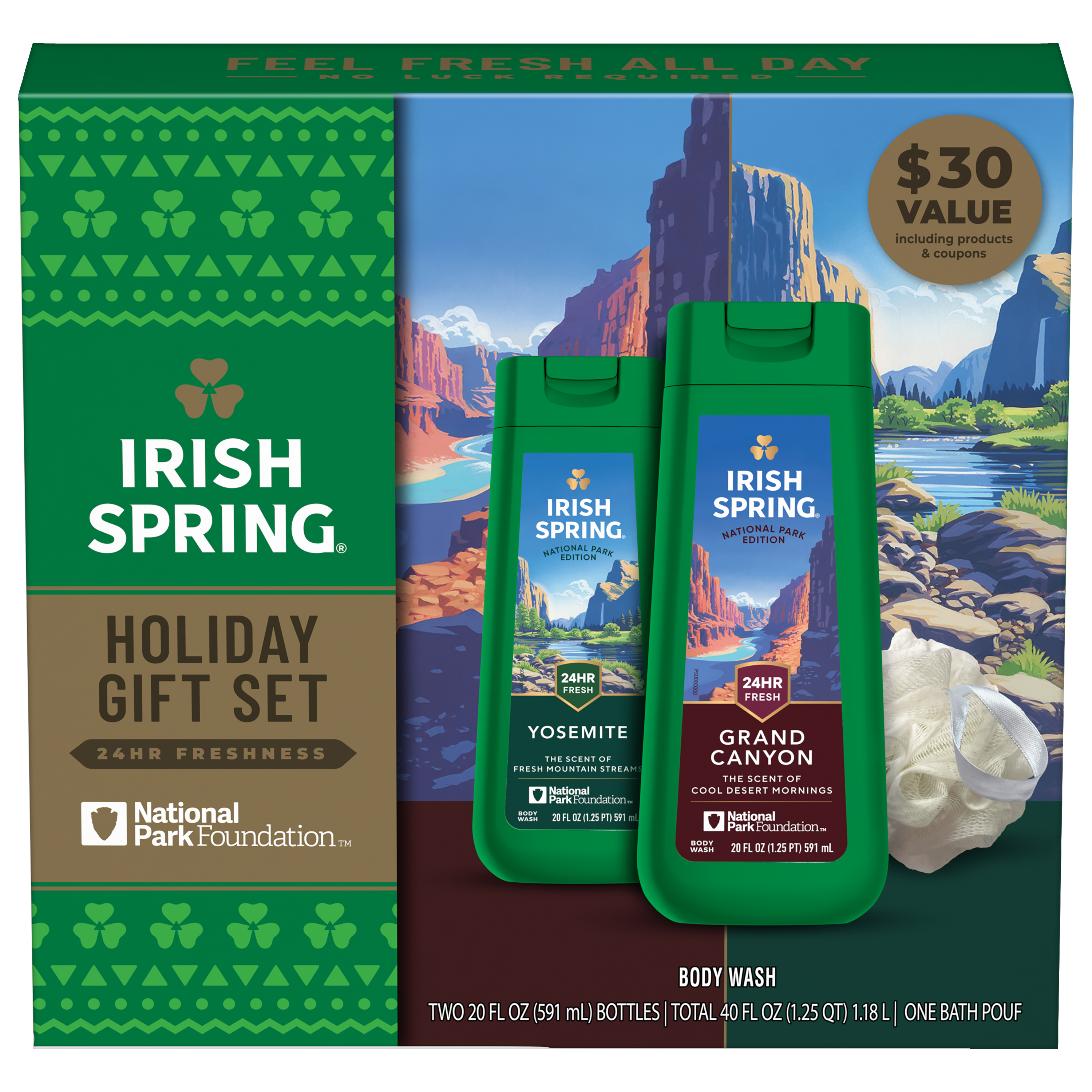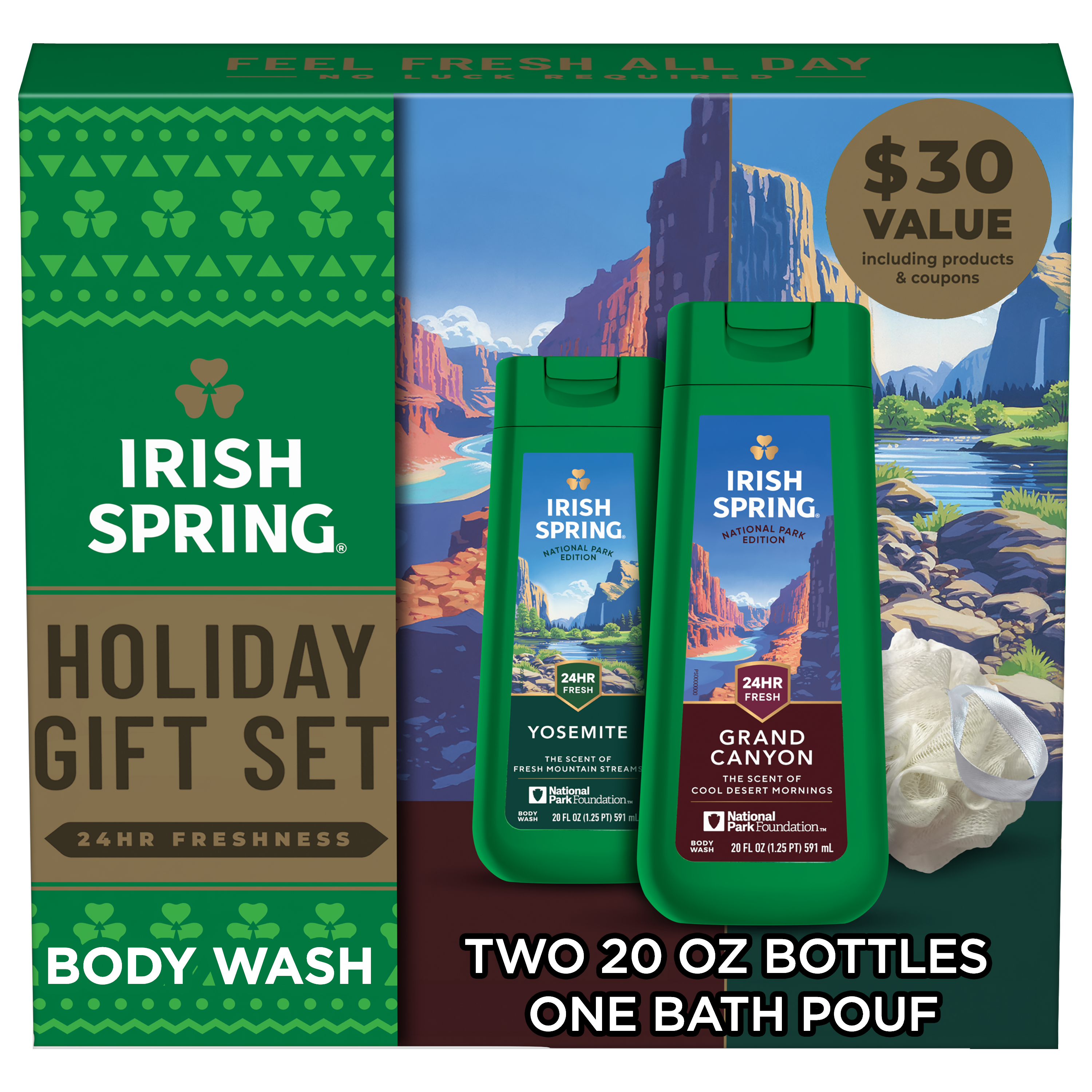 SKU 61053327 Consumer Unit - GTIN 00827854026389 Case - GTIN 10827854026386 Product Category Personal Care Product Sub Category Body Wash Product Equity (Brand) Irish Spring Product Sub Brand Irish Spring BW Product Title Irish Spring National Parks Limited Edition Gift Set, Yosemite & Grand Canyon Body Wash, 2 x 20 fl oz Bottles Plus Bath Pouf Product Description Experience the great outdoors every time you shower with the Irish Spring National Parks Limited Edition Gift Set, featuring exclusive scents inspired by Yosemite and the Grand Canyon. This men’s holiday set includes two 20 fl oz bottles of Irish Spring Body Wash and a durable bath pouf to gently exfoliate. Our Yosemite Body Wash has a cool, minty scent like fresh mountain air, and our Grand Canyon Body Wash offers a crisp, herbal scent reminiscent of a desert morning. The formula helps retain your skin’s natural moisture. Irish Spring body wash is paraben free and suitable for use on both face and body, simplifying your shower routine. This limited-edition set is valued at $30 with included products and coupons, making it a unique gift for friends, family, or yourself. Plus, we've partnered with the National Park Foundation to help preserve nature's wonders. Celebrate America’s natural beauty with Irish Spring National Parks Edition—freshness inspired by the wild. Bullet 1 Irish Spring Limited Edition National Parks Gift Set includes two 20 fl oz body washes inspired by Yosemite and the Grand Canyon plus a bath pouf for a complete shower routine Bullet 2 Yosemite Body Wash delivers a cool, minty scent reminiscent of fresh mountain air while Grand Canyon Body Wash provides a crisp, herbal scent like a desert morning Bullet 3 The perfect gift for anyone on your list, this holiday gift set delivers 24-hour freshness and helps retain your skin’s natural moisture Bullet 4 Great holiday or winter gift set for men or anyone who loves feeling clean and fresh and limited edition scents Bullet 5 The men’s bath set is paraben free and formulated without phthalates Walmart RPC 16336111553 Walmart URL (Computed) https://www.walmart.com/ip/a/16336111553