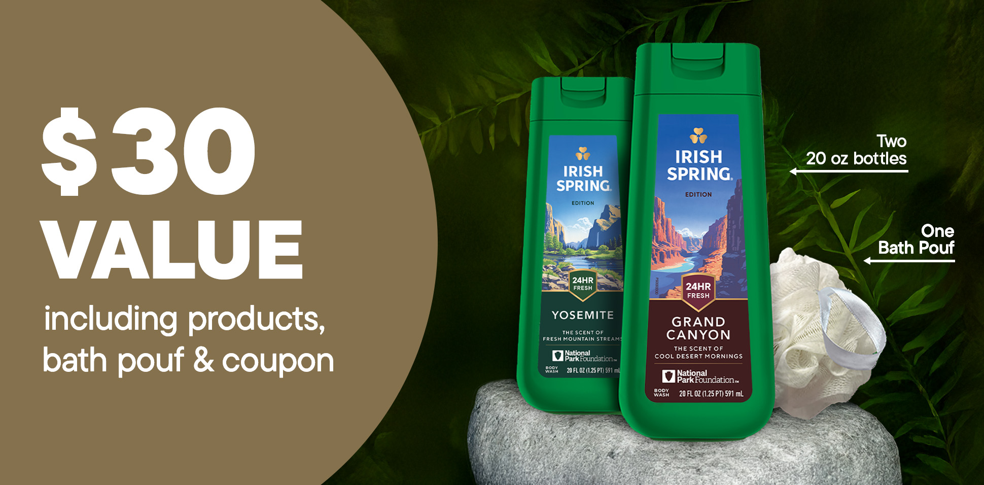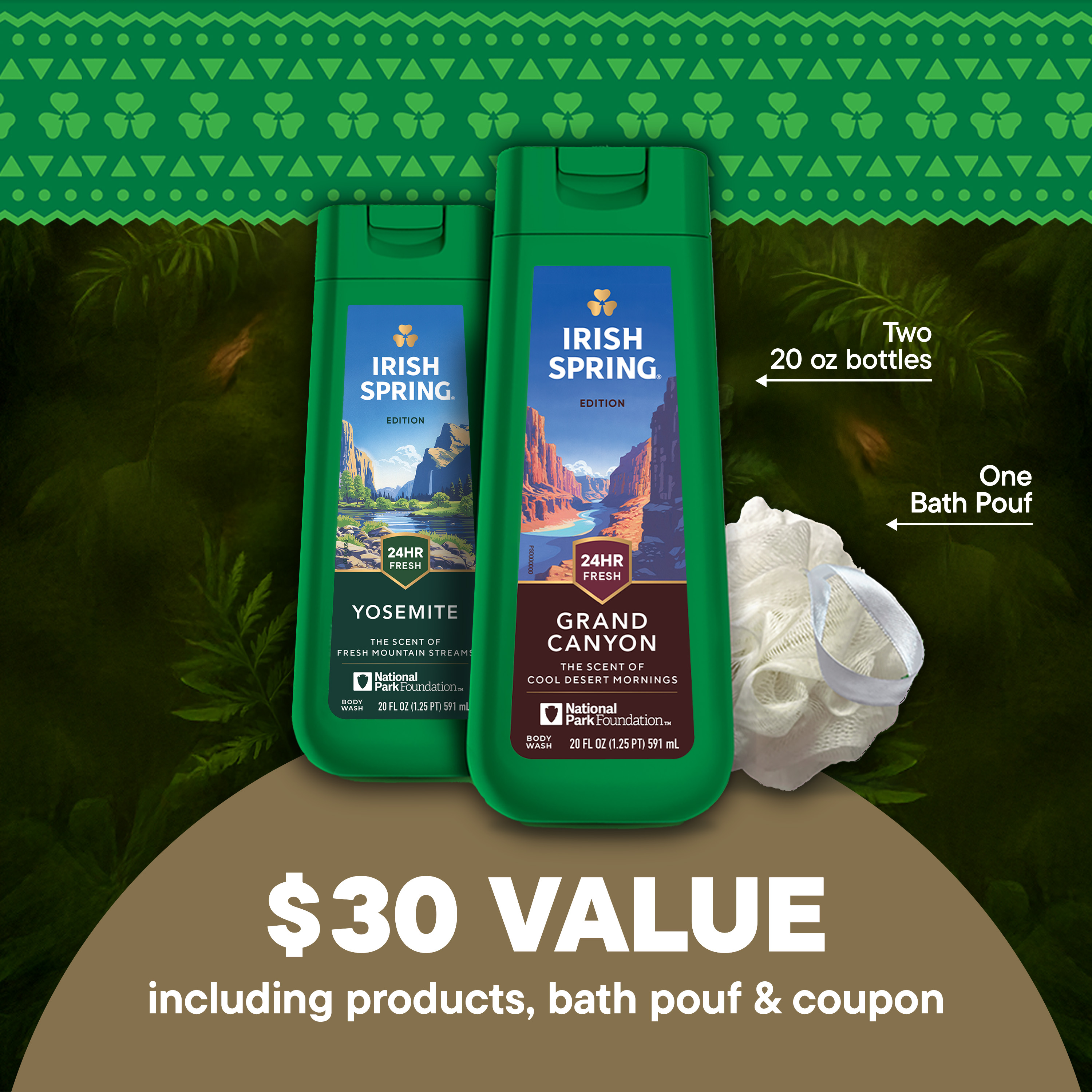 Irish Spring National Parks Limited Edition Gift Set, Yosemite & Grand Canyon Body Wash, 2 x 20 fl oz Bottles Plus Bath Pouf