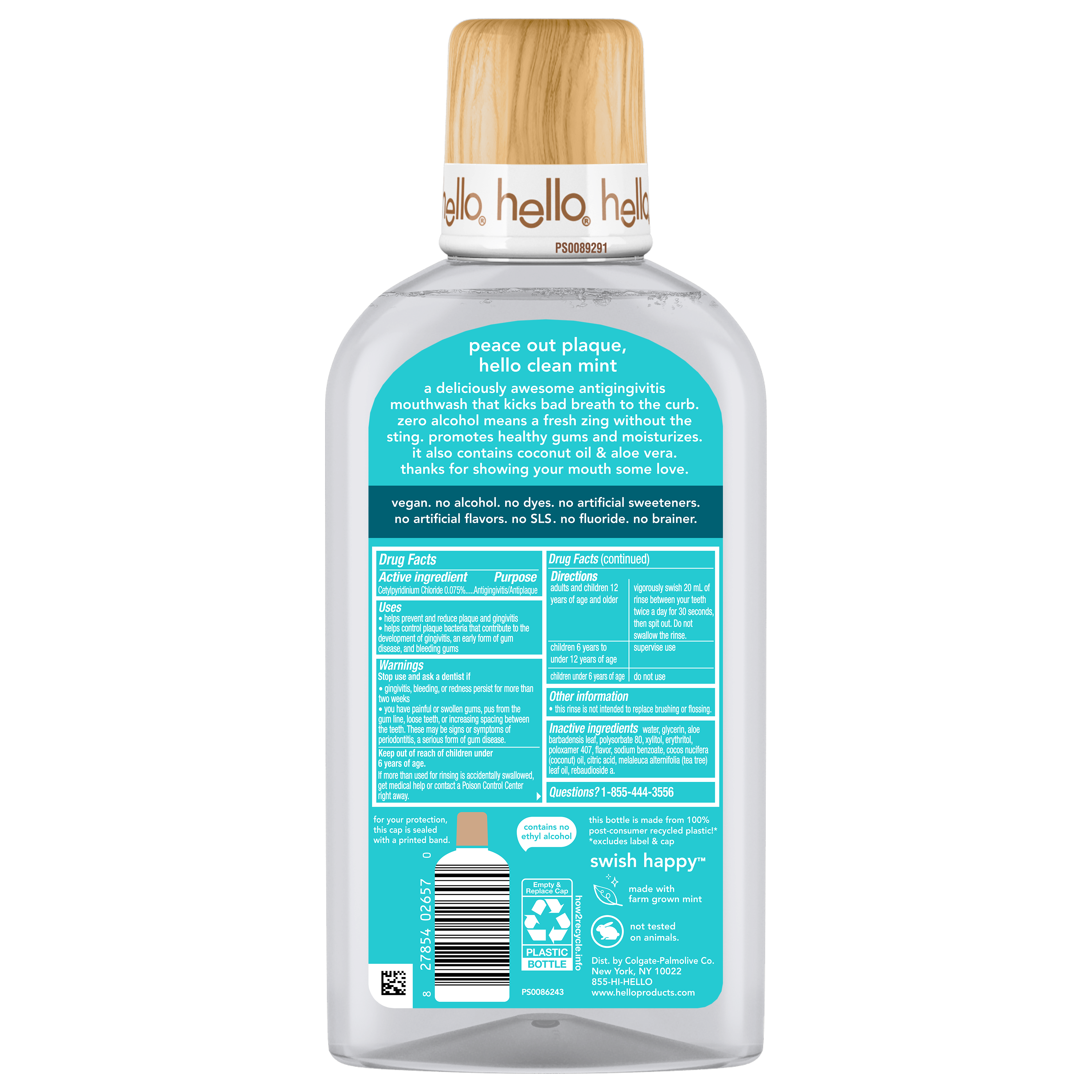 | Product Description | Say hello to a deliciously awesome antiplaque and antigingivitis mouthwash that kicks bad breath to the curb with hello Clean Mint Alcohol Free Mouthwash. This minty fluoride free mouthwash freshens like crazy and is specially formulated to promote healthy gums and moisturize. Thoughtfully crafted with refreshing farm grown mint, aloe vera, coconut oil, and zero alcohol, this no alcohol mouthwash offers a gentle, minty fresh zing without the sting. Swish in style. This hello mouthwash also comes in a reimagined, sleek clear bottle topped with a premium wood grain cap, instantly elevating your bathroom counter space. hello Clean Mint Mouthwash is a non alcohol mouthwash made with no fluoride, no artificial flavors, no artificial sweeteners, no dyes, no alcohol, and no SLS. Now that’s a no-brainer. Plus, this fluoride free CPC mouthwash is not tested on animals. With every swish, this minty mouthwash obliterates bad breath and leaves your mouth feeling minty fresh. Show your mouth some love. |