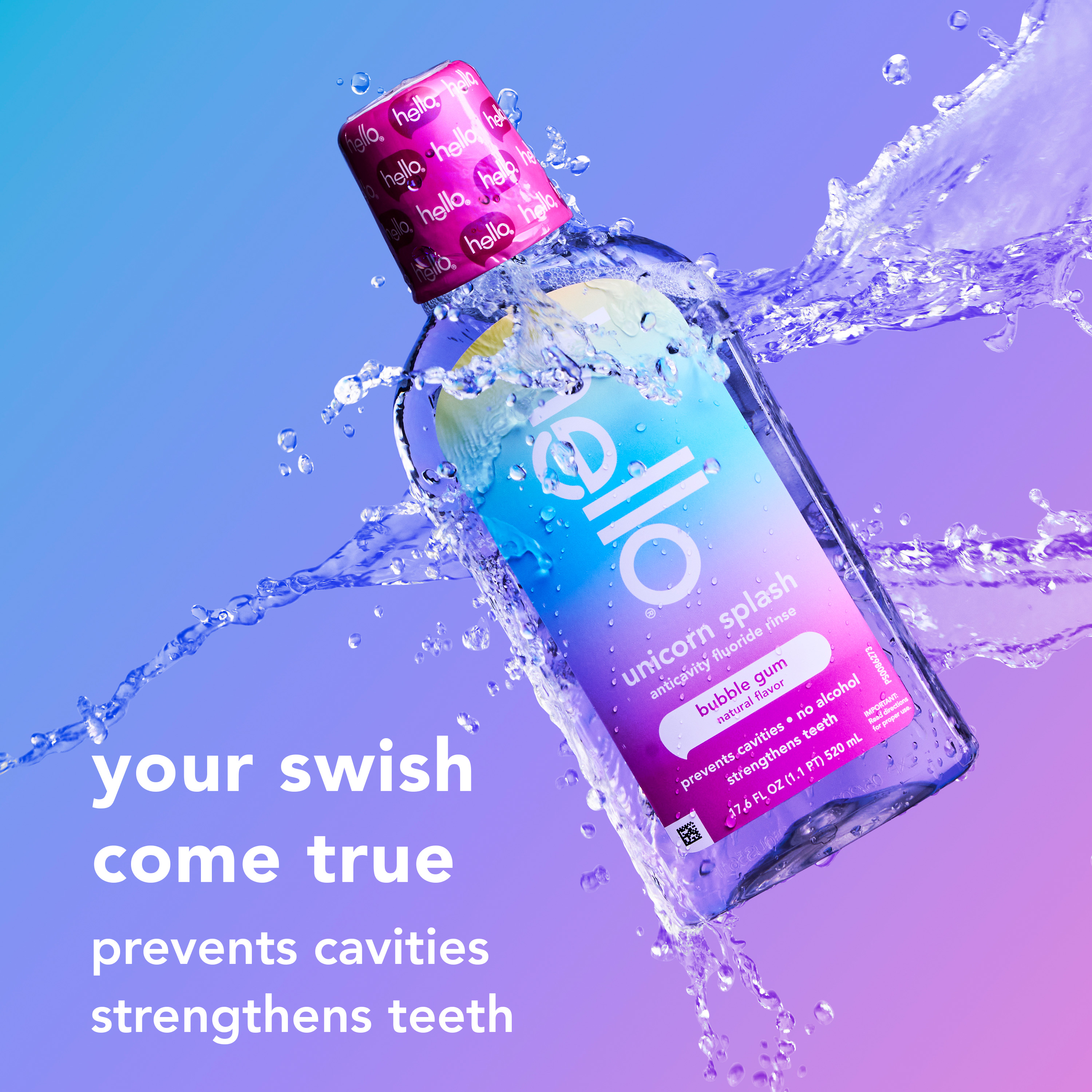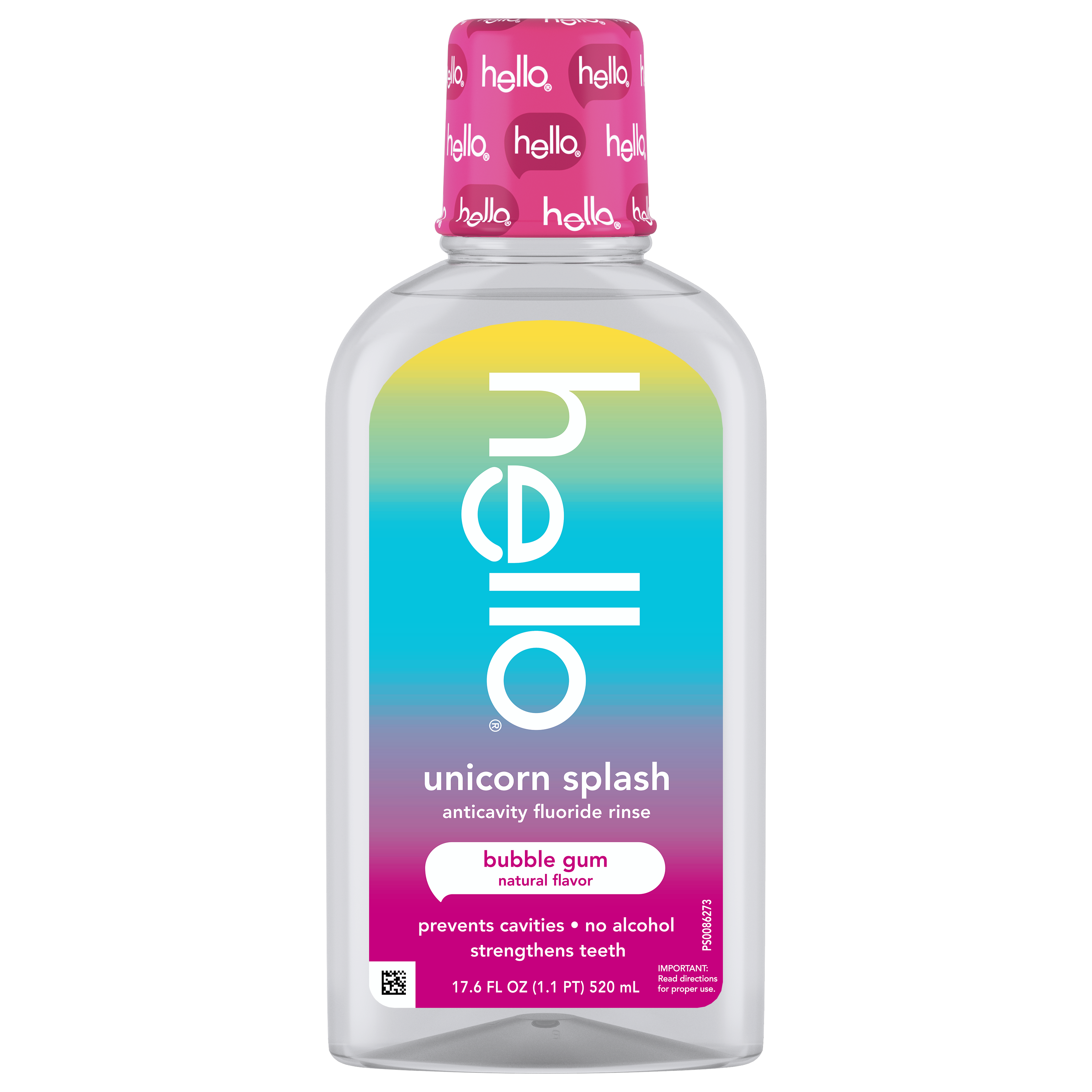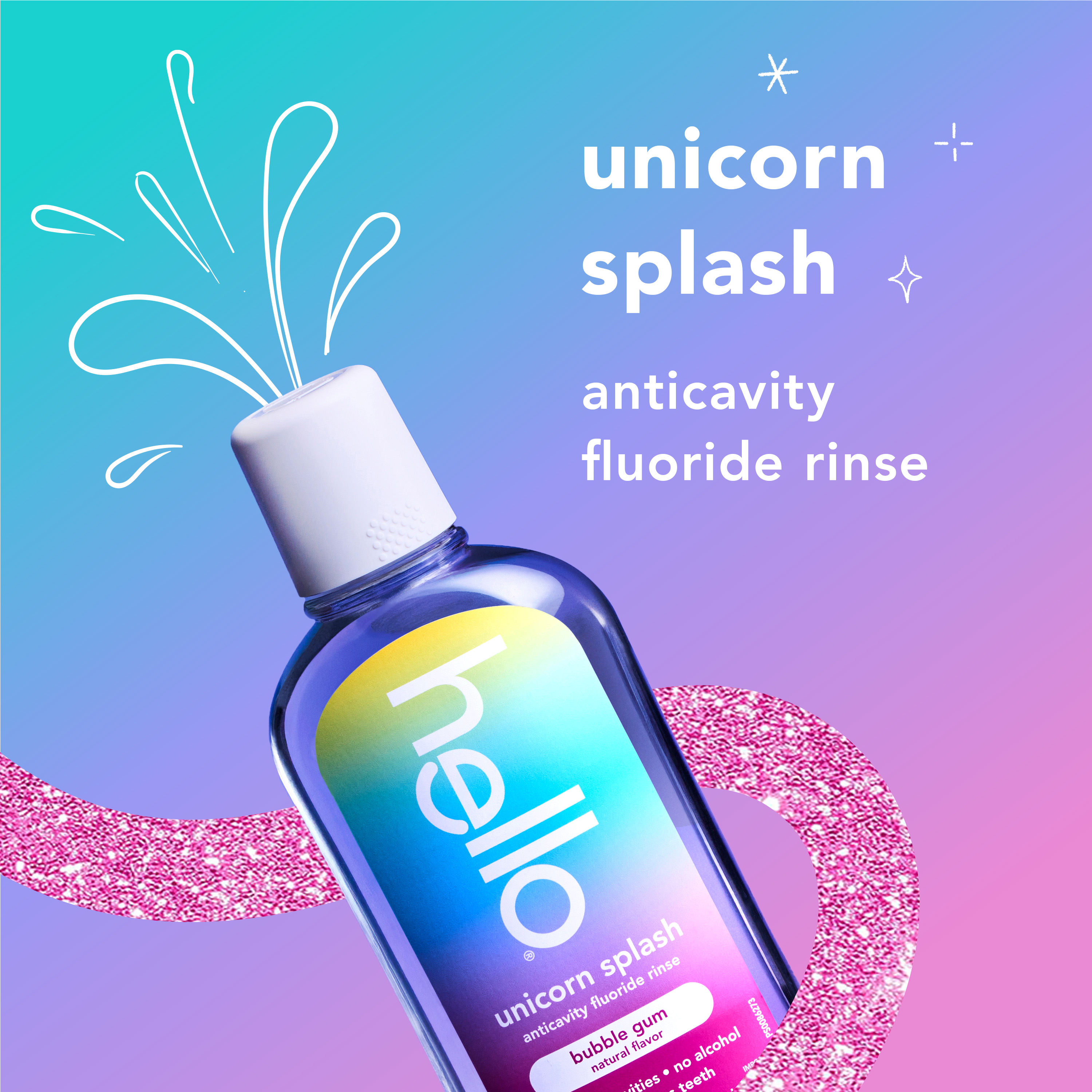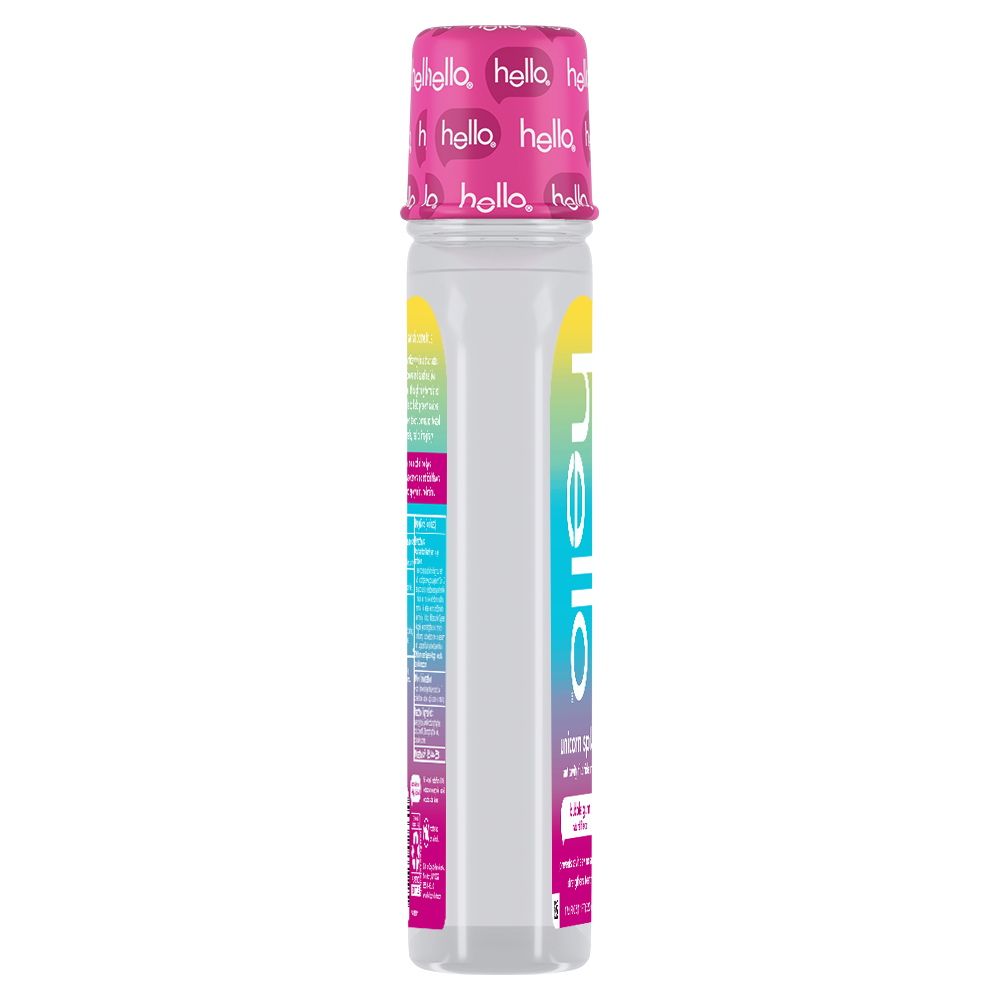SKU 61053493 Consumer Unit - GTIN 00827854026600 Case - GTIN 10827854026607 Product Category Oral Care Product Sub Category Mouthwash Product Equity (Brand) Hello Product Sub Brand Hello Kids MW Product Title hello Unicorn Splash Kids Mouthwash with Fluoride, Bubble Gum Natural Flavor, 17.6 fl oz Product Description Say hello to a magical fluoride mouthwash for kids that tastes like rainbows and sunshine (aka bubble gum) with hello Unicorn Splash Kids Mouthwash. Thoughtfully crafted with fluoride, this bubble gum mouthwash is designed to prevent cavities to help strengthen little smiles. This delightful tasting kids anticavity fluoride rinse is a fun way to protect their smile and add a bit of joy to their daily oral care routine. Gentle enough for even the most delicate mouths, this alcohol free mouthwash* ensures there’s zero burn, just a sweet, magical taste of natural bubble gum flavor to make cleaning those little smiles fun, tasty, and oh-so-effective. The reimagined, crystal-clear bottle design makes it easy for kids to see exactly how much delicious bubblegum mouthwash is left to rinse with too. hello Unicorn Splash Bubble Gum Kids Mouthwash is a vegan mouthwash for kids that contains no alcohol, no artificial sweeteners or flavors, no spicy mint, no SLS, and no dyes. Now that’s a no-brainer. Plus, this non-alcoholic oral rinse is not tested on animals, real or imaginary. Make their swish come true with hello Unicorn Splash Bubble Gum Mouthwash for Kids. *This formula does not contain ethyl alcohol. eCommerce Copy- Long Description Say hello to a magical fluoride mouthwash for kids that tastes like rainbows and sunshine (aka bubble gum) with hello Unicorn Splash Kids Mouthwash. Thoughtfully crafted with fluoride, this bubble gum mouthwash is designed to prevent cavities to help strengthen little smiles. This delightful tasting kids anticavity fluoride rinse is a fun way to protect their smile and add a bit of joy to their daily oral care routine. Gentle enough for even the most delicate mouths, this alcohol free mouthwash* ensures there’s zero burn, just a sweet, magical taste of natural bubble gum flavor to make cleaning those little smiles fun, tasty, and oh-so-effective. The reimagined, crystal-clear bottle design makes it easy for kids to see exactly how much delicious bubblegum mouthwash is left to rinse with too. hello Unicorn Splash Bubble Gum Kids Mouthwash is a vegan mouthwash for kids that contains no alcohol, no artificial sweeteners or flavors, no spicy mint, no SLS, and no dyes. Now that’s a no-brainer. Plus, this non-alcoholic oral rinse is not tested on animals, real or imaginary. Make their swish come true with hello Unicorn Splash Bubble Gum Mouthwash for Kids. *this formula does not contain ethyl alcohol Bullet 1 Includes one (1) 17.6 fl oz bottle of hello Unicorn Splash Kids Mouthwash with Fluoride, Alcohol Free* Natural Flavor Bubblegum Mouthwash Bullet 2 The bubble gum mouthwash for kids tastes magical and works brilliantly to fight cavities thanks to its fluoride based oral rinse formula Bullet 3 This hello kids mouthwash is an alcohol free mouthwash so it won’t burn when they swish upon a star Bullet 4 This fluoride anticavity mouthwash for kids helps prevent cavities and strengthens teeth Bullet 5 This kids fluoride mouthwash is vegan and made with no artificial flavors, sweeteners, dyes, alcohol, or SLS Bullet 6 The reimagined, crystal-clear bottle design makes it easy for kids to see exactly how much delicious bubblegum mouthwash is left to rinse with Bullet 7 Make their swish come true with hello Unicorn Splash Bubble Gum Mouthwash for Kids Active Ingredients Sodium Fluoride 0.045% (0.02% w/v fluoride ion)