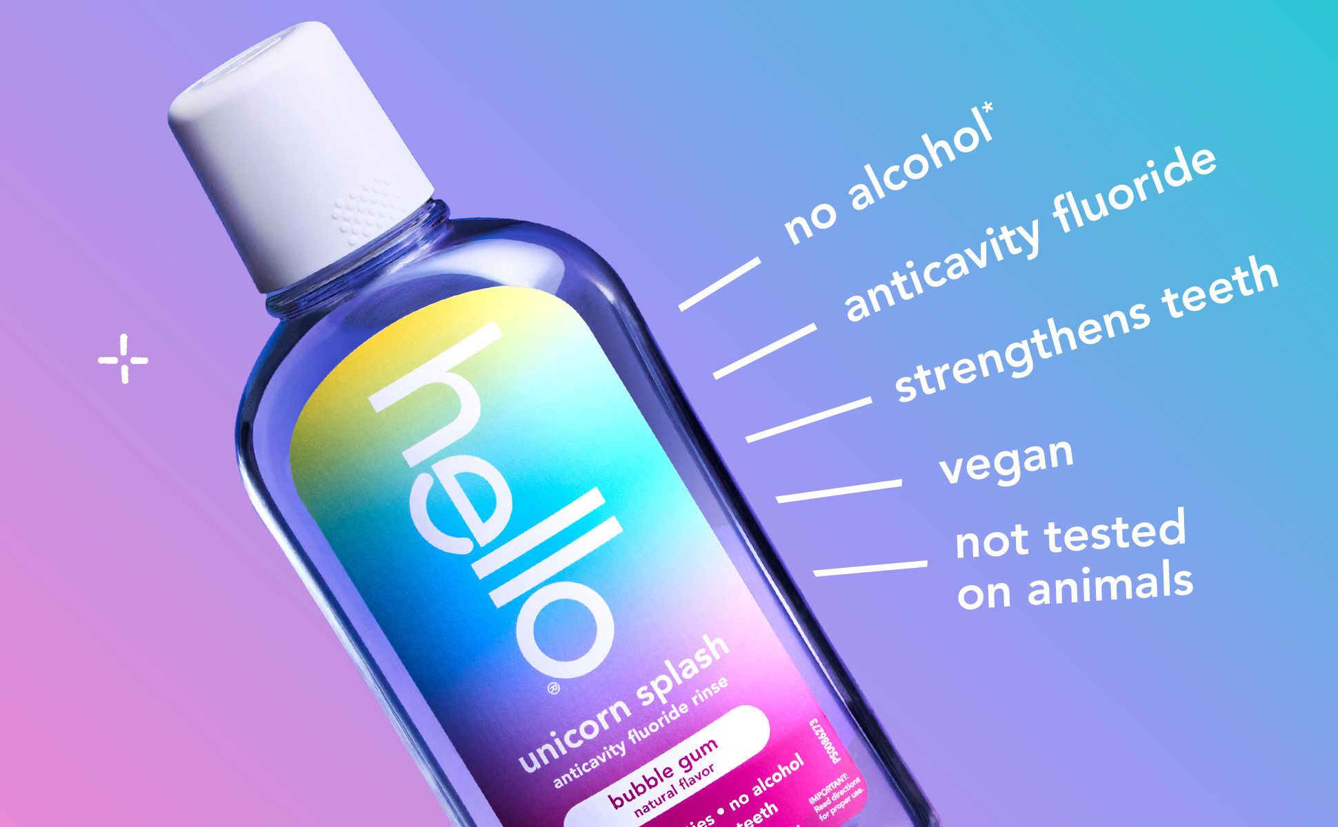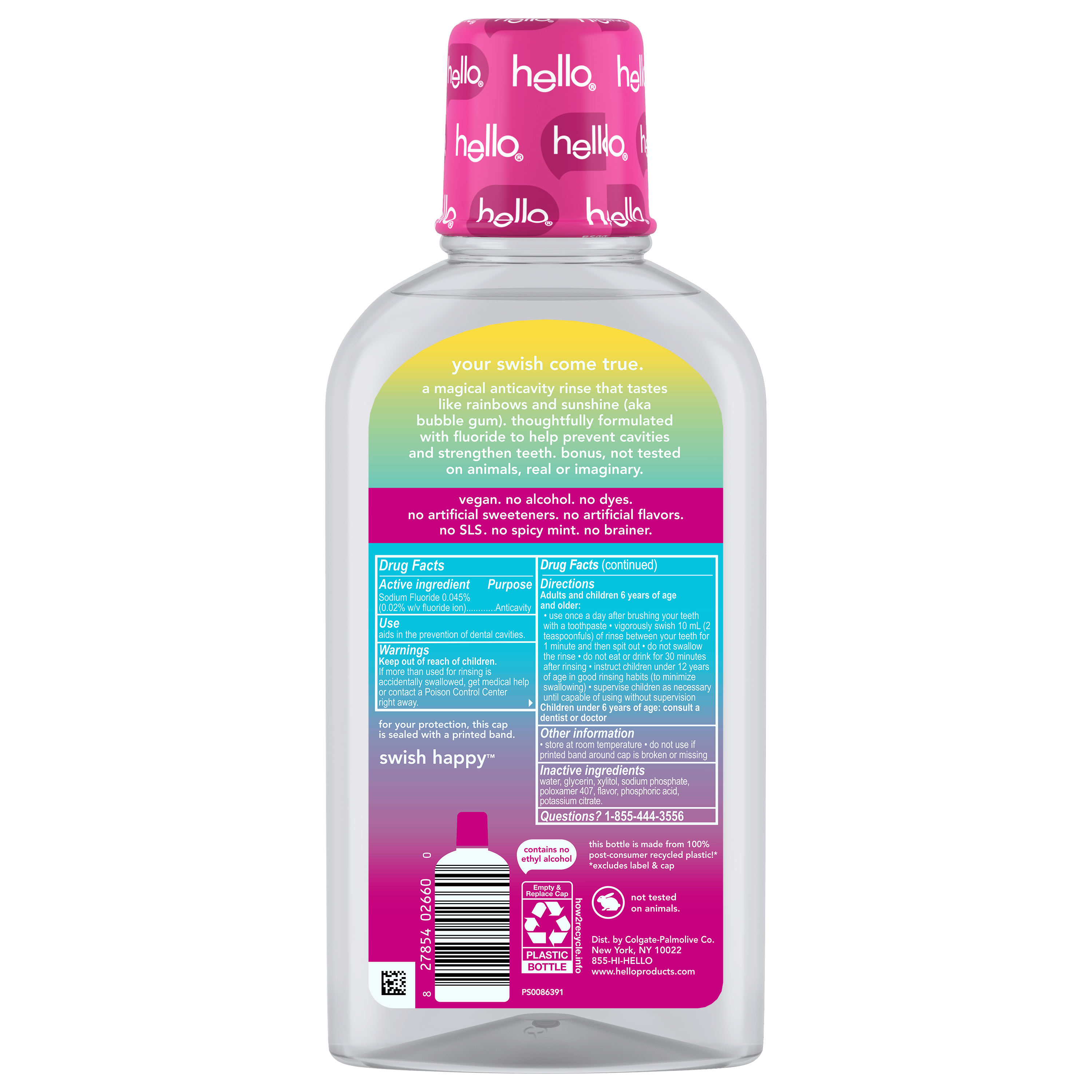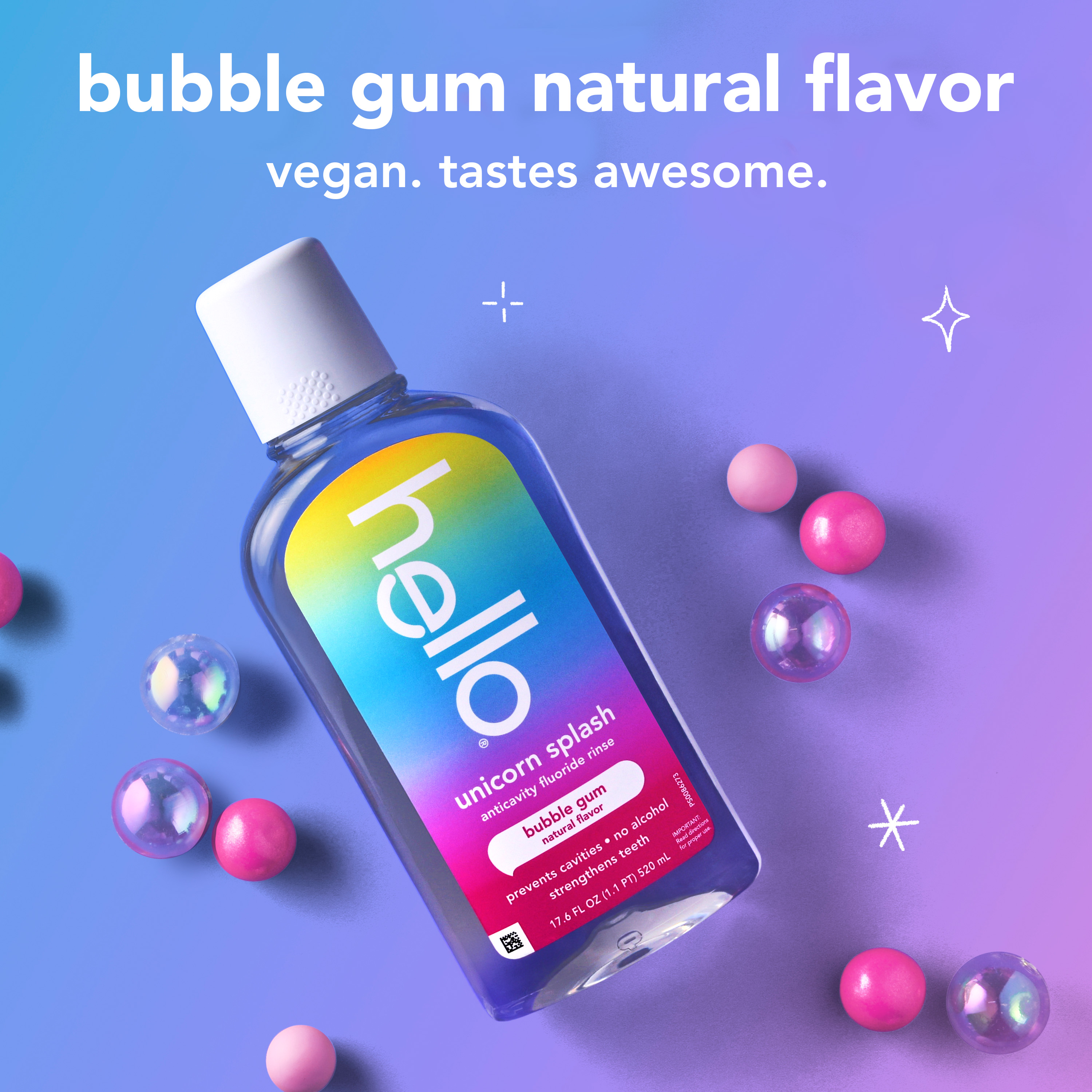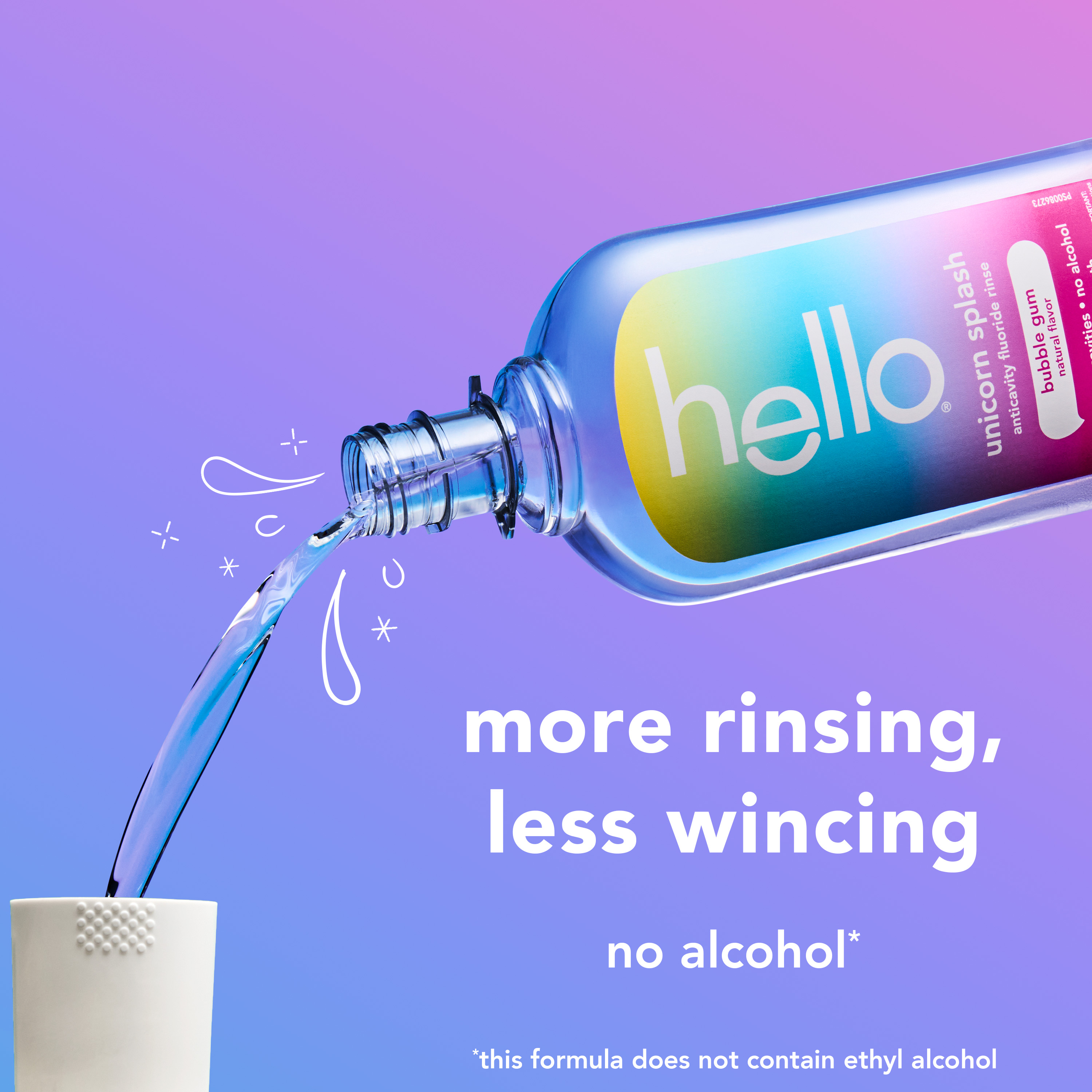 SKU 61053493 Consumer Unit - GTIN 00827854026600 Case - GTIN 10827854026607 Product Category Oral Care Product Sub Category Mouthwash Product Equity (Brand) Hello Product Sub Brand Hello Kids MW Product Title hello Unicorn Splash Kids Mouthwash with Fluoride, Bubble Gum Natural Flavor, 17.6 fl oz Product Description Say hello to a magical fluoride mouthwash for kids that tastes like rainbows and sunshine (aka bubble gum) with hello Unicorn Splash Kids Mouthwash. Thoughtfully crafted with fluoride, this bubble gum mouthwash is designed to prevent cavities to help strengthen little smiles. This delightful tasting kids anticavity fluoride rinse is a fun way to protect their smile and add a bit of joy to their daily oral care routine. Gentle enough for even the most delicate mouths, this alcohol free mouthwash* ensures there’s zero burn, just a sweet, magical taste of natural bubble gum flavor to make cleaning those little smiles fun, tasty, and oh-so-effective. The reimagined, crystal-clear bottle design makes it easy for kids to see exactly how much delicious bubblegum mouthwash is left to rinse with too. hello Unicorn Splash Bubble Gum Kids Mouthwash is a vegan mouthwash for kids that contains no alcohol, no artificial sweeteners or flavors, no spicy mint, no SLS, and no dyes. Now that’s a no-brainer. Plus, this non-alcoholic oral rinse is not tested on animals, real or imaginary. Make their swish come true with hello Unicorn Splash Bubble Gum Mouthwash for Kids. *This formula does not contain ethyl alcohol. eCommerce Copy- Long Description Say hello to a magical fluoride mouthwash for kids that tastes like rainbows and sunshine (aka bubble gum) with hello Unicorn Splash Kids Mouthwash. Thoughtfully crafted with fluoride, this bubble gum mouthwash is designed to prevent cavities to help strengthen little smiles. This delightful tasting kids anticavity fluoride rinse is a fun way to protect their smile and add a bit of joy to their daily oral care routine. Gentle enough for even the most delicate mouths, this alcohol free mouthwash* ensures there’s zero burn, just a sweet, magical taste of natural bubble gum flavor to make cleaning those little smiles fun, tasty, and oh-so-effective. The reimagined, crystal-clear bottle design makes it easy for kids to see exactly how much delicious bubblegum mouthwash is left to rinse with too. hello Unicorn Splash Bubble Gum Kids Mouthwash is a vegan mouthwash for kids that contains no alcohol, no artificial sweeteners or flavors, no spicy mint, no SLS, and no dyes. Now that’s a no-brainer. Plus, this non-alcoholic oral rinse is not tested on animals, real or imaginary. Make their swish come true with hello Unicorn Splash Bubble Gum Mouthwash for Kids. *this formula does not contain ethyl alcohol Bullet 1 Includes one (1) 17.6 fl oz bottle of hello Unicorn Splash Kids Mouthwash with Fluoride, Alcohol Free* Natural Flavor Bubblegum Mouthwash Bullet 2 The bubble gum mouthwash for kids tastes magical and works brilliantly to fight cavities thanks to its fluoride based oral rinse formula Bullet 3 This hello kids mouthwash is an alcohol free mouthwash so it won’t burn when they swish upon a star Bullet 4 This fluoride anticavity mouthwash for kids helps prevent cavities and strengthens teeth Bullet 5 This kids fluoride mouthwash is vegan and made with no artificial flavors, sweeteners, dyes, alcohol, or SLS Bullet 6 The reimagined, crystal-clear bottle design makes it easy for kids to see exactly how much delicious bubblegum mouthwash is left to rinse with Bullet 7 Make their swish come true with hello Unicorn Splash Bubble Gum Mouthwash for Kids Active Ingredients Sodium Fluoride 0.045% (0.02% w/v fluoride ion)