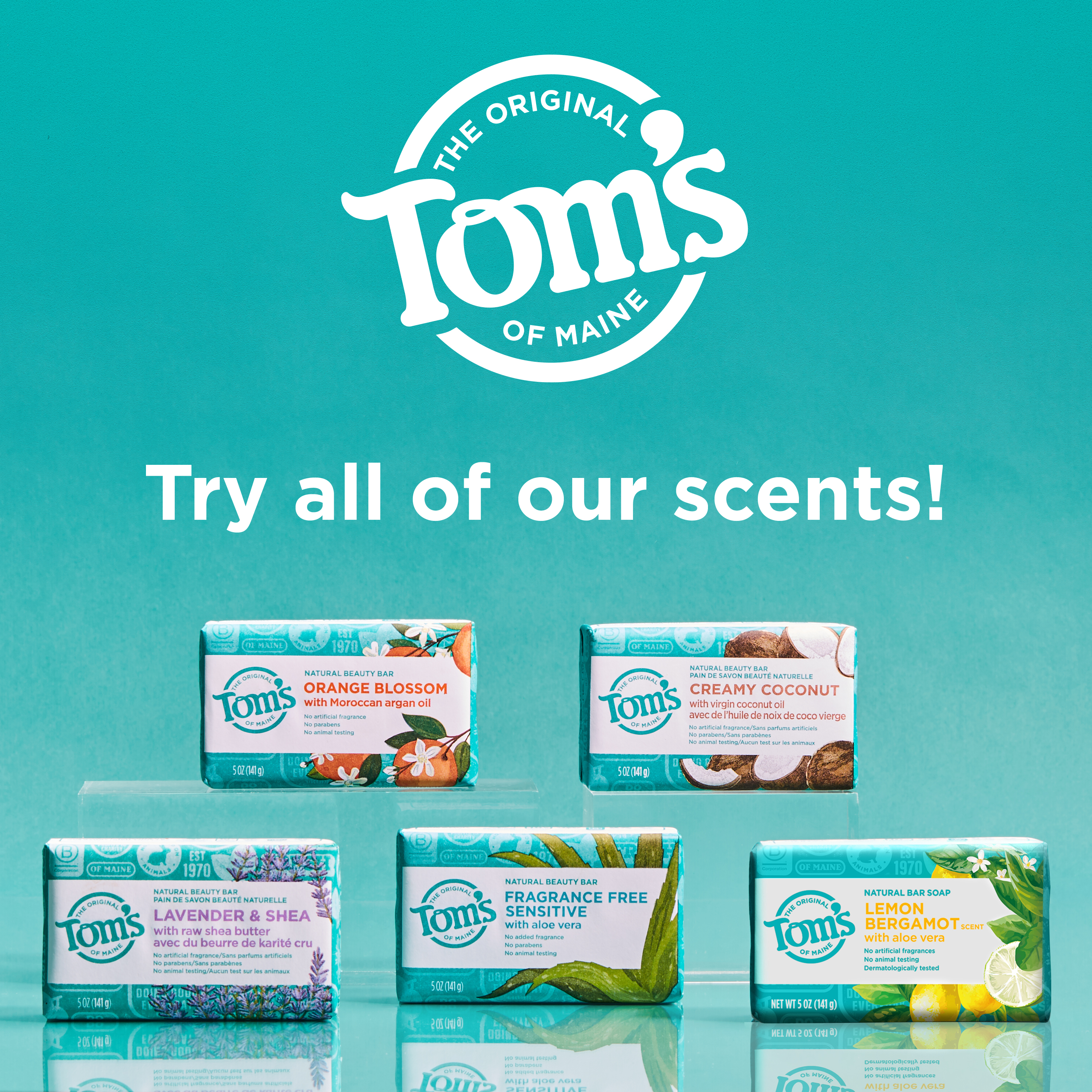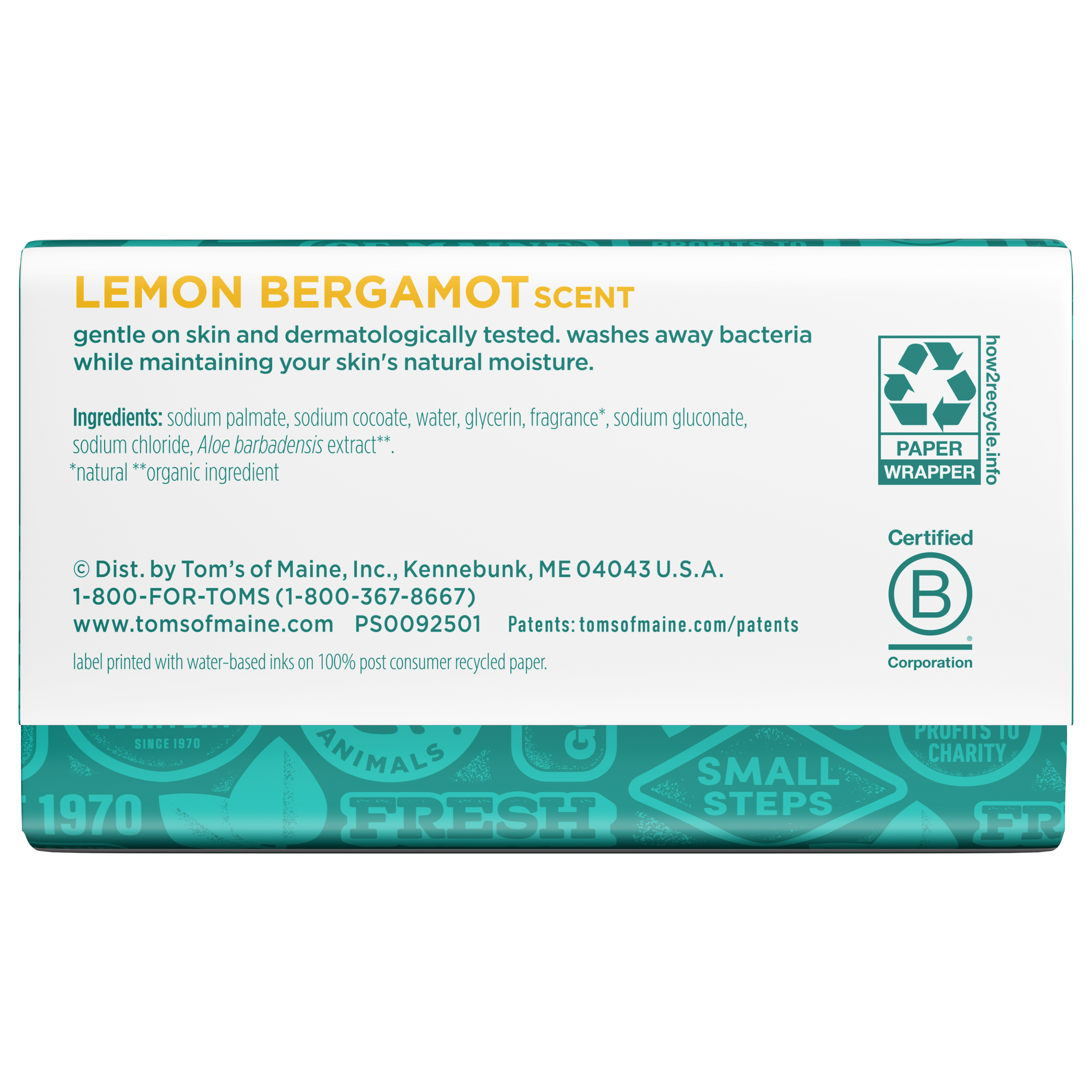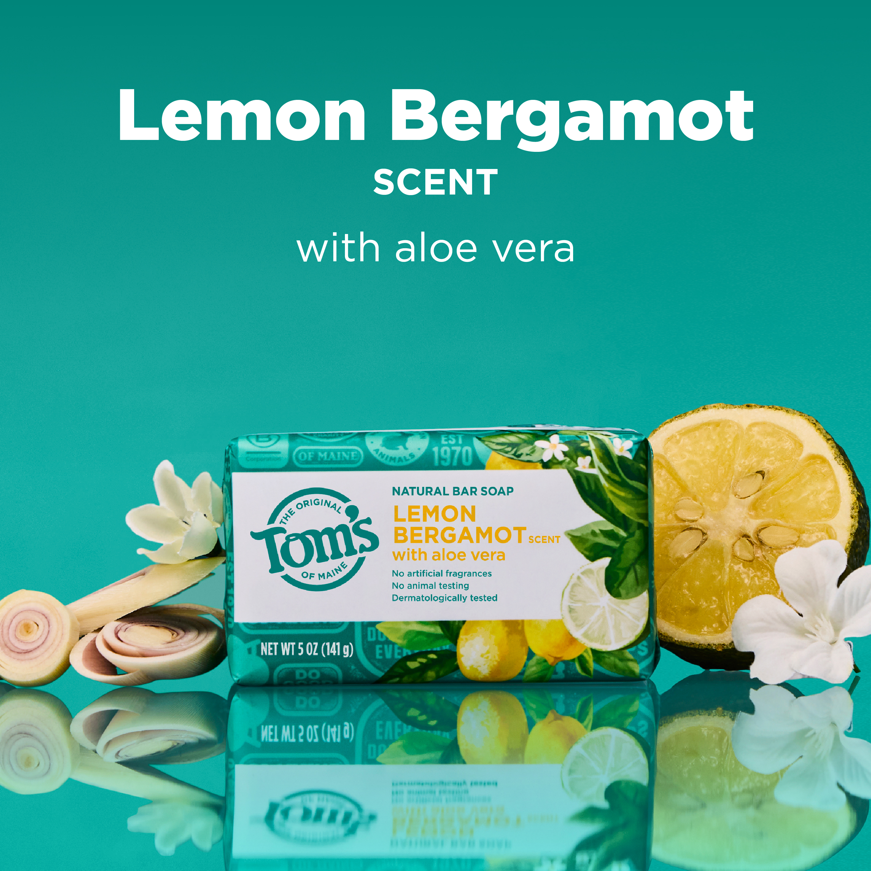 SKU 61053494 Consumer Unit - GTIN 00827854026655 Case - GTIN 10827854026652 Product Category Personal Care Product Sub Category Bar Soap Product Equity (Brand) Tom's of Maine Product Sub Brand Tom's Natural Beauty BS Product Title Tom’s of Maine Lemon Bergamot Natural Bar Soap with Aloe Vera, Dermatologically Tested, Paraben Free, Vegan, 5 oz Product Description Elevate your daily routine with Tom’s of Maine Lemon Bergamot Natural Bar Soap that washes away bacteria while maintaining your skin’s natural moisture. Enjoy an invigorating blend of bergamot and lemon that opens into sheer florals and transparent woods, creating a bright and uplifting scent experience. Our dermatologically tested and paraben-free formula is gentle on skin and can be used as a body soap. Crafted using a triple-blended process, this natural bar soap for women and men offers a fragrant lather. Use it as part of your daily skincare routine, or take it on the go as a travel bar soap for your bathroom, shower, or travel bag. Tom’s of Maine bar soap, also known as Tom’s soap, is a vegan and a cruelty-free soap, thoughtfully made for ingredient-conscious shoppers who value natural personal care products. This cleansing soap bar is made without artificial fragrances, parabens, or animal ingredients. Count on Tom’s of Maine for gentle, effective care you can trust for everyday use. eCommerce Copy- Long Description Elevate your daily routine with Tom’s of Maine Lemon Bergamot Natural Bar Soap that washes away bacteria while maintaining your skin’s natural moisture. Enjoy an invigorating blend of bergamot, lemon, and floral fragrance notes, creating a bright and uplifting scent experience. Our dermatologically tested and paraben-free formula is gentle on skin and can be used as a body soap. Crafted using a triple blended process, this natural bar soap for women and men offers a fragrant lather. Use it as part of your daily skincare routine, or take it on the go as a travel bar soap for your bathroom, shower, or travel bag. Tom’s of Maine bar soap, also known as Tom’s soap, is a vegan and a cruelty-free soap, thoughtfully made for ingredient-conscious shoppers who value natural personal care products. This cleansing soap bar is made without artificial fragrances, parabens, or animal ingredients. Count on Tom’s of Maine for gentle, effective care you can trust for everyday use. Bullet 1 Includes one 5 oz bar of Tom’s of Maine Lemon Bergamot Natural Bar Soap; use as part of your daily skincare routine Bullet 2 Enjoy an invigorating blend of bergamot and lemon that opens into sheer florals and transparent woods, creating a bright and uplifting scent Bullet 3 Effectively cleanses to wash away bacteria while maintaining your skin’s natural moisture, leaving you clean, soft, and refreshed after every wash Bullet 4 Dermatologically tested and gentle on skin, this paraben-free formula is a natural personal care product. Bullet 5 Crafted using a triple-blended process, this natural bar soap offers a fragrant lather making it perfect for use in the bathroom, shower, or on the go Bullet 6 Made with naturally sourced and derived ingredients to care for your skin, giving you a clean you can trust
