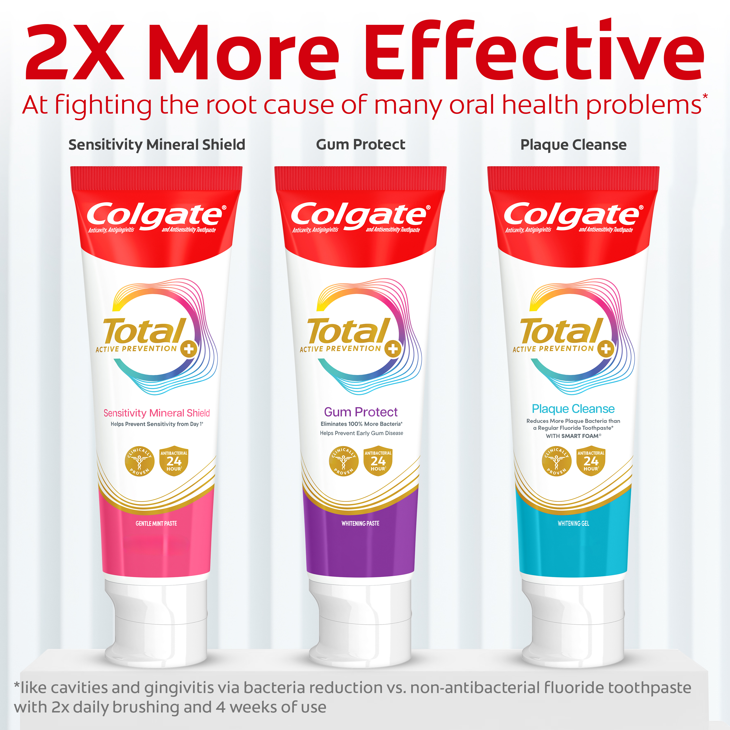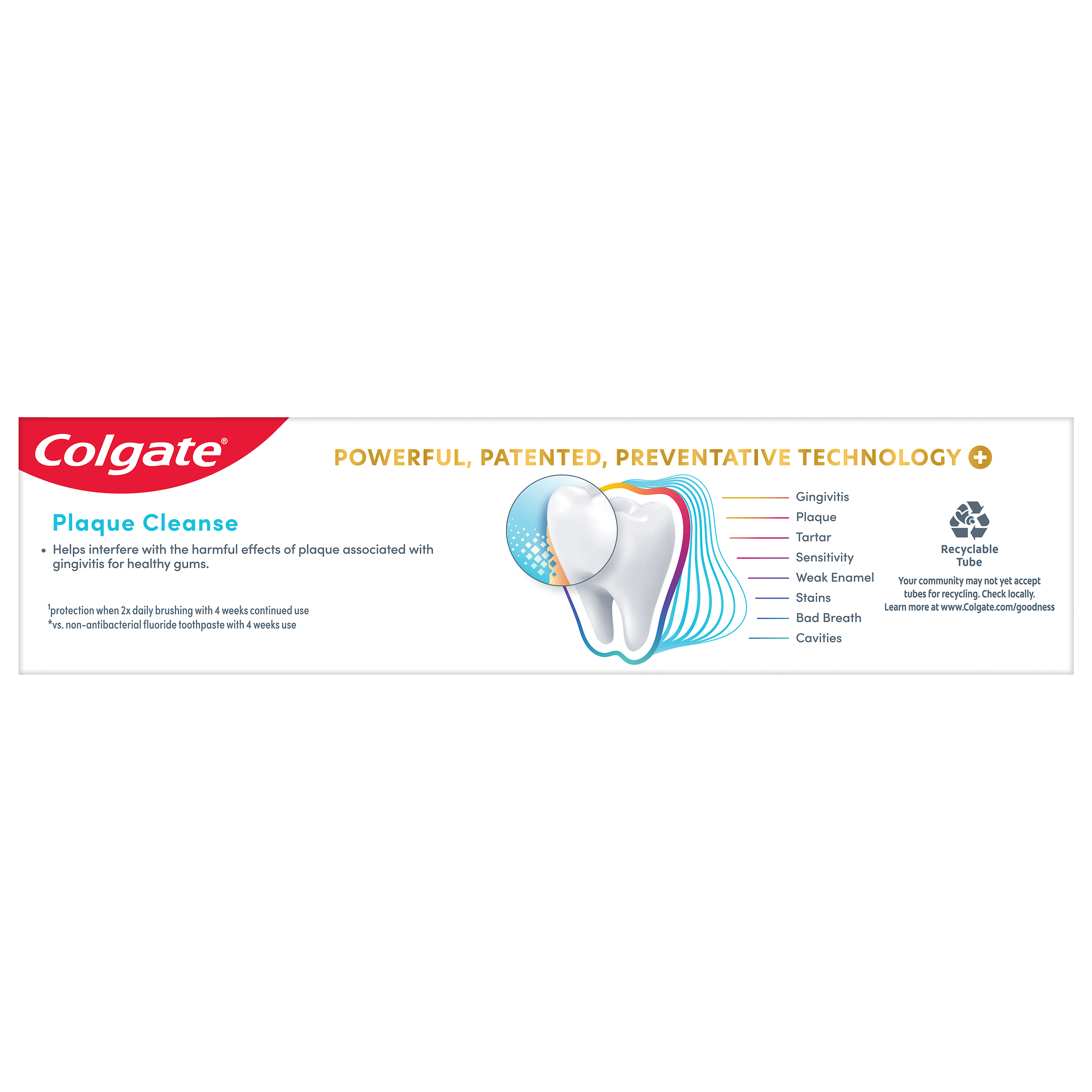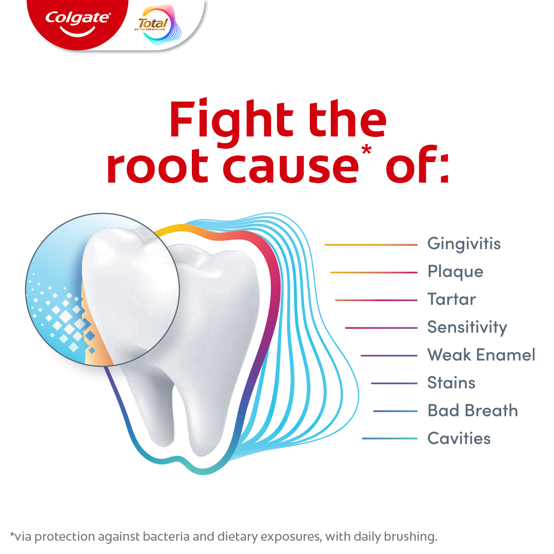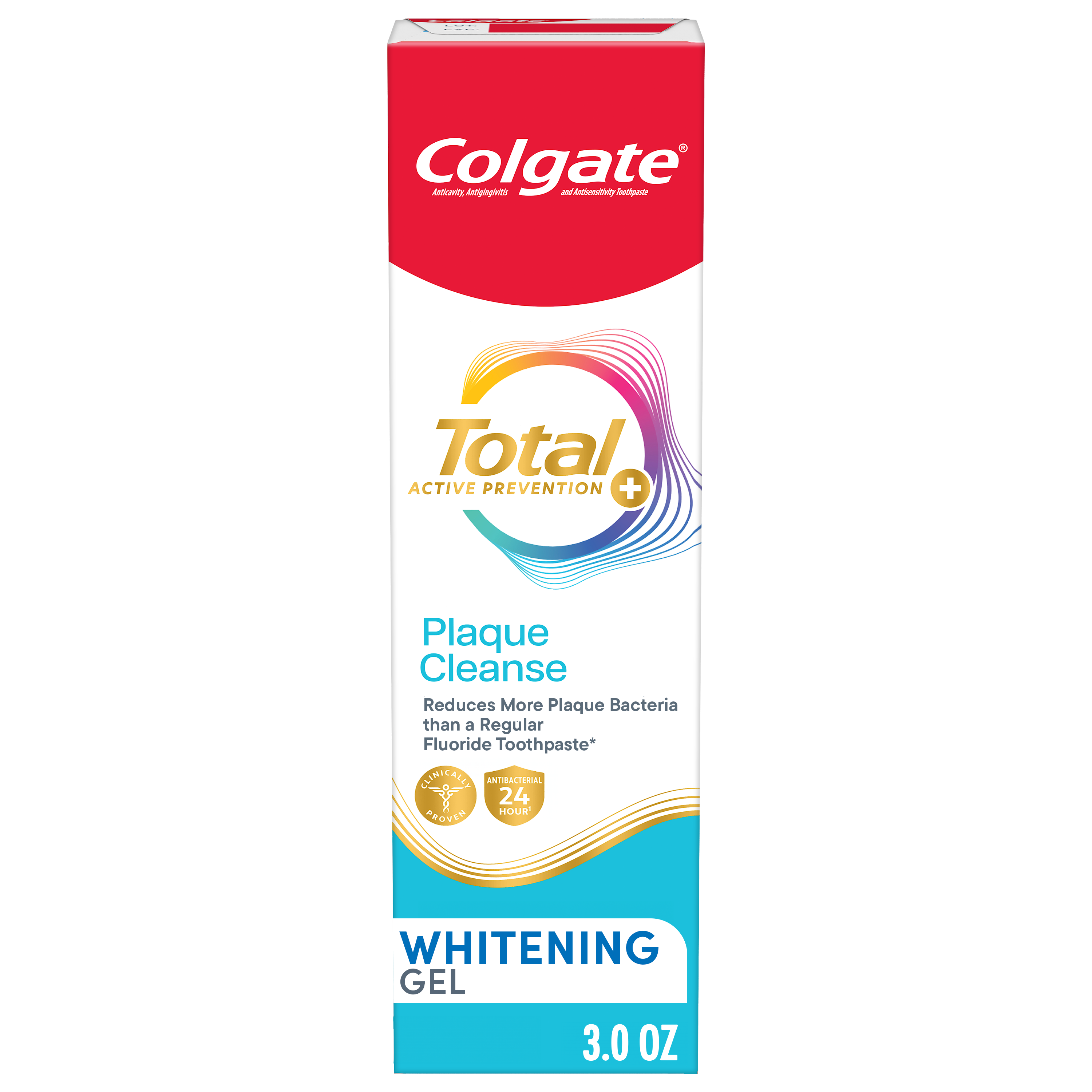 SKU 61053510 Consumer Unit - GTIN 00827854026662 Case - GTIN 10827854026669 Product Category Oral Care Product Sub Category Toothpaste Product Equity (Brand) Colgate Product Sub Brand Colgate Total TP Product Title Colgate Total Active Prevention Plaque Cleanse Whitening Toothpaste Gel, Cool Peppermint, 3 oz Product Description Help tackle the harmful effects of plaque associated with gingivitis and promote healthy gums using Colgate Total Active Prevention Plaque Cleanse Whitening Toothpaste Gel. This Colgate Total toothpaste is a patented tartar prevention toothpaste that fights the root cause* of gingivitis, plaque, tartar, cavities, sensitivity, bad breath, weak enamel, and stains. In addition to helping whiten teeth, this fluoride formulated mint toothpaste comes in a refreshing Cool Peppermint flavor to help fight bad breath. Colgate Total Active Prevention Plaque Cleanse Teeth Whitening Toothpaste reduces more plaque bacteria than a regular fluoride toothpaste** and is 2x more effective*** at fighting bacteria, the root cause of oral health problems like cavities and gingivitis. Help stop oral health problems caused by bacteria with Colgate Active Prevention Plaque Cleanse Toothpaste Gel. *via protection against bacteria and dietary exposures, with daily brushing **vs. non-antibacterial fluoride toothpaste with 4 weeks use ***via reduction of bacteria vs. non-antibacterial fluoride toothpaste with 2x daily brushing and 4 weeks use eCommerce Copy- Long Description Help tackle the harmful effects of plaque associated with gingivitis and promote healthy gums using Colgate Total Active Prevention Plaque Cleanse Whitening Toothpaste Gel. This Colgate Total toothpaste is a patented tartar prevention toothpaste that fights the root cause* of gingivitis, plaque, tartar, cavities, sensitivity, bad breath, weak enamel, and stains. In addition to helping whiten teeth, this fluoride formulated mint toothpaste comes in a refreshing Cool Peppermint flavor to help fight bad breath. Colgate Total Active Prevention Plaque Cleanse Teeth Whitening Toothpaste reduces more plaque bacteria than a regular fluoride toothpaste** and is 2x more effective*** at fighting bacteria, the root cause of oral health problems like cavities and gingivitis. Help stop oral health problems caused by bacteria with Colgate Active Prevention Plaque Cleanse Toothpaste Gel. *via protection against bacteria and dietary exposures, with daily brushing **vs. non-antibacterial fluoride toothpaste with 4 weeks use ***via reduction of bacteria vs. non-antibacterial fluoride toothpaste with 2x daily brushing and 4 weeks use Bullet 1 Includes one (1) 3.0 oz tube of Colgate Total Active Prevention Plaque Cleanse Toothpaste Gel, travel friendly on the go whitening toothpaste Bullet 2 Colgate Total Plaque Cleanse Toothpaste helps interfere with the harmful effects of plaque associated with gingivitis for healthy gums Bullet 3 The tartar prevention toothpaste is 2x more effective at fighting the root cause of plaque buildup*** Bullet 4 This Colgate Total toothpaste reduces more plaque bacteria than regular fluoride toothpaste (vs. non-antibacterial fluoride toothpaste with 4 wks use) Bullet 5 The gum health toothpaste is 2x more effective at fighting bacteria*** a root cause of many common oral care problems such as cavities and gingivitis Bullet 6 Colgate Total Active Prevention Plaque Cleanse Toothpaste is a fluoride formulated mint toothpaste that helps tackle bad breath Bullet 7 Help stop oral health problems caused by bacteria with Colgate Total Active Prevention Plaque Cleanse Gingivitis Toothpaste Walmart RPC 18112571040 Walmart URL (Computed) https://www.walmart.com/ip/a/18112571040 Target RPC 94823730 Target URL https://www.target.com/p/a/-/A-94823730