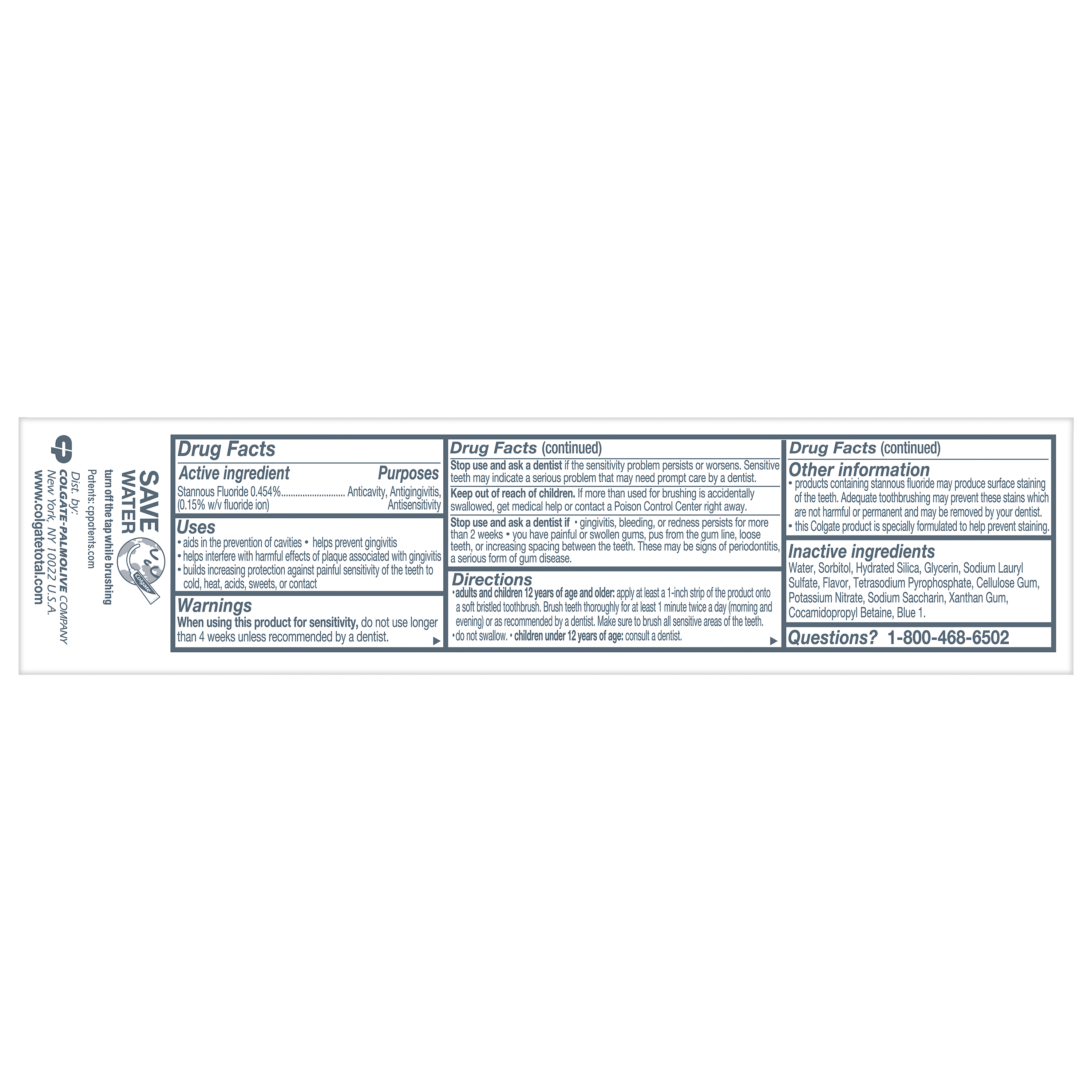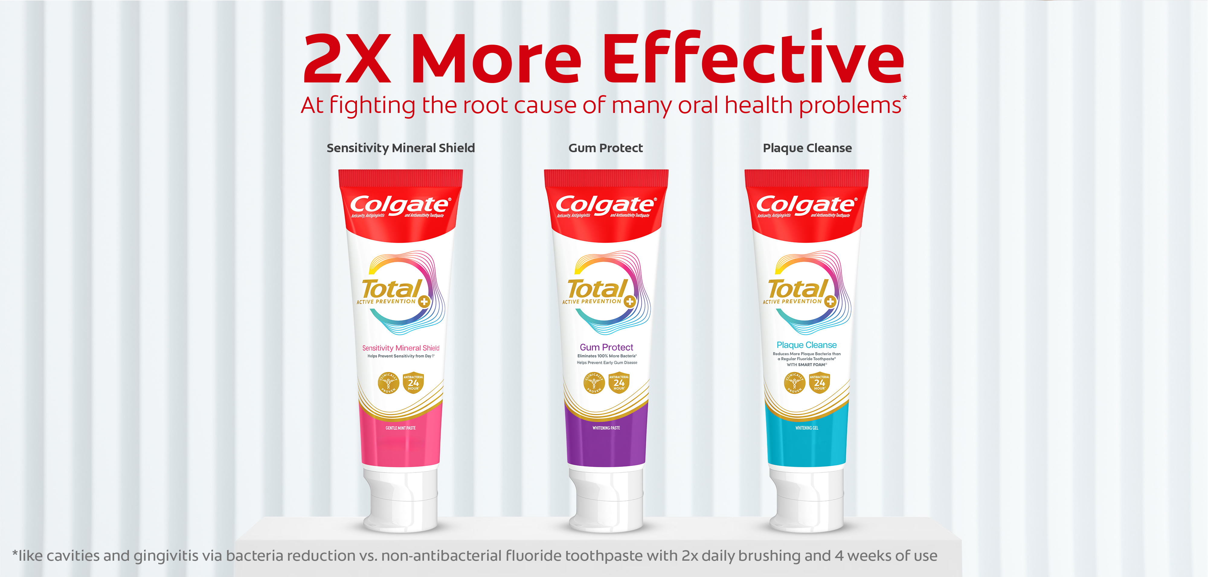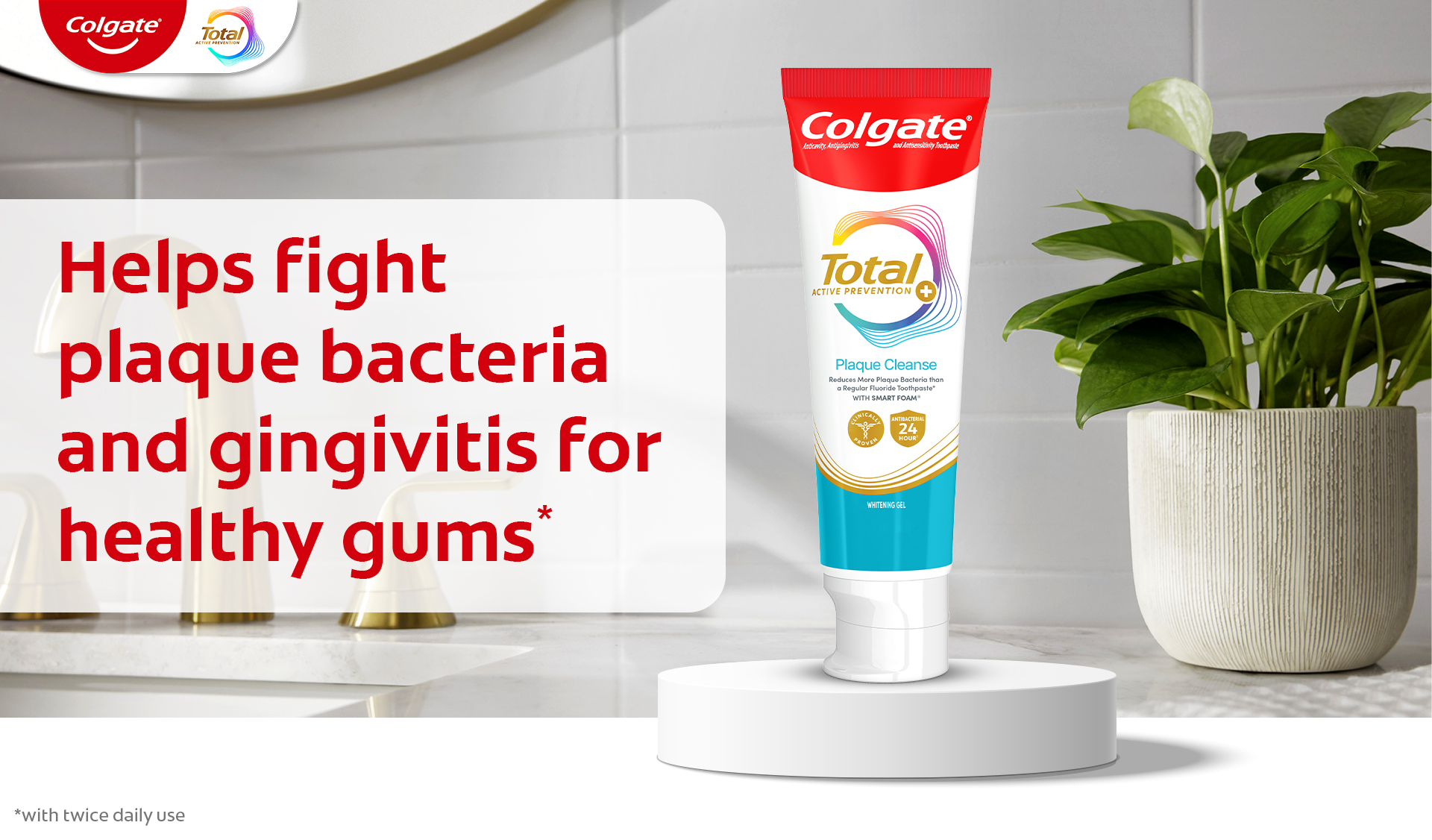 SKU 61053510 Consumer Unit - GTIN 00827854026662 Case - GTIN 10827854026669 Product Category Oral Care Product Sub Category Toothpaste Product Equity (Brand) Colgate Product Sub Brand Colgate Total TP Product Title Colgate Total Active Prevention Plaque Cleanse Whitening Toothpaste Gel, Cool Peppermint, 3 oz Product Description Help tackle the harmful effects of plaque associated with gingivitis and promote healthy gums using Colgate Total Active Prevention Plaque Cleanse Whitening Toothpaste Gel. This Colgate Total toothpaste is a patented tartar prevention toothpaste that fights the root cause* of gingivitis, plaque, tartar, cavities, sensitivity, bad breath, weak enamel, and stains. In addition to helping whiten teeth, this fluoride formulated mint toothpaste comes in a refreshing Cool Peppermint flavor to help fight bad breath. Colgate Total Active Prevention Plaque Cleanse Teeth Whitening Toothpaste reduces more plaque bacteria than a regular fluoride toothpaste** and is 2x more effective*** at fighting bacteria, the root cause of oral health problems like cavities and gingivitis. Help stop oral health problems caused by bacteria with Colgate Active Prevention Plaque Cleanse Toothpaste Gel. *via protection against bacteria and dietary exposures, with daily brushing **vs. non-antibacterial fluoride toothpaste with 4 weeks use ***via reduction of bacteria vs. non-antibacterial fluoride toothpaste with 2x daily brushing and 4 weeks use eCommerce Copy- Long Description Help tackle the harmful effects of plaque associated with gingivitis and promote healthy gums using Colgate Total Active Prevention Plaque Cleanse Whitening Toothpaste Gel. This Colgate Total toothpaste is a patented tartar prevention toothpaste that fights the root cause* of gingivitis, plaque, tartar, cavities, sensitivity, bad breath, weak enamel, and stains. In addition to helping whiten teeth, this fluoride formulated mint toothpaste comes in a refreshing Cool Peppermint flavor to help fight bad breath. Colgate Total Active Prevention Plaque Cleanse Teeth Whitening Toothpaste reduces more plaque bacteria than a regular fluoride toothpaste** and is 2x more effective*** at fighting bacteria, the root cause of oral health problems like cavities and gingivitis. Help stop oral health problems caused by bacteria with Colgate Active Prevention Plaque Cleanse Toothpaste Gel. *via protection against bacteria and dietary exposures, with daily brushing **vs. non-antibacterial fluoride toothpaste with 4 weeks use ***via reduction of bacteria vs. non-antibacterial fluoride toothpaste with 2x daily brushing and 4 weeks use Bullet 1 Includes one (1) 3.0 oz tube of Colgate Total Active Prevention Plaque Cleanse Toothpaste Gel, travel friendly on the go whitening toothpaste Bullet 2 Colgate Total Plaque Cleanse Toothpaste helps interfere with the harmful effects of plaque associated with gingivitis for healthy gums Bullet 3 The tartar prevention toothpaste is 2x more effective at fighting the root cause of plaque buildup*** Bullet 4 This Colgate Total toothpaste reduces more plaque bacteria than regular fluoride toothpaste (vs. non-antibacterial fluoride toothpaste with 4 wks use) Bullet 5 The gum health toothpaste is 2x more effective at fighting bacteria*** a root cause of many common oral care problems such as cavities and gingivitis Bullet 6 Colgate Total Active Prevention Plaque Cleanse Toothpaste is a fluoride formulated mint toothpaste that helps tackle bad breath Bullet 7 Help stop oral health problems caused by bacteria with Colgate Total Active Prevention Plaque Cleanse Gingivitis Toothpaste Walmart RPC 18112571040 Walmart URL (Computed) https://www.walmart.com/ip/a/18112571040 Target RPC 94823730 Target URL https://www.target.com/p/a/-/A-94823730