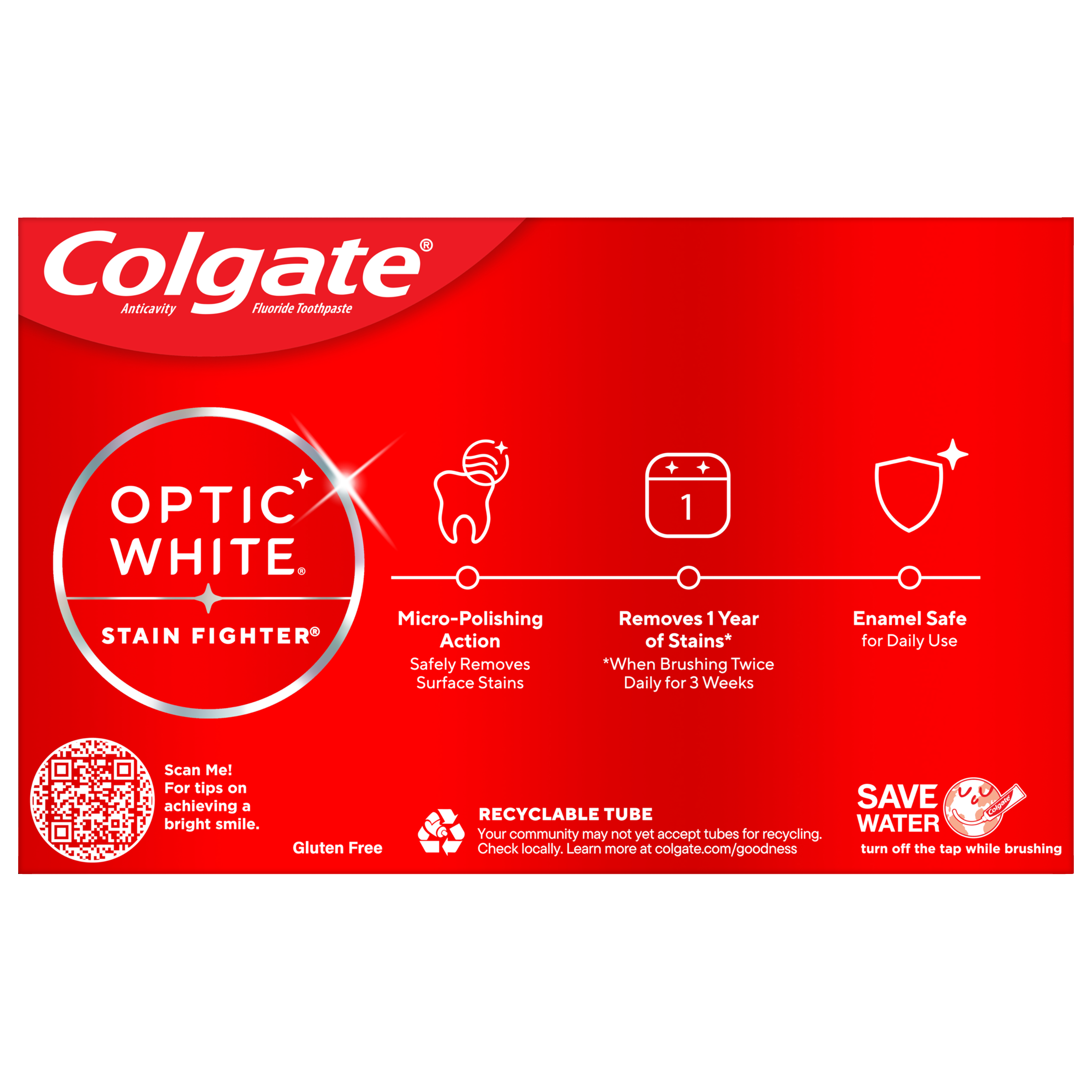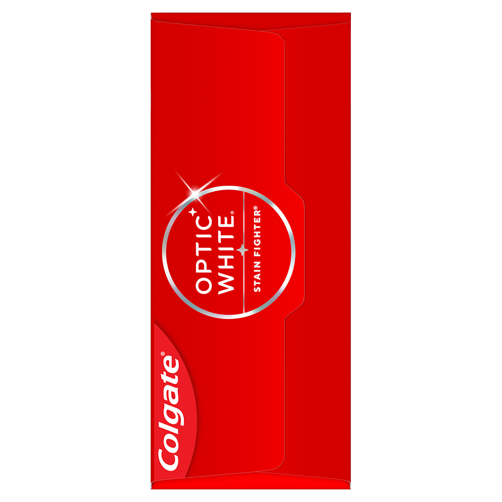 SKU 61053543 Consumer Unit - GTIN 00827854026884 Case - GTIN 10827854026881 Product Category Oral Care Product Sub Category Toothpaste Product Equity (Brand) Colgate Product Sub Brand Colgate Optic White TP Product Title Colgate Optic White Stain Fighter Clean Mint Paste Teeth Whitening Toothpaste, Anticavity Toothpaste with Fluoride, 2 Pack, 3.8 OZ Product Description Colgate Optic White Stain Fighter Clean Mint Paste Toothpaste removes 1 year of stains* while freshening breath with its mint flavor. Its micro-polishing action safely removes 5X more surface stains**. Plus, Optic White Stain Fighter contains fluoride to fight cavities and is an enamel safe stain remover toothpaste. Get an invigorating clean with this effective teeth stain remover. Colgate Optic White Stain Fighter uses a patented whitening formula for thorough, effective stain removal. The micropolishers in Stain Fighter don’t just brush away surface stains – they help prevent new ones from forming. Our peppermint toothpaste provides a clean, invigorating taste that lasts from the first taste to the finish. Stain Fighter is a fluoride toothpaste that fights cavities. This patented whitening formula removes 1 year of stains* and is enamel safe for daily use. *when brushing twice daily for 3 weeks **vs. ordinary, non-whitening toothpaste after 2 weeks of continued use eCommerce Copy- Long Description Colgate Optic White Stain Fighter Whitening Toothpaste, Clean Mint, 3.8 Oz Tube, 2 Pack Colgate Optic White Stain Fighter is a stain removal whitening toothpaste with micro-polishing action to remove 5X more surface stains*. This teeth stain remover toothpaste contains clinically proven technology that safely removes surface stains and the formula helps prevent new stains from forming, so your teeth stay whiter longer. Colgate Optic White toothpaste, Stain Fighter, is a mint toothpaste that has a clean mint flavor that freshens breath. *vs. ordinary non whitening toothpaste, after 2 weeks of continued use Whitening That Works Colgate Optic White Stain Fighter is a whitening toothpaste that is enamel-safe for daily use. Add this teeth stain removal toothpaste to your oral care routine for teeth whitening and stain fighting. Colgate Optic White Stain Fighter is also an anticavity fluoride toothpaste that helps to protect against cavities. For good hygiene, brush your teeth twice a day for two minutes. Optic White toothpaste is made by Colgate, the brand that knows the power of a healthy smile. *vs. ordinary non whitening toothpaste, after 2 weeks of continued use Healthy Smiles At Colgate, we make toothpaste that promotes healthy smiles. Not only because having a healthy smile is important to your overall health, but because when you have a healthy smile, you actually smile more – and that’s a powerful thing. Smiles are the simplest form of optimism, something we need now more than ever. That’s why we’re committed to raising oral healthcare standards everywhere. Bullet 1 Two 3.8 OZ tubes of Colgate Optic White Stain Fighter Clean Mint Paste Teeth Whitening Toothpaste Bullet 2 Removes 1 year of stains* (*when brushing twice daily for 3 weeks) Bullet 3 Safely removes 5X more surface stains with micro-polishing action** (**vs. ordinary, non-whitening toothpaste after 2 weeks of continued use) Bullet 4 Clean Mint flavor provides a clean, invigorating taste that lasts from the first taste to the finish Bullet 5 This double toothpaste pack is enamel safe for daily use Bullet 6 Optic White Stain Fighter is an anticavity toothpaste; it contains fluoride to fight cavities Bullet 7 Optic White Stain Fighter is a vegan toothpaste Active Ingredients Sodium Fluoride 0.24 % (0.15% w/v fluoride ion) Albertsons RPC 960318699 Albertsons URL https://www.albertsons.com/shop/product-details.960318699.html CVS RPC 581232 Family Dollar RPC 999633