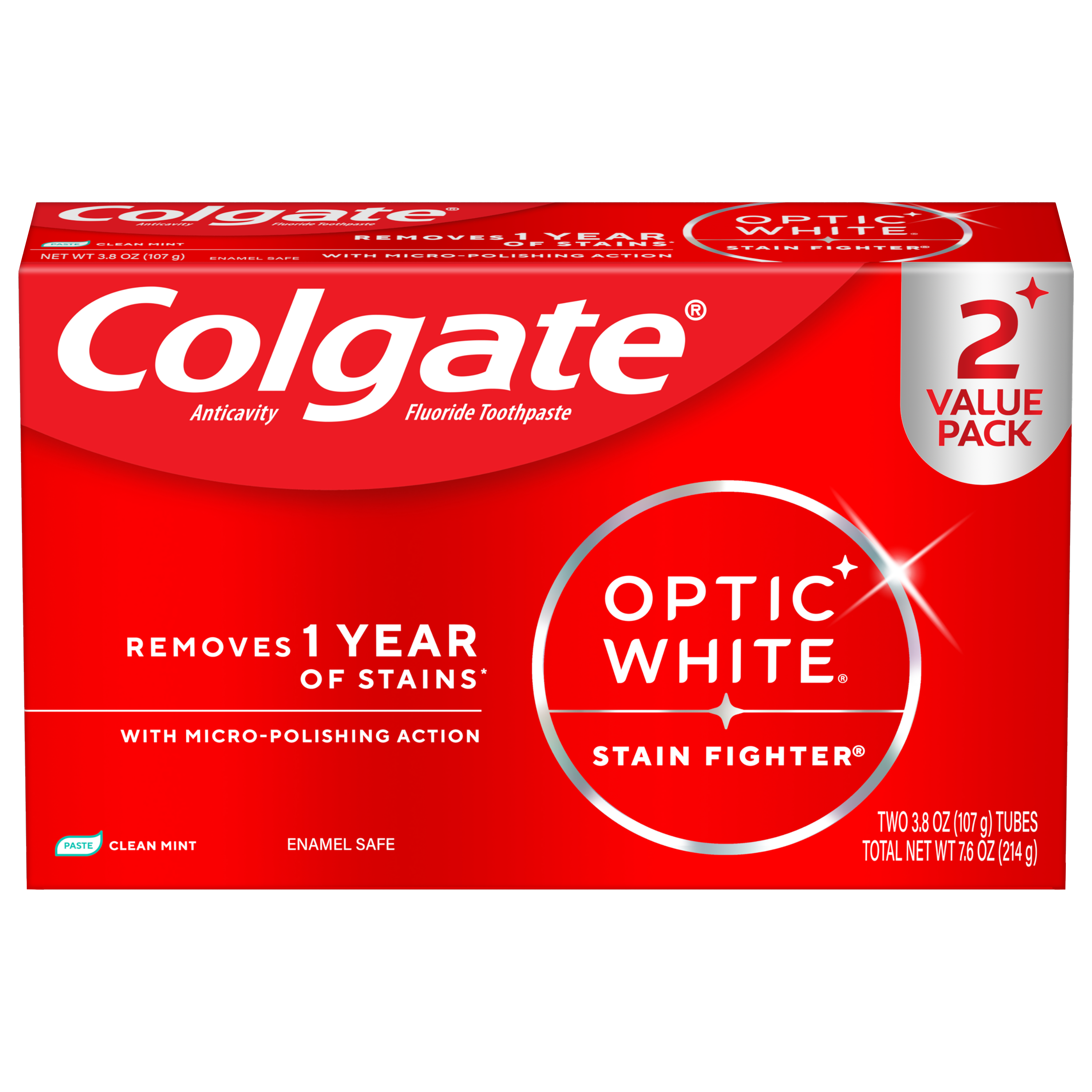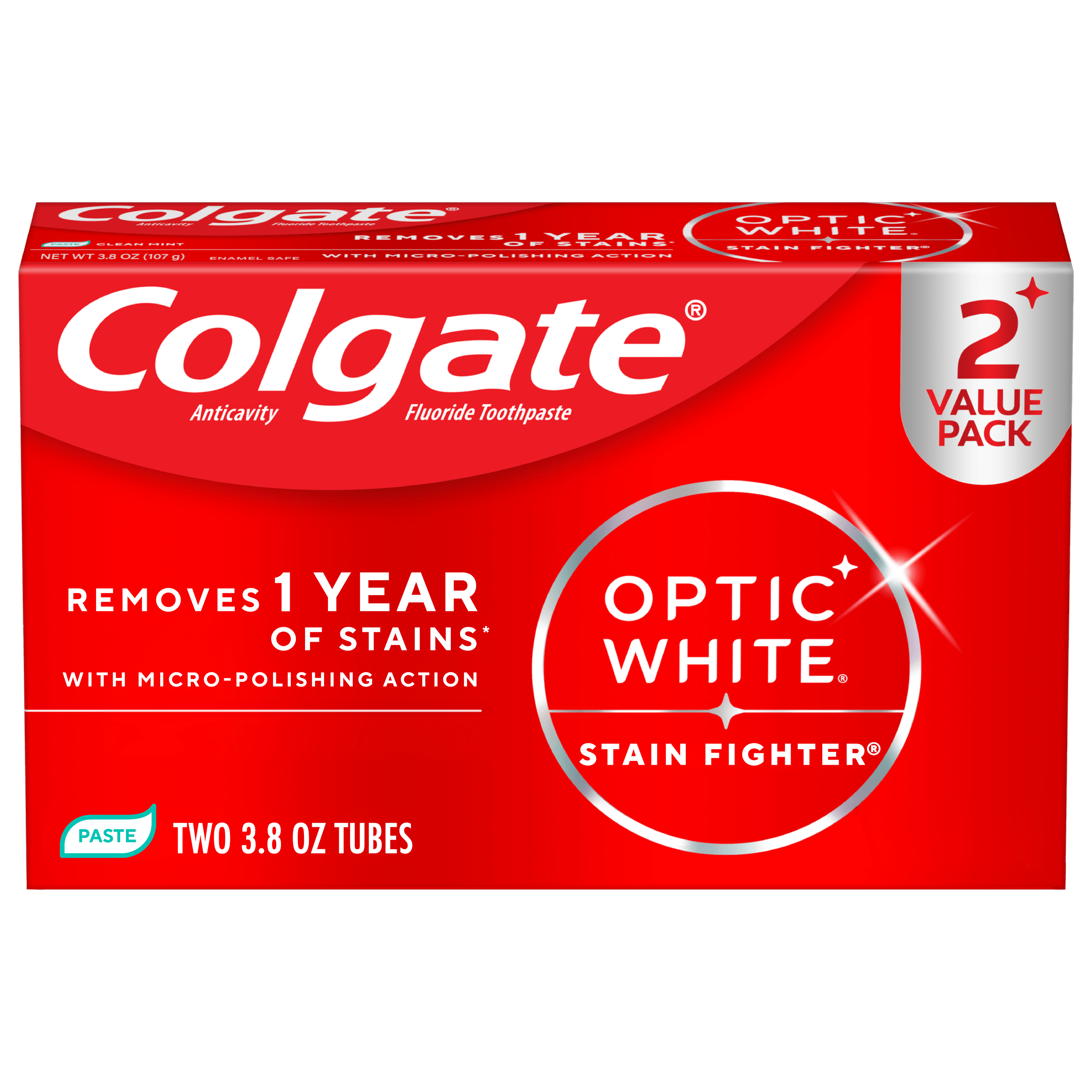 Colgate Optic White Stain Fighter Stain Removal Toothpaste, Clean Mint, 3.8 Oz, 2 Pack