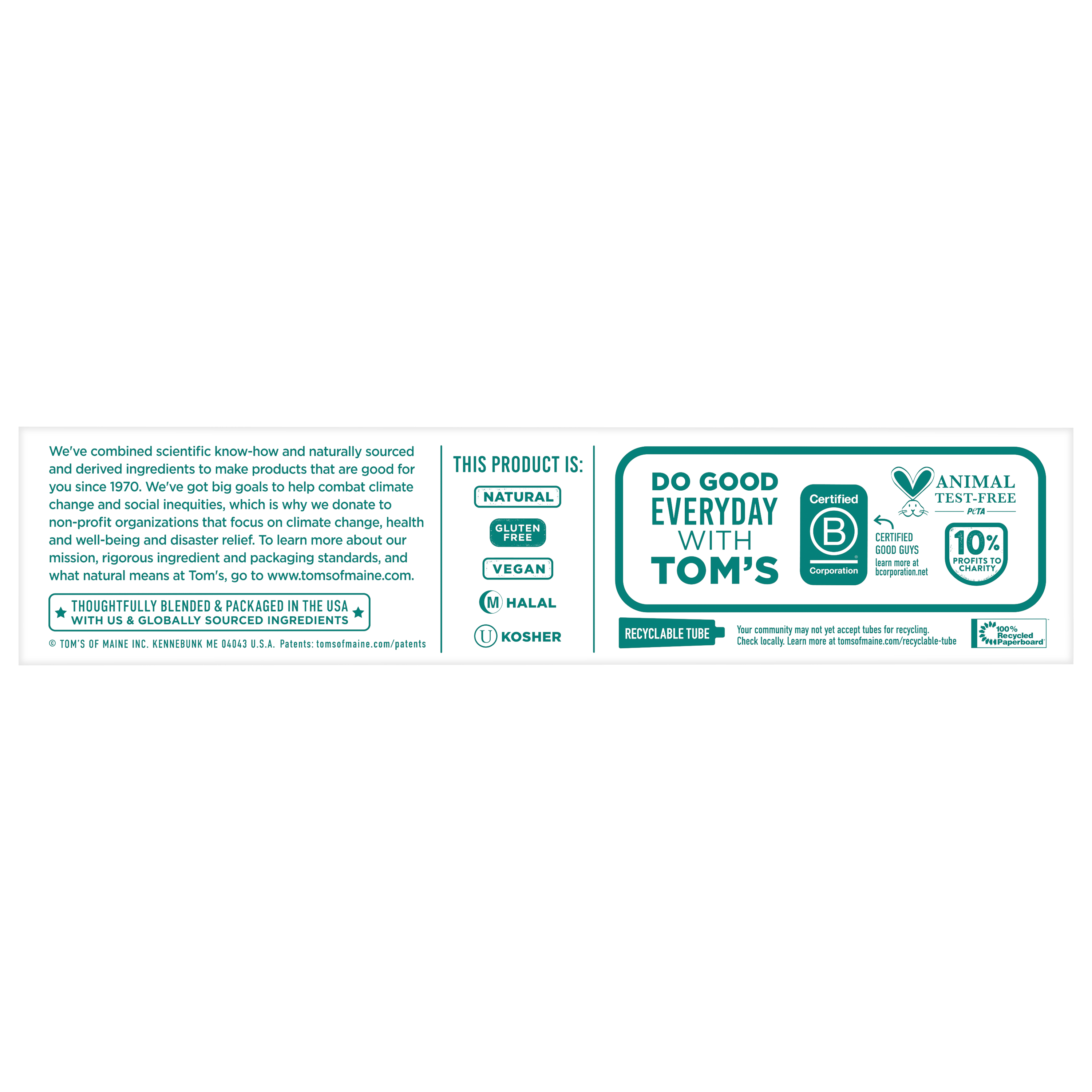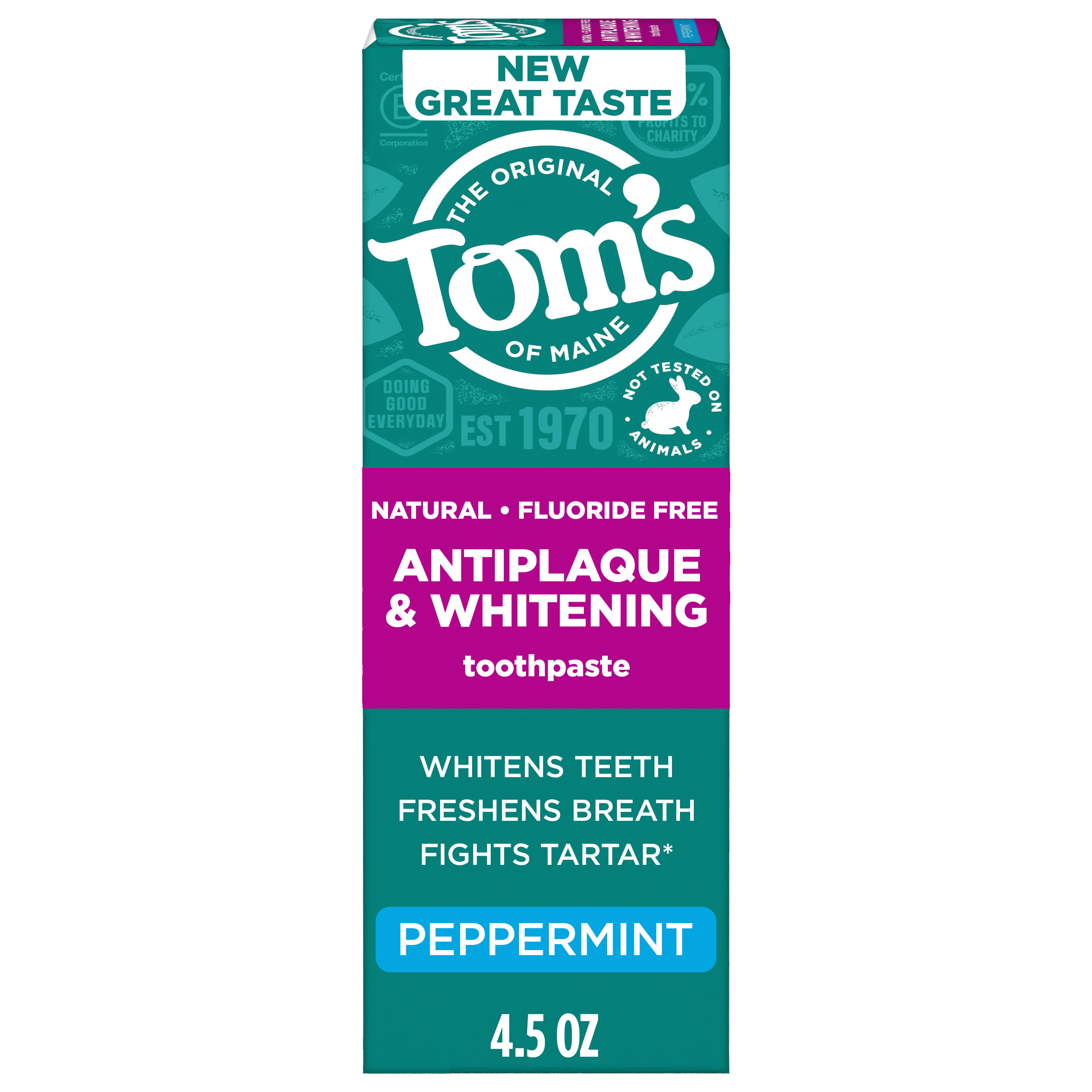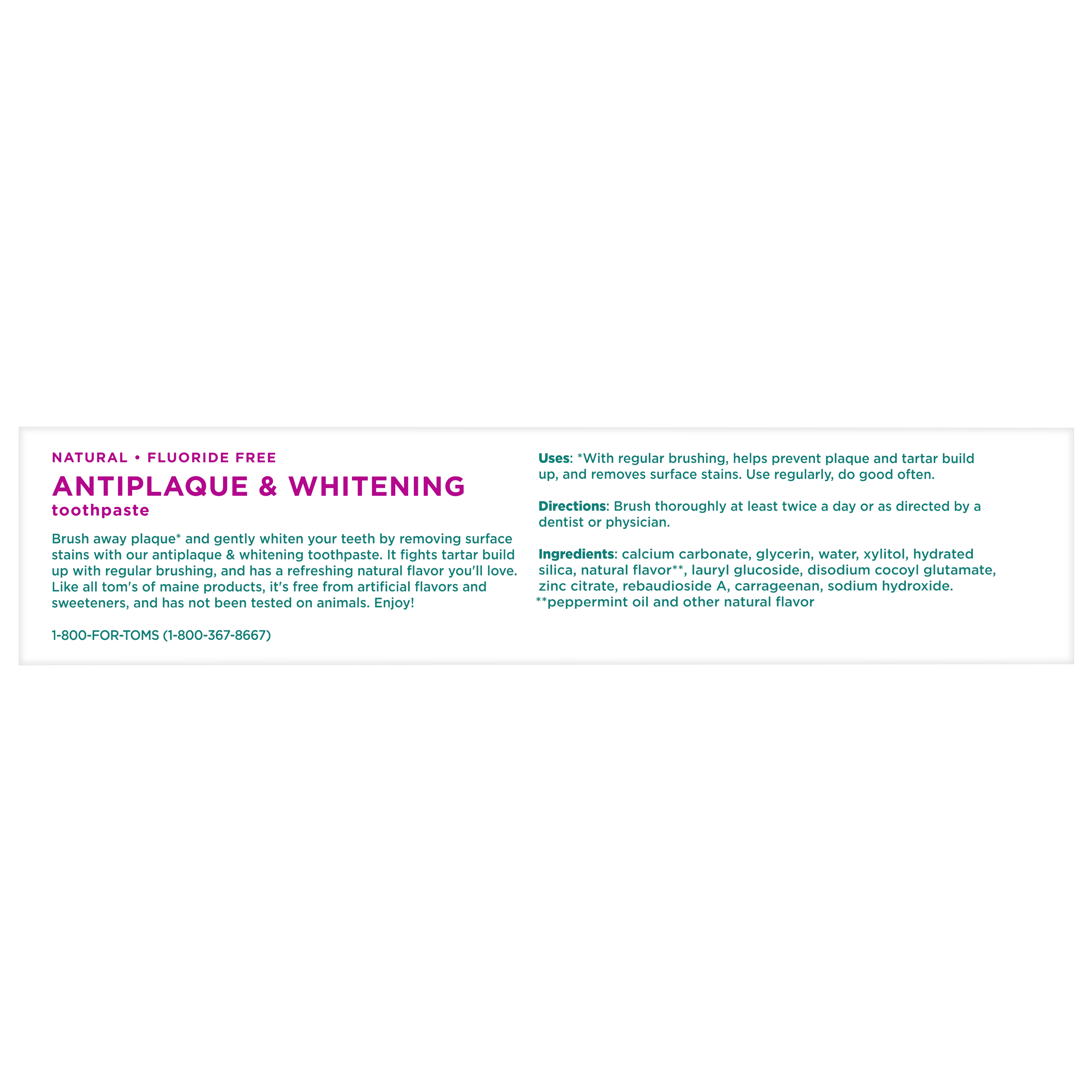 SKU 61053564 Consumer Unit - GTIN 00827854011644 Case - GTIN 10827854011641 Product Category Oral Care Product Sub Category Toothpaste Product Equity (Brand) Tom's Product Sub Brand Tom's AP & Whitening TP Product Title Tom’s of Maine Antiplaque and Whitening Toothpaste, Fluoride Free, Peppermint, 1 Pack, 4.5 oz Product Description Enjoy a naturally radiant smile with Tom’s of Maine Antiplaque and Whitening Fluoride Free Toothpaste, an SLS free toothpaste that features an improved formula* for a better brushing experience. Crafted with naturally derived and naturally sourced ingredients, this fluoride free whitening toothpaste delivers a stronger* mint toothpaste flavor and gently whitens teeth by removing surface stains with regular brushing. Tom’s of Maine Antiplaque and Whitening Toothpaste is a natural fluoride free toothpaste that helps fight tartar and plaque buildup without using fluoride. Help freshen your breath while preventing plaque and tartar buildup with regular brushing using this Peppermint flavored antiplaque toothpaste from Tom’s of Maine. Tom's of Maine uses naturally derived and naturally sourced ingredients to create oral care products that work. This natural toothpaste comes in a refreshing Peppermint toothpaste flavor so you can enjoy minty freshness every time you brush. Plus, it’s an SLS free toothpaste that is gluten free and free from artificial flavors, sweeteners, and dyes, and has not been tested on animals. *vs. previous formula eCommerce Copy- Long Description Tom’s of Maine Antiplaque and Whitening Toothpaste, Fluoride Free, Peppermint, Single, 4.5 Oz Experience a bright smile using naturally derived and naturally sourced ingredients with the Tom’s of Maine Antiplaque and Whitening Fluoride Free Toothpaste. This fluoride free toothpaste comes in a refreshing Peppermint flavor and gently whitens your teeth by removing surface stains with regular brushing. Whitens Teeth and Fights Tartar Buildup Tom's of Maine Antiplaque and Whitening Toothpaste is a fluoride free natural toothpaste that fights tartar buildup and plaque with regular brushing and gently whitens teeth by removing surface stains. Freshen your breath while preventing plaque and tartar buildup with regular brushing with this Peppermint flavored antiplaque toothpaste from Tom’s of Maine. Naturally Sourced, Naturally Derived Tom's of Maine uses naturally derived and naturally sourced ingredients to create oral personal care products that work. This natural toothpaste contains zinc citrate, a naturally occurring mineral and also contains xylitol, a natural ingredient derived from birch trees or corn. It also has natural flavoring added for a revitalizing Peppermint taste that will make you look forward to brushing. Plus, it’s free from artificial flavors and sweeteners and has not been tested on animals. Now that’s something you can feel good about. Bullet 1 Includes one (1) 4.5 oz tube of Tom's of Maine Antiplaque and Whitening Fluoride Free Toothpaste, Peppermint Toothpaste flavor Bullet 2 This whitening antiplaque toothpaste helps whiten teeth by removing surface stains and helps prevent tartar buildup with regular brushing Bullet 3 This SLS free toothpaste features a new formula and better taste* for a better brushing experience Bullet 4 The refreshing Peppermint toothpaste flavor helps freshen breath every time you brush Bullet 5 Made with naturally sourced and naturally derived ingredients for a fluoride free natural toothpaste you can feel good about using daily Bullet 6 Gluten free toothpaste that is free from artificial flavors, sweeteners, dyes, SLS, and has not been tested on animals Bullet 7 Experience a bright smile using naturally derived and naturally sourced ingredients with Tom’s of Maine Antiplaque and Whitening Toothpaste