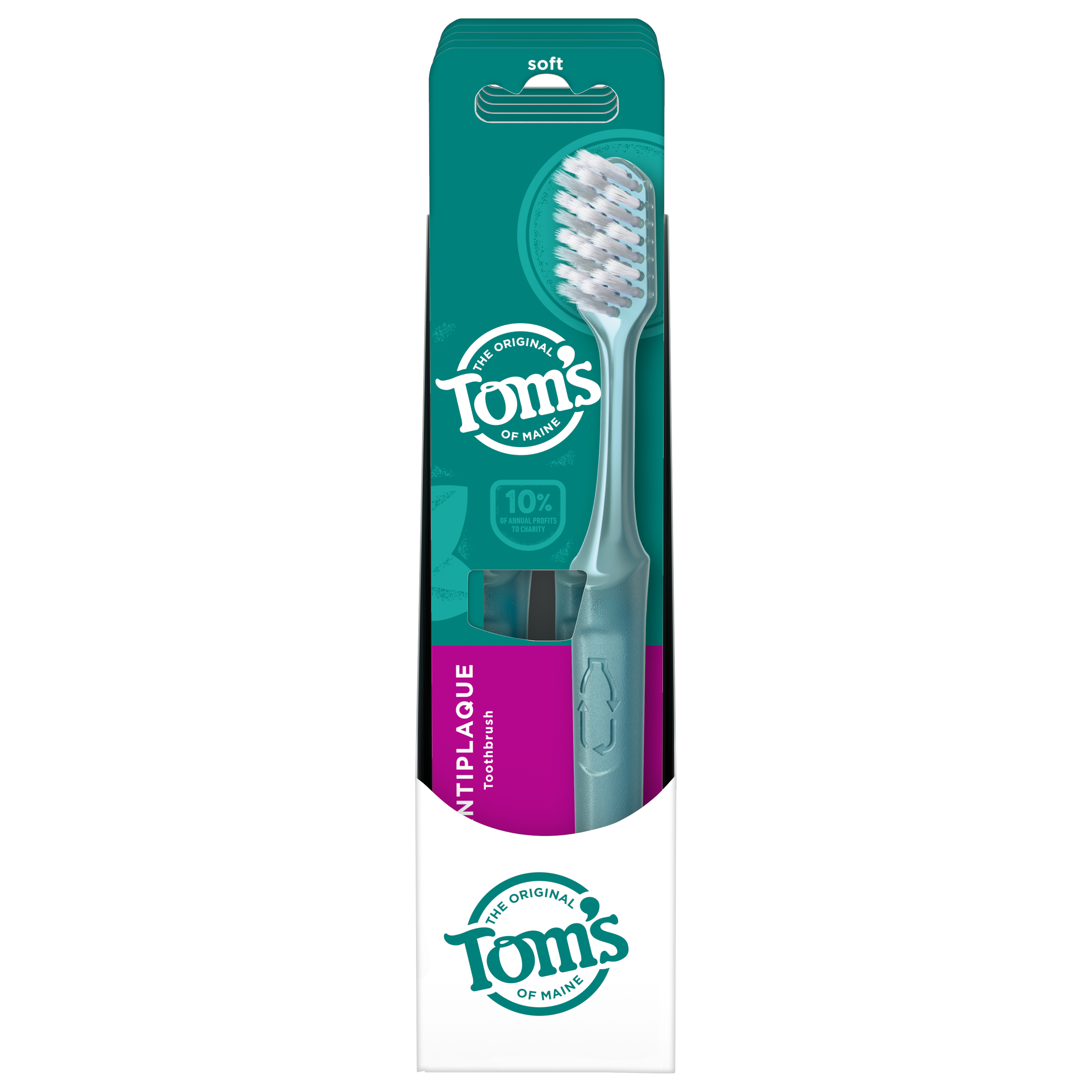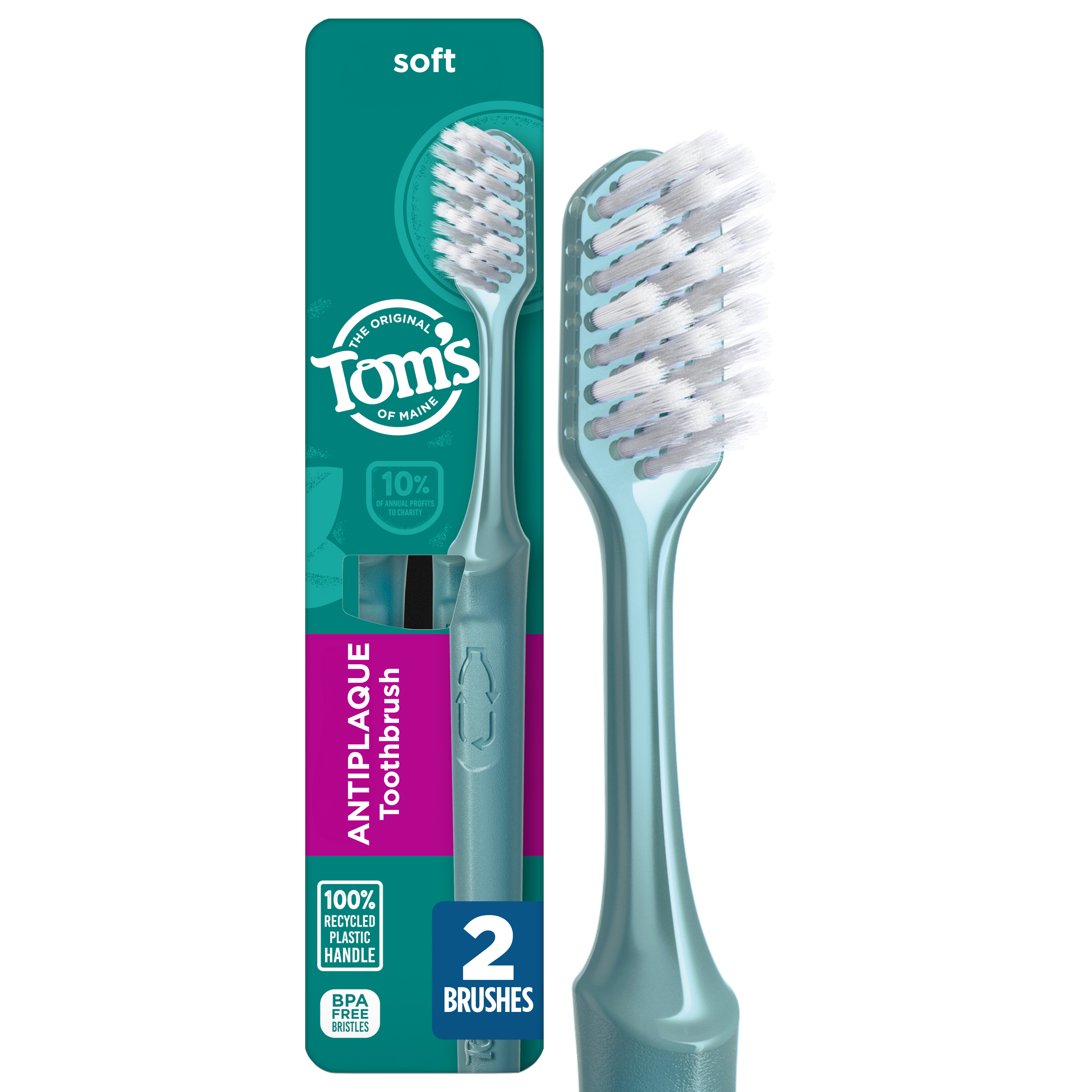 | Product Description | Experience a deep clean you can feel good about with the Tom’s of Maine Antiplaque Adult Soft Toothbrush Pack. Thoughtfully crafted with multi-height, plant-based BPA free bristles, these soft bristle toothbrushes are designed for deep cleaning. Each adult toothbrush features a raised power tip and compact head for better reach* on those tricky spots for a complete brushing experience. Plus, the soft toothbrushes feature a handle made from 100% recycled plastic—over 95% recovered from PET bottles—so you can care for your smile and feel good about your soft adult toothbrush at the same time. The recycled handle also features a non-slip grip that’s easy to hold. Tom’s of Maine Antiplaque Adult Soft Toothbrushes are ideal for anyone looking for a soft bristle toothbrush that is designed to provide a deep clean.