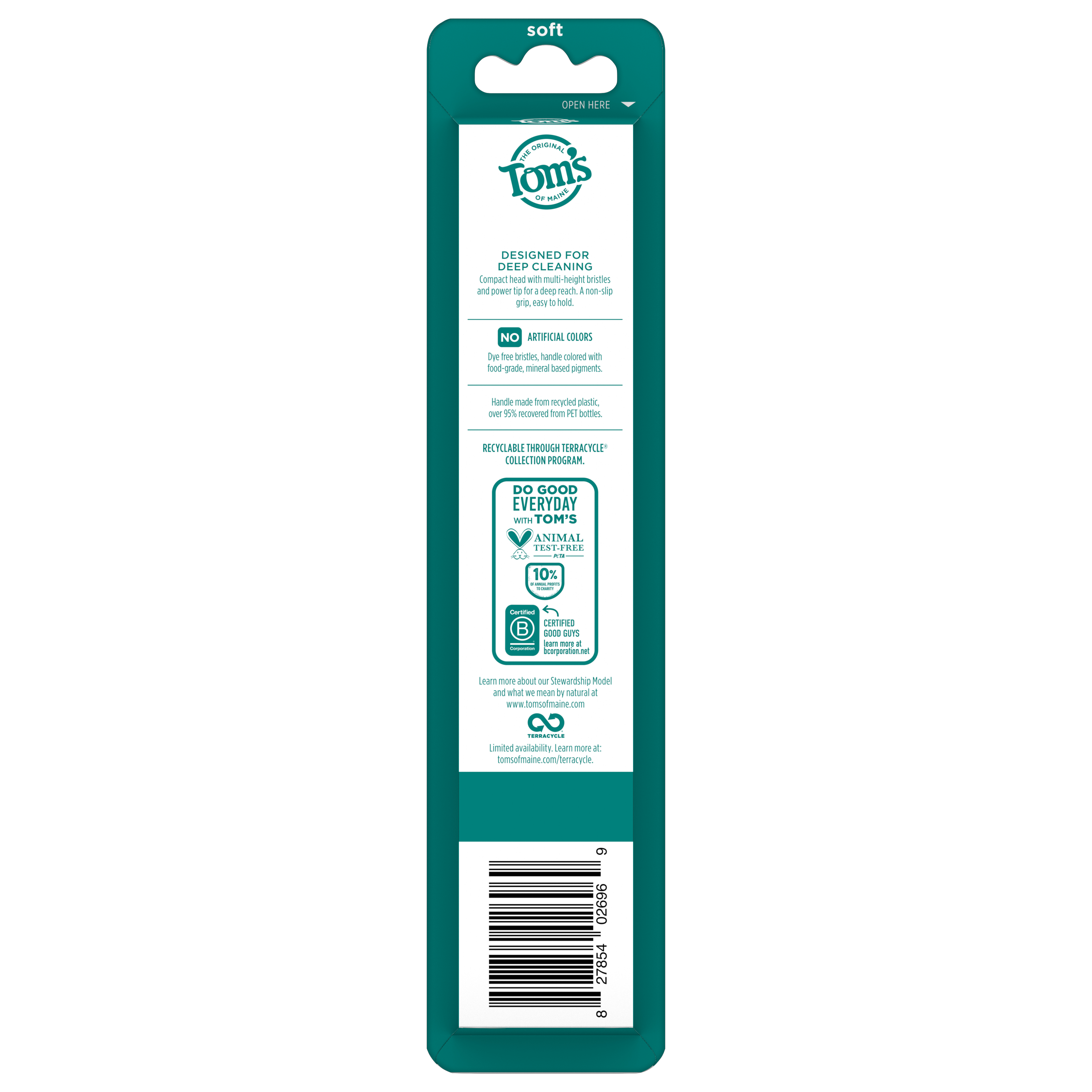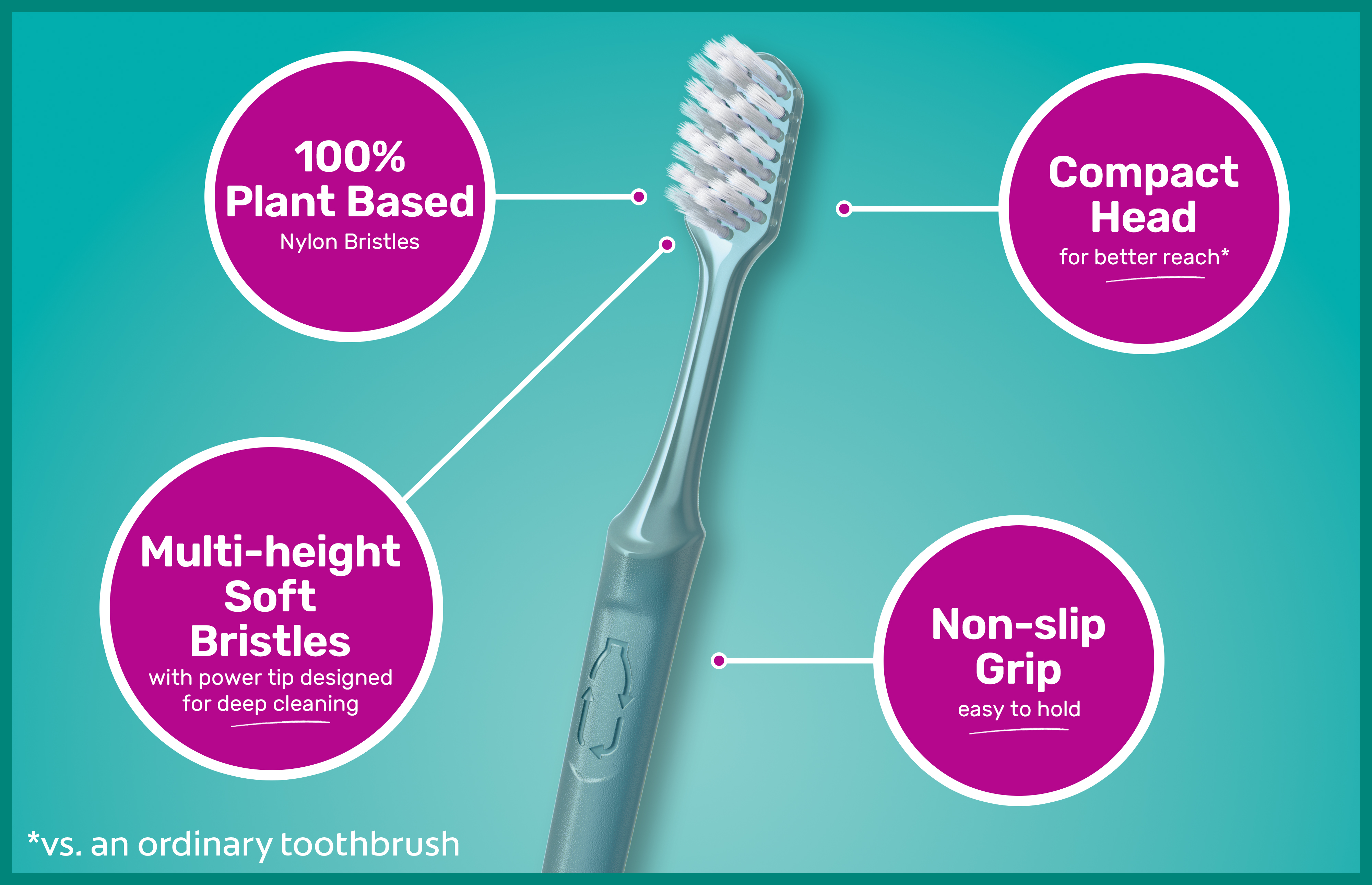 | Bullet 5 | Each soft toothbrush is made from 100% recycled plastic, with over 95% recovered from PET bottles, for a brushing experience you can feel good about |