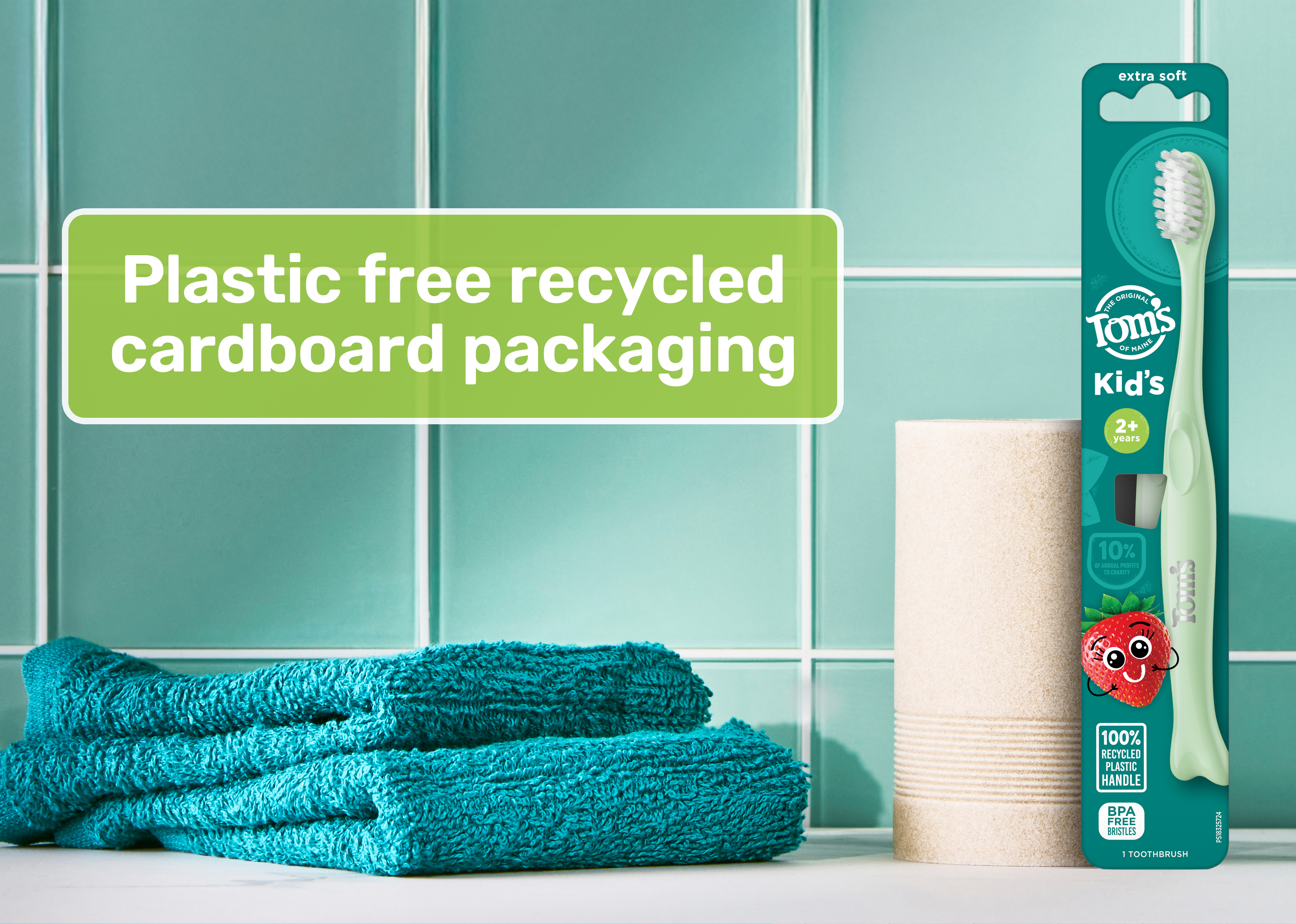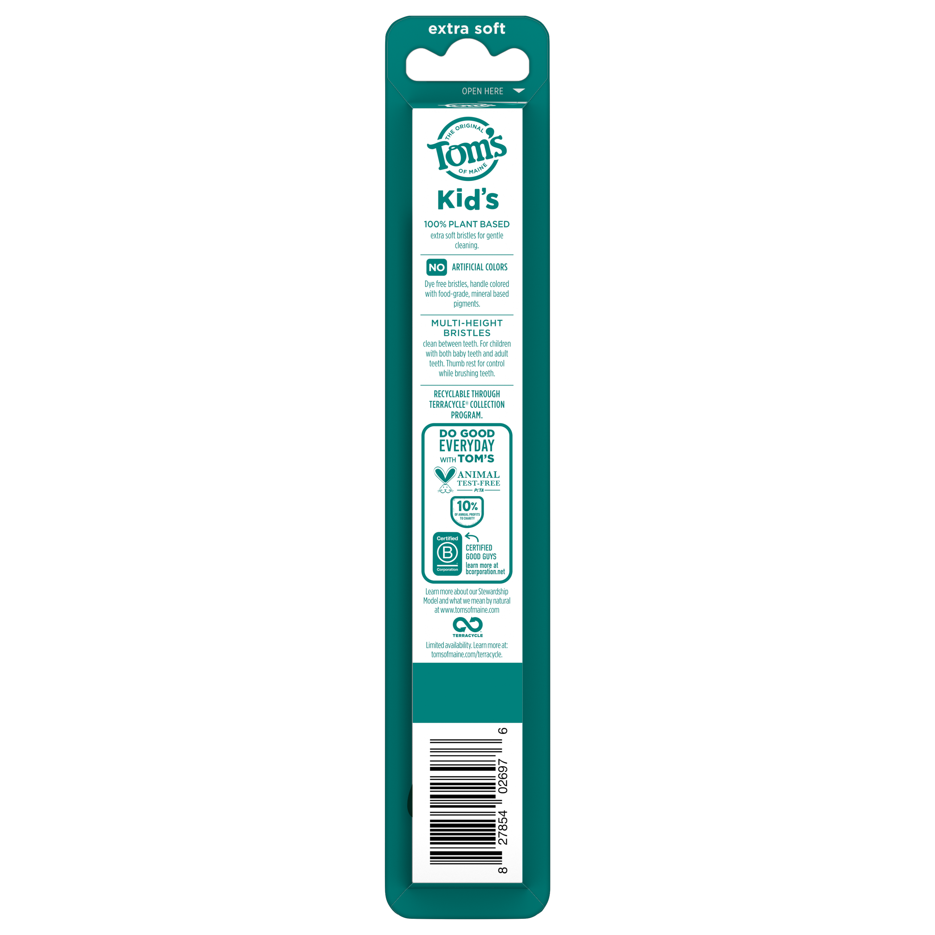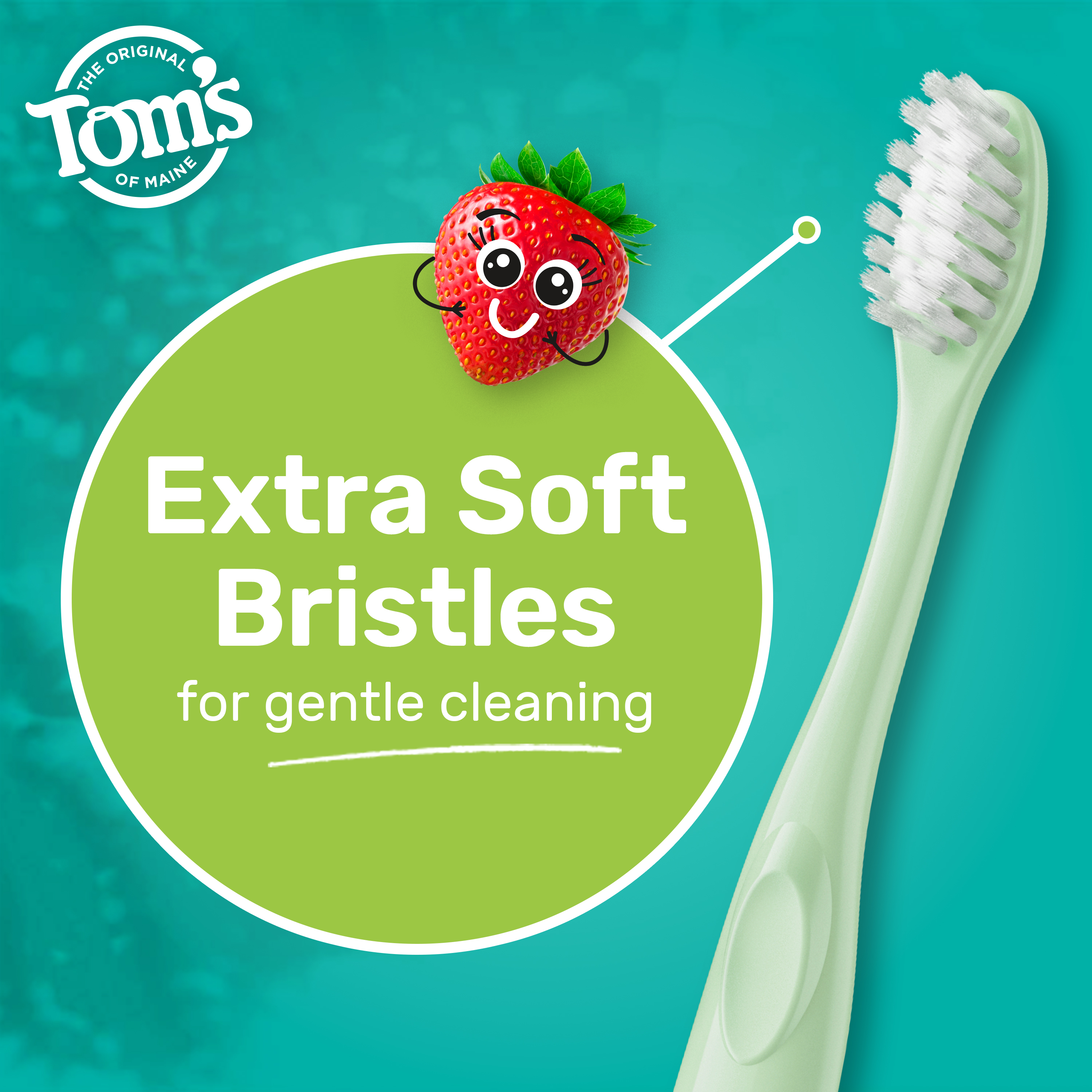 SKU 61053598 Consumer Unit - GTIN 00827854026976 Product Category Oral Care Product Sub Category Manual TB Product Equity (Brand) Tom's of Maine Product Sub Brand Tom's Kids Man TB Product Title Tom's of Maine Extra Soft Kids Toothbrush, 1 Count Product Description Make brushing fun for kids with the Tom’s of Maine Extra Soft Kids Toothbrush. Designed for both children and toddlers ages 2 and up, this playful green kids toothbrush features extra soft toothbrush bristles that offer a gentle yet thorough clean when brushing both baby and adult teeth. The extra soft toothbrush is thoughtfully crafted with BPA-free and dye-free bristles and the handle is colored with food-grade mineral-based pigments. In addition, the kids toothbrush handle is also made from 100% recycled plastic—over 95% recovered from PET bottles—and features a convenient built-in thumb rest for easy control and maneuverability while brushing teeth. This extra soft kids toothbrush uses multi-height bristles to help clean big and small teeth, ensuring a thorough clean. Whether your child is just starting to brush or learning to take care of their own oral hygiene, this Tom’s of Maine kids toothbrush delivers comfort and care every step of the way. eCommerce Copy- Long Description Make brushing fun for kids with the Tom’s of Maine Extra Soft Kids Toothbrush. Designed for kids ages 2 and up, this kids toothbrush has extra soft toothbrush bristles that offer a thorough clean when brushing both baby and adult teeth. In addition, the kids toothbrush handle is also made from 100% recycled plastic—over 95% recovered from PET bottles. Bullet 1 Includes one (1) Tom’s of Maine Extra Soft Kids Toothbrush, BPA-Free Extra Soft Bristle Toothbrush for Kids, Green Bullet 2 The extra soft, BPA-free and dye-free toothbrush bristles provide an effective clean for both baby and adult teeth Bullet 3 This extra soft toddler toothbrush cleans both baby teeth and adult teeth using extra soft, multi-height bristles Bullet 4 This kids toothbrush is specially crafted for children ages 2 and up and features a built-in thumb rest for easy handling for little hands Bullet 5 The Tom's of Maine kids toothbrush is made from 100% recycled plastic—over 95% recovered from PET bottles Bullet 6 This small toothbrush for kids is thoughtfully designed for toddlers just starting out and kids learning to brush on their own Bullet 7 Encourage good oral care habits early on and make teeth brushing fun for kids with the Tom’s of Maine Extra Soft Kids Toothbrush