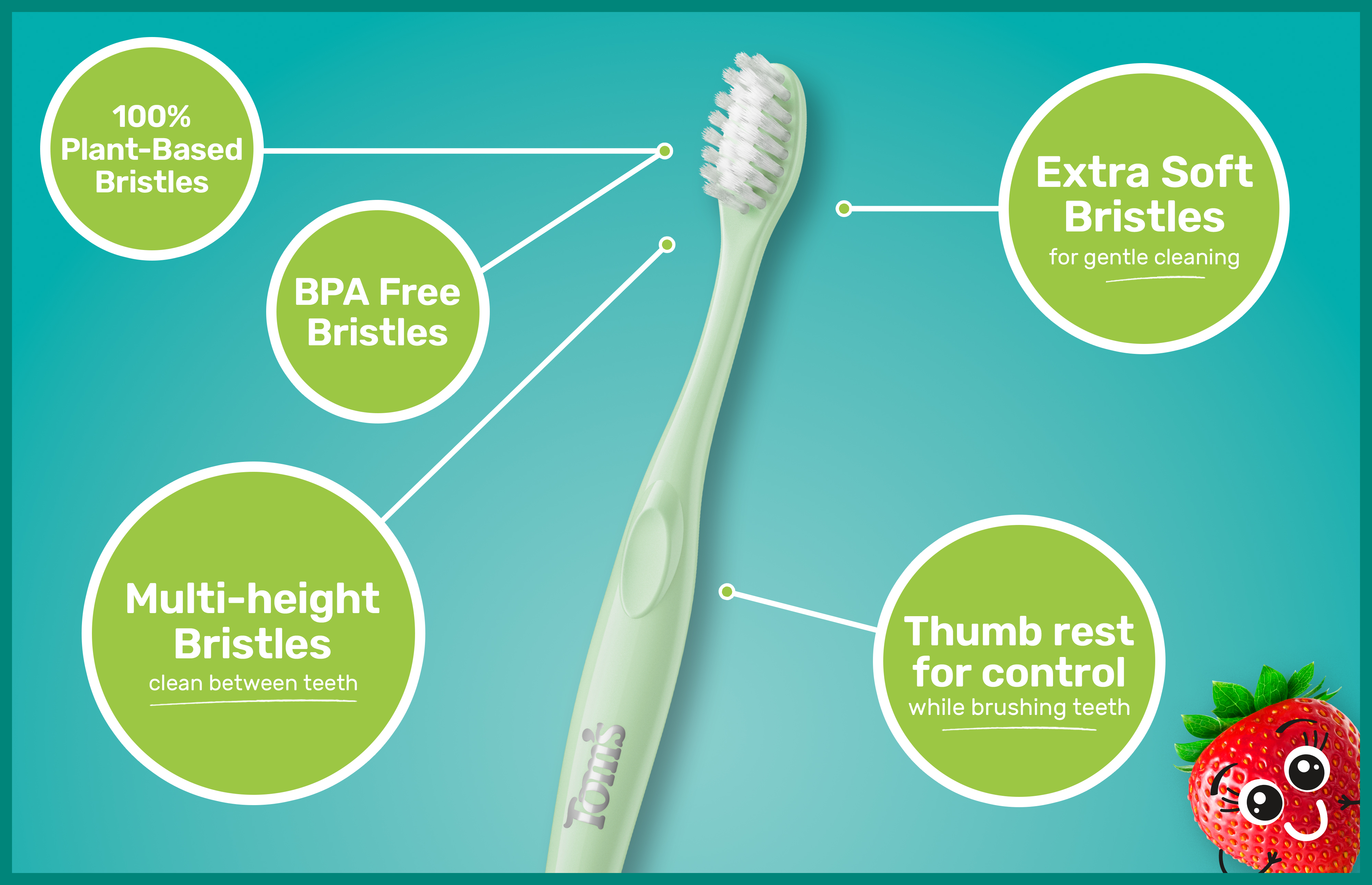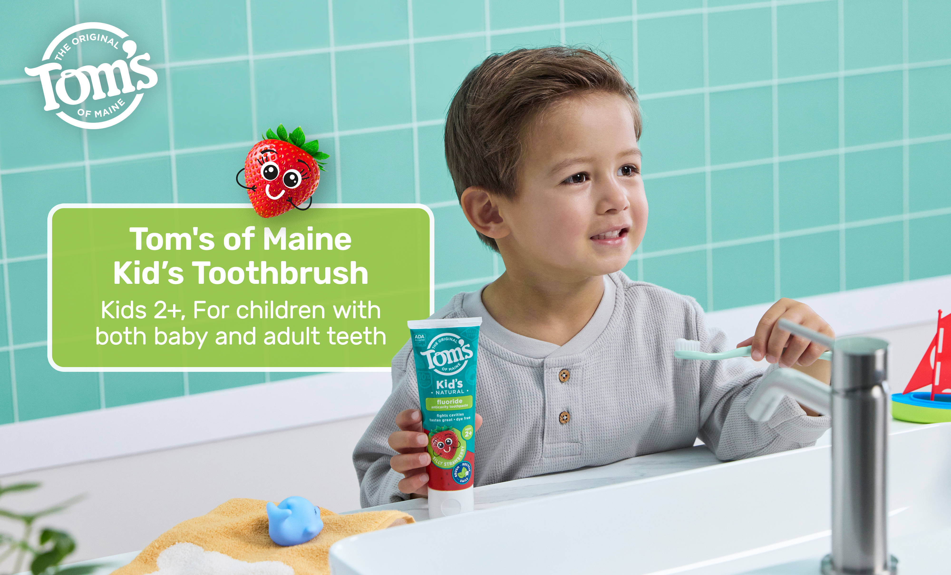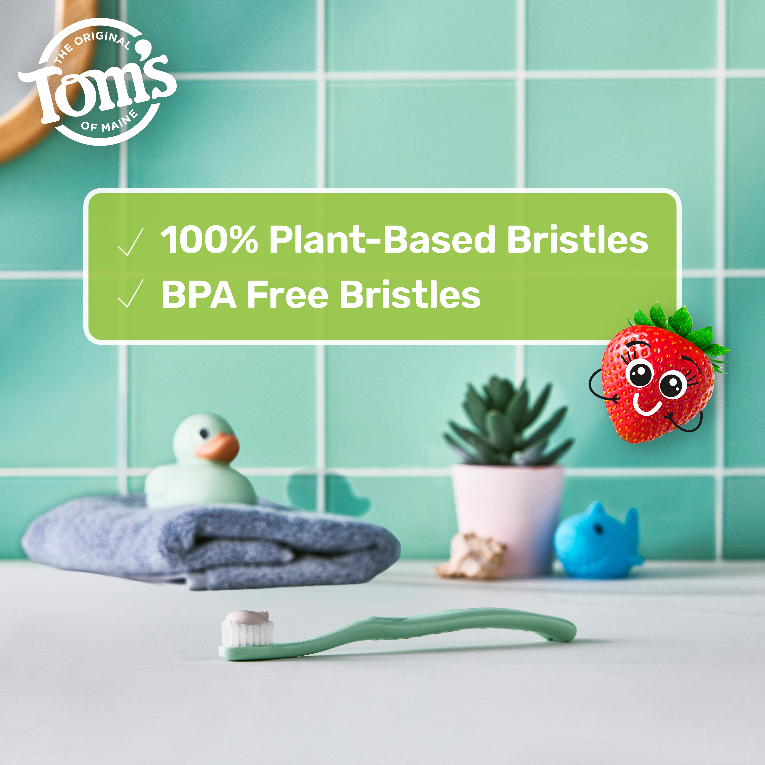 SKU 61053598 Consumer Unit - GTIN 00827854026976 Product Category Oral Care Product Sub Category Manual TB Product Equity (Brand) Tom's of Maine Product Sub Brand Tom's Kids Man TB Product Title Tom's of Maine Extra Soft Kids Toothbrush, 1 Count Product Description Make brushing fun for kids with the Tom’s of Maine Extra Soft Kids Toothbrush. Designed for both children and toddlers ages 2 and up, this playful green kids toothbrush features extra soft toothbrush bristles that offer a gentle yet thorough clean when brushing both baby and adult teeth. The extra soft toothbrush is thoughtfully crafted with BPA-free and dye-free bristles and the handle is colored with food-grade mineral-based pigments. In addition, the kids toothbrush handle is also made from 100% recycled plastic—over 95% recovered from PET bottles—and features a convenient built-in thumb rest for easy control and maneuverability while brushing teeth. This extra soft kids toothbrush uses multi-height bristles to help clean big and small teeth, ensuring a thorough clean. Whether your child is just starting to brush or learning to take care of their own oral hygiene, this Tom’s of Maine kids toothbrush delivers comfort and care every step of the way. eCommerce Copy- Long Description Make brushing fun for kids with the Tom’s of Maine Extra Soft Kids Toothbrush. Designed for kids ages 2 and up, this kids toothbrush has extra soft toothbrush bristles that offer a thorough clean when brushing both baby and adult teeth. In addition, the kids toothbrush handle is also made from 100% recycled plastic—over 95% recovered from PET bottles. Bullet 1 Includes one (1) Tom’s of Maine Extra Soft Kids Toothbrush, BPA-Free Extra Soft Bristle Toothbrush for Kids, Green Bullet 2 The extra soft, BPA-free and dye-free toothbrush bristles provide an effective clean for both baby and adult teeth Bullet 3 This extra soft toddler toothbrush cleans both baby teeth and adult teeth using extra soft, multi-height bristles Bullet 4 This kids toothbrush is specially crafted for children ages 2 and up and features a built-in thumb rest for easy handling for little hands Bullet 5 The Tom's of Maine kids toothbrush is made from 100% recycled plastic—over 95% recovered from PET bottles Bullet 6 This small toothbrush for kids is thoughtfully designed for toddlers just starting out and kids learning to brush on their own Bullet 7 Encourage good oral care habits early on and make teeth brushing fun for kids with the Tom’s of Maine Extra Soft Kids Toothbrush