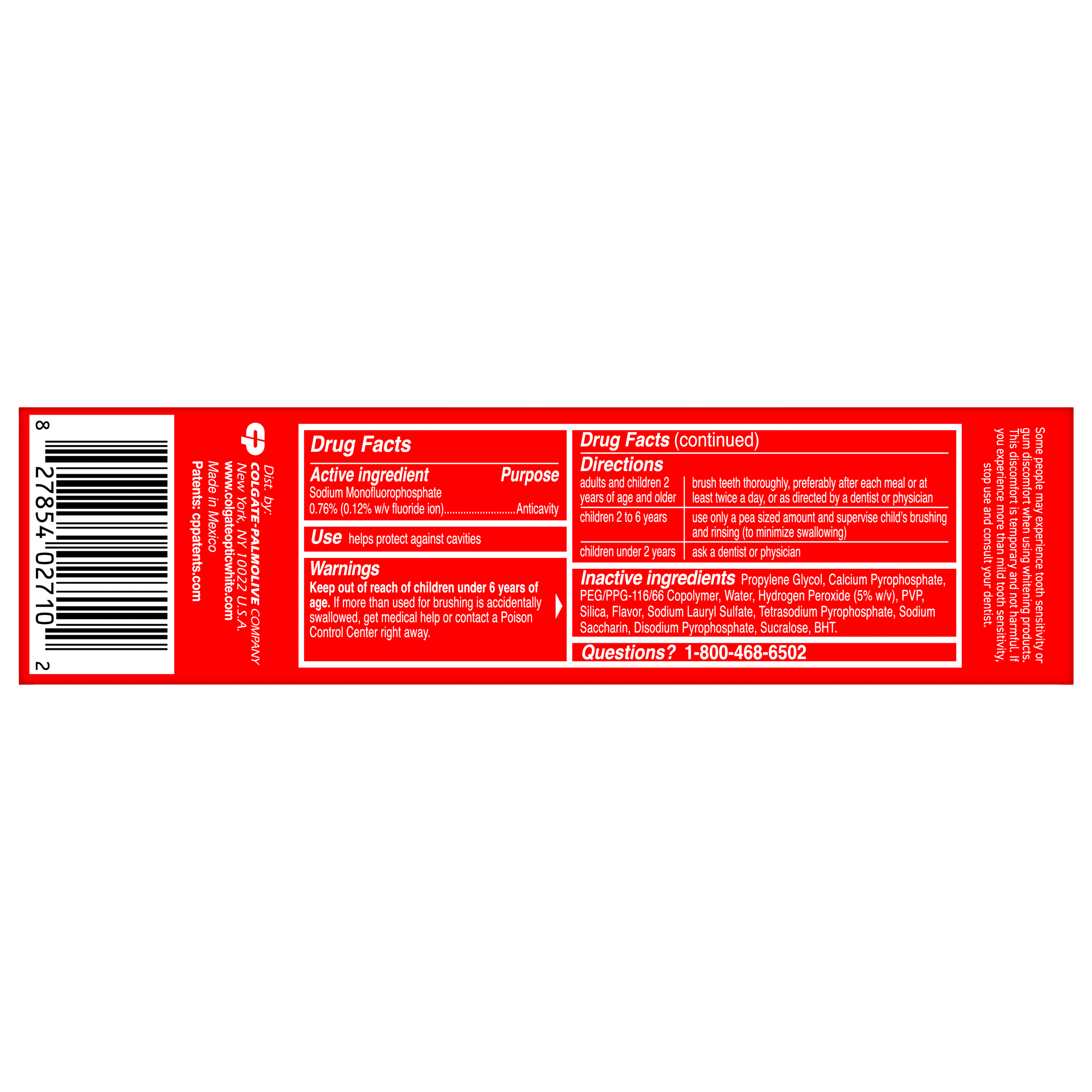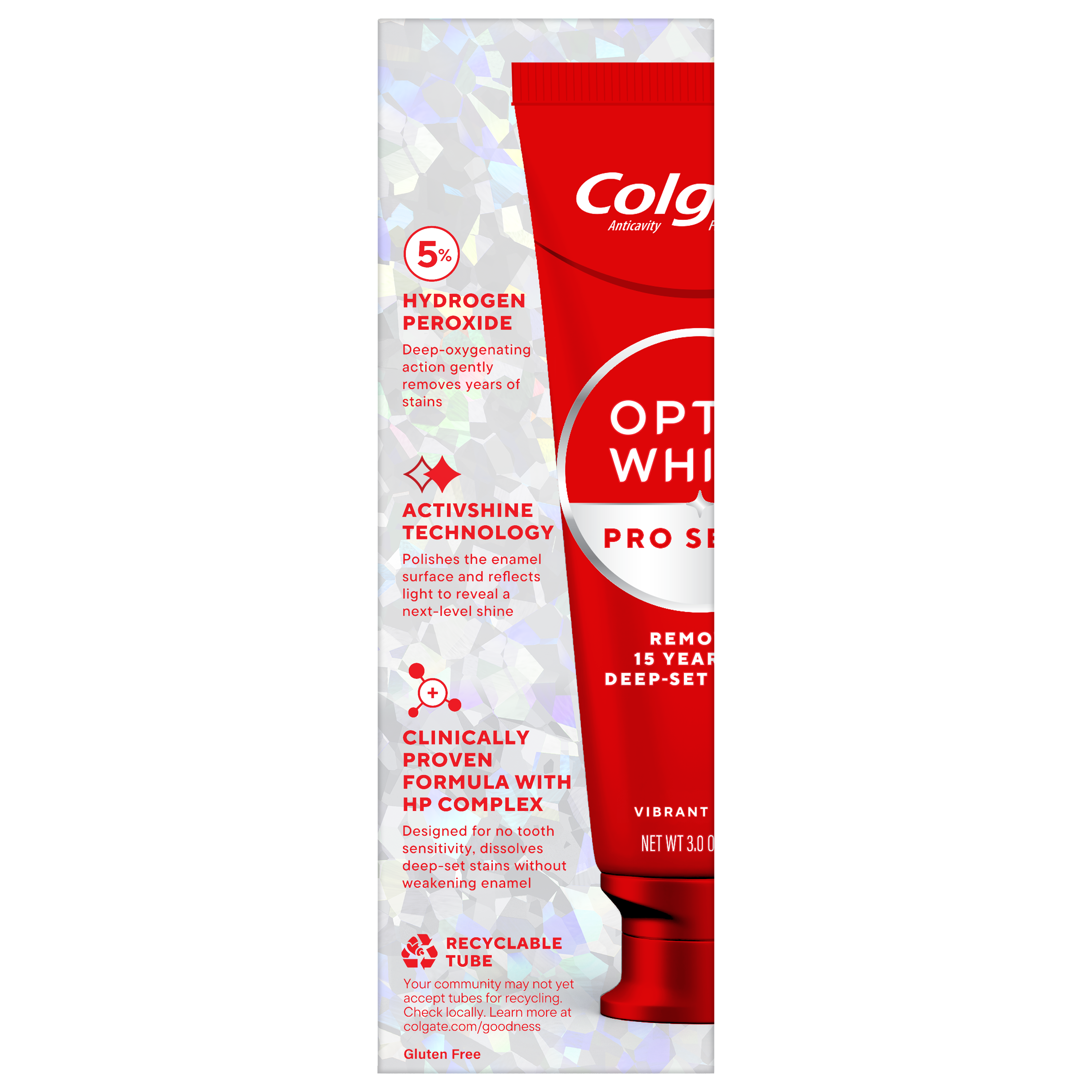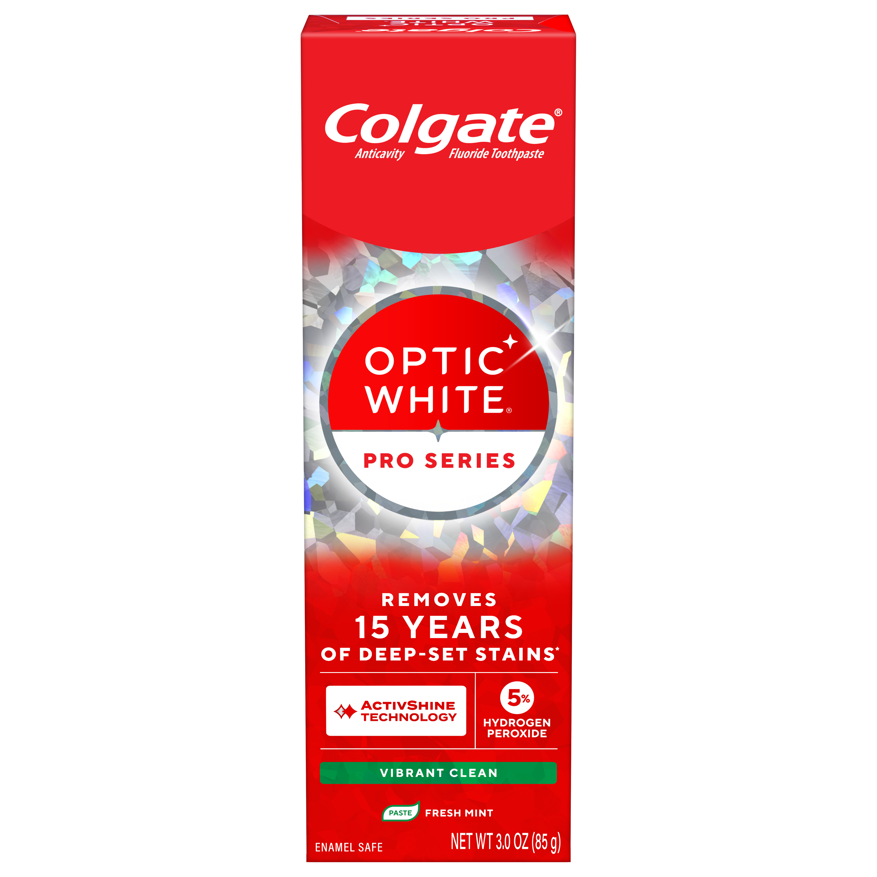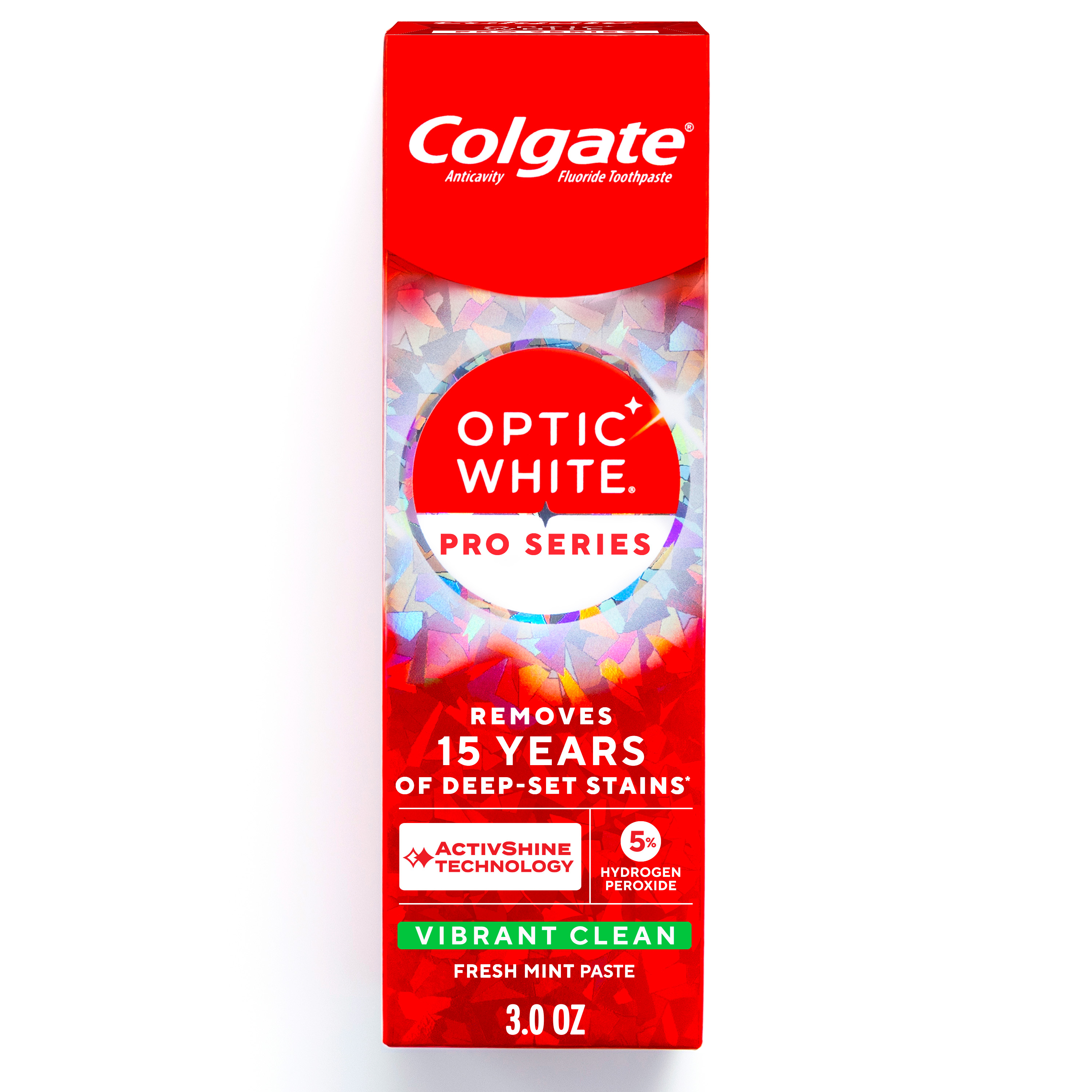 SKU 61053727 Consumer Unit - GTIN 00827854027102 Case - GTIN 10827854027109 Product Category Oral Care Product Sub Category Toothpaste Product Equity (Brand) Colgate Product Sub Brand Colgate Optic White TP Product Title Colgate Optic White Pro Series Vibrant Clean Toothpaste, 3.0 OZ Product Description Powered by HP Complex, our unique formulation of Hydrogen Peroxide, Optic White Pro Series gives you 5X whiter teeth than the leading whitening toothpaste after 1 day*. This clinically proven formula contains Hydrogen Peroxide, the same whitening ingredient used by dentists. Plus, innovative ActivShine Technology polishes the enamel surface to reveal next-level shine. With a clean fresh mint flavor, Pro Series Vibrant Clean Toothpaste delivers fresh breath while its innovative ActiveShine Technology polishes enamel and reflects light for a glowing smile. With this invigorating mint toothpaste, there’s no need to choose between fresh breath and a bright smile. Pro Series Toothpaste starts whitening after the first brush. That’s thanks to its dual-action teeth whitening formula, which brushes surface stains away while dissolving the tough stains beneath. 85% of people notice a positive difference in their teeth in 7 days when used as directed. After two weeks, this teeth whitening toothpaste removes 15 years of stains**. *vs. Crest 3D White Advanced silica-based toothpaste. Use as directed. **when brushing twice daily for 2 weeks eCommerce Copy- Long Description Colgate Optic White Advanced Vibrant Clean Toothpaste deeply whitens for up to 4 shades.* This teeth whitening toothpaste contains 2% hydrogen peroxide, a professionally recommended whitening ingredient proven to deeply whiten beyond surface stains. This vegan toothpaste is good for daily use, enamel-safe, and the fluoride toothpaste formula provides protection against cavities. Get a brighter, whiter, bolder smile with Colgate Optic White Advanced Vibrant Clean Toothpaste. *when brushing twice daily for 6 weeks. Bullet 1 One 3.0 OZ tube of Colgate Optic White Pro Series Vibrant Clean Toothpaste, Fresh Mint Flavor Bullet 2 Get 5X whiter teeth than the leading teeth whitening toothpaste after 1 day* *vs. Crest 3D White Advanced silica-based toothpaste, use as directed Bullet 3 Includes 5% hydrogen peroxide, plus uses a clinically proven formula with HP complex to remove both deep-set and surface stains Bullet 4 Whitening power with exceptionally fresh breath Bullet 5 ActivShine Technology polishes the enamel surface and reflects light to reveal a next-level shine Bullet 6 Invigorating fresh mint toothpaste combines clean eucalyptus and smooth wintergreen flavors Bullet 7 Effectively removes tea, coffee, and wine stains, as shown in a laboratory study Active Ingredients Sodium Monofluorophosphate 0.76% (0.12% w/v fluoride ion) Amazon RPC B0FRBY4J9G AMZ URL https://www.amazon.com/dp/B0FRBY4J9G CVS RPC 414260
