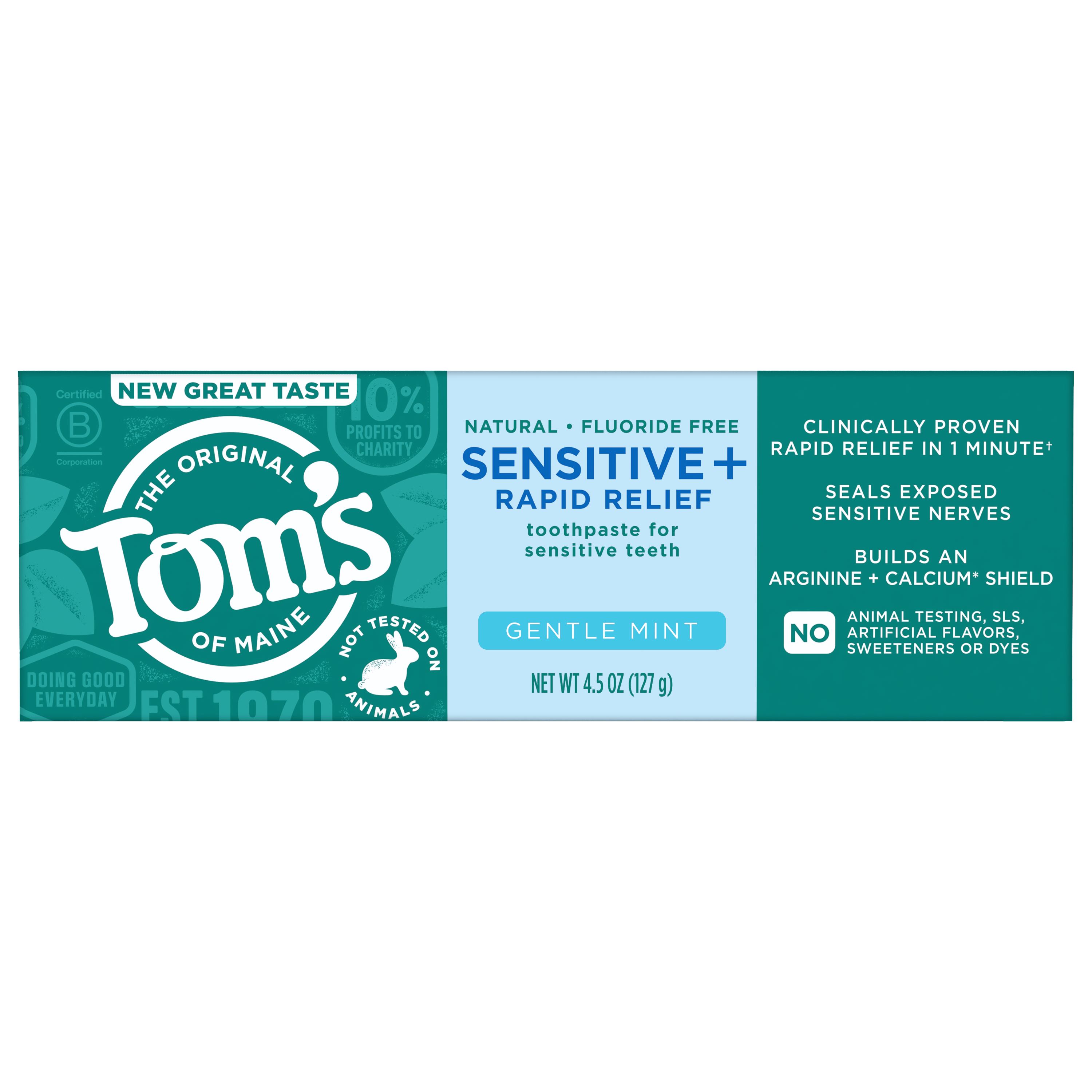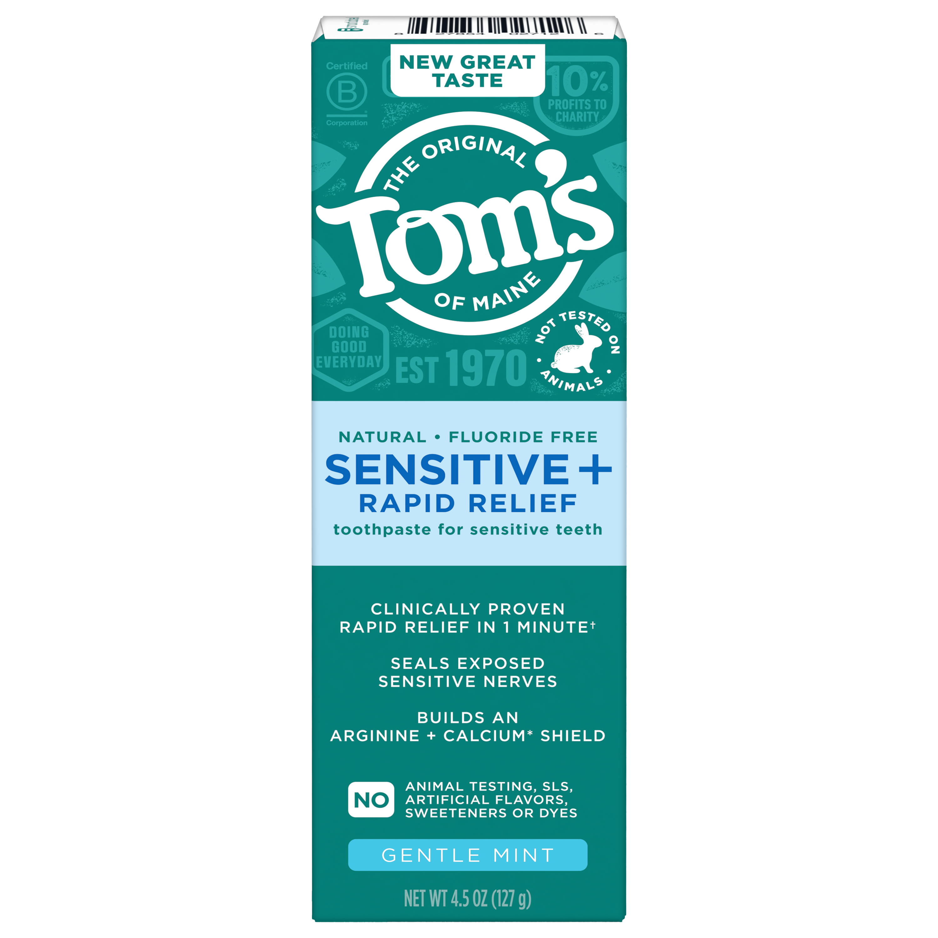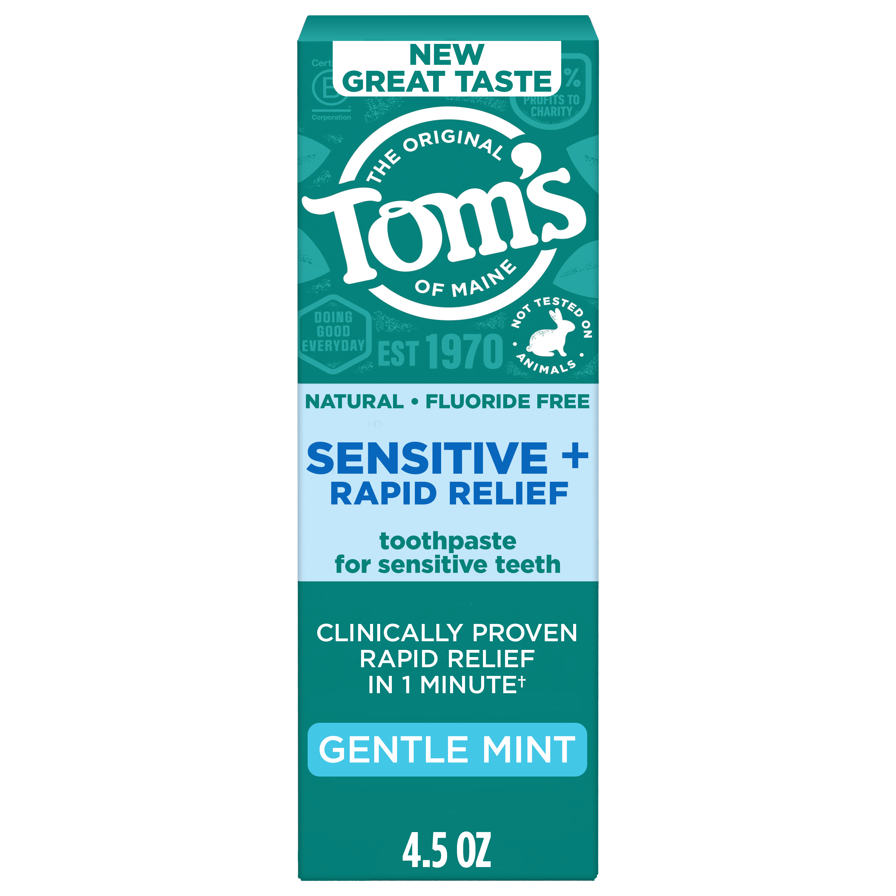 | Product Description | Experience clinically proven rapid sensitivity relief in 1 minute* with Tom’s of Maine Rapid Relief Sensitive Toothpaste. This natural fluoride free toothpaste for sensitive teeth features an improved great taste and helps deliver fast sensitivity relief for sensitive teeth within 1 minute*. This Tom’s of Maine sensitive teeth toothpaste uses mineral-derived Calcium Carbonate and plant-based Arginine to help provide sensitive teeth relief. With continued use, this tooth sensitivity treatment helps block sensitivity pain by forming a calcium-rich layer that seals open nerve channels on sensitive teeth. Using Tom’s of Maine Rapid Relief Sensitive Toothpaste helps build an Arginine and Calcium Carbonate shield around teeth, to help you tolerate hot and cold foods and drinks without worrying about teeth sensitivity. The fluoride free natural toothpaste comes in a Gentle Mint toothpaste flavor. Plus, it’s an SLS free toothpaste that is free from artificial flavors, sweeteners, dyes, gluten, and has not been tested on animals.
