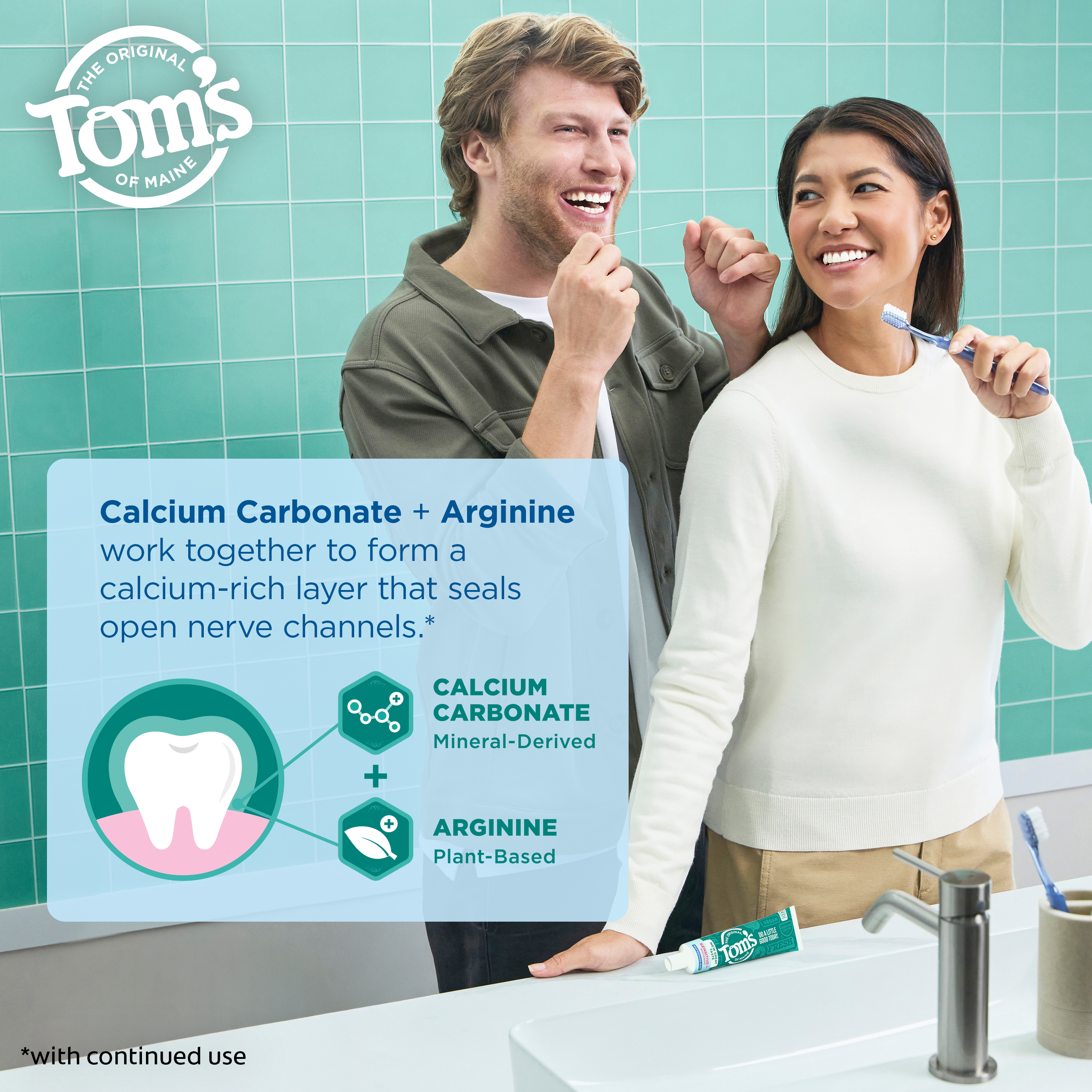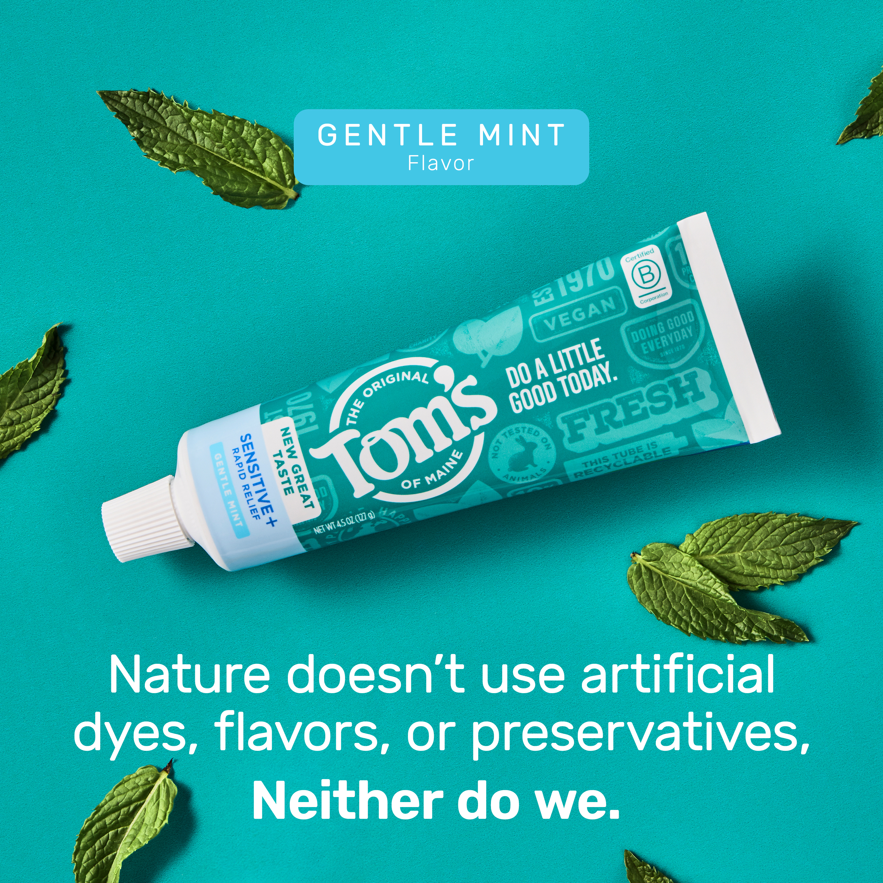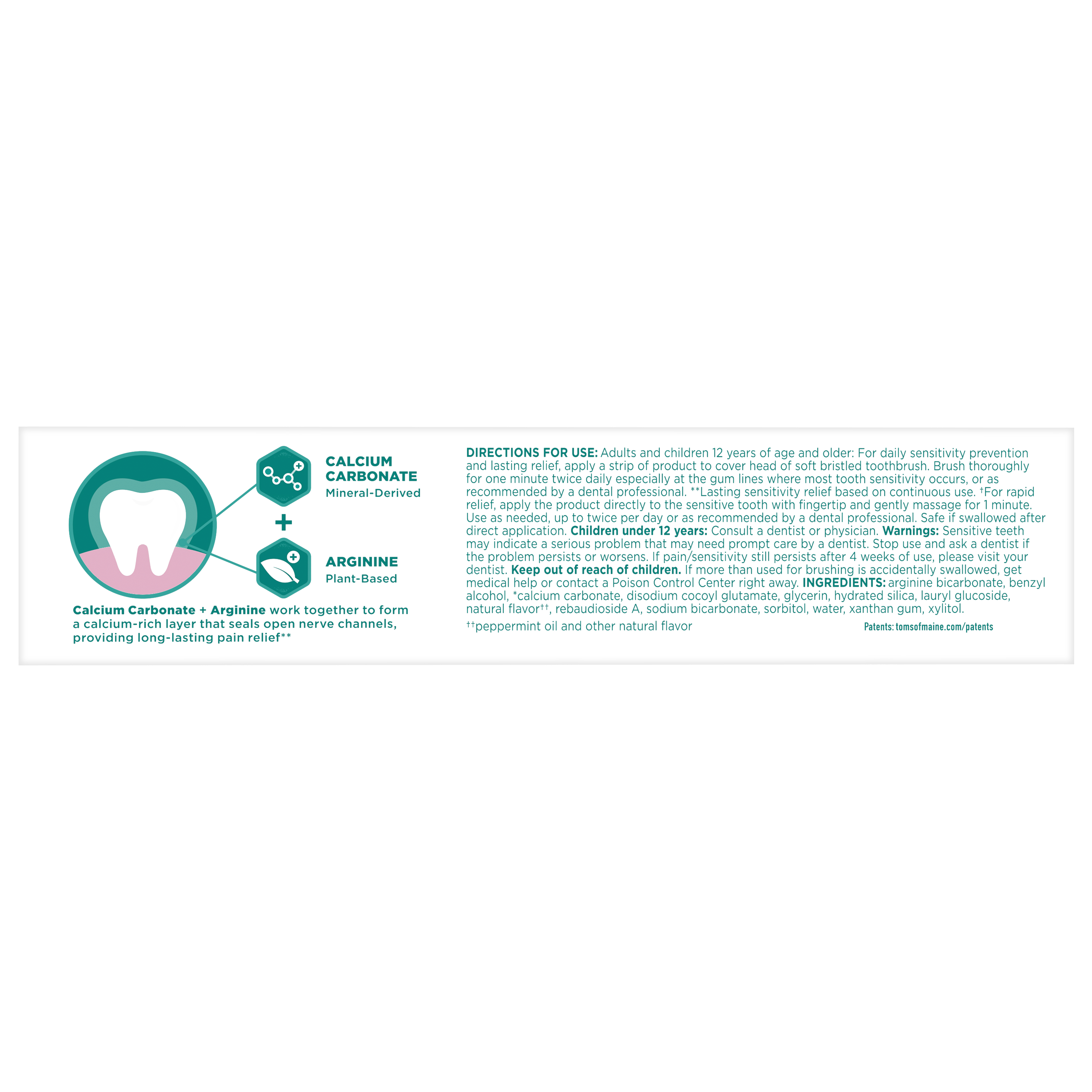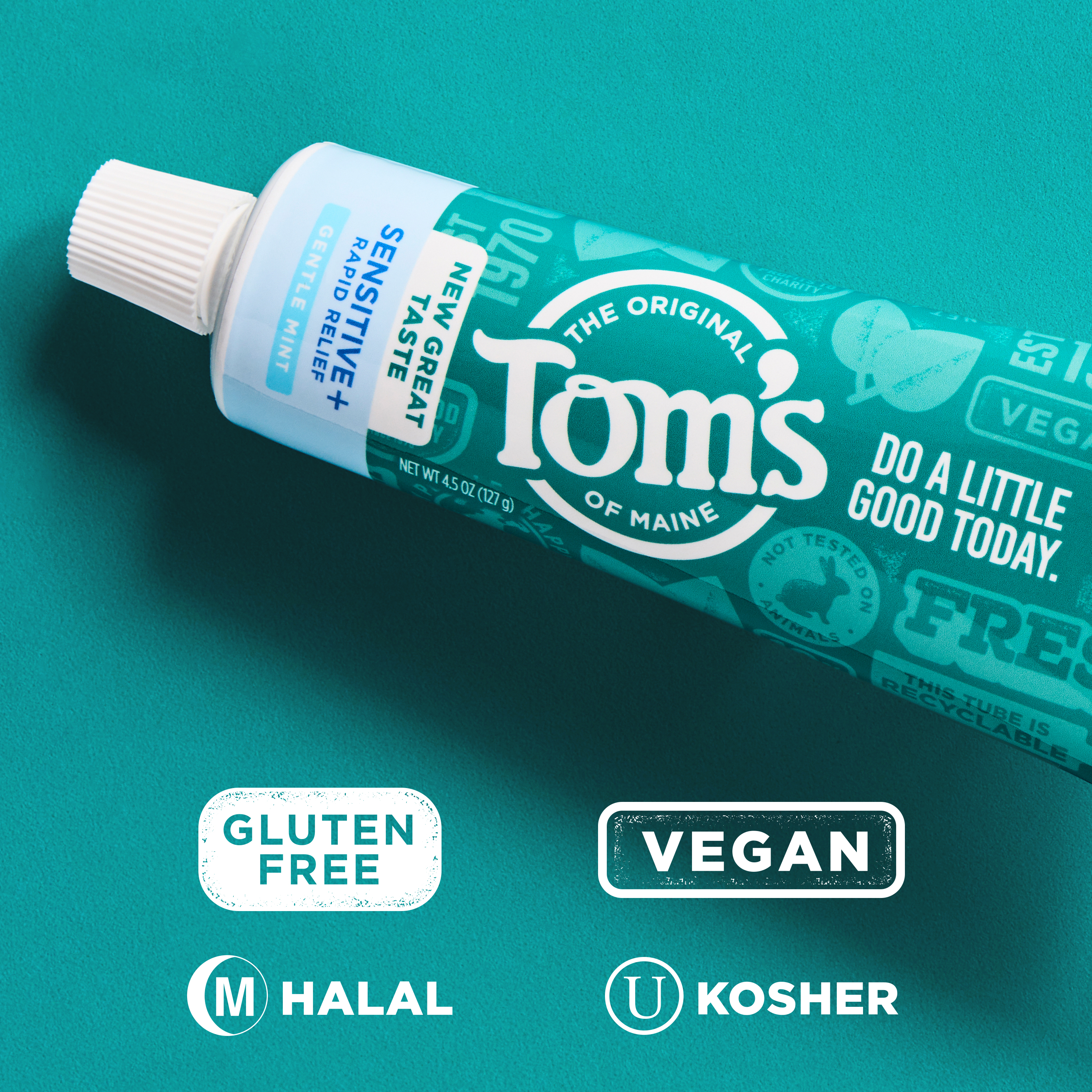 | Product Description | Experience clinically proven rapid sensitivity relief in 1 minute* with Tom’s of Maine Rapid Relief Sensitive Toothpaste. This natural fluoride free toothpaste for sensitive teeth features an improved great taste and helps deliver fast sensitivity relief for sensitive teeth within 1 minute*. This Tom’s of Maine sensitive teeth toothpaste uses mineral-derived Calcium Carbonate and plant-based Arginine to help provide sensitive teeth relief. With continued use, this tooth sensitivity treatment helps block sensitivity pain by forming a calcium-rich layer that seals open nerve channels on sensitive teeth. Using Tom’s of Maine Rapid Relief Sensitive Toothpaste helps build an Arginine and Calcium Carbonate shield around teeth, to help you tolerate hot and cold foods and drinks without worrying about teeth sensitivity. The fluoride free natural toothpaste comes in a Gentle Mint toothpaste flavor. Plus, it’s an SLS free toothpaste that is free from artificial flavors, sweeteners, dyes, gluten, and has not been tested on animals.