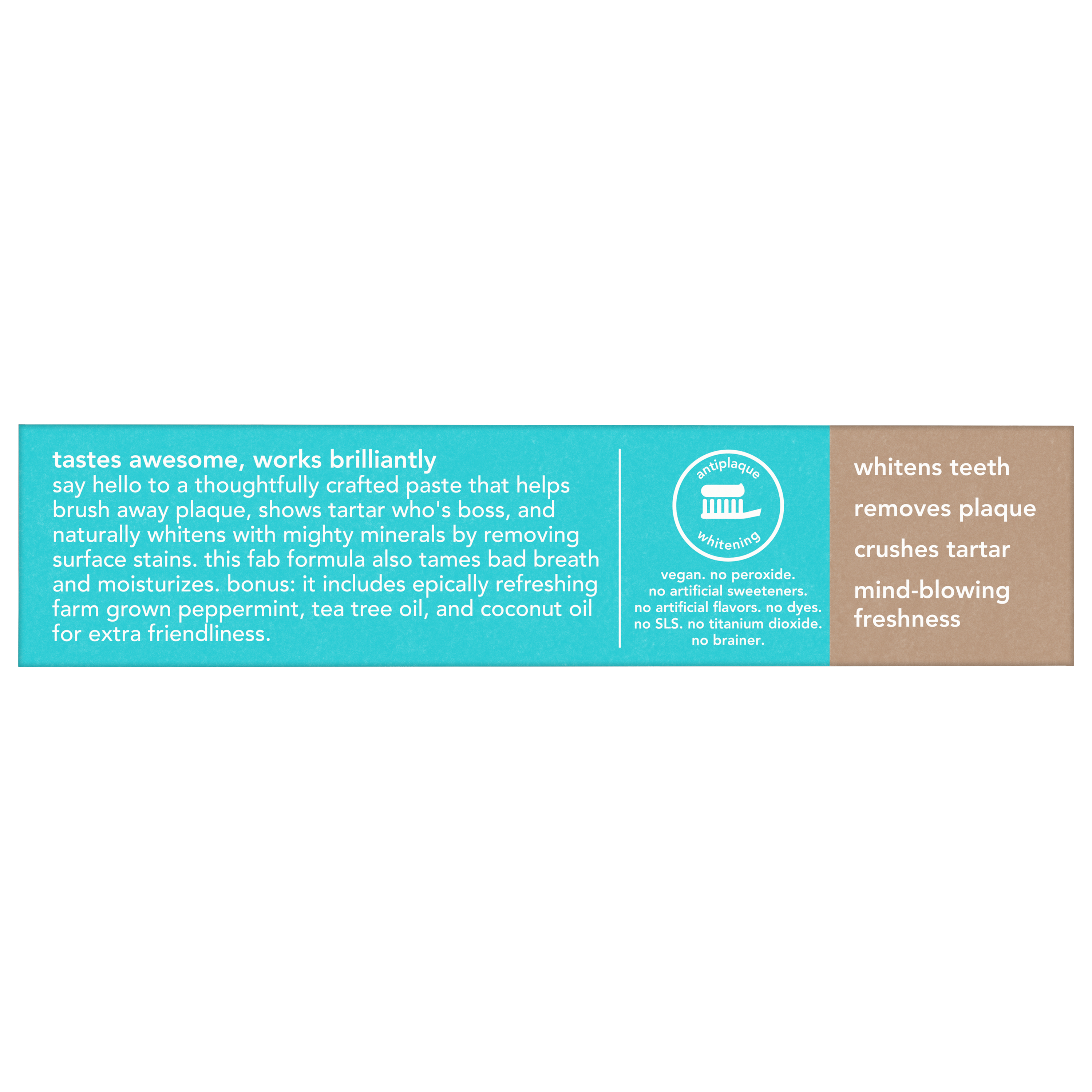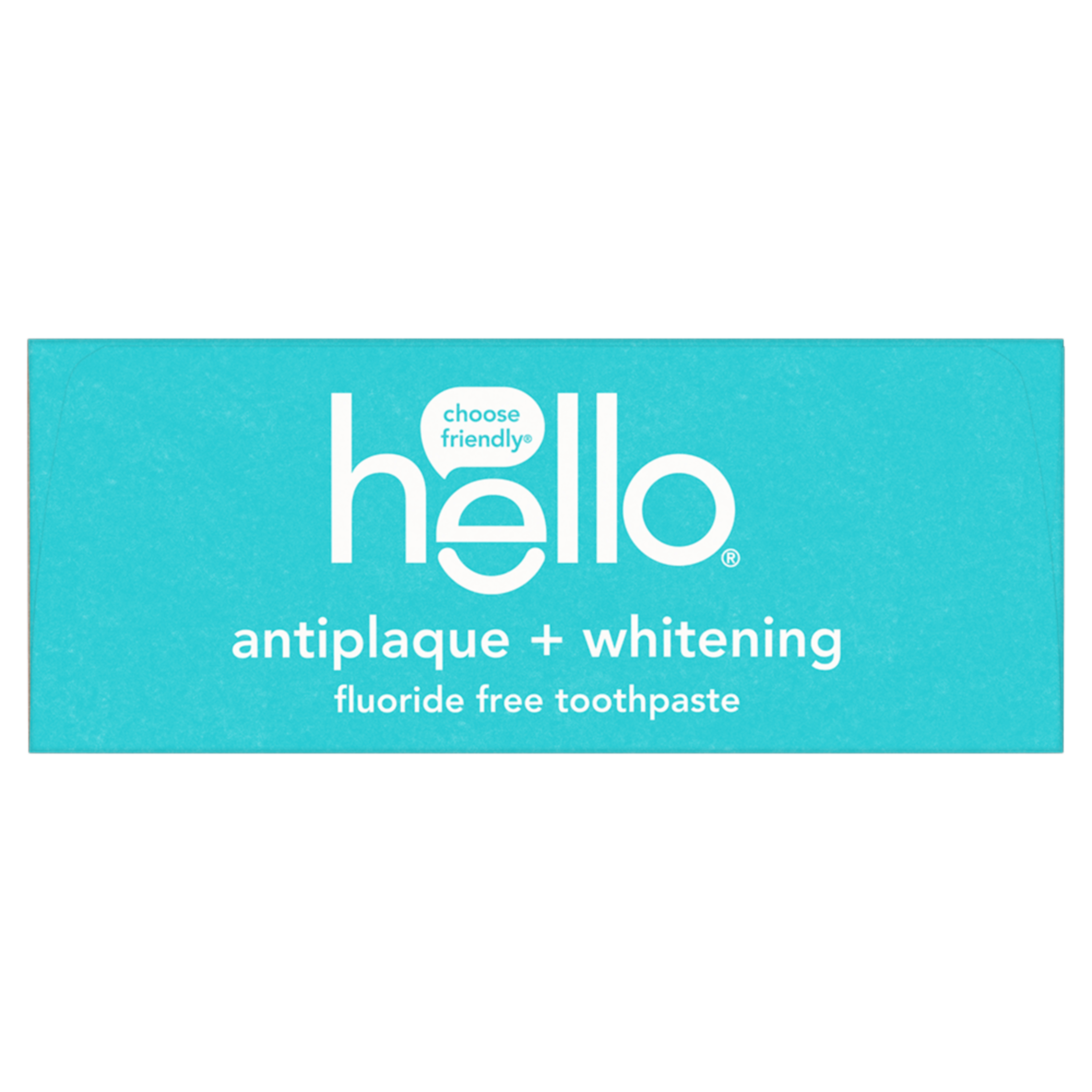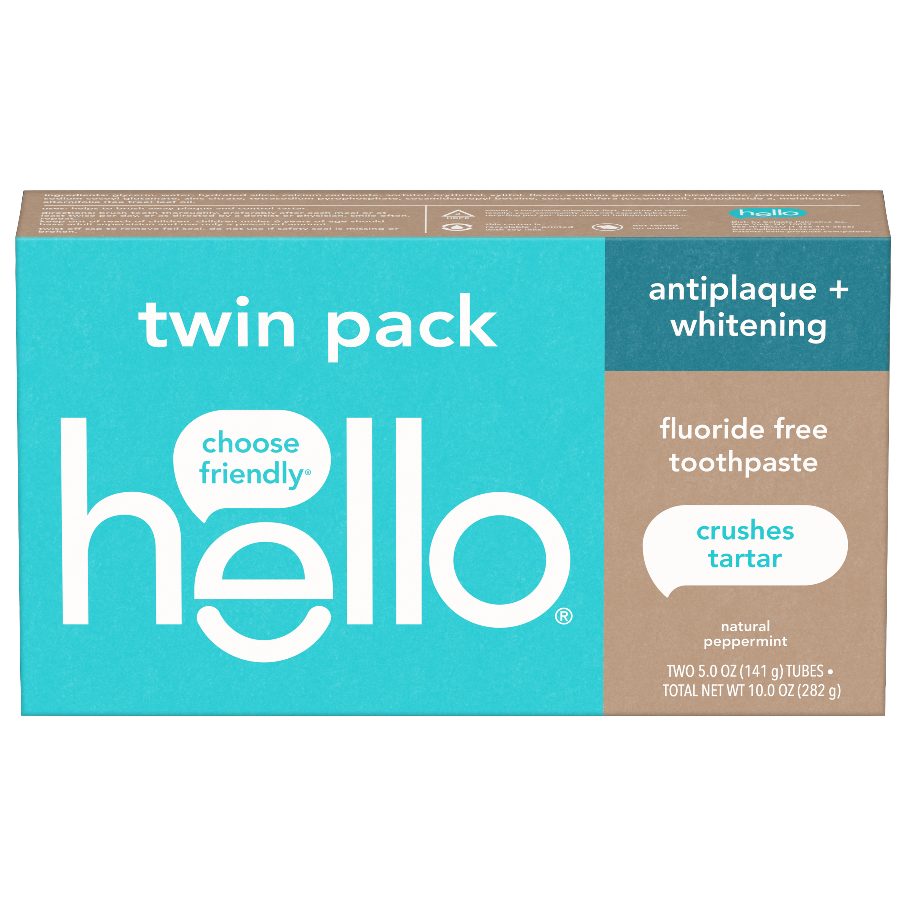 SKU 61053897 Consumer Unit - GTIN 00827854027218 Case - GTIN 10827854027215 Product Category Oral Care Product Sub Category Toothpaste Product Equity (Brand) hello Product Sub Brand Hello Adult TP Product Title hello Antiplaque and Whitening Fluoride Free Toothpaste, Natural Peppermint, 2 Pack, 5 Oz Product Description Say hello to a thoughtfully crafted fluoride free toothpaste that helps whiten teeth and crush tartar at the same time with hello Antiplaque and Whitening Toothpaste Pack. This 2 pack of fluoride free teeth whitening toothpaste for adults helps brush away plaque with regular brushing and includes high quality ingredients like farm grown peppermint, tea tree oil, and coconut oil to help tame bad breath and moisturize magnificently. Show tartar who’s boss with hello Antiplaque Natural Whitening Toothpaste, a fluoride free whitening toothpaste that helps brush away plaque with regular brushing and naturally whitens with mighty minerals by removing surface stains. Plus, this peppermint toothpaste is a fluoride free toothpaste that tastes awesome and works brilliantly to tame bad breath, helping you start the day with minty fresh breath. This hello fluoride free toothpaste is a vegan toothpaste and an SLS free toothpaste and contains no artificial sweeteners, no artificial flavors, no peroxide, no synthetic dyes, no titanium dioxide, no parabens, and is gluten free. No-brainer. As if that weren't enough magic for one tube, hello antiplaque toothpaste is also not tested on animals. Show tartar who’s boss and choose friendly with this fluoride free hello Antiplaque Whitening Toothpaste eCommerce Copy- Long Description Say hello to a friendly fluoride free toothpaste that helps whiten teeth and crush tartar with hello Antiplaque Fluoride Free Whitening Toothpaste. This fluoride free toothpaste pack is thoughtfully formulated with high quality ingredients like farm grown peppermint, tea tree oil, and coconut oil to help tame bad breath. Add a bit of friendly freshness to your brushing routine with this peppermint toothpaste from hello. This hello whitening toothpaste helps brush away plaque, shows tartar who’s boss, and naturally whitens with mighty minerals by removing surface stains. Plus, the fab formula moisturizes so you can start your day with minty fresh breath and smile brighter. This hello fluoride free toothpaste doubles as a vegan toothpaste and a SLS free toothpaste and contains no peroxide, no artificial sweeteners, no artificial flavors, no dyes, no titanium dioxide, and no SLS. No-brainer. As if that weren't enough magic for these three tubes, hello toothpaste is also not tested on animals. We're serious about being friendly, and about what goes into our paste. Bullet 1 Includes two (2) 5.0 oz tubes of hello Antiplaque and Whitening Fluoride Free Toothpaste, Natural Peppermint Toothpaste Flavor Bullet 2 This natural whitening toothpaste whitens with friendly minerals by removing surface stains Bullet 3 This mint toothpaste pack is formulated with refreshing farm grown peppermint, tea tree oil to tame bad breath, and coconut oil to moisturize Bullet 4 hello Antiplaque Toothpaste is a plaque remover toothpaste that helps remove plaque and crush tartar with regular brushing Bullet 5 Contains no SLS, peroxide, dyes, parabens, artificial sweeteners or flavors, titanium dioxide, and is a gluten free vegan toothpaste Bullet 6 Tame bad breath and add a bit of friendly freshness to your brushing routine with this hello peppermint toothpaste pack Bullet 7 Say hello to an SLS free toothpaste that is fluoride free, helps whiten teeth, and crush tartar with this hello Antiplaque and Whitening Toothpaste Walmart RPC 18738960612 Walmart URL (Computed) https://www.walmart.com/ip/a/18738960612 Target RPC 94823735 Target URL https://www.target.com/p/a/-/A-94823735