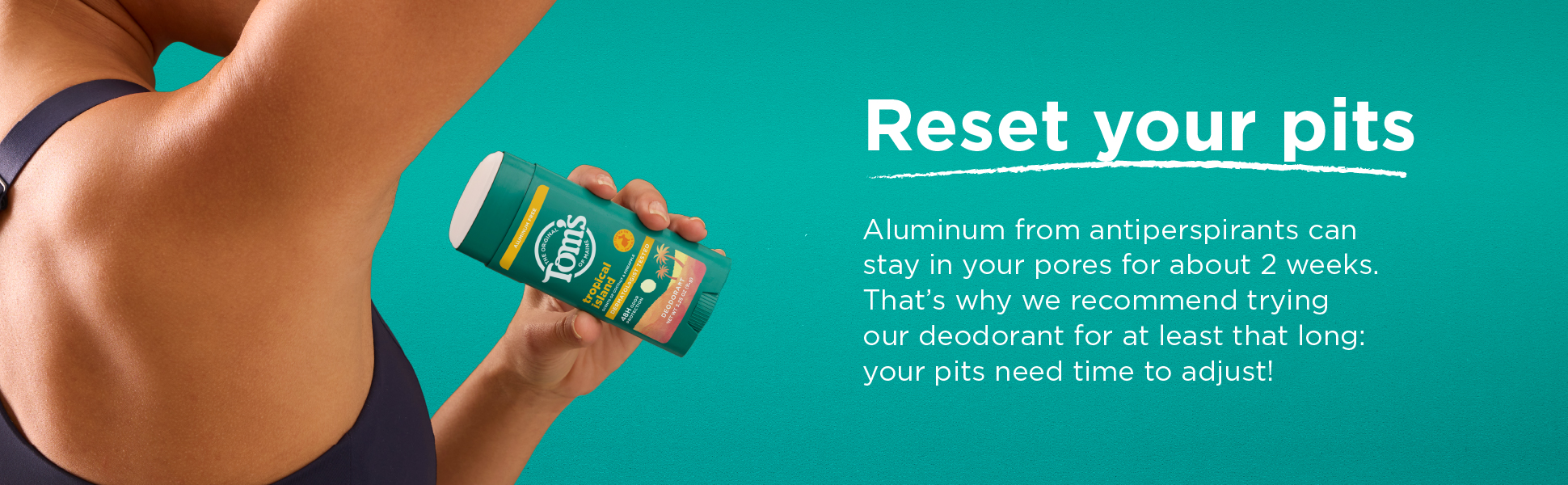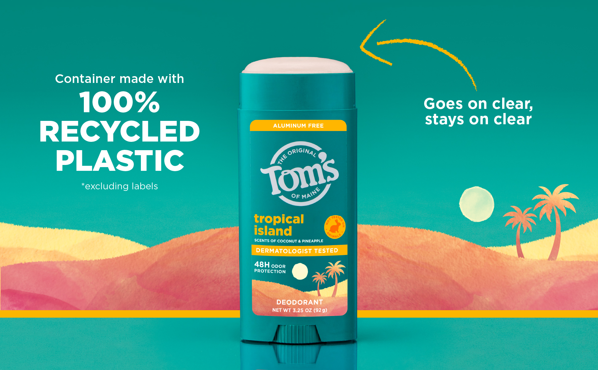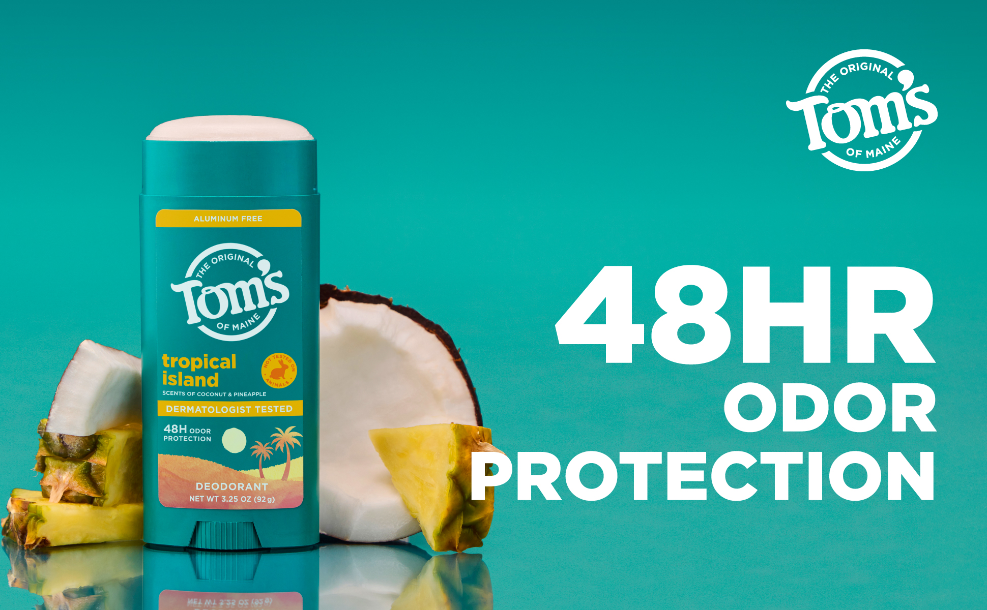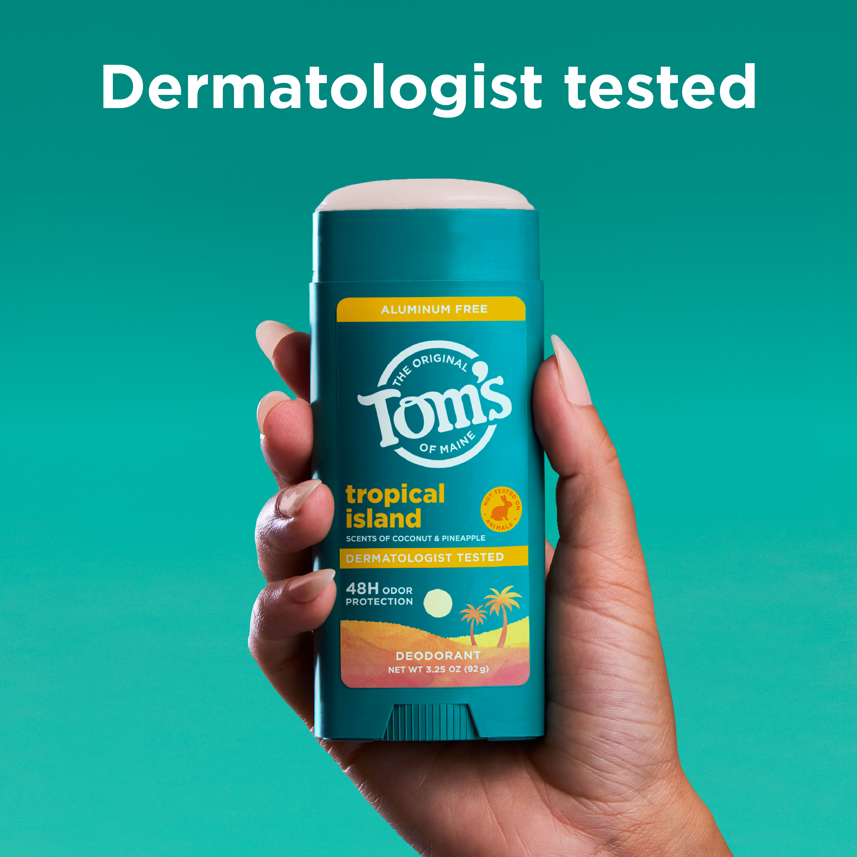 SKU 61054110 Consumer Unit - GTIN 00827854027515 Case - GTIN 10827854027512 Product Category Personal Care Product Sub Category AP > Deo Product Equity (Brand) Tom's of Maine Product Sub Brand Tom's AP/Deo Product Title Tom’s of Maine Tropical Island Natural Deodorant for Men and Women, Aluminum Free, No Artificial Fragrances, Dyes, or Preservatives, Baking Soda Free, 48-Hour Odor Protection, 3.25 oz Product Description Tom’s of Maine Tropical Island Deodorant is crafted for men and women seeking natural odor protection. This dermatologist tested, aluminum free deodorant uses naturally sourced and derived moisture locking ingredients for 48-hour odor protection. The formula is vegan, cruelty free, baking soda free, and paraben free, with no artificial fragrances, dyes, or preservatives; making it perfect for everyday use. Our stick deodorant features a sun-kissed paradise of pineapple, coconut, and mango breezing through palm trees. Aluminum from antiperspirants can stay in your pores for about 2 weeks. That’s why we recommend trying our natural deodorant for at least that long—your pits need time to adjust! Count on long-lasting protection for active lifestyles and everyday routines. This formula is designed for a smooth glide and goes on clear and stays clear. Keep this trusted personal care product in your gym bag, travel bag, or bathroom. The 3.25 oz container is made from 100% recycled plastic*. Choose Tom’s of Maine for freshness and confidence every day, the natural way. *excluding label eCommerce Copy- Long Description Tom’s of Maine Tropical Island Deodorant is crafted for men and women seeking natural odor protection. This dermatologist tested, aluminum free deodorant uses naturally sourced and derived moisture locking ingredients for 48-hour odor protection. The formula is vegan, cruelty free, baking soda free, and paraben free, with no artificial fragrances, dyes, or preservatives; making it perfect for everyday use. made with no artificial fragrances, our stick deodorant features a sun-kissed paradise of pineapple, coconut, and mango breezing through palm trees. Aluminum from antiperspirants can stay in your pores for about 2 weeks. That’s why we recommend trying our natural deodorant for at least that long—your pits need time to adjust! Count on long-lasting protection for active lifestyles and everyday routines. This formula is designed for a smooth glide and goes on clear and stays clear. Keep this trusted personal care product in your gym bag, travel bag, or bathroom. The 3.25 oz container is made from 100% recycled plastic*. Choose Tom’s of Maine for freshness and confidence every day, the natural way. *excluding label Bullet 1 Includes one 3.25 oz stick of Tom’s of Maine Tropical Island Natural Deodorant; featuring coconut, pineapple, and mango scent notes Bullet 2 Our underarm deodorant for everyone offers 48-hour odor protection, keeping you dry throughout the day Bullet 3 Goes on clear and stays clear with a formula designed for a smooth glide that keeps you confident all day Bullet 4 Tom’s deodorant is aluminum-free, made without artificial fragrances, dyes, preservatives, or baking soda, and is not tested on animals Bullet 5 We’re doing our part with a container made entirely from recycled plastic* Bullet 6 This stick deodorant is designed for women, men, teens, and anyone seeking gentle care Bullet 7 Keep this trusted personal care product in your gym bag, travel bag, or bathroom for on-the-go freshness Amazon RPC B0G7MV6XW1 AMZ URL https://www.amazon.com/dp/B0G7MV6XW1