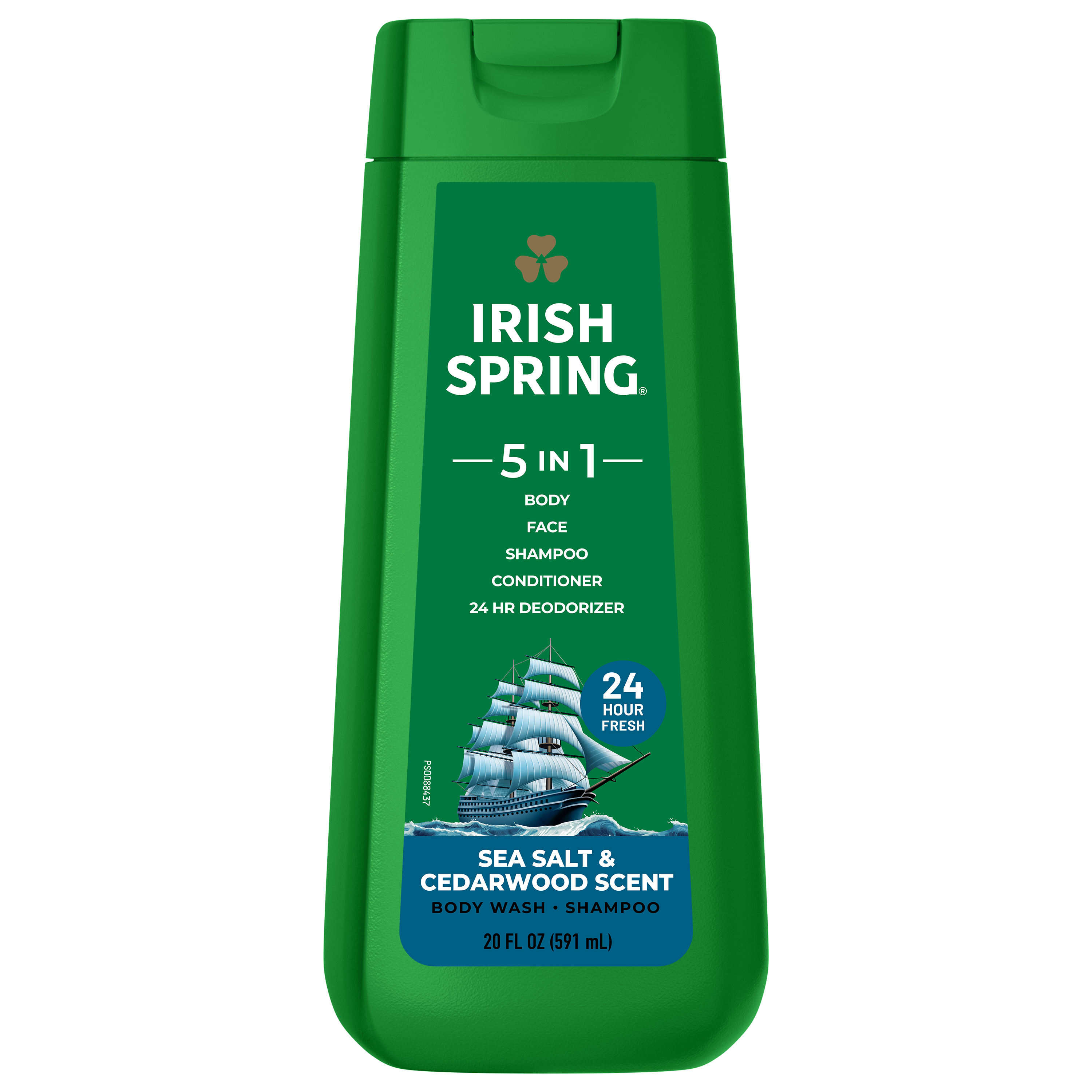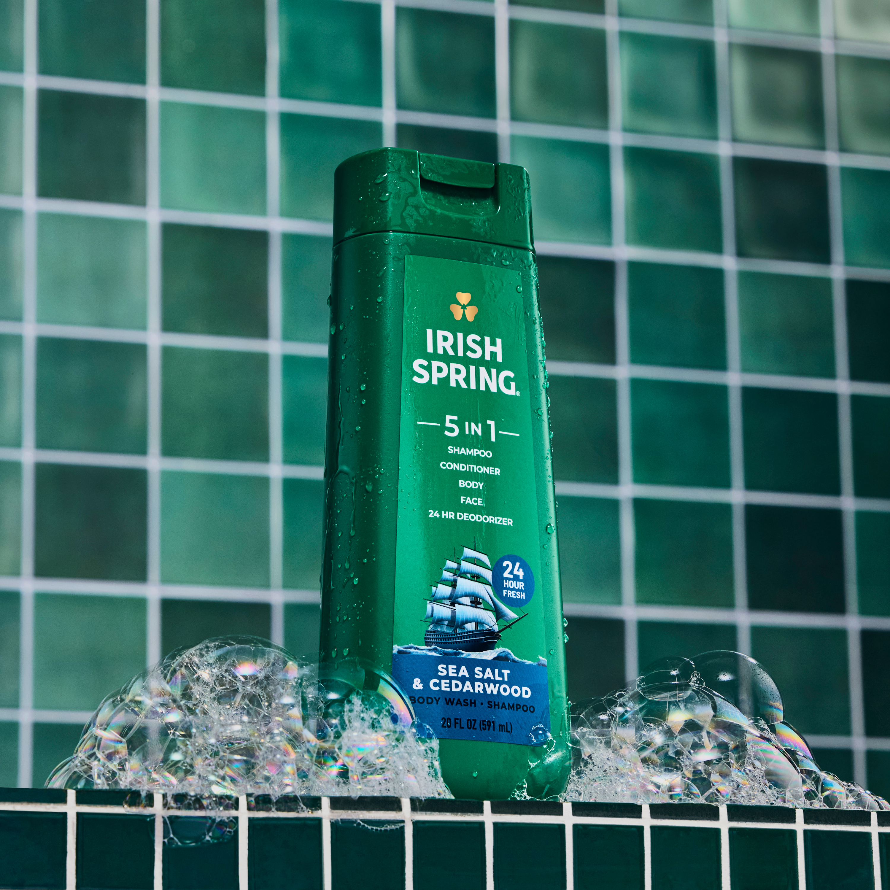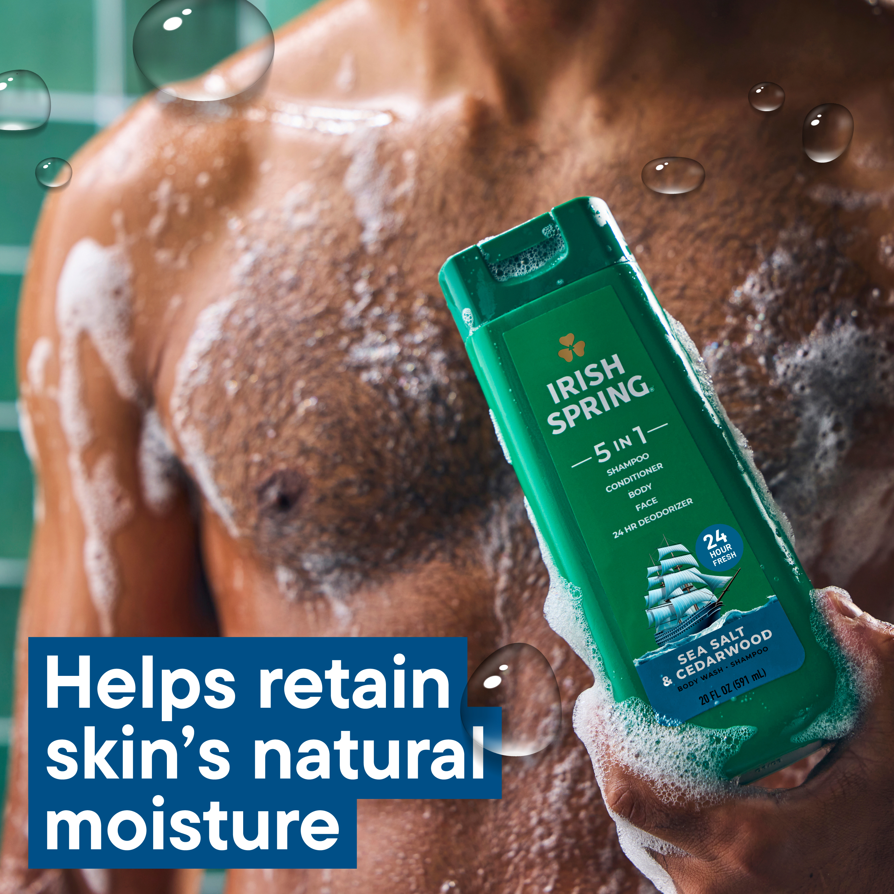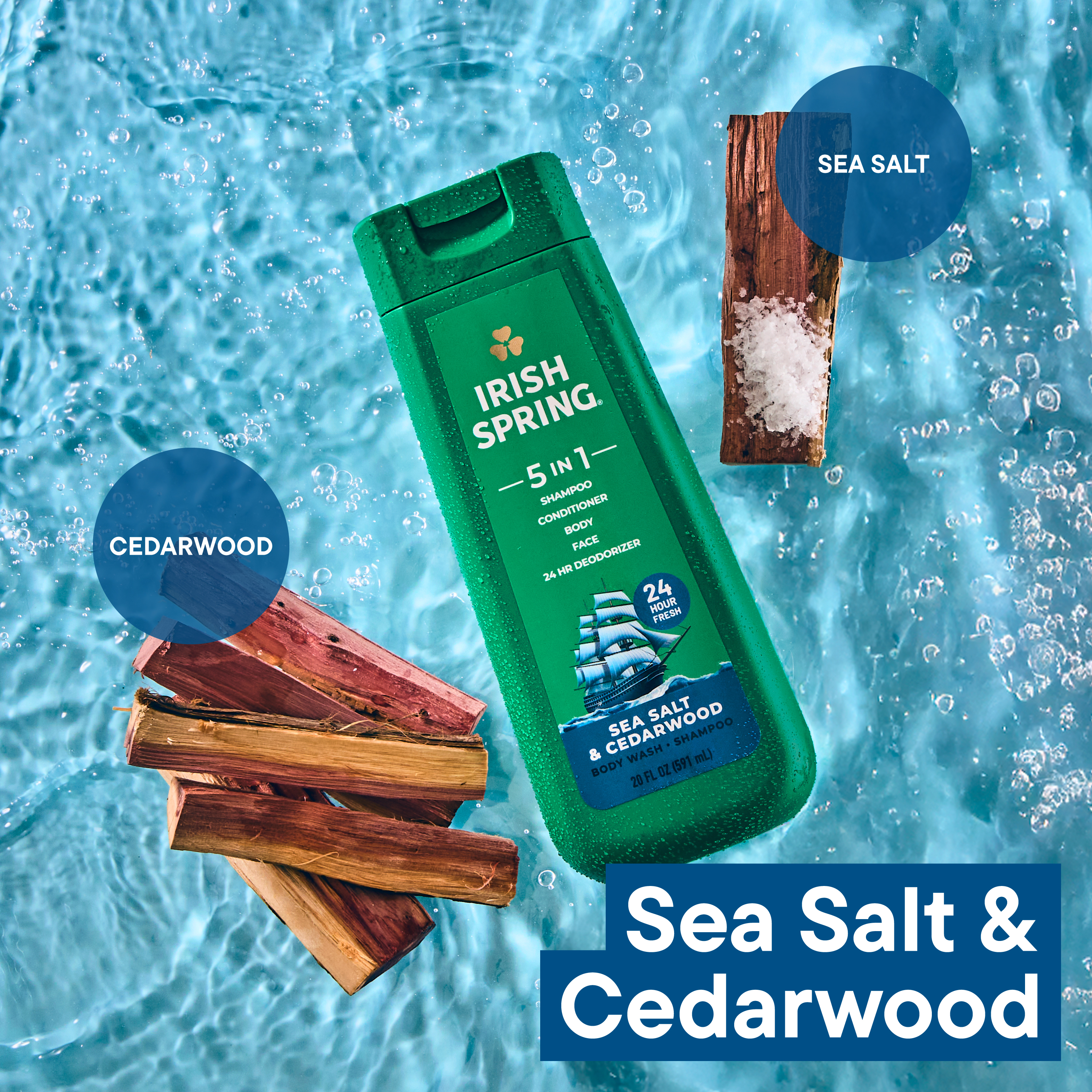 Irish Spring 5 in 1 Moisturizing Body Wash for Men, Shampoo, Conditioner, Body and Face Wash, and 24 Hour Deodorizer, Paraben-Free, Sea Salt & Cedarwood Scent, 20 fl oz