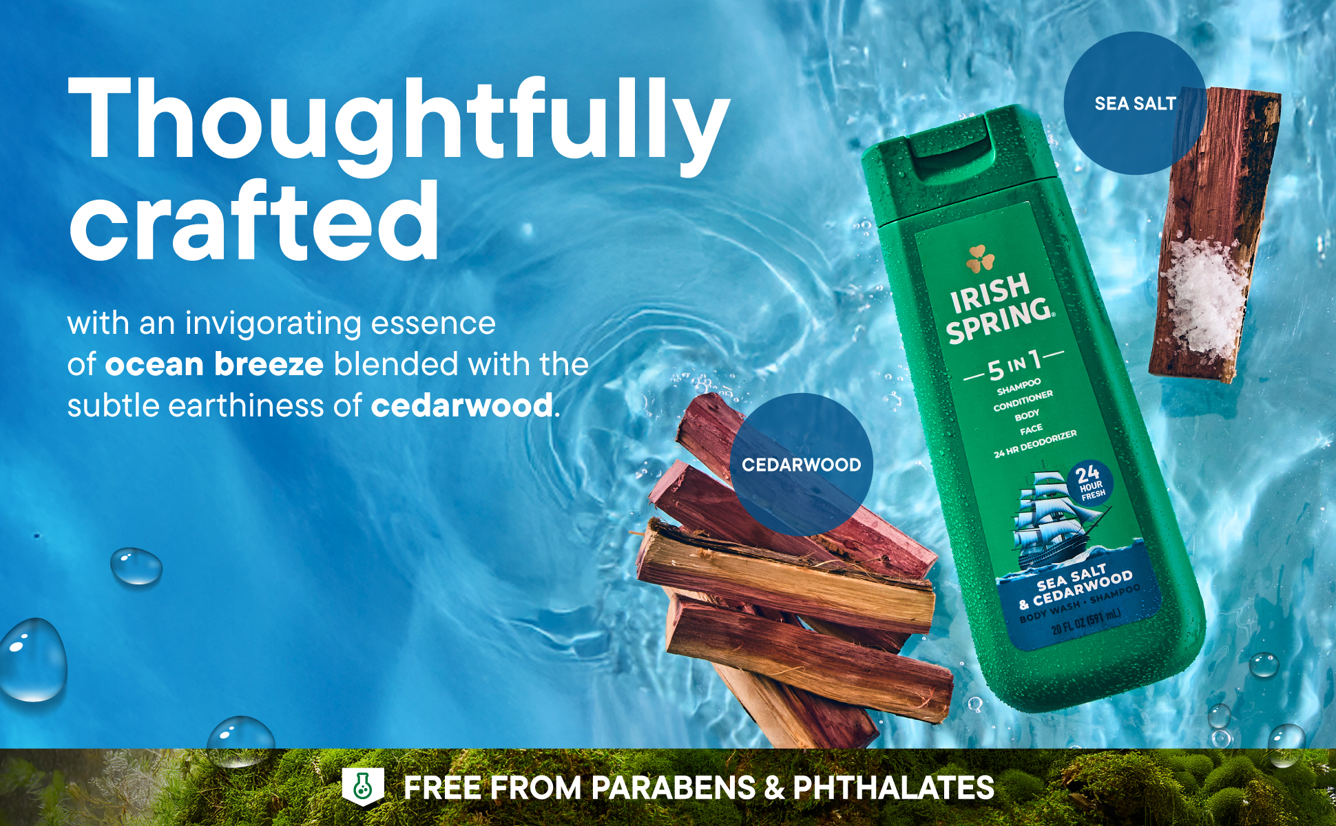 SKU 61054281 Consumer Unit - GTIN 00827854027607 Case - GTIN 10827854027604 Product Category Personal Care Product Sub Category Body Wash Product Equity (Brand) Irish Spring Product Sub Brand Irish Spring BW Product Title Irish Spring 5 in 1 Moisturizing Body Wash for Men, Shampoo, Conditioner, Body and Face Wash, and 24 Hour Deodorizer, Paraben-Free, Sea Salt & Cedarwood Scent, 20 fl oz Product Description Feel invigorated every day with Irish Spring 5 in 1 Moisturizing Body Wash for Men in Sea Salt & Cedarwood Scent. Simplify your grooming routine with this men’s body wash that works as your shampoo, conditioner, face wash, body wash, and 24 hour deodorizer. Experience a moisturizing body wash that creates a rich, deep cleansing lather and retains skin’s moisture, leaving you feeling clean all day. Enjoy invigorating, outdoor freshness in every wash with the crisp, revitalizing essence of sea salt. Subtle cedarwood brings added depth and character, making this the perfect men’s body soap and cedarwood body wash for men who love a long-lasting scent. This men's body soap is crafted for an active lifestyle and is suitable for sensitive skin. Each bottle has a leak proof cap making it perfect for bathroom, gym bag, or travel, and ideal for your daily shower routine. Formulated as a paraben free body wash and phthalate free body wash, it offers ingredient transparency for peace of mind. Make Irish Spring body wash part of your daily routine for all-day freshness. Bullet 1 One 20 fl oz bottle of Irish Spring 5 in 1 Moisturizing Body Wash for Men, Sea Salt & Cedarwood Scent Bullet 2 Simplify your grooming routine with this men’s body wash that works as your shampoo, conditioner, face wash, body wash, and 24 hour deodorizer Bullet 3 Moisturizing body wash that retains skin’s moisture, is gentle on skin, and forms a rich lather for a clean feel Bullet 4 Enjoy invigorating, outdoor freshness in every wash with the essence of sea salt and subtle earthiness of cedarwood Bullet 5 Formulated as a paraben free body wash and phthalate free body wash, it offers ingredient transparency for peace of mind Bullet 6 Each bottle has a leak proof cap making it perfect for bathroom, gym bag, or travel, and ideal for your daily shower routine Bullet 7 This men’s body soap is crafted for an active lifestyle and is suitable for sensitive skin Amazon RPC B0G44W2F87 AMZ URL https://www.amazon.com/dp/B0G44W2F87