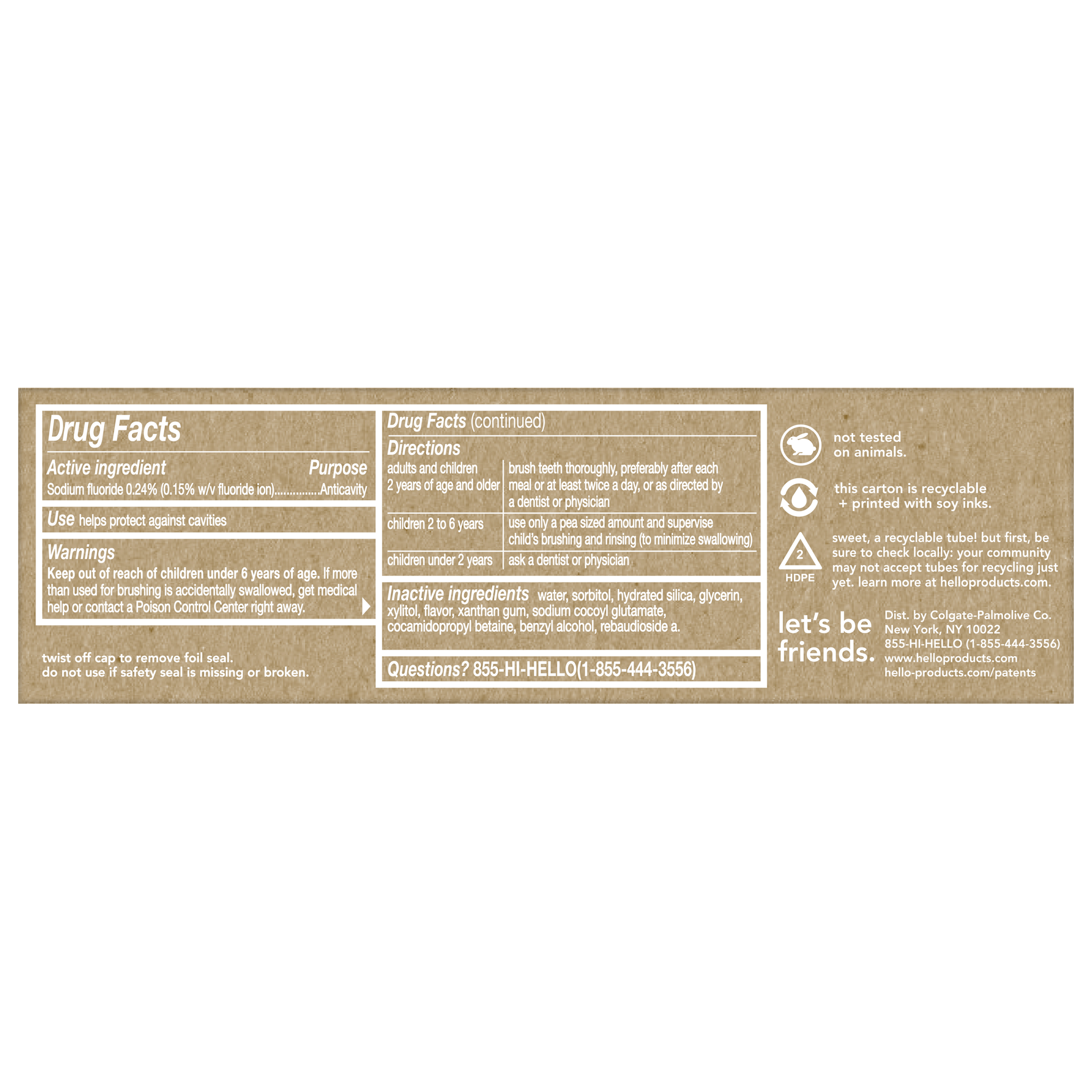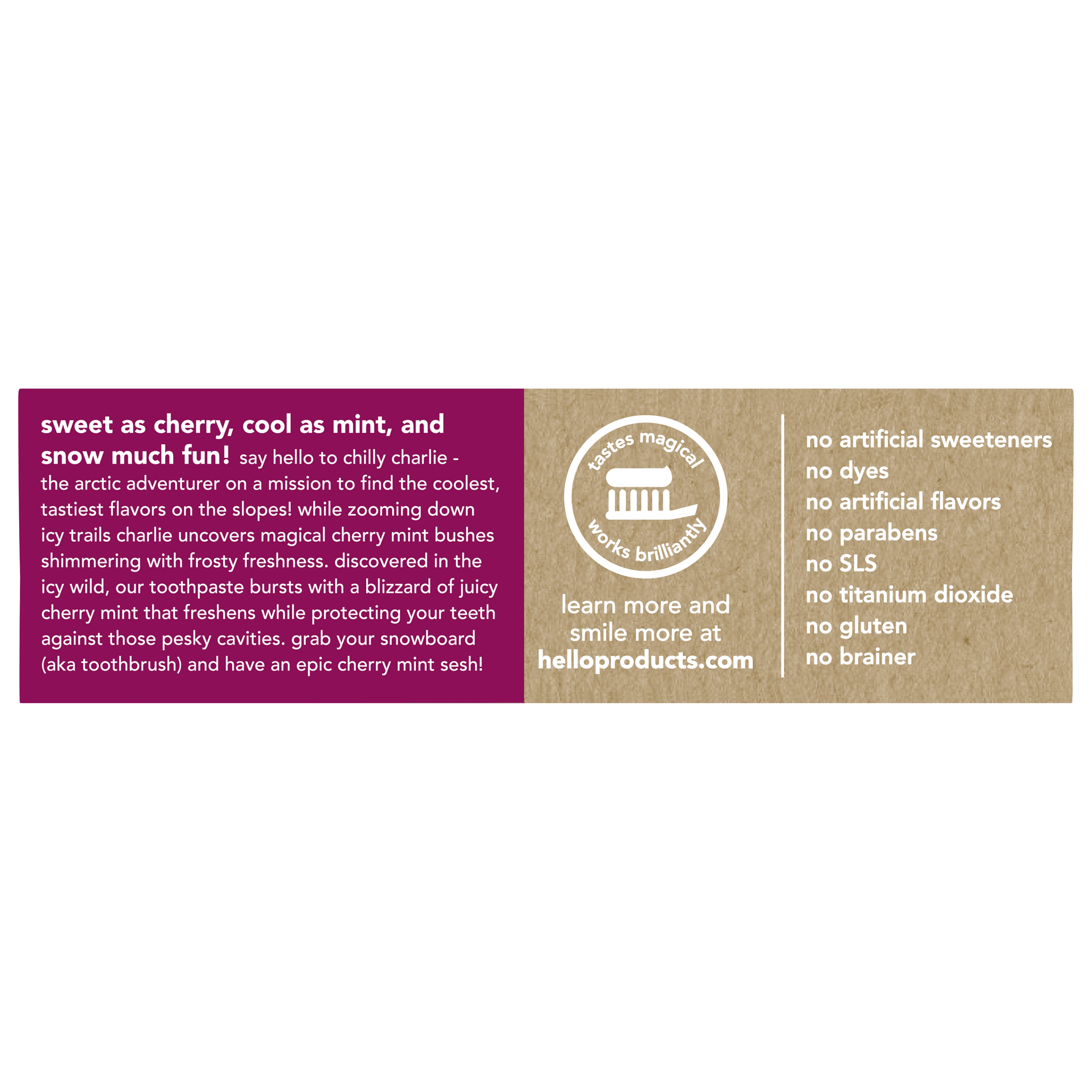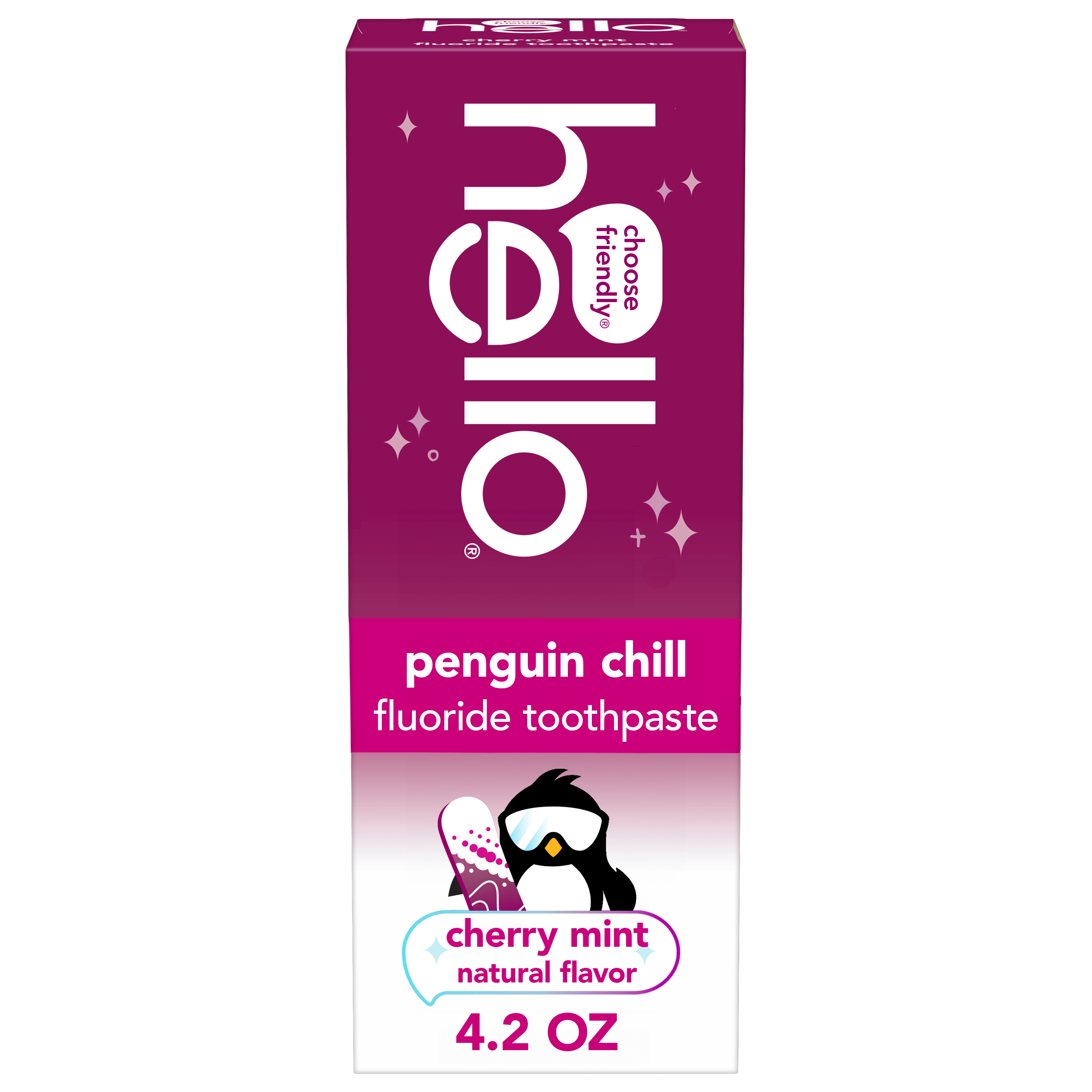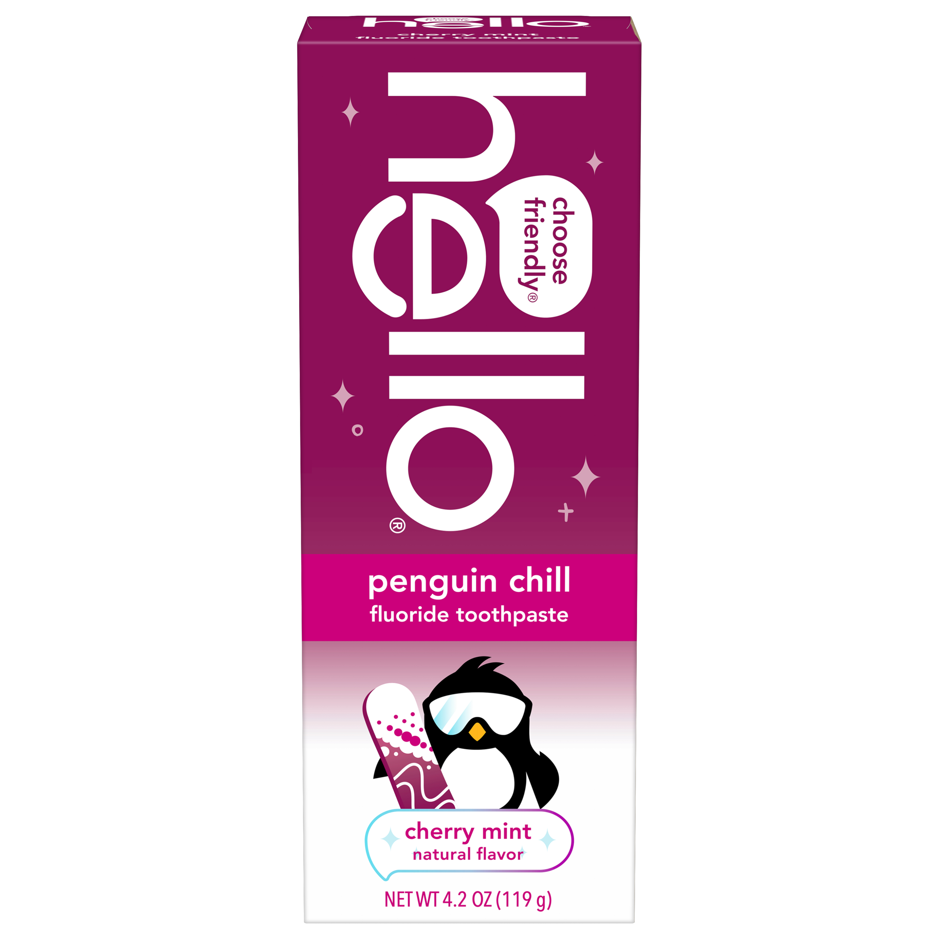 SKU 61054596 Consumer Unit - GTIN 00827854027928 Case - GTIN 10827854027925 Product Category Oral Care Product Sub Category Toothpaste Product Equity (Brand) hello Product Sub Brand Hello Kids TP Product Title hello Penguin Chill Kids Toothpaste with Fluoride, Cherry Mint, 4.2 oz Tube Product Description Say hello to one of the coolest kids toothpaste flavors around with hello Penguin Chill Cherry Mint Kids Toothpaste with Fluoride. This epic cherry and mint flavored hello kids toothpaste with fluoride is safe for children ages 2 and up and is sweet as cherry, cool as mint, and snow much fun for daily brushing. hello Penguin Chill Cherry Mint Toothpaste is a kids mint toothpaste with fluoride that helps prevent pesky cavities and strengthens teeth enamel using fluoride. It works brilliantly for kids with growing teeth and encourages regular brushing habits for kids thanks to its epic cherry and mint flavor that also helps freshen breath. Our kids toothpaste contains no artificial sweeteners, no artificial flavors, no SLS, no parabens, no dyes, and no titanium dioxide. No-brainer. Plus, this gluten free childrens toothpaste is vegan and not tested on animals. Have an epic cherry mint sesh with hello Penguin Chill Kids Toothpaste with Fluoride. Bullet 1 Includes one (1) 4.2 oz tube of hello Penguin Chill Kids Toothpaste with Fluoride, Cherry Mint Toothpaste Bullet 2 This epic cherry and mint flavored hello kids toothpaste with fluoride helps freshen breath Bullet 3 The kids fluoride toothpaste is safe for children ages 2 and up and helps prevent cavities and strengthens growing teeth using fluoride Bullet 4 This cherry and mint hello kids toothpaste works brilliantly as a childrens toothpaste to build good brushing habits Bullet 5 Using fluoride, this kids mint toothpaste helps strengthen enamel and helps prevent cavities Bullet 6 This hello kids toothpaste with fluoride is sweet as cherry, cool as mint, and snow much fun for daily brushing Bullet 7 This gluten free kids mint toothpaste is made with no SLS, parabens, dyes, titanium dioxide, artificial sweeteners or artificial flavors Active Ingredients Sodium Fluoride 0.24% (0.15% w/v fluoride ion)