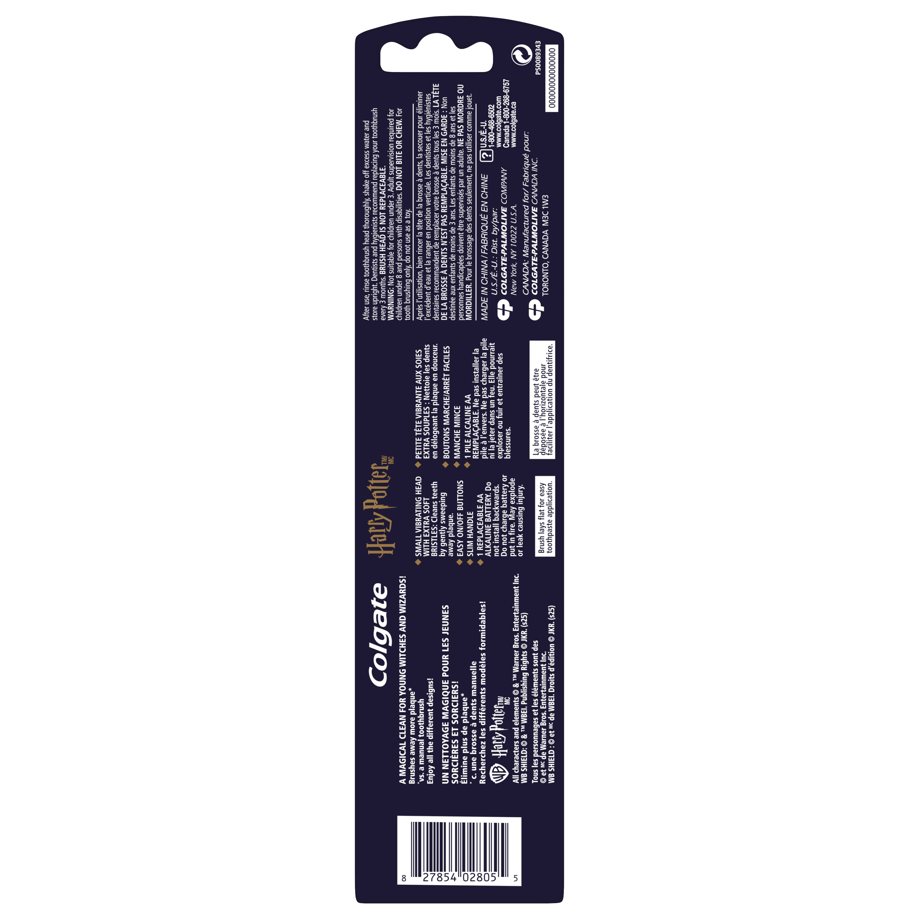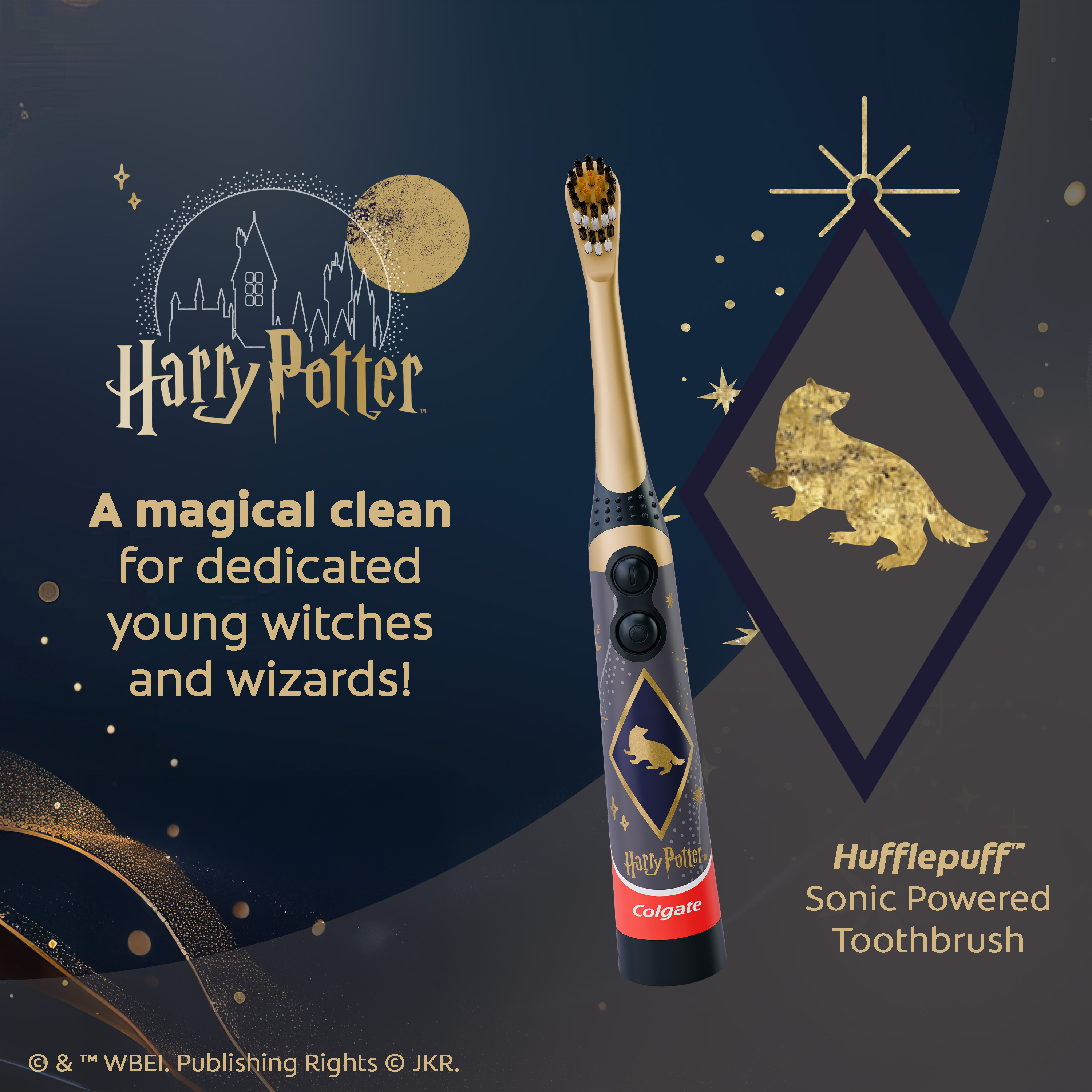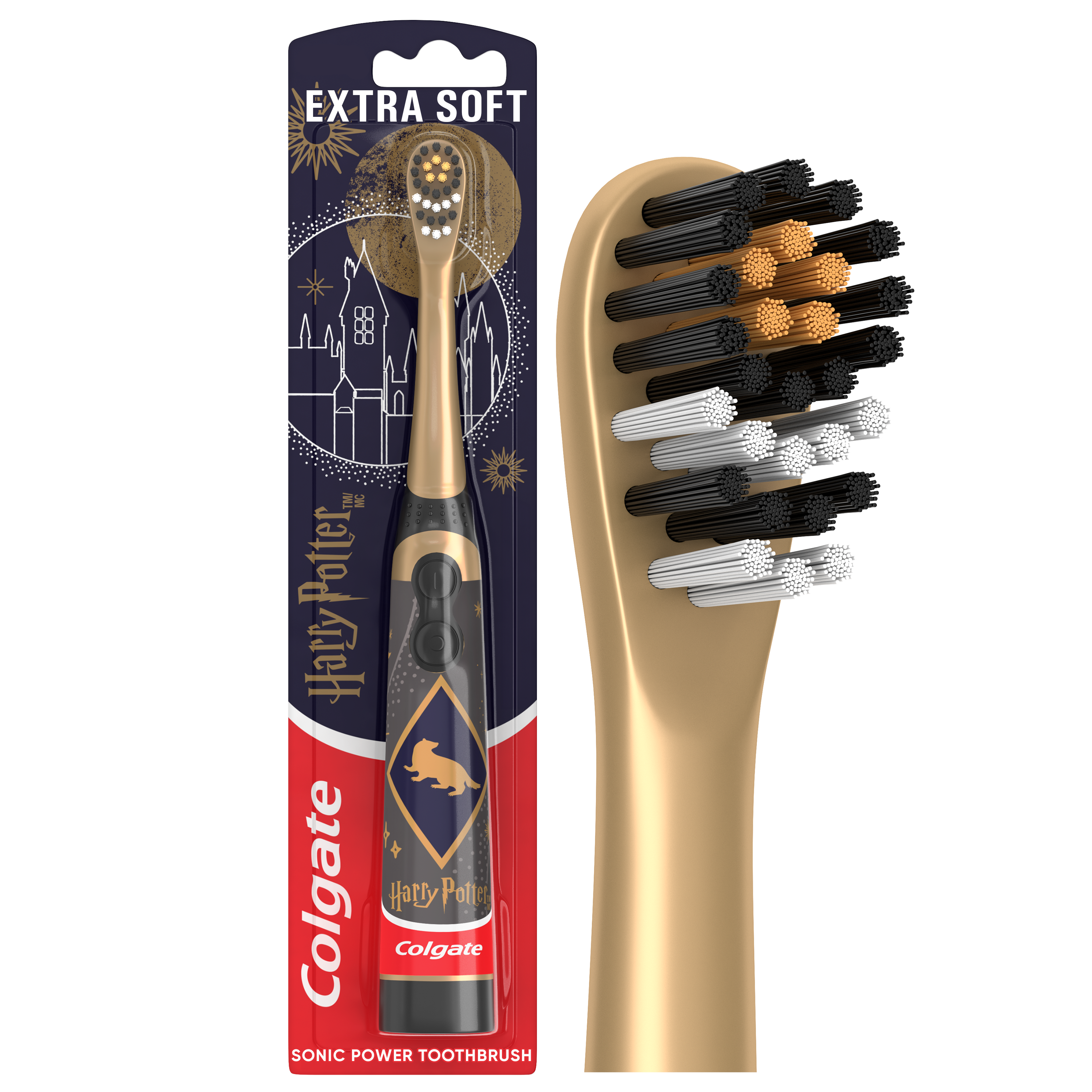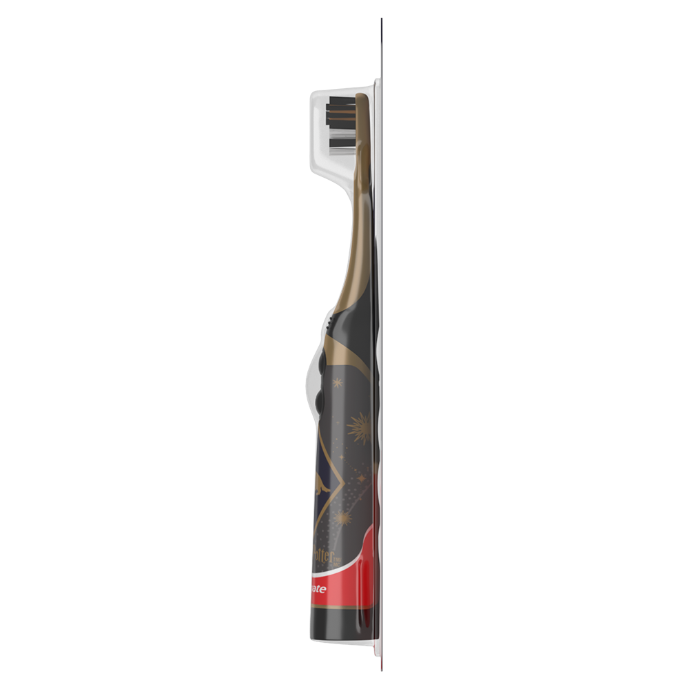 SKU 61054747 Consumer Unit - GTIN 00827854028055 Case - GTIN 10827854028052 Product Category Oral Care Product Sub Category Battery TB Product Equity (Brand) Colgate Product Sub Brand Colgate Kids BTB Product Title Colgate Harry Potter Hufflepuff Kids Battery Toothbrush, Extra Soft, 1 Pack Product Description Make daily brushing feel like an enchanting adventure for young children with the Colgate Harry Potter Hufflepuff Kids Battery Toothbrush. This kids Harry Potter toothbrush transforms brushing into a spellbinding routine for aspiring witches and wizards ages 3 and older, helping them sweep away pesky plaque and keeping their little teeth clean. The Harry Potter inspired kids battery powered toothbrush cleans better than a manual kids toothbrush and features a small, vibrating toothbrush head with extra soft bristles that are gentle on delicate gums. Made for young Harry Potter fans who are just starting to brush their teeth on their own, it’s a fun and enchanting battery toothbrush for teaching kids the importance of regularly brushing their teeth. The Colgate Harry Potter Hufflepuff Kids Battery Toothbrush uses extra soft toothbrush bristles. The slim, easy-to-hold handle gives everyone the confidence to brush on their own, while the lay flat design keeps the battery toothbrush from rolling away when set down and makes it easy to apply toothpaste. This battery powered Harry Potter toothbrush features an easy-to-press on and off button and comes with a single AA battery to power the kids travel toothbrush. Plus, the small, vibrating brush head is perfectly sized for little mouths, ensuring even the tiniest teeth get clean. The Colgate Harry Potter Hufflepuff Kids Battery Toothbrush is ready for whatever spellbinding adventures await them. Gift or collect all 5 childrens battery toothbrush designs including the Gryffindor, Hufflepuff, Ravenclaw, Slytherin, and Hogwarts Four Houses versions for the ultimate Harry Potter toothbrush collection. Add a touch of everyday magic to your kids daily brushing routine and encourage healthy habits with the Colgate Harry Potter Hufflepuff Kids Battery Toothbrush. Bullet 1 Includes one (1) Colgate Harry Potter Hufflepuff Kids Battery Toothbrush with Extra Soft Bristles, 1 AA Battery Included Bullet 2 This Harry Potter inspired Colgate Kids Battery Powered Toothbrush is made for children ages 3 and older Bullet 3 This Colgate battery powered toothbrush for kids has a small, vibrating brush head with extra soft bristles that gently clean teeth and gums Bullet 4 Features an easy-to-press on and off button and comes with a single AA battery to power the childrens toothbrush Bullet 5 A flat-laying handle makes it easy to apply toothpaste to this kids battery toothbrush without the brush rolling over or away Bullet 6 Collect all five Harry Potter toothbrush designs including Gryffindor, Hufflepuff, Ravenclaw, Slytherin, and the Hogwarts Four Houses Bullet 7 Encourage healthy habits and add a touch of everyday magic with the Colgate Harry Potter Hufflepuff Kids Battery Toothbrush Walmart RPC 17655300061 Walmart URL (Computed) https://www.walmart.com/ip/a/17655300061 Target RPC 94823747 Target URL https://www.target.com/p/a/-/A-94823747