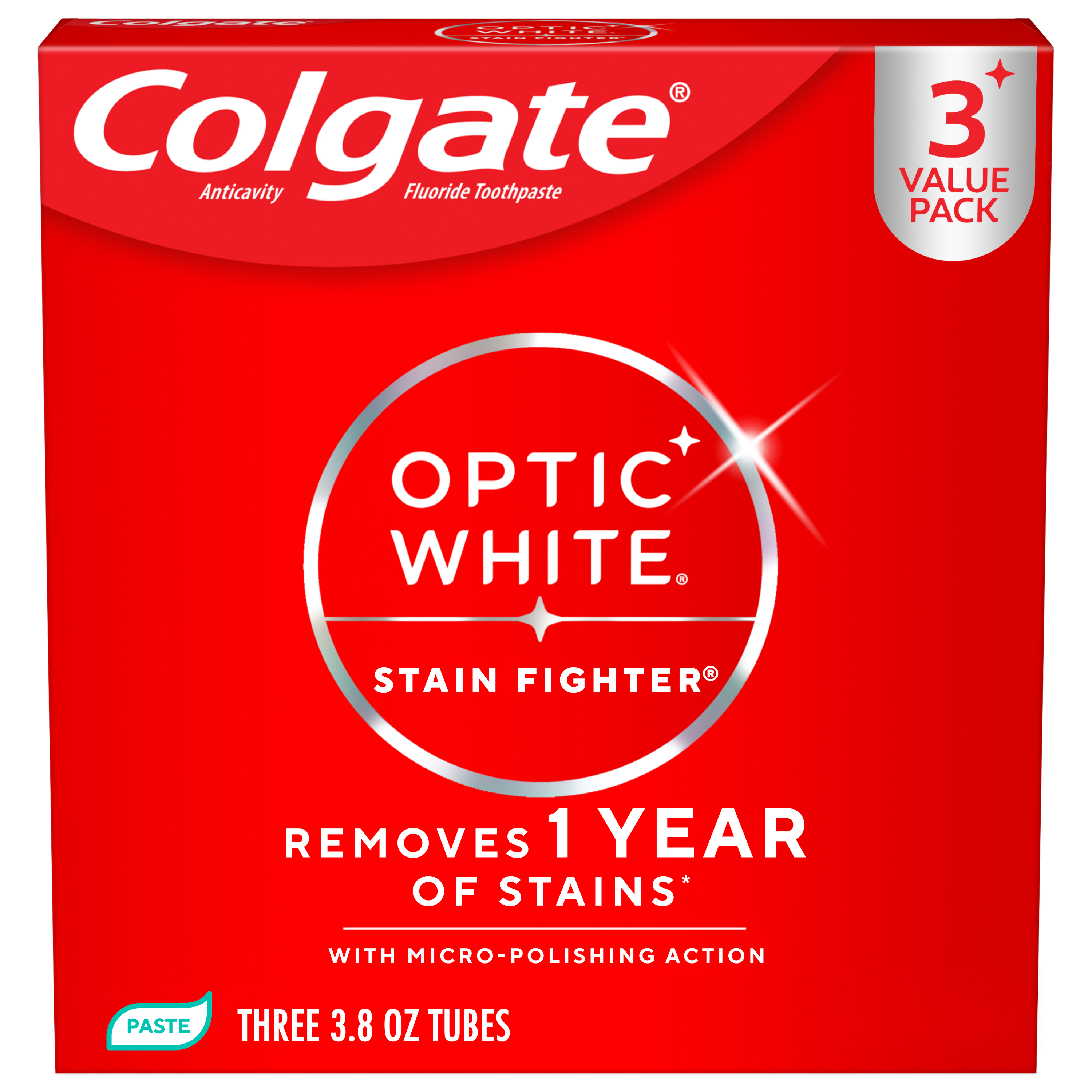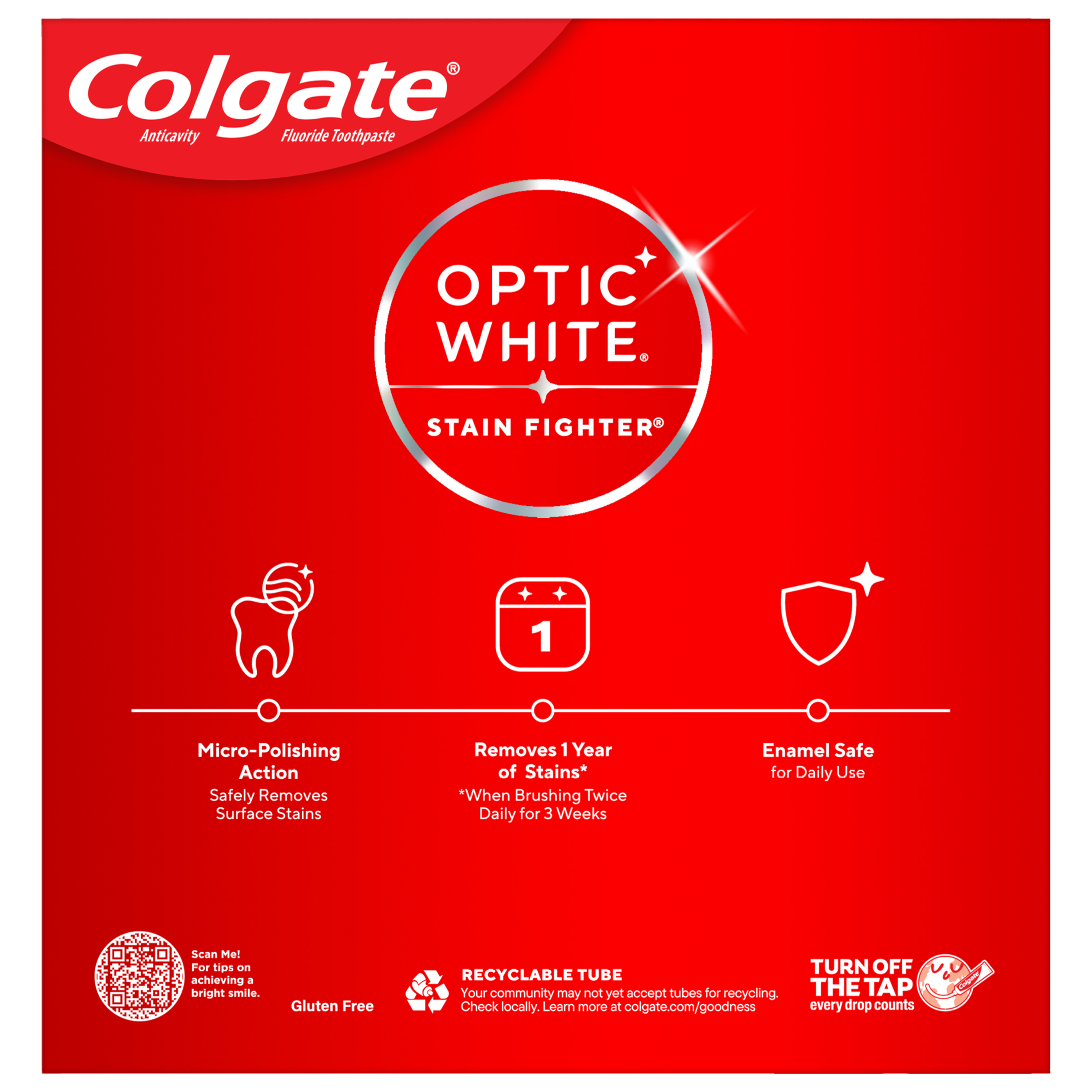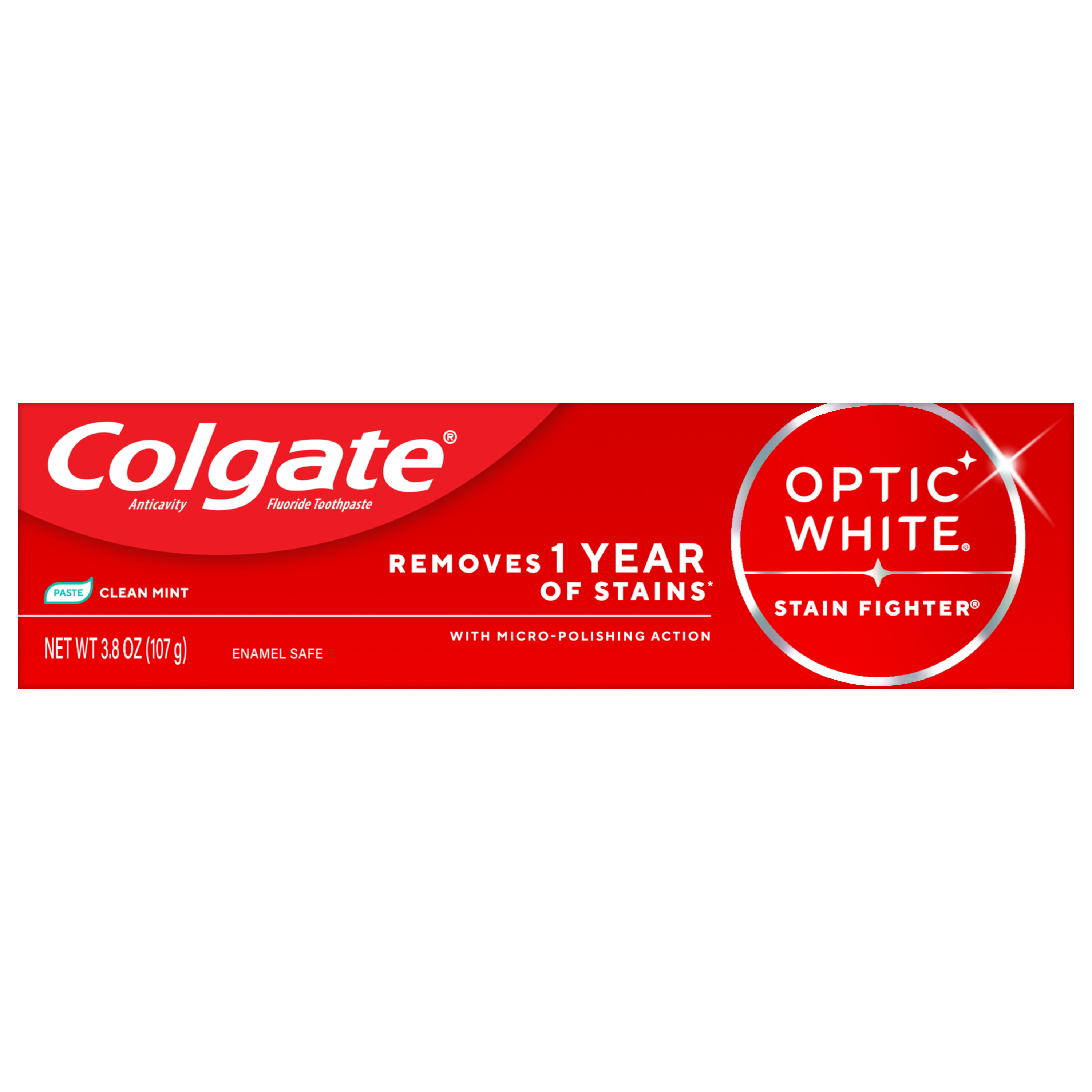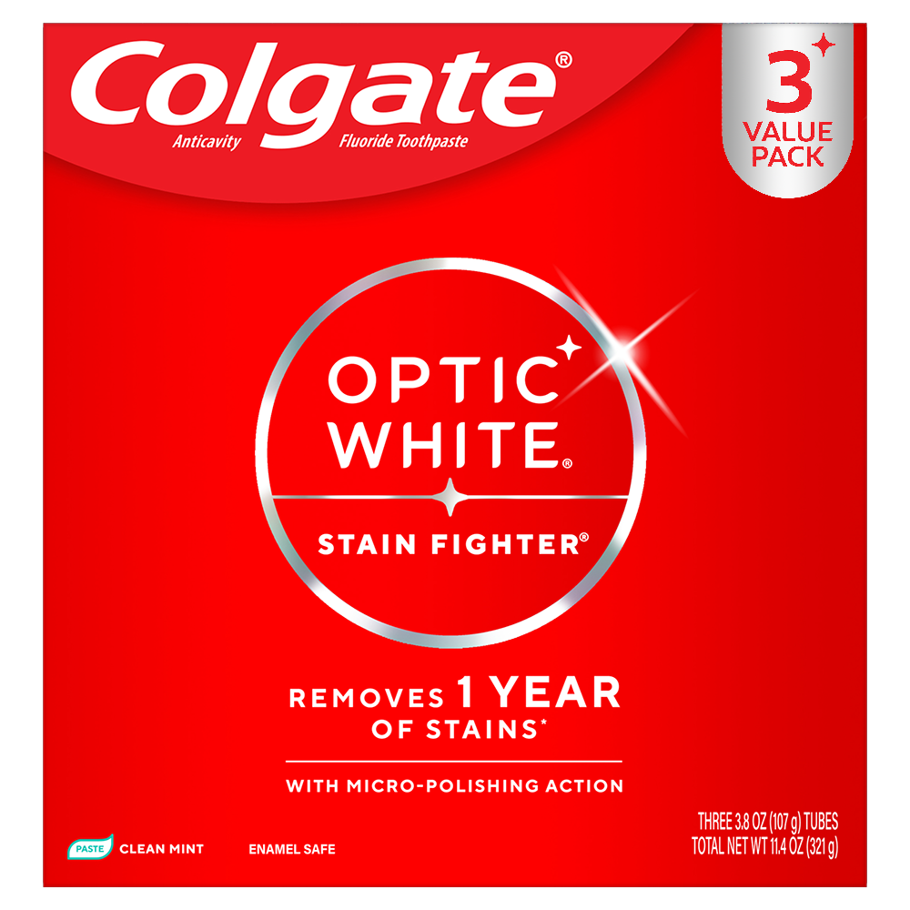 SKU 61055236 Consumer Unit - GTIN 00827854028963 Case - GTIN 10827854028960 Product Category Oral Care Product Sub Category Toothpaste Product Equity (Brand) Colgate Product Sub Brand Colgate Optic White TP Product Title Colgate Optic White Stain Fighter Clean Mint Paste Teeth Whitening Toothpaste, Anticavity Toothpaste with Fluoride, 3 Pack, 3.8 OZ Product Description Colgate Optic White Stain Fighter Clean Mint Paste Toothpaste removes 1 year of stains* while freshening breath with its mint flavor. Its micro-polishing action safely removes 5X more surface stains**. Plus, Optic White Stain Fighter contains fluoride to fight cavities and is an enamel safe stain remover toothpaste. Get an invigorating clean with this effective teeth stain remover. Colgate Optic White Stain Fighter uses a patented whitening formula for thorough, effective stain removal. The micropolishers in Stain Fighter don’t just brush away surface stains – they help prevent new ones from forming. Our peppermint toothpaste provides a clean, invigorating taste that lasts from the first taste to the finish. Stain Fighter is a fluoride toothpaste that fights cavities. This patented whitening formula removes 1 year of stains* and is enamel safe for daily use. *when brushing twice daily for 3 weeks **vs. ordinary, non-whitening toothpaste after 2 weeks of continued use Bullet 1 Three 3.8 OZ tubes of Colgate Optic White Stain Fighter Clean Mint Paste Teeth Whitening Toothpaste Bullet 2 Removes 1 year of stains* (*when brushing twice daily for 3 weeks) Bullet 3 Safely removes 5X more surface stains with micro-polishing action** (**vs. ordinary, non-whitening toothpaste after 2 weeks of continued use) Bullet 4 Clean Mint flavor provides a clean, invigorating taste that lasts from the first taste to the finish Bullet 5 This triple toothpaste pack is enamel safe for daily use Bullet 6 Optic White Stain Fighter is an anticavity toothpaste; it contains fluoride to fight cavities Bullet 7 Optic White Stain Fighter is a vegan toothpaste Active Ingredients Sodium Fluoride 0.24 % (0.15% w/v fluoride ion) Walmart RPC 18017019685 Walmart URL (Computed) https://www.walmart.com/ip/a/18017019685 Target RPC 94823719 Target URL https://www.target.com/p/a/-/A-94823719