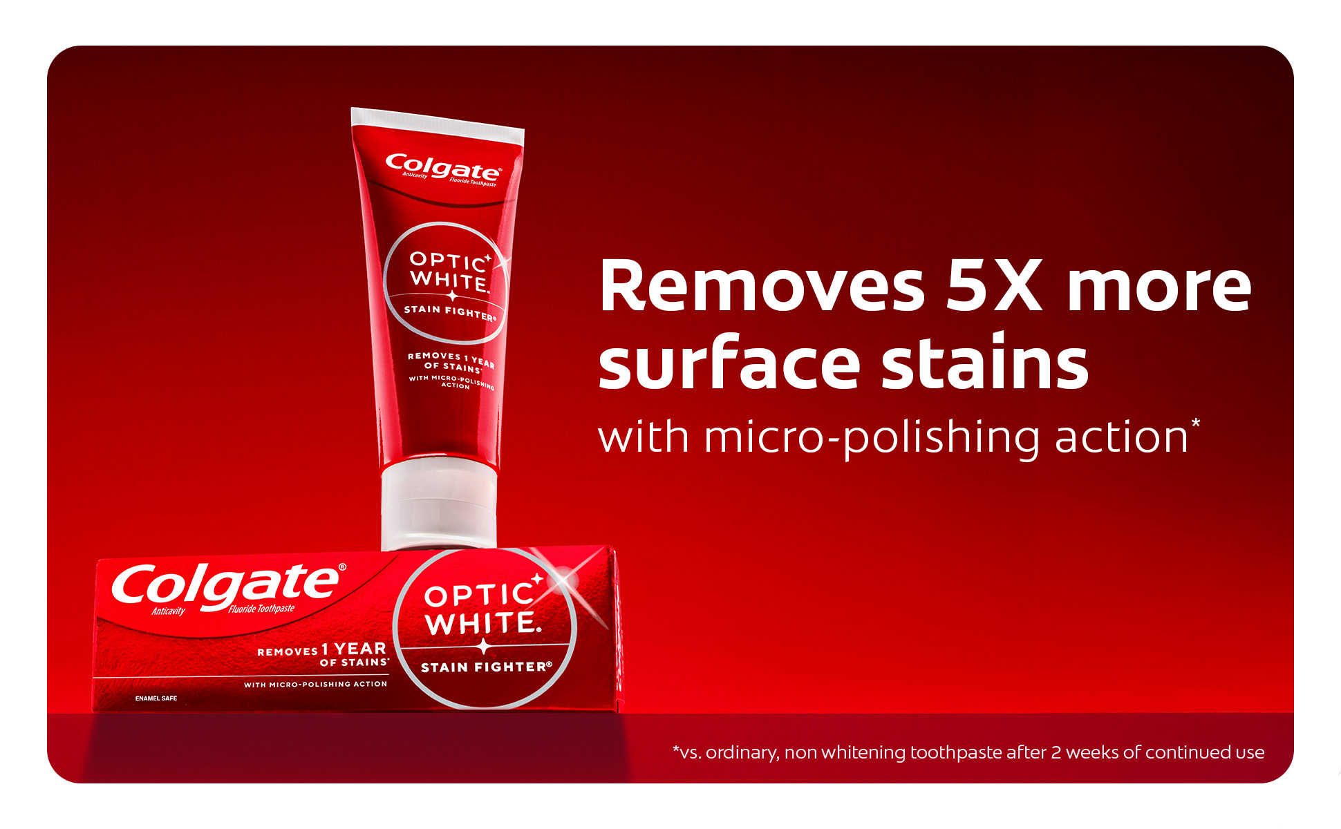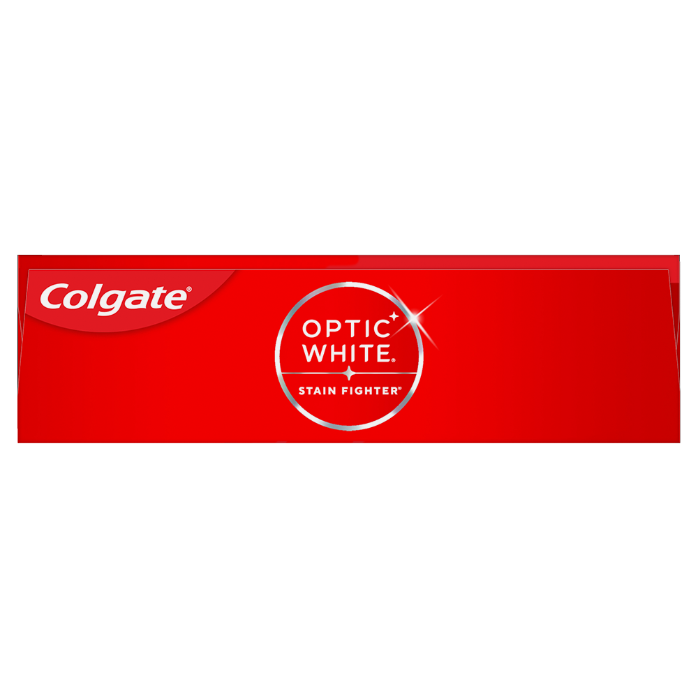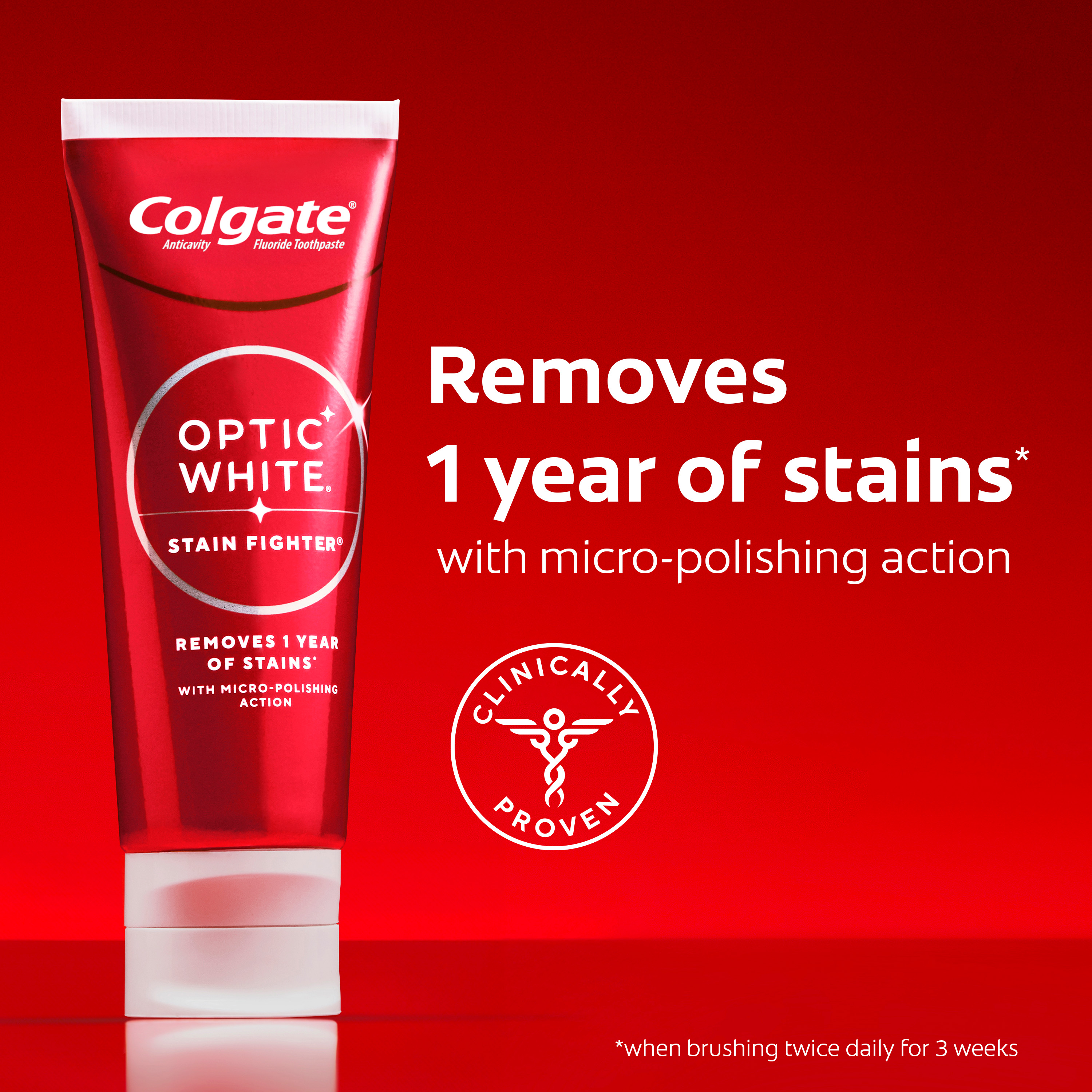 SKU 61055236 Consumer Unit - GTIN 00827854028963 Case - GTIN 10827854028960 Product Category Oral Care Product Sub Category Toothpaste Product Equity (Brand) Colgate Product Sub Brand Colgate Optic White TP Product Title Colgate Optic White Stain Fighter Clean Mint Paste Teeth Whitening Toothpaste, Anticavity Toothpaste with Fluoride, 3 Pack, 3.8 OZ Product Description Colgate Optic White Stain Fighter Clean Mint Paste Toothpaste removes 1 year of stains* while freshening breath with its mint flavor. Its micro-polishing action safely removes 5X more surface stains**. Plus, Optic White Stain Fighter contains fluoride to fight cavities and is an enamel safe stain remover toothpaste. Get an invigorating clean with this effective teeth stain remover. Colgate Optic White Stain Fighter uses a patented whitening formula for thorough, effective stain removal. The micropolishers in Stain Fighter don’t just brush away surface stains – they help prevent new ones from forming. Our peppermint toothpaste provides a clean, invigorating taste that lasts from the first taste to the finish. Stain Fighter is a fluoride toothpaste that fights cavities. This patented whitening formula removes 1 year of stains* and is enamel safe for daily use. *when brushing twice daily for 3 weeks **vs. ordinary, non-whitening toothpaste after 2 weeks of continued use Bullet 1 Three 3.8 OZ tubes of Colgate Optic White Stain Fighter Clean Mint Paste Teeth Whitening Toothpaste Bullet 2 Removes 1 year of stains* (*when brushing twice daily for 3 weeks) Bullet 3 Safely removes 5X more surface stains with micro-polishing action** (**vs. ordinary, non-whitening toothpaste after 2 weeks of continued use) Bullet 4 Clean Mint flavor provides a clean, invigorating taste that lasts from the first taste to the finish Bullet 5 This triple toothpaste pack is enamel safe for daily use Bullet 6 Optic White Stain Fighter is an anticavity toothpaste; it contains fluoride to fight cavities Bullet 7 Optic White Stain Fighter is a vegan toothpaste Active Ingredients Sodium Fluoride 0.24 % (0.15% w/v fluoride ion) Walmart RPC 18017019685 Walmart URL (Computed) https://www.walmart.com/ip/a/18017019685 Target RPC 94823719 Target URL https://www.target.com/p/a/-/A-94823719