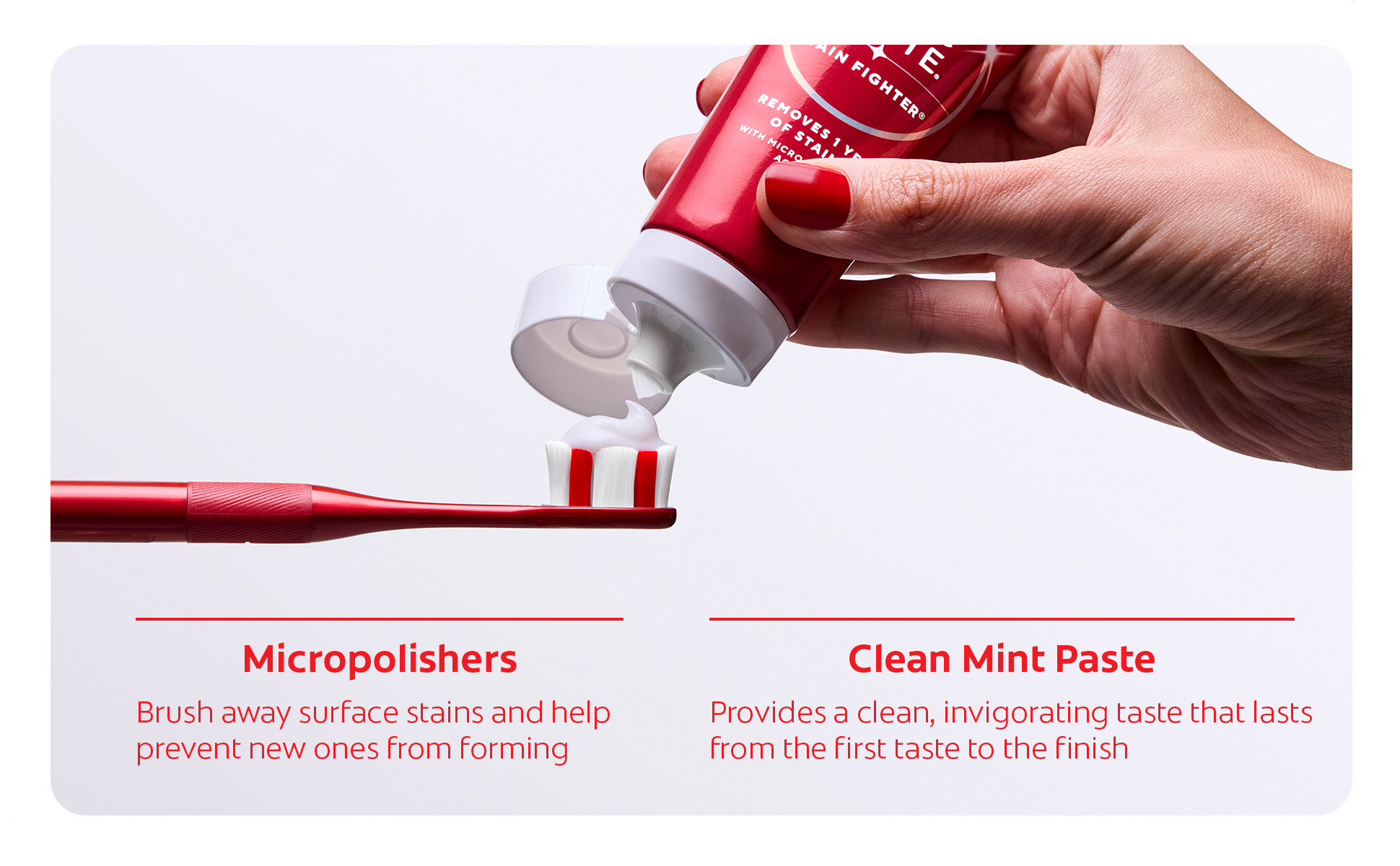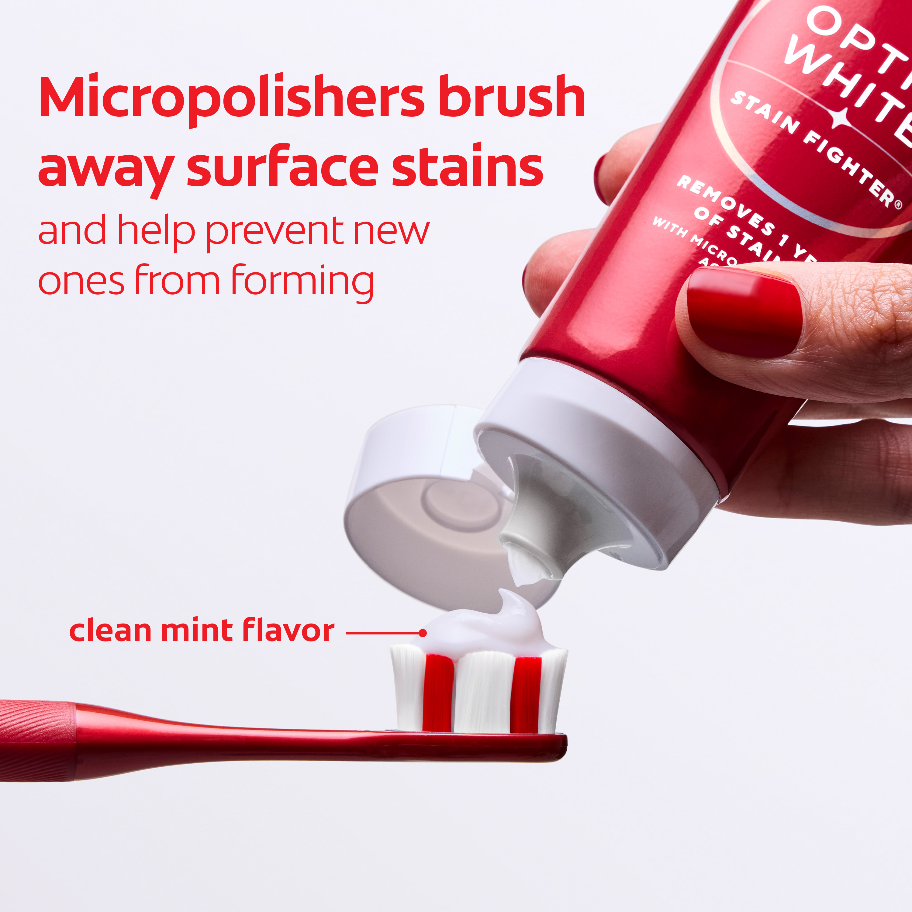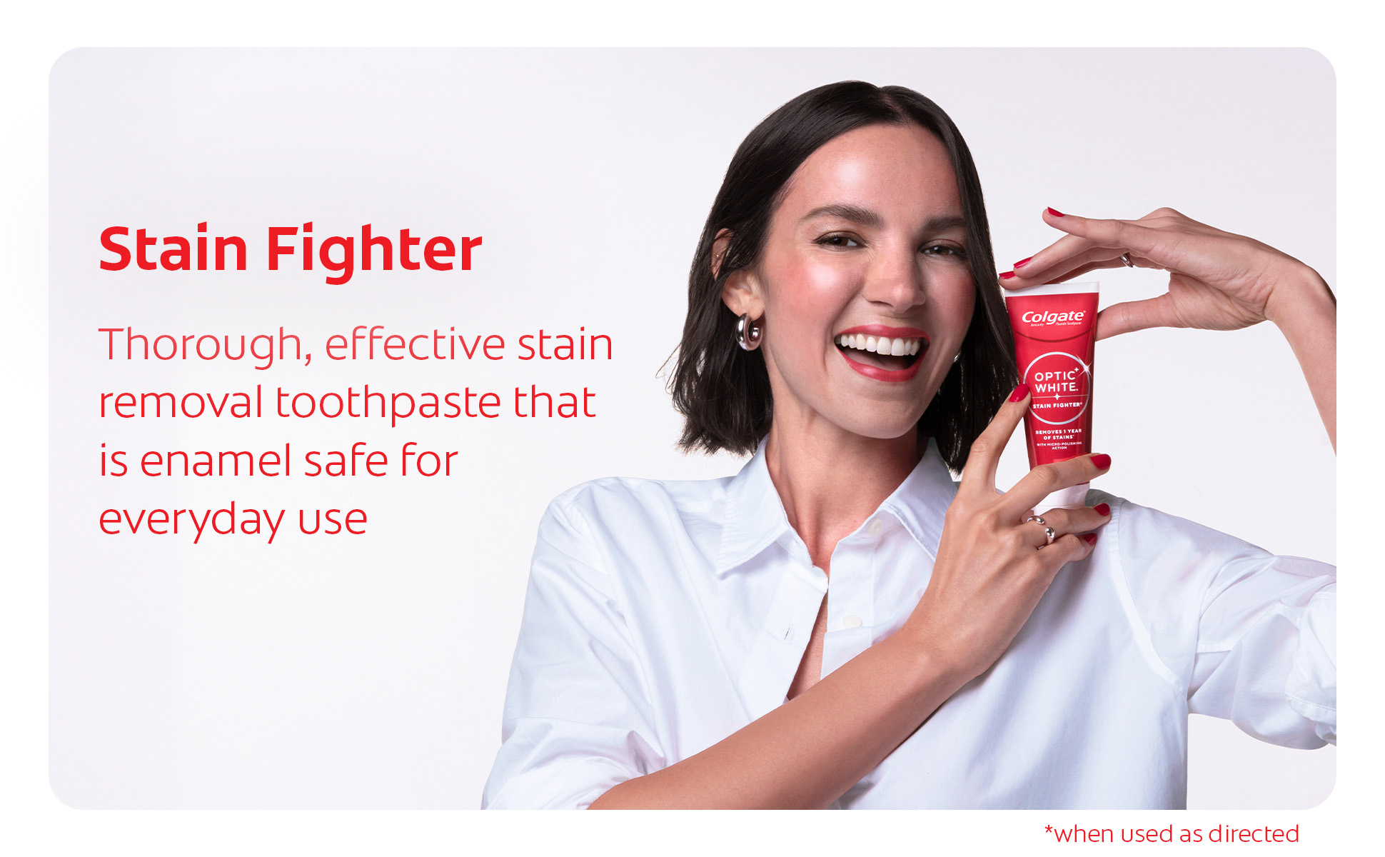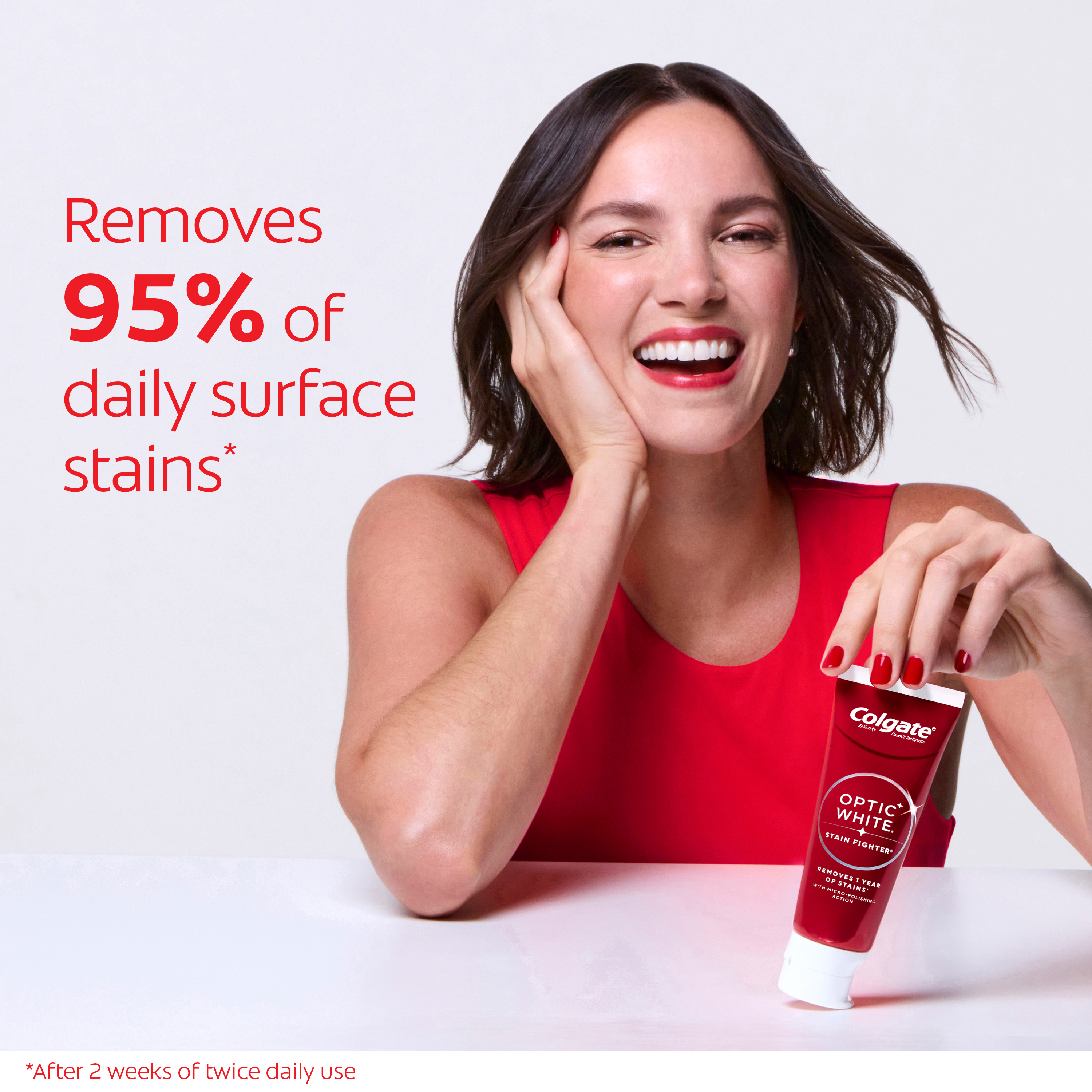SKU 61055236 Consumer Unit - GTIN 00827854028963 Case - GTIN 10827854028960 Product Category Oral Care Product Sub Category Toothpaste Product Equity (Brand) Colgate Product Sub Brand Colgate Optic White TP Product Title Colgate Optic White Stain Fighter Clean Mint Paste Teeth Whitening Toothpaste, Anticavity Toothpaste with Fluoride, 3 Pack, 3.8 OZ Product Description Colgate Optic White Stain Fighter Clean Mint Paste Toothpaste removes 1 year of stains* while freshening breath with its mint flavor. Its micro-polishing action safely removes 5X more surface stains**. Plus, Optic White Stain Fighter contains fluoride to fight cavities and is an enamel safe stain remover toothpaste. Get an invigorating clean with this effective teeth stain remover. Colgate Optic White Stain Fighter uses a patented whitening formula for thorough, effective stain removal. The micropolishers in Stain Fighter don’t just brush away surface stains – they help prevent new ones from forming. Our peppermint toothpaste provides a clean, invigorating taste that lasts from the first taste to the finish. Stain Fighter is a fluoride toothpaste that fights cavities. This patented whitening formula removes 1 year of stains* and is enamel safe for daily use. *when brushing twice daily for 3 weeks **vs. ordinary, non-whitening toothpaste after 2 weeks of continued use Bullet 1 Three 3.8 OZ tubes of Colgate Optic White Stain Fighter Clean Mint Paste Teeth Whitening Toothpaste Bullet 2 Removes 1 year of stains* (*when brushing twice daily for 3 weeks) Bullet 3 Safely removes 5X more surface stains with micro-polishing action** (**vs. ordinary, non-whitening toothpaste after 2 weeks of continued use) Bullet 4 Clean Mint flavor provides a clean, invigorating taste that lasts from the first taste to the finish Bullet 5 This triple toothpaste pack is enamel safe for daily use Bullet 6 Optic White Stain Fighter is an anticavity toothpaste; it contains fluoride to fight cavities Bullet 7 Optic White Stain Fighter is a vegan toothpaste Active Ingredients Sodium Fluoride 0.24 % (0.15% w/v fluoride ion) Walmart RPC 18017019685 Walmart URL (Computed) https://www.walmart.com/ip/a/18017019685 Target RPC 94823719 Target URL https://www.target.com/p/a/-/A-94823719