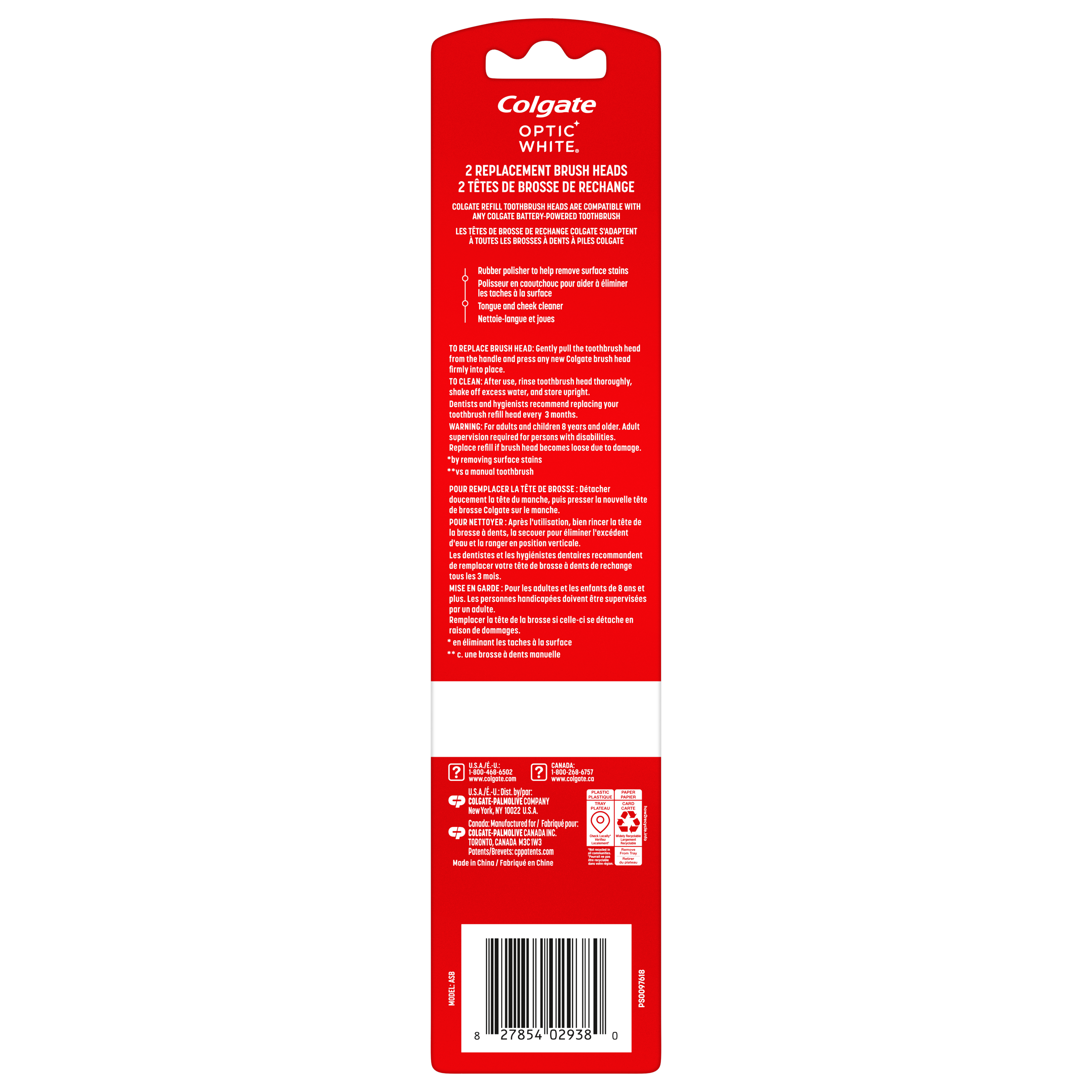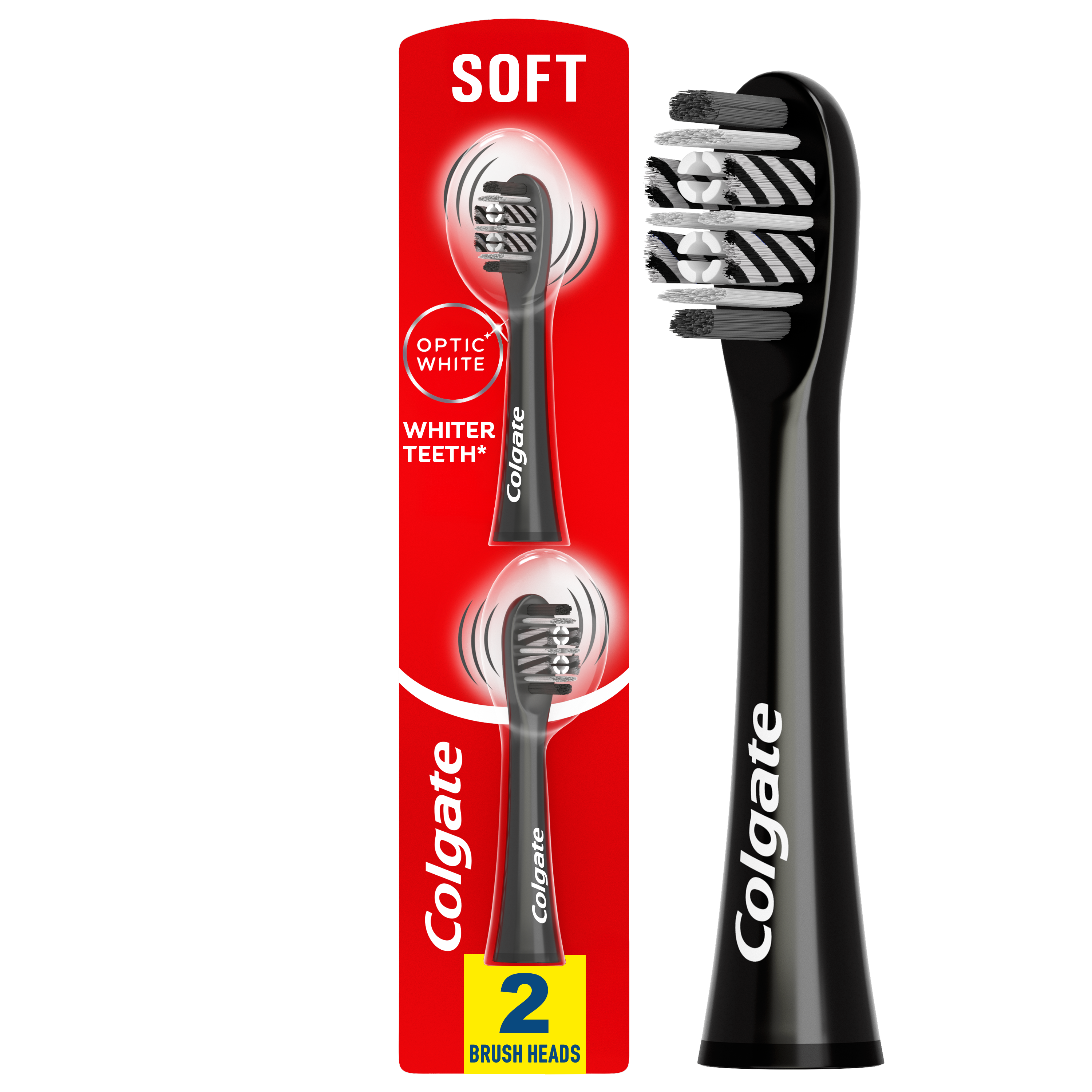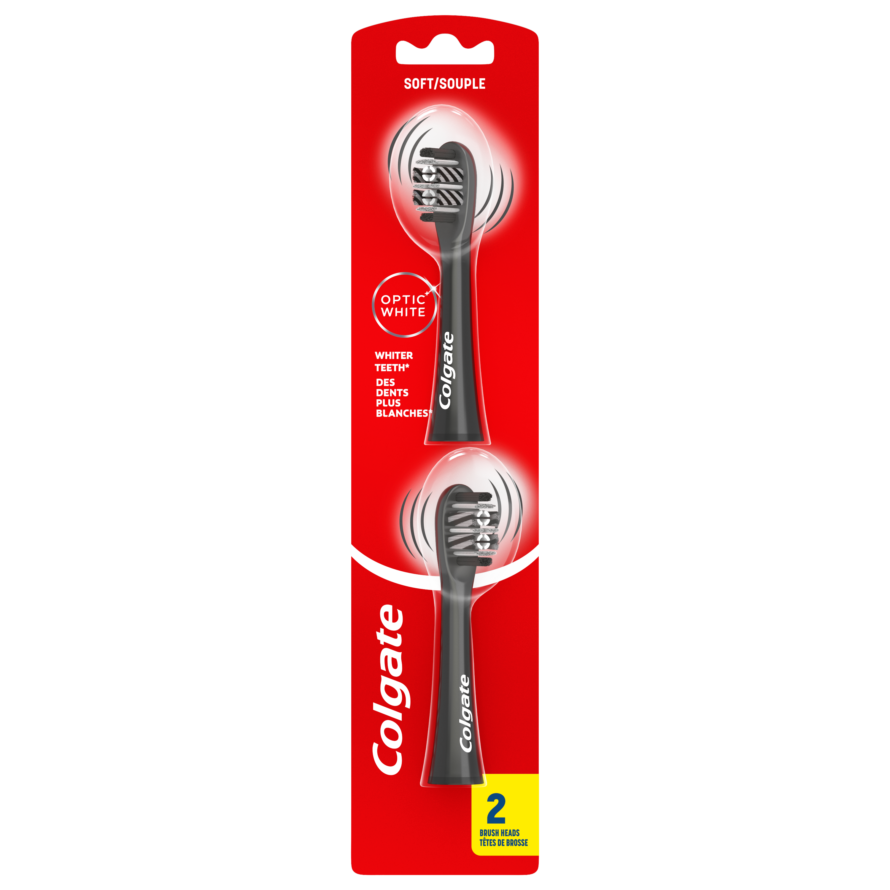 SKU 61056158 Consumer Unit - GTIN 00827854029380 Case - GTIN 10827854029387 Product Category Oral Care Product Sub Category Battery TB Product Equity (Brand) Colgate Product Sub Brand Colgate 360 ASB BTB Product Title Colgate Optic White Replacement Toothbrush Heads Pack, Black, 2 Count Product Description The Colgate Optic White Replacement Toothbrush Heads Pack includes two replacement brush heads so you always have extra power toothbrush replacement heads available for your Colgate Battery Powered Toothbrush. These Optic White replacement toothbrush heads are compatible with any type of adult Colgate battery toothbrush. These soft, battery toothbrush heads also feature a rubber polisher to help remove surface stains for whiter teeth. To replace the head of your Colgate battery-operated toothbrush, gently pull the old toothbrush head from the handle and press the replacement Optic White black toothbrush head into place. Experience the power of brightness at your fingertips* with Colgate Optic White Battery Replacement Toothbrush Heads. *by removing surface stains Bullet 1 Includes two (2) Colgate Optic White Replacement Toothbrush Heads with Soft Bristles, Black Bullet 2 Keep the brushing going and use these black toothbrush refill heads with any Colgate Optic White Battery Powered Toothbrush or Colgate hum toothbrush Bullet 3 This refill toothbrush pack includes two replacement brush heads that feature soft bristles Bullet 4 These Optic White soft toothbrush heads feature a rubber polisher on each head to help remove surface stains for whiter teeth Bullet 5 When it’s time to replace your battery operated toothbrush head, pull the old one from the handle and press the replacement toothbrush head in place Bullet 6 Always have extra toothbrush heads available with the Colgate Optic White Replacement Toothbrush Heads Pack Bullet 7 Dentists and hygienists recommend replacing your toothbrush head every 3 months