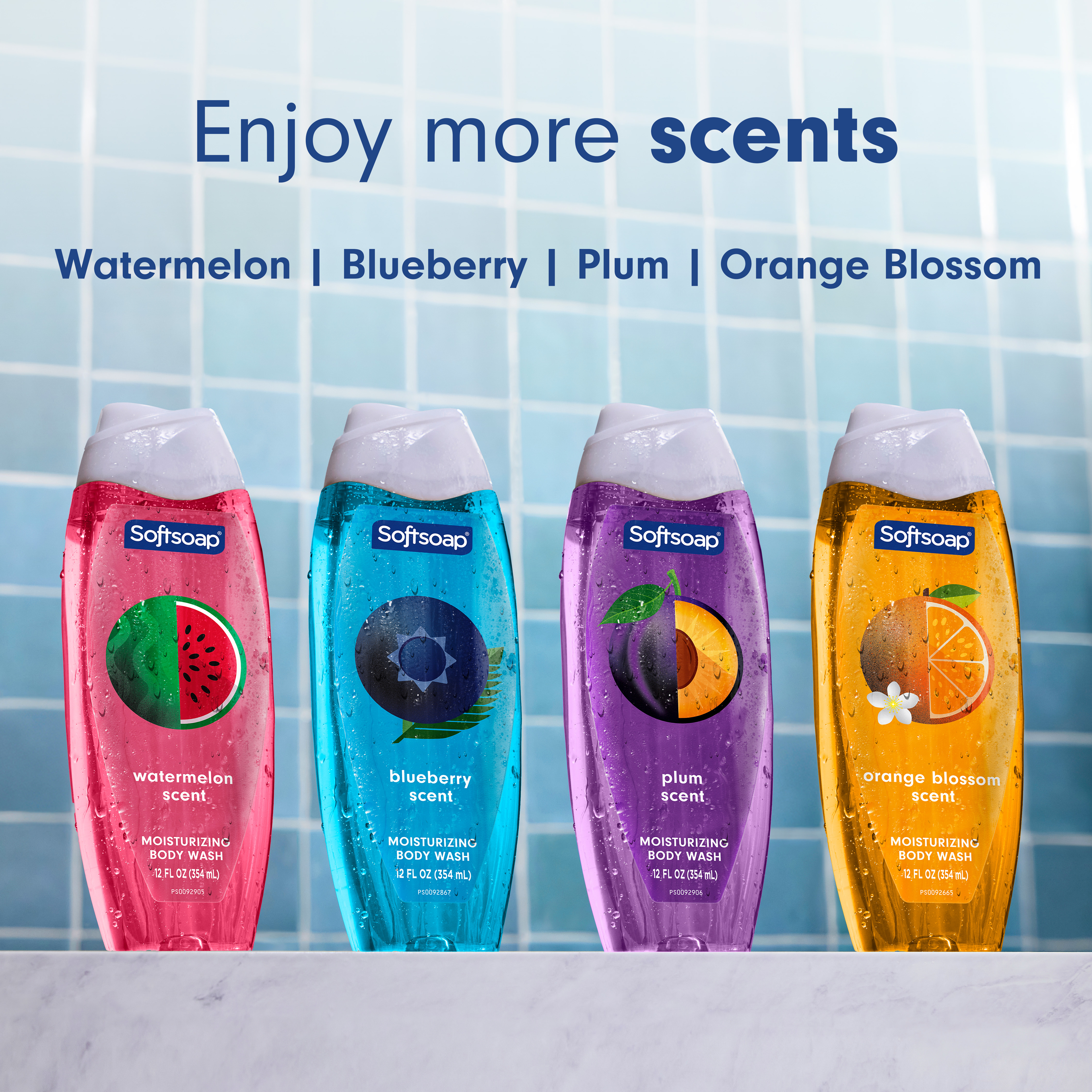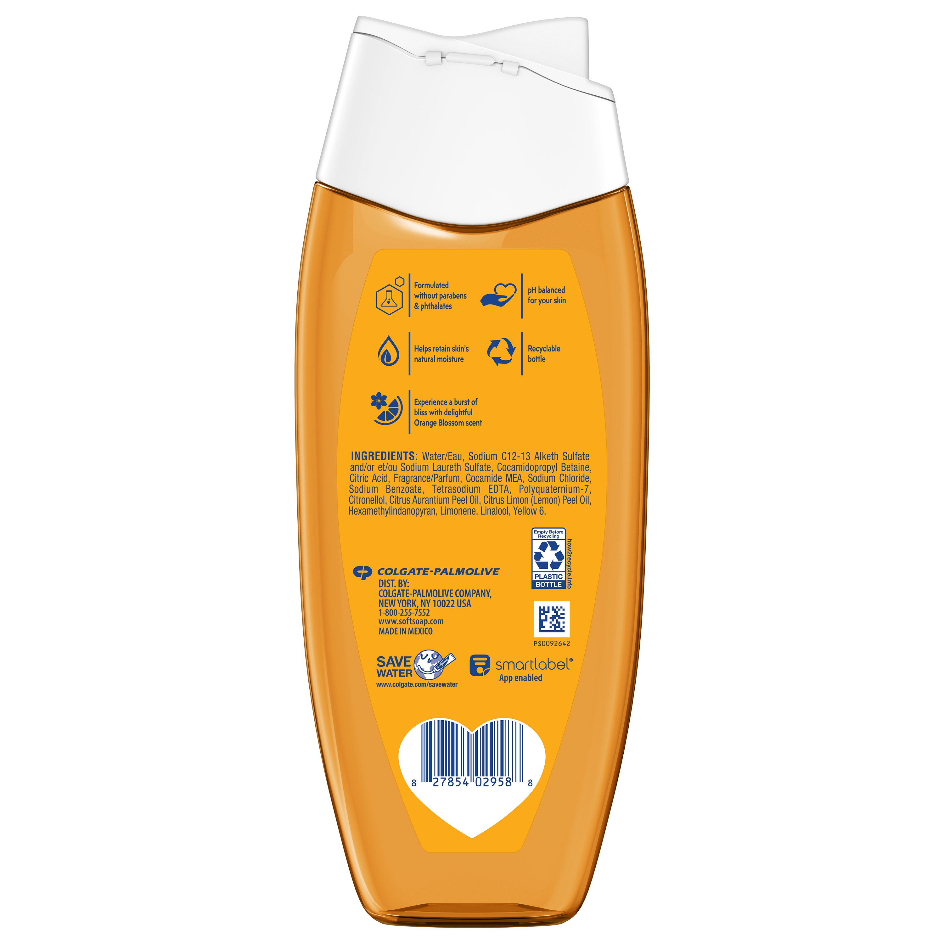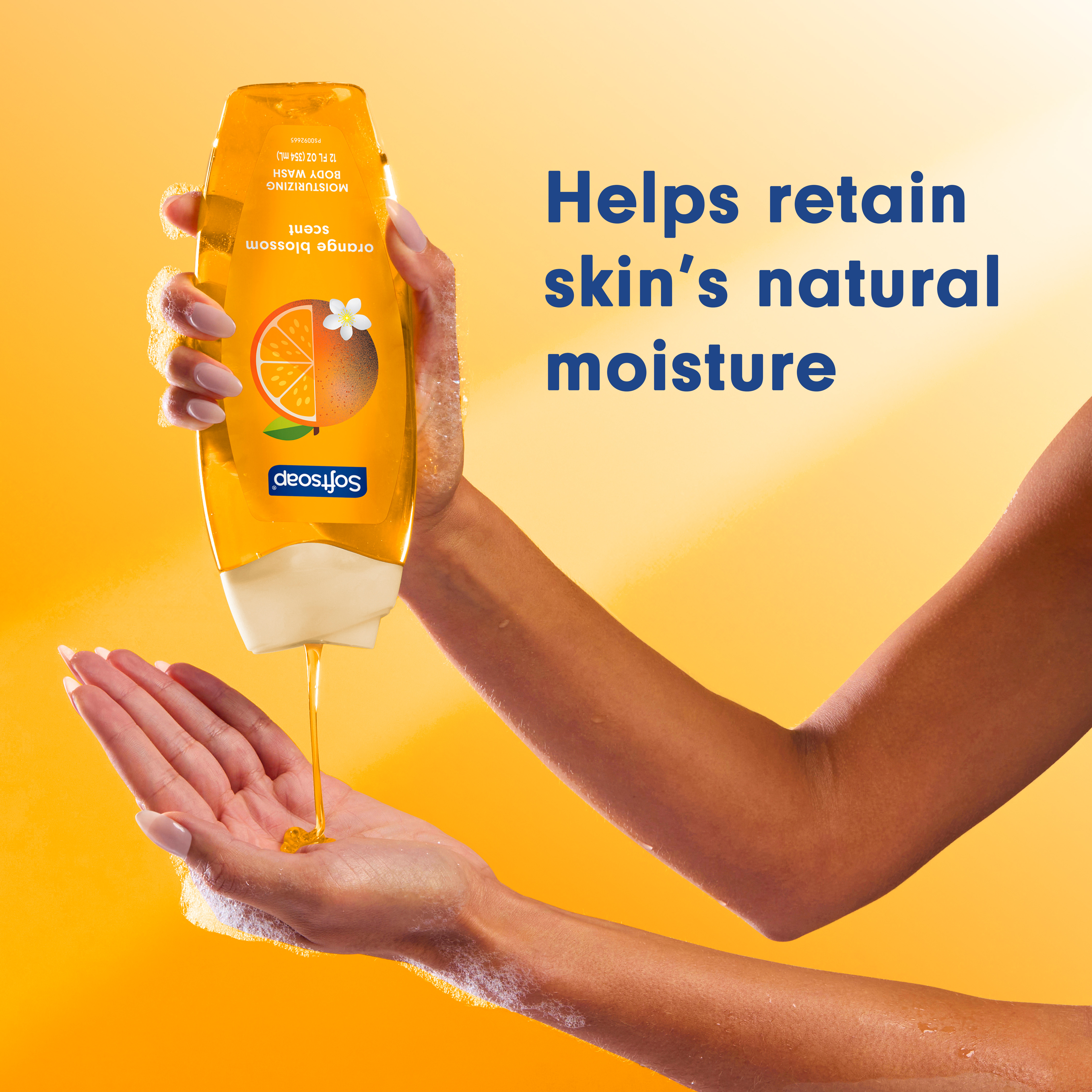 SKU 61056288 Consumer Unit - GTIN 00827854029588 Case - GTIN 10827854029585 Product Category Personal Care Product Sub Category Body Wash Product Equity (Brand) Softsoap Product Sub Brand Softsoap BW Product Title Softsoap Moisturizing Body Wash, pH Balanced, Orange Blossom Scent, 12 fl oz Product Description Experience a burst of bliss every day with Softsoap Orange Blossom Moisturizing Body Wash. Awaken your senses with uplifting floral and citrusy notes and feel the joy of clean. This body wash brings freshness to every shower, leaving your skin feeling revitalized. This moisturizing pH balanced body wash helps retain your skin’s natural moisture, making it perfect for daily use. Make bath time fun for the whole family! Softsoap body wash is moisturizing, making it a great choice for kids and adults alike. Formulated without parabens and phthalates. Whether you’re searching for an orange body wash, a shower gel, or simply want a refreshing personal care product, Softsoap’s got you covered! Bullet 1 Includes one 12 fl oz bottle of Softsoap Moisturizing pH balanced Body Wash, Orange Blossom Scent Bullet 2 This body wash helps retain your skin’s natural moisture, making it perfect for daily use Bullet 3 Awaken your senses with uplifting floral and citrusy notes, delivering a refreshing start to your day Bullet 4 This body wash for women provides cleansing, leaving your skin feeling fresh, smooth, and beautifully scented Bullet 5 Formulated without parabens and phthalates Bullet 6 Whether you’re searching for an orange body wash, a shower gel, or simply want a refreshing personal care product, Softsoap’s got you covered Bullet 7 Softsoap brings joy to everyday moments through body wash solutions that provide a burst of sensorial bliss Walmart RPC 18141966809 Walmart URL (Computed) https://www.walmart.com/ip/a/18141966809