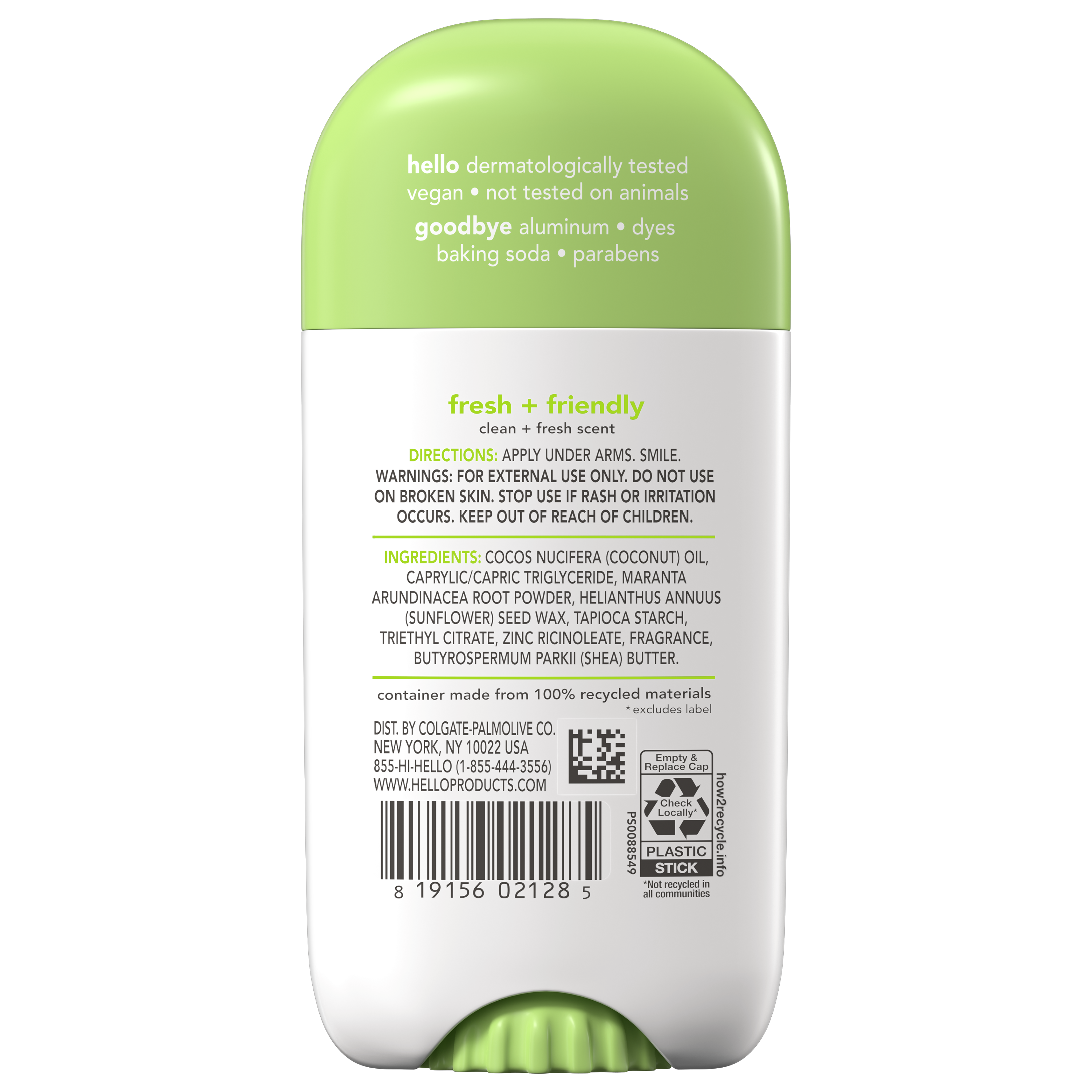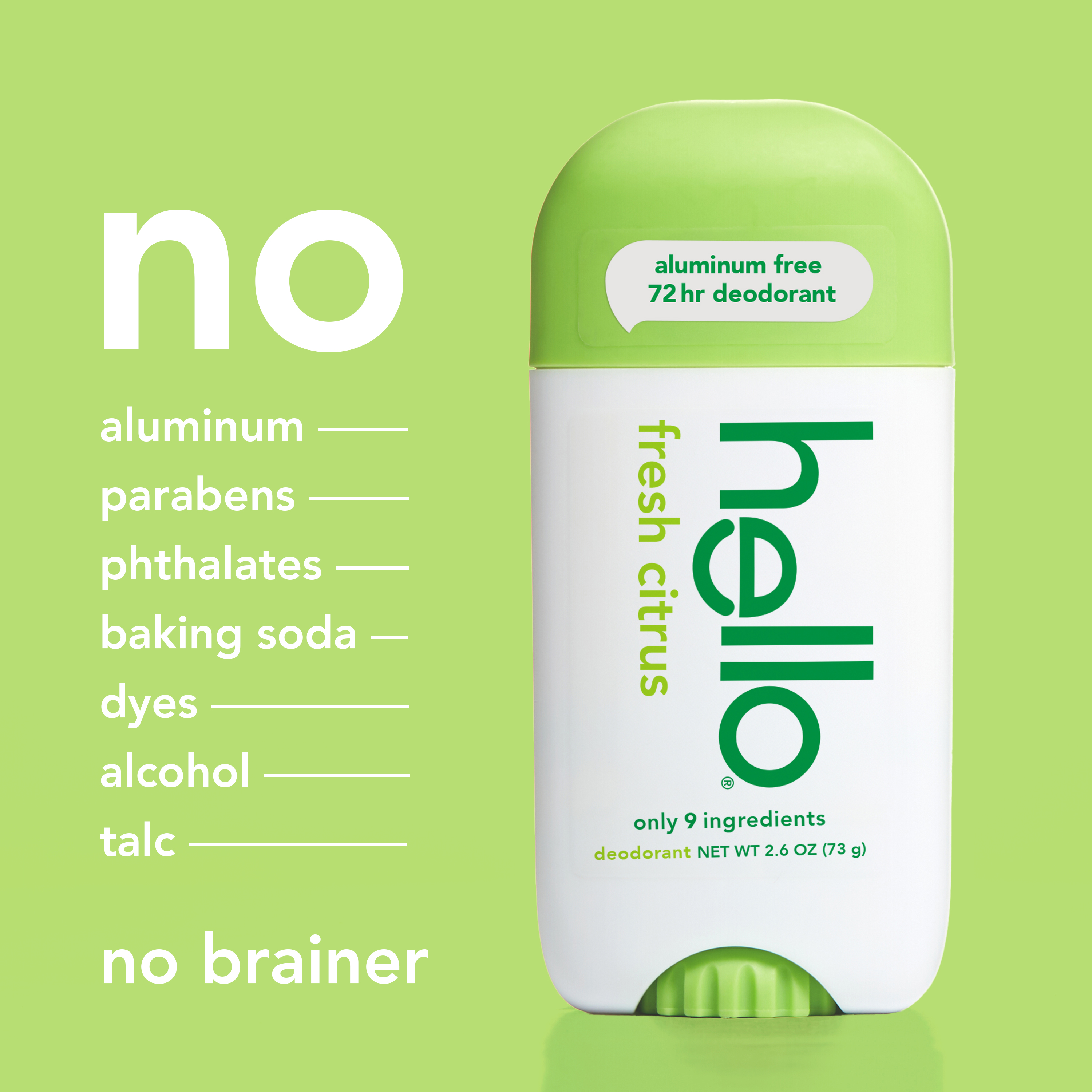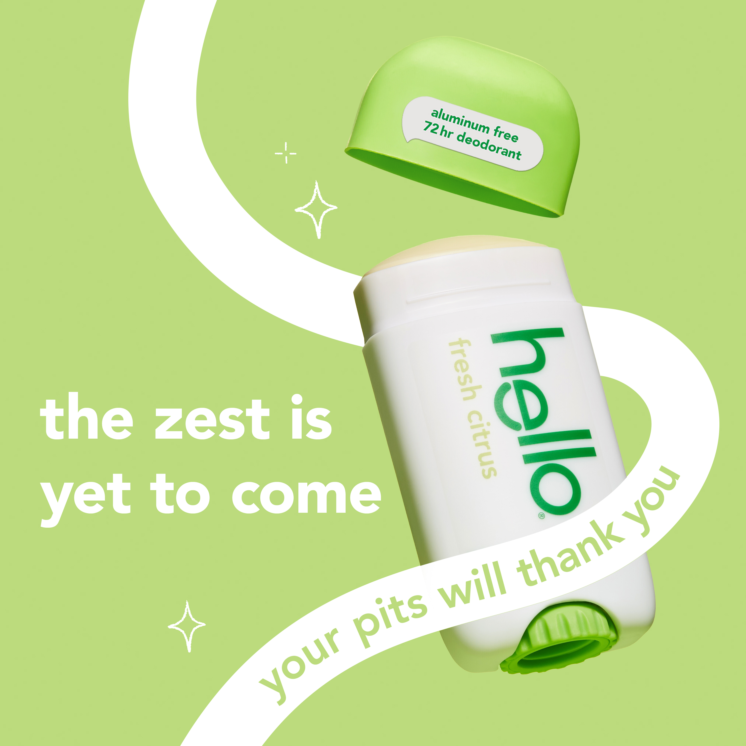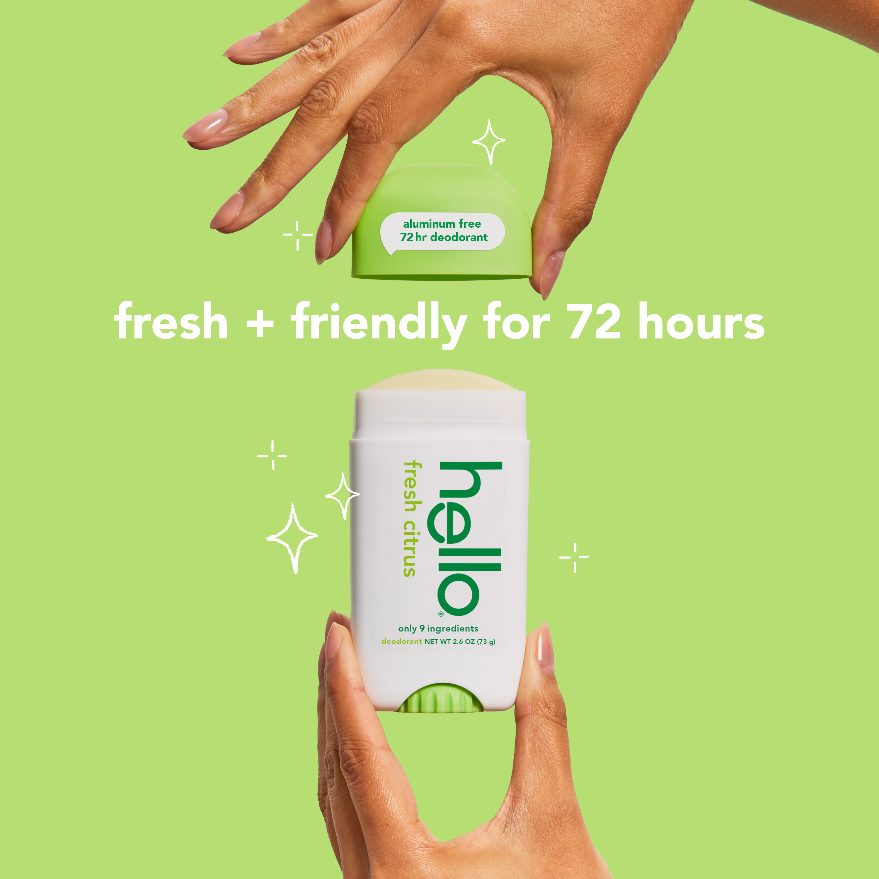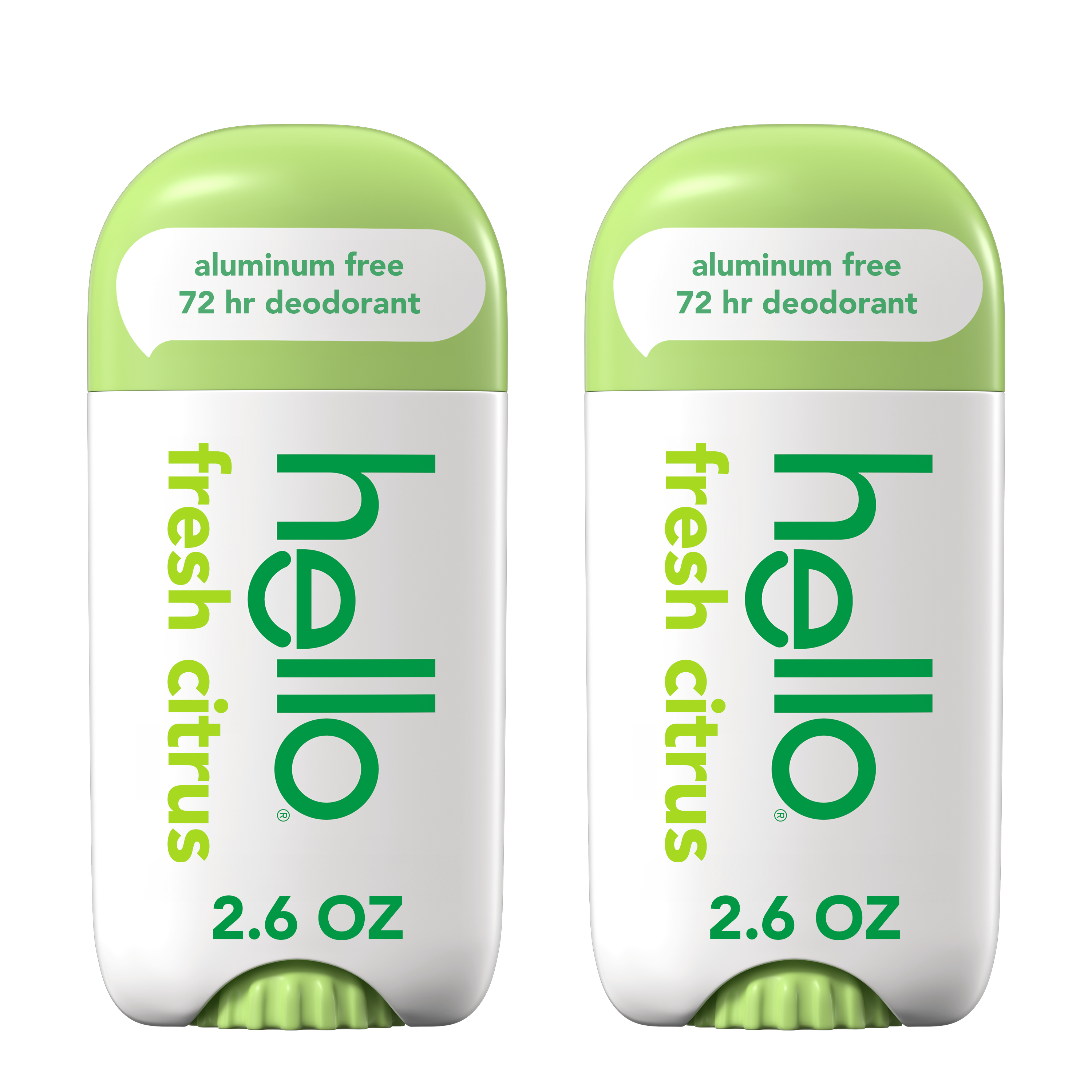 SKU 61057088 Consumer Unit - GTIN 00827854030324 Case - GTIN 10827854030321 Product Category Personal Care Product Sub Category AP > Deo Product Equity (Brand) hello Product Sub Brand Hello AP/Deo Product Title hello Fresh Citrus Aluminum Free Deodorant for Women and Men, 72-Hour Deodorant, Only 9 Ingredients, Baking Soda Free, Enriched with Shea Butter, Vegan, 2.6 oz Stick Deodorant (2 Pack) Product Description Say hello to hello Fresh Citrus Aluminum Free Deodorant. Stay fresh all day (and then some) with this 72-hour deodorant. Made with just 9 ingredients and no aluminum, parabens, phthalates, dyes, or baking soda, now that’s a no-brainer. This deodorant stick delivers an amazing scent that lasts and makes every day a little more invigorating. A splash of citrus with a touch of rosemary and lavender, plus a hint of musk, energizes your senses and leaves you feeling sub-lime. All of our deodorants are dermatologically tested, vegan, and not tested on animals. Goodbye staining. Our deos glide easily providing even coverage. Plus, we packed it with shea butter, so your skin gets a little extra love every time you swipe. Perfect for everyday use—men, women, and teen-friendly (younger kids, ask an adult first). The zest is yet to come with hello Fresh Citrus Deodorant. Bullet 1 Includes two 2.6 oz sticks of hello Fresh Citrus Aluminum Free Deodorant for anyone who wants a personal hype squad in a stick Bullet 2 Made with 9 ingredients so no aluminum, parabens, phthalates, dyes, or baking soda, now that’s a no-brainer Bullet 3 Stay fresh for up to 3 days—this shea butter-powered deodorant keeps you confidently smelling great Bullet 4 Herbal notes of rosemary and lavender mingle with bright bergamot, soft jasmine, and a hint of musk—leaving you feeling sub-lime Bullet 5 Dermatologically tested for peace of mind and picky-skin approved—vegan and not tested on animals Bullet 6 Perfect for everyday use—men, women, and teen-friendly (younger kids, ask an adult first) Bullet 7 Goodbye staining, our deos glide easily, providing even coverage