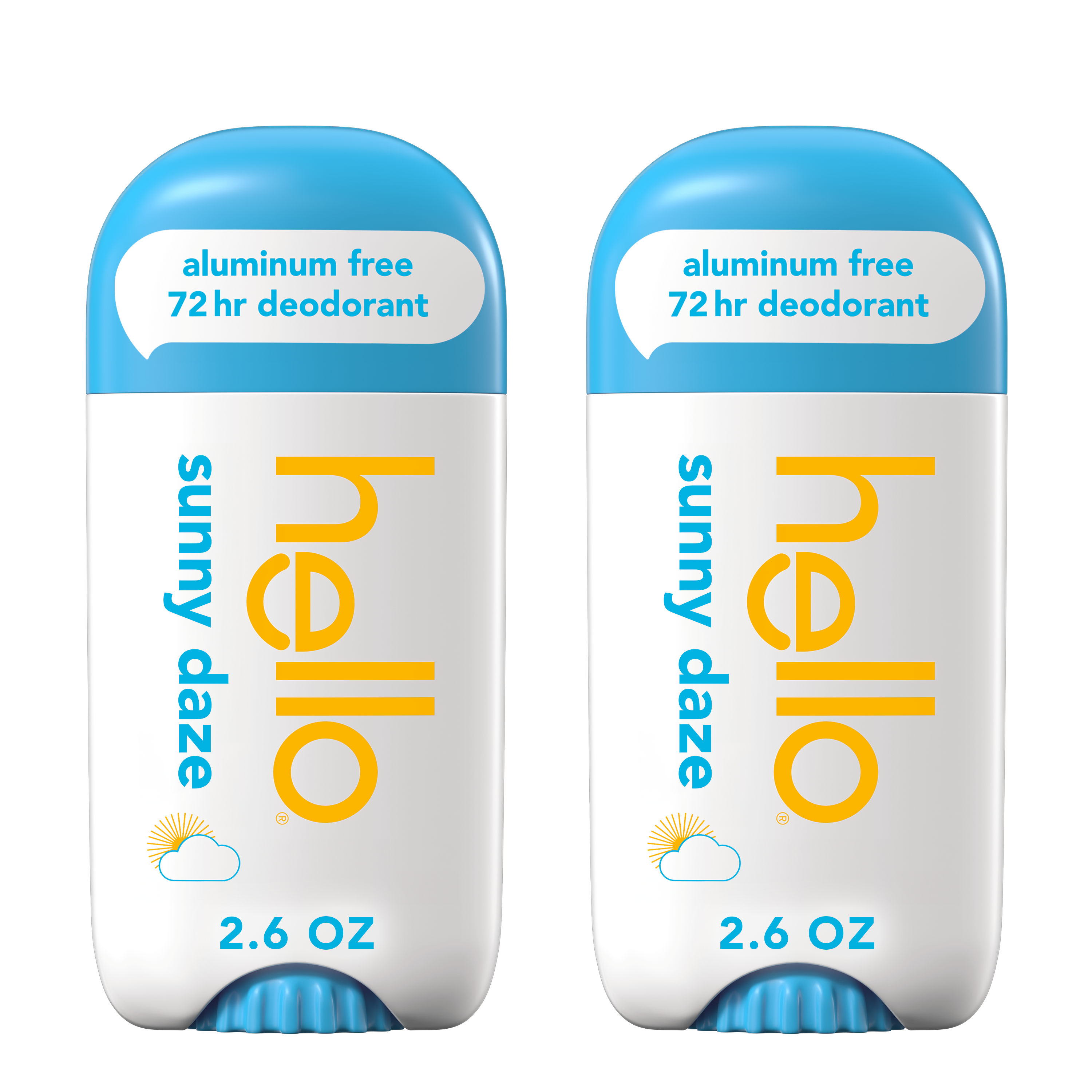 SKU 61057094 Consumer Unit - GTIN 00827854020721 Case - GTIN 10827854020728 Product Category Personal Care Product Sub Category AP > Deo Product Equity (Brand) hello Product Sub Brand Hello AP/Deo Product Title hello Sunny Daze Aluminum Free Deodorant for Women and Men, 72-Hour Deodorant, Only 9 Ingredients, Baking Soda Free, Enriched with Shea Butter, Vegan, 2.6 oz Stick Deodorant (2 Pack) Product Description Say hello to hello Sunny Daze Aluminum Free Deodorant. Stay fresh all day (and then some) with this 72-hour deodorant. Made with only 9 ingredients and no aluminum, parabens, phthalates, dyes, or baking soda, now that’s a no-brainer. This deodorant stick delivers an amazing scent that lasts and makes every day a little more radiant. A vibrant mix of citrus and light florals, balanced by creamy vanilla-musk, brings to mind sun-soaked days and cheerful moments. All of our deodorants are dermatologically tested, vegan, and not tested on animals. Goodbye staining. Our deos glide easily, providing even coverage. Plus, we packed it with shea butter, so your skin gets a little extra love every time you swipe. Perfect for everyday use—men, women, and teen-friendly (younger kids, ask an adult first). Get ready to seize the daze with hello Sunny Daze Aluminum Free Deodorant. Bullet 1 Includes two 2.6 oz sticks of hello Sunny Daze Aluminum Free Deodorant for your daily dose of sunshine—like all the best days of summer on speed dial Bullet 2 Made with only 9 ingredients so no aluminum, parabens, phthalates, dyes, or baking soda, now that’s a no-brainer Bullet 3 Stay fresh for up to 3 days—this shea butter deodorant keeps you confidently smelling great Bullet 4 A vibrant blend of blood orange, mandarin, and grapefruit is brightened with hints of peach apricot and violet, then balanced by creamy vanilla-musk Bullet 5 Dermatologically tested for peace of mind and picky-skin approved—vegan and not tested on animals Bullet 6 Perfect for everyday use—men, women, and teen-friendly (younger kids, ask an adult first) Bullet 7 Goodbye staining, our deos glide easily, providing even coverage Amazon RPC B0DNTVWVXN AMZ URL https://www.amazon.com/dp/B0DNTVWVXN