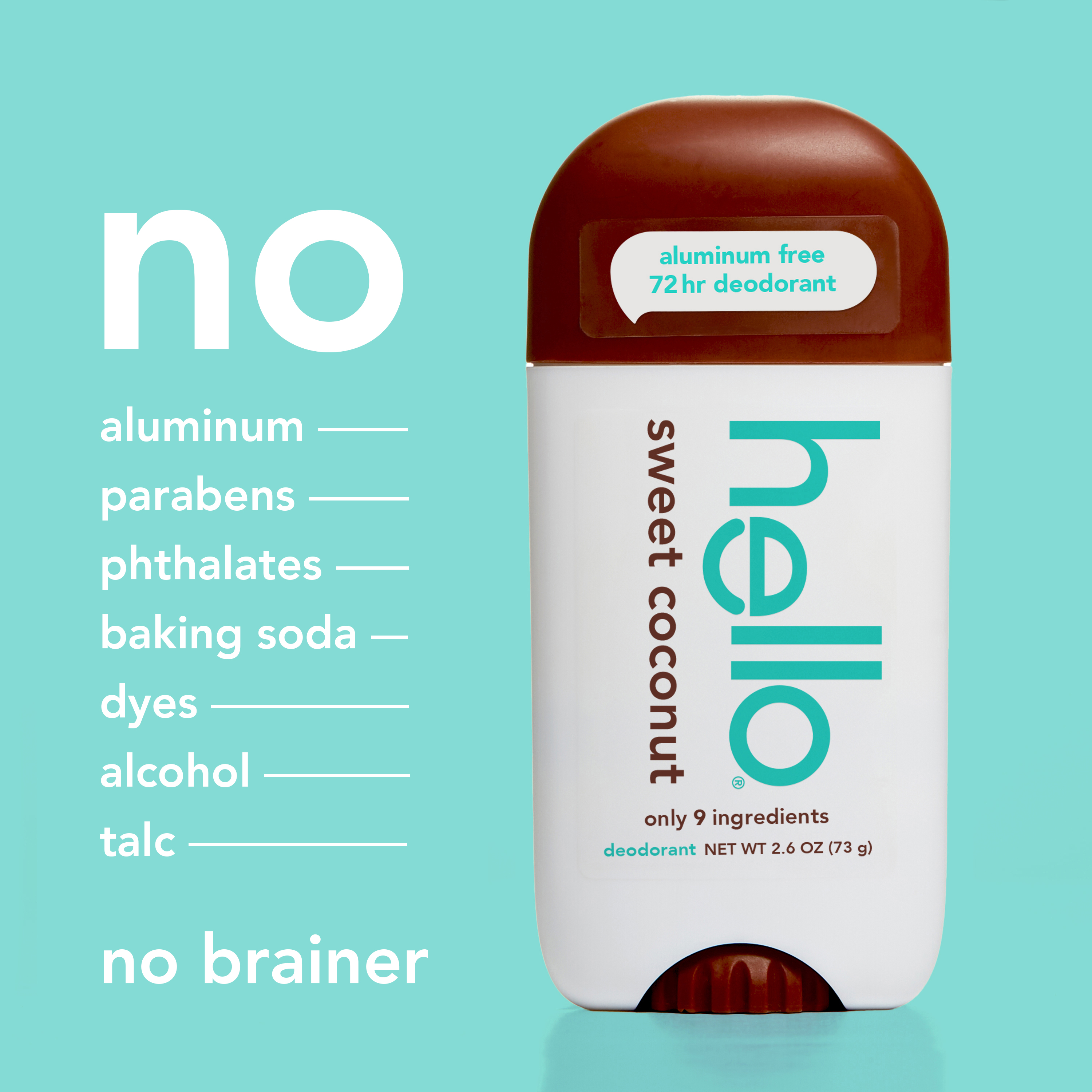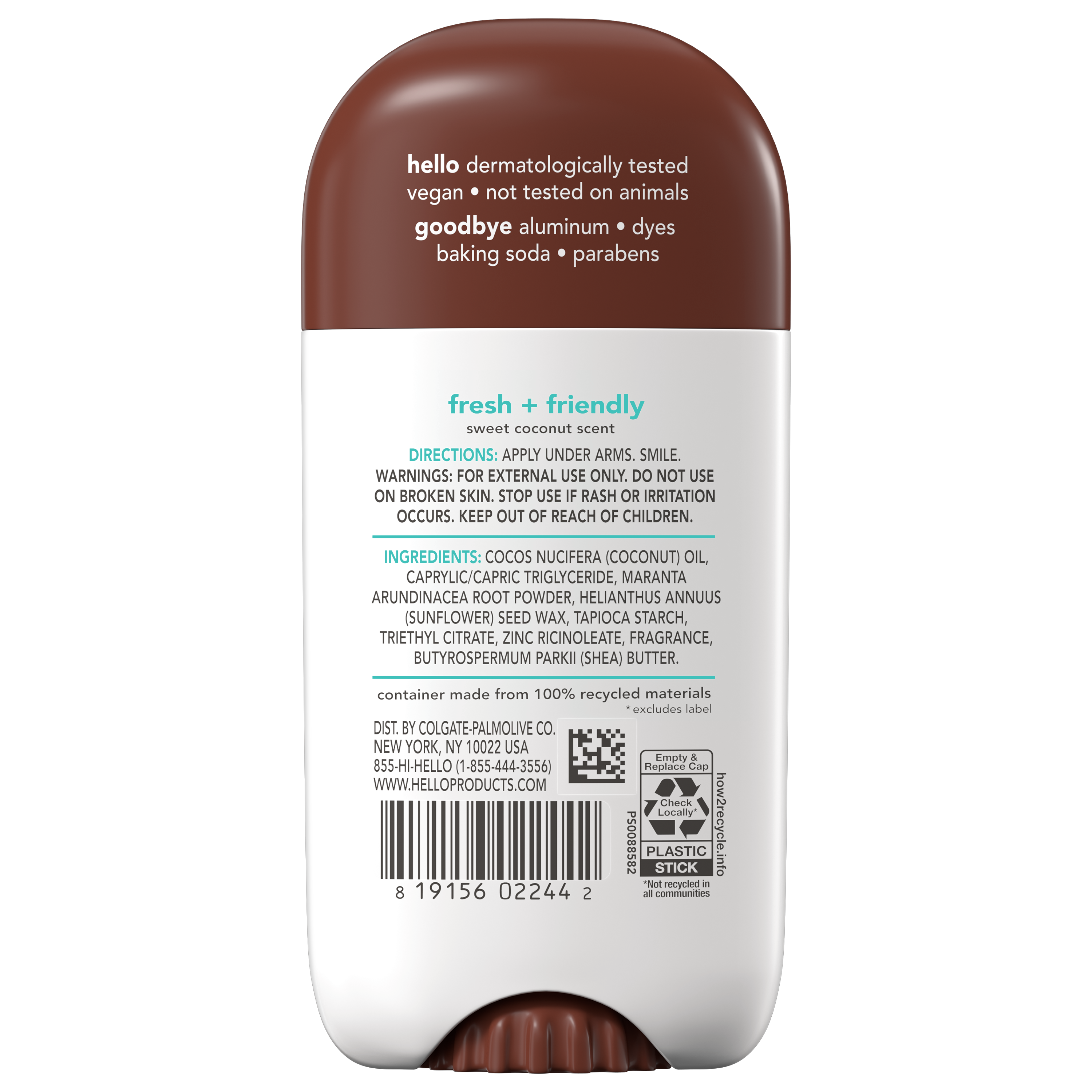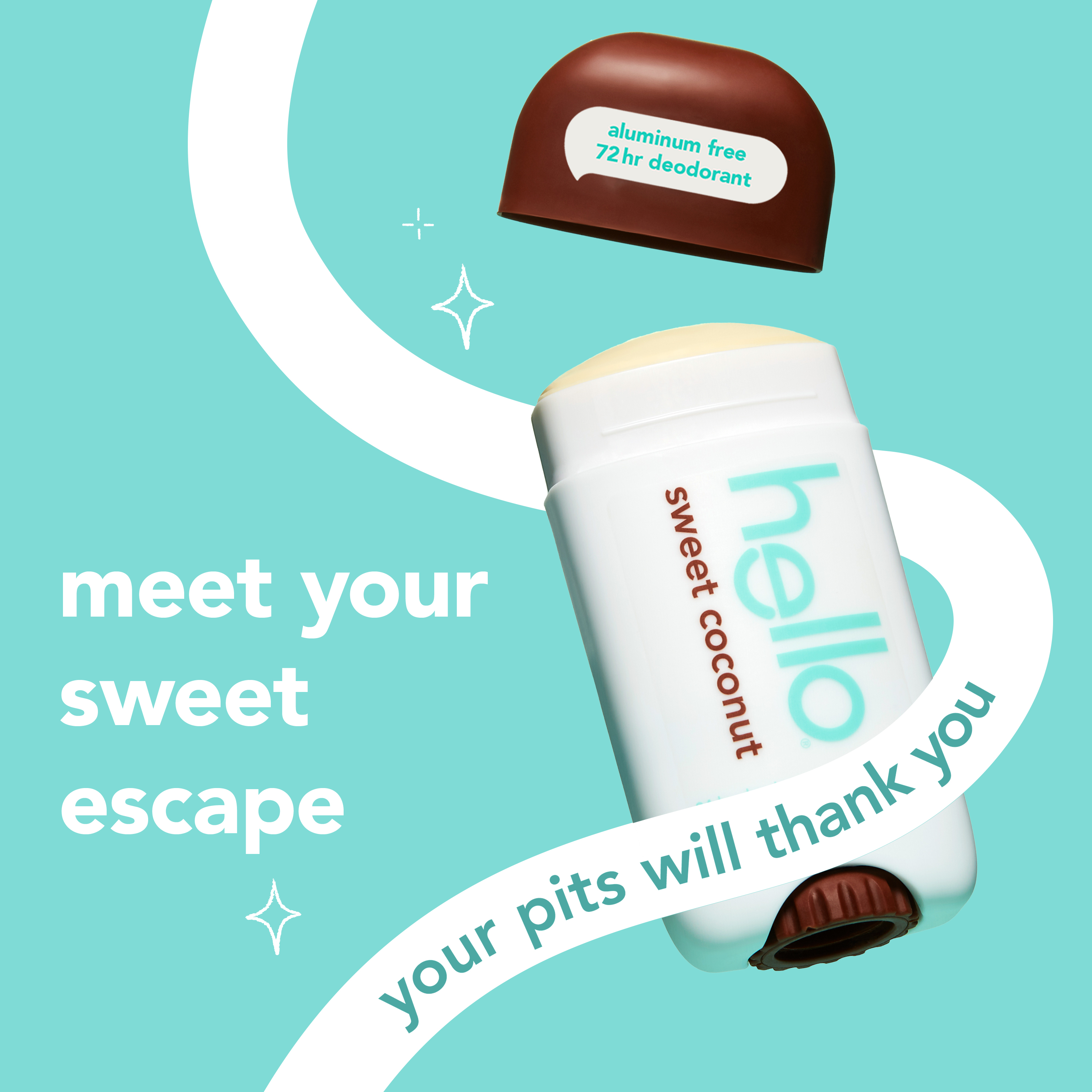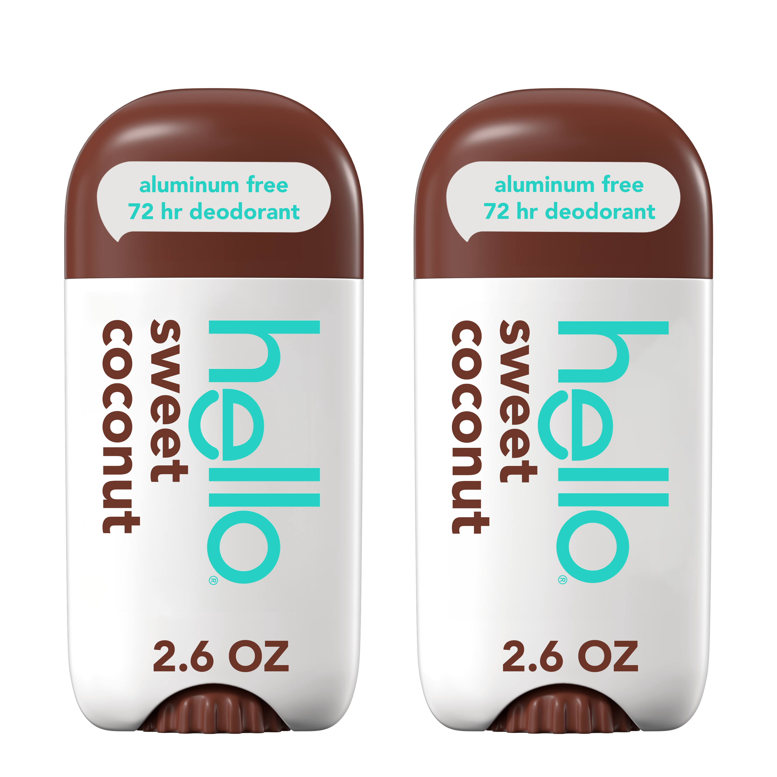 SKU 61057096 Consumer Unit - GTIN 00819156024149 Case - GTIN 10827854030420 Product Category Personal Care Product Sub Category AP > Deo Product Equity (Brand) hello Product Sub Brand Hello AP/Deo Product Title hello Sweet Coconut Aluminum Free Deodorant for Women and Men, 72-Hour Deodorant, Only 9 Ingredients, Baking Soda Free, Enriched with Shea Butter, Vegan, 2.6 oz Stick Deodorant (2 Pack) Product Description Say hello to hello Sweet Coconut Aluminum Free Deodorant. Stay fresh all day (and then some) with this 72-hour deodorant. Made with only 9 ingredients and no aluminum, parabens, phthalates, dyes, or baking soda, now that’s a no-brainer. This deodorant stick delivers an amazing scent that lasts and brings a little extra sunshine wherever you go. Creamy coconut and vanilla blend with swirls of sandalwood and musk—call it a wearable daydream. All of our deodorants are dermatologically tested, vegan, and not tested on animals. Goodbye staining. Our deos glide easily, providing even coverage. Plus, we packed it with shea butter, so your skin gets a little extra love every time you swipe. Perfect for everyday use—men, women, and teen-friendly (younger kids, ask an adult first). Don't wait. Put it on and make any day a sweet escape with hello Sweet Coconut Aluminum Free Deodorant. Bullet 1 Includes two 2.6 oz sticks of hello Sweet Coconut Aluminum Free Deodorant is for anyone who wants to bring vacation energy wherever they go Bullet 2 Made with 9 ingredients so no aluminum, parabens, phthalates, dyes, or baking soda, now that’s a no-brainer Bullet 3 Stay fresh for up to 3 days—this shea butter deodorant keeps you confidently smelling great Bullet 4 Lush coconut, pineapple, jasmine, and vanilla mingle with amber, sandalwood, and musk—bringing warmth, ease, and a touch of escape Bullet 5 Dermatologically tested for peace of mind and picky-skin approved—vegan and not tested on animals Bullet 6 Perfect for everyday use—men, women, and teen-friendly (younger kids, ask an adult first) Bullet 7 Goodbye staining, our deos glide easily providing even coverage