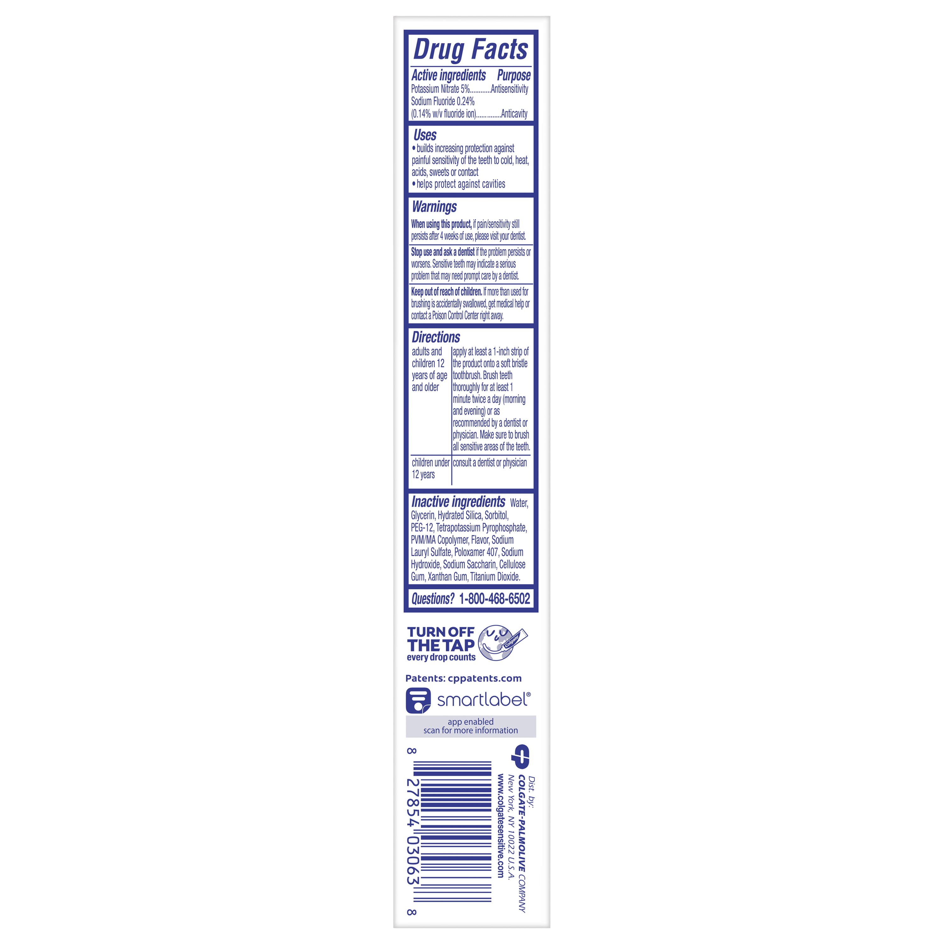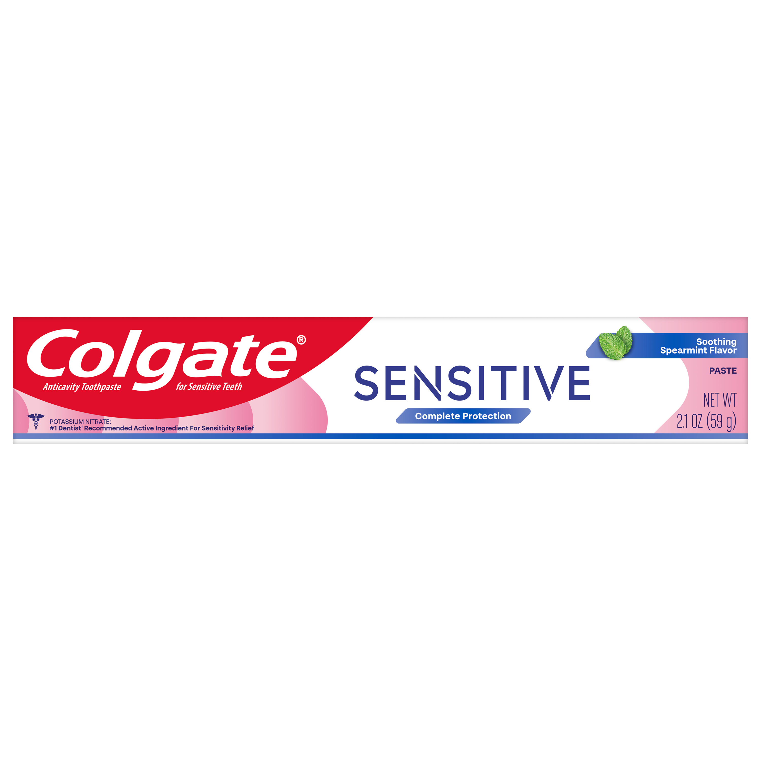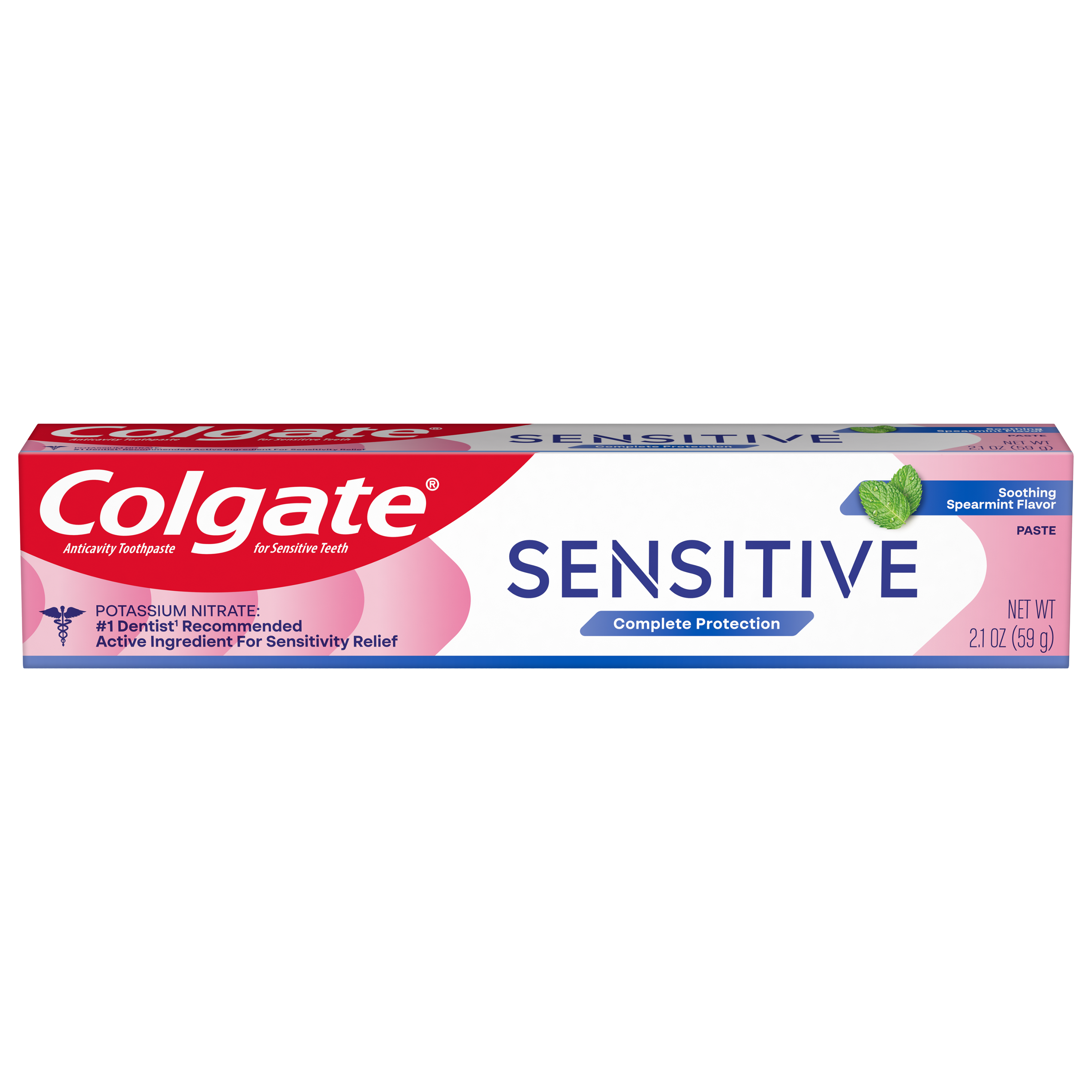 SKU 61057370 Consumer Unit - GTIN 00827854030638 Case - GTIN 10827854030635 Product Category Oral Care Product Sub Category Toothpaste Product Equity (Brand) Colgate Product Sub Brand Colgate Sensitive TP Product Title Colgate Sensitive Complete Protection Travel Size Sensitive Toothpaste, Spearmint, 2.1 oz Product Description Sensitivity relief never tasted so good with Colgate Sensitive Complete Protection Toothpaste. This Soothing Spearmint flavored fluoride toothpaste for sensitive teeth offers 24/7 sensitivity relief* and helps shield tooth enamel against erosion and cavities. This Colgate sensitive toothpaste contains potassium nitrate, a dentist recommended active ingredient for sensitivity relief. Potassium nitrate is clinically proven to offer long-term sensitivity protection.* Colgate Sensitive Complete Protection Spearmint Toothpaste is designed for daily use and offers sensitivity relief in a flavor you’ll love. Because it’s formulated with 5% potassium nitrate, this sensitive toothpaste offers sensitivity relief that works so you can enjoy cold, hot, and sweet food and drinks. In addition to offering lasting sensitivity relief, this potassium nitrate toothpaste helps repair and protect teeth against the effects of acid erosion and helps prevent tartar buildup**. Help prevent bad breath, cavities, and tartar buildup** while repairing weakened enamel and protecting against erosion with Colgate Sensitive Complete Protection Toothpaste for Sensitive Teeth. *with twice daily brushing after two weeks of continuous use **with regular brushing eCommerce Copy- Long Description Colgate® Sensitive Complete Protection Toothpaste is a sensitive toothpaste that combines all the benefits of a daily toothpaste while providing clinically-proven sensitivity relief for your teeth. But it doesn’t stop there, it provides tartar control, freshens breath, and yes, even plaque and cavity prevention with regular brushing. You really can whiten your smile while avoiding sensitive teeth pain with this sensitive toothpaste from the Colgate® Sensitive line. Experience a Brighter Smile Without Sensitivity* Daily brushing and flossing are essential habits if you want to prevent oral health issues like early gum disease and cavities. However, if you have sensitive teeth, the Colgate® Sensitive line of sensitive teeth toothpastes with sensitivity relief can help! Formulated to give your teeth 24/7 sensitivity protection**, anti sensitivity toothpastes are the proven solution to reduce pain with long-lasting** sensitivity relief, cavity protection and refreshing flavor. Relief is never far away with our Colgate® Sensitive line of products. *Colgate® Sensitive toothpaste helps relieve sensitivity in up to 2 weeks with twice-daily brushing **with twice-daily brushing Healthy Smiles At Colgate, we make toothpaste that promotes healthy smiles. Not only because having a healthy smile is important to your overall health, but because when you have a healthy smile, you actually smile more – and that’s a powerful thing. Smiles are the simplest form of optimism, something we need now more than ever. That’s why we’re committed to raising oral healthcare standards everywhere. Bullet 1 One (1) travel size 2.1 oz tube of Colgate Sensitive Complete Protection Toothpaste for Sensitive Teeth, Travel Size Toothpaste with Fluoride Bullet 2 This travel size sensitive toothpaste contains 5% potassium nitrate, a dentist recommended active ingredient for sensitivity relief Bullet 3 The fluoride formulated toothpaste for bad breath tackles cavities and comes in a Soothing Spearmint toothpaste flavor Bullet 4 This anticavity toothpaste provides 24/7 sensitivity protection* and helps shield tooth enamel against erosion and cavities Bullet 5 Colgate Sensitive Complete Protection Toothpaste is a tartar toothpaste that helps repair weakened enamel and protects against acid erosion Bullet 6 Experience sensitive teeth relief with this travel size Colgate Sensitive Complete Protection Toothpaste for Sensitive Teeth