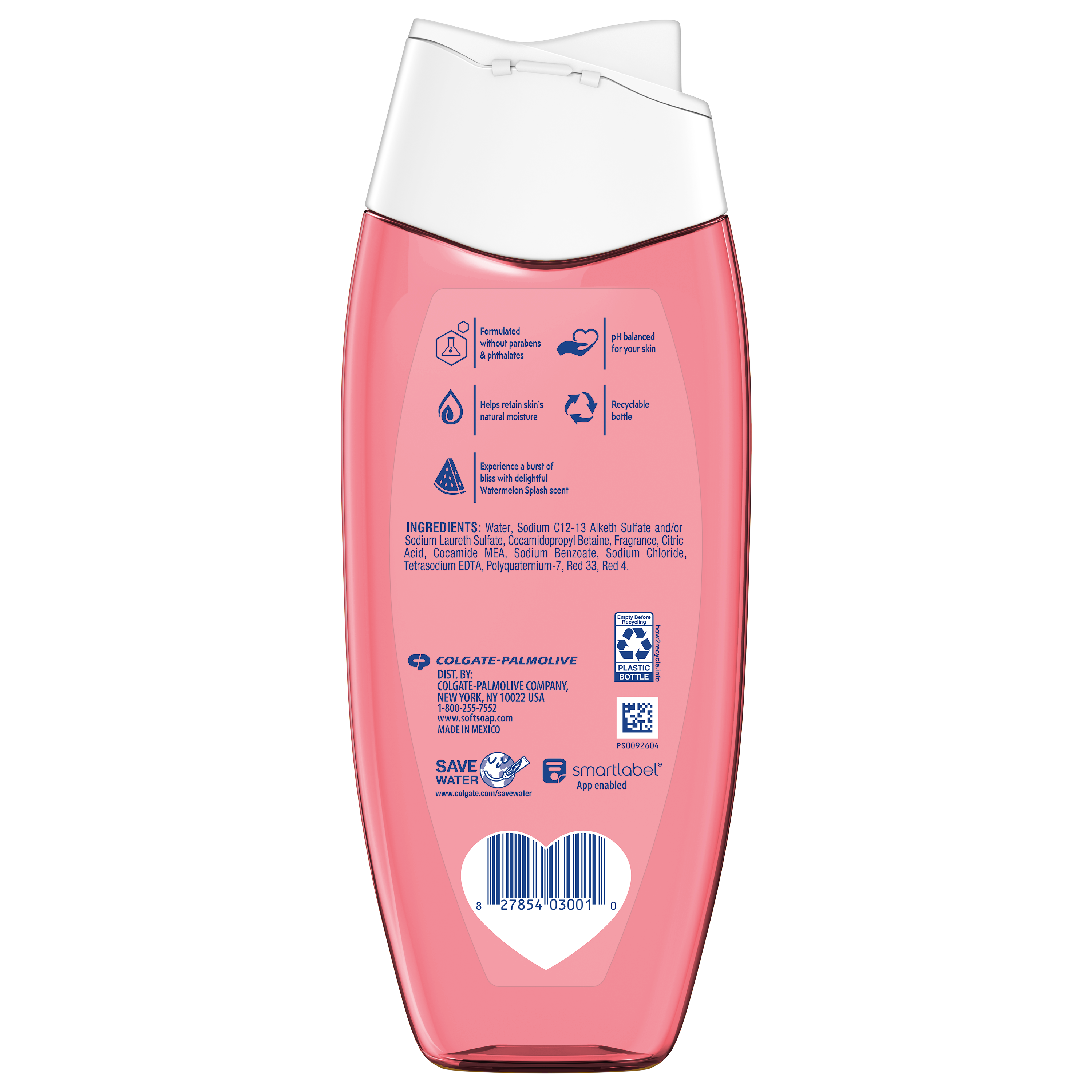 SKU 61057641 Consumer Unit - GTIN 00827854030010 Case - GTIN 10827854030888 Product Category Personal Care Product Sub Category Body Wash Product Equity (Brand) Softsoap Product Sub Brand Softsoap BW Product Title Softsoap Moisturizing Body Wash, pH Balanced, Paraben Free, Body Wash and Shower Gel, Watermelon Splash Scent, 12 fl oz Product Description Experience a burst of bliss every day with Softsoap Watermelon Splash Moisturizing pH Balanced Body Wash. Awaken your senses with a fresh, juicy scent of watermelon as you moisturize your skin and feel the joy of clean. This body wash brings freshness to every shower, leaving your skin feeling revitalized. This moisturizing, pH balanced body wash helps retain your skin’s natural moisture, making it perfect for daily use. Make bath time fun for the whole family! Softsoap body wash is moisturizing, making it a great choice for kids and adults alike. It is also formulated without parabens and phthalates. Whether you’re searching for a pink body wash, a shower gel, or simply want a refreshing personal care product, Softsoap’s got you covered! Bullet 1 Includes one 12 fl oz bottle of Softsoap Moisturizing pH balanced Body Wash, Watermelon Splash Scent Bullet 2 This body wash helps retain your skin’s natural moisture, making it perfect for daily use Bullet 3 Awaken your senses with a fresh, juicy scent of watermelon, delivering a refreshing start to your day Bullet 4 This body wash for women provides cleansing, leaving your skin feeling fresh, smooth, and beautifully scented Bullet 5 Formulated without parabens and phthalates Family Dollar RPC 2009604