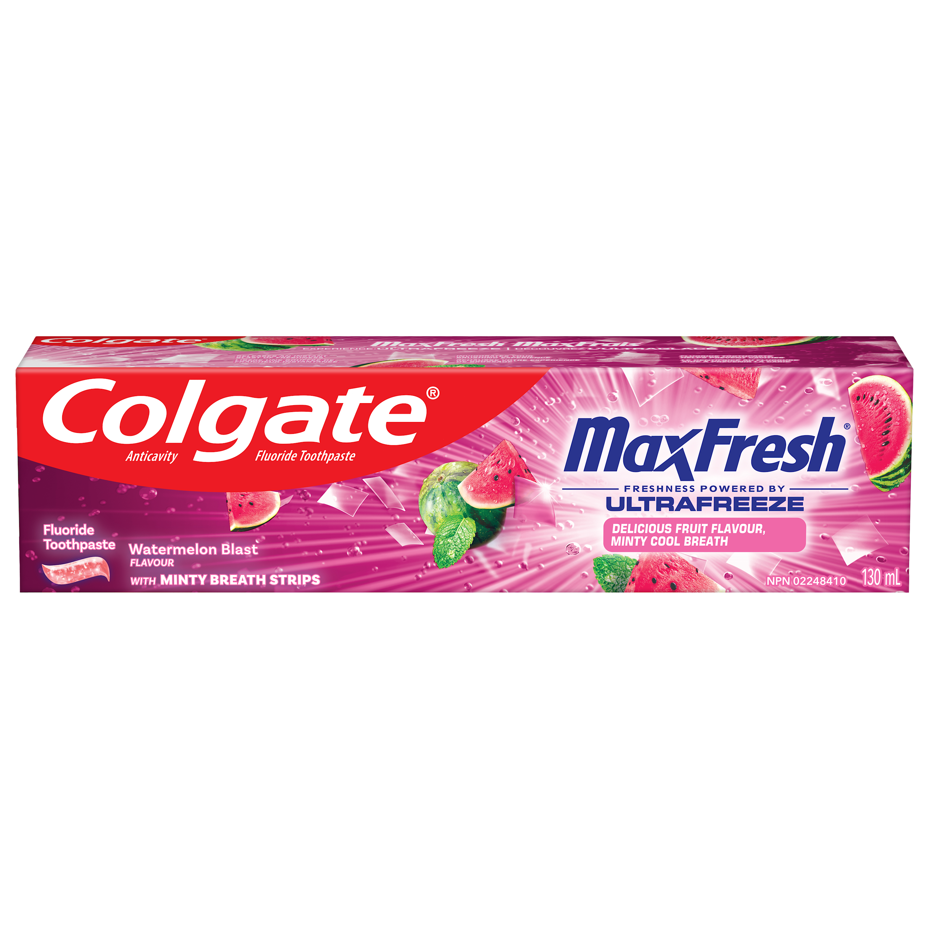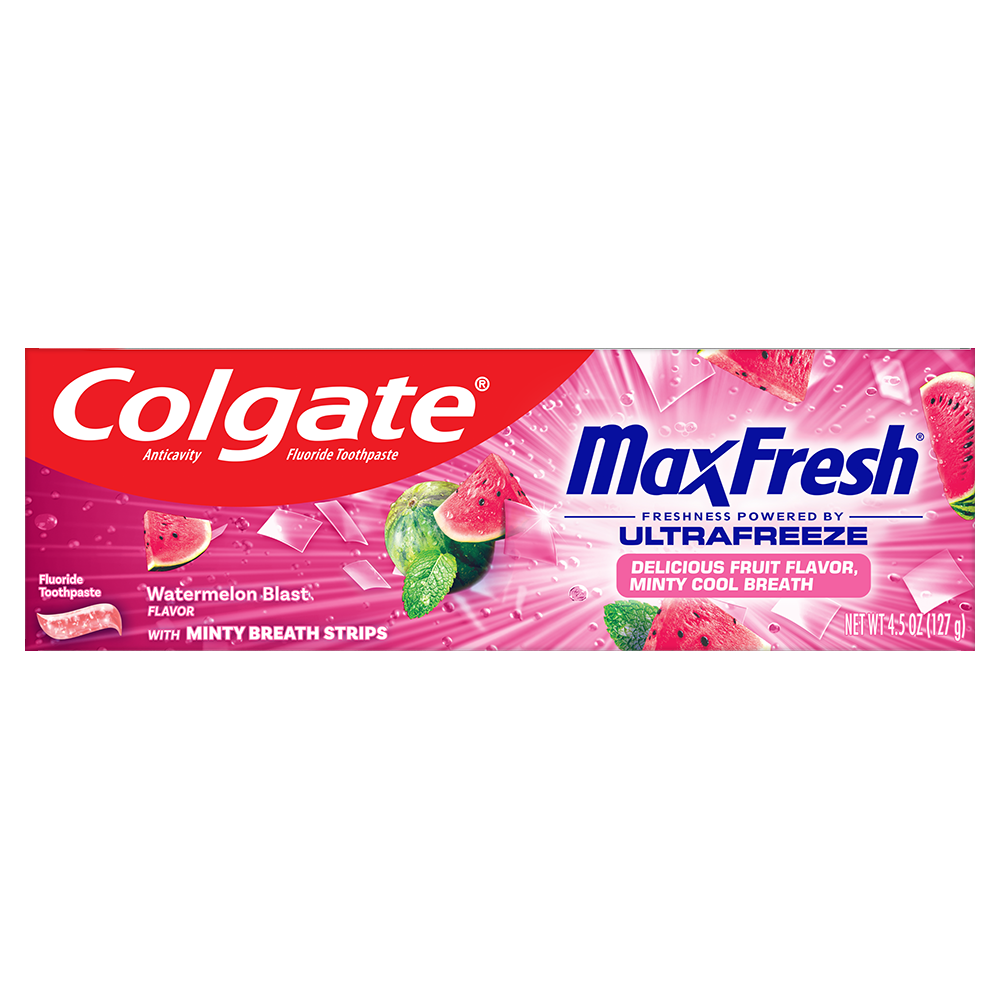 SKU 61057845 Consumer Unit - GTIN 00827854031062 Case - GTIN 10827854031069 Product Category Oral Care Product Sub Category Toothpaste Product Equity (Brand) Colgate Product Sub Brand Colgate Max Fresh TP Product Title Colgate Max Fresh Anticavity Fluoride Toothpaste, Watermelon Blast with Mint, 3 Pack, 4.5 oz. Product Description Release an instant blast of fruit-flavored freshness with Colgate Max Fresh Anticavity Fluoride Toothpaste in Watermelon Blast with Mint. This 3 pack of fresh breath toothpaste delivers a refreshing blend of fruit and mint flavor every time you brush. Enjoy the vibrant fruity flavor of juicy watermelon and infuse your brushing routine with delicious fruit flavor and minty freshness with this anticavity toothpaste pack. Invigorate your brushing experience with this deliciously fruity and refreshingly minty tube of Colgate Max Fresh Toothpaste. Powered by Ultrafreeze, this cooling mint toothpaste offers a refreshingly cool taste that leaves your breath feeling minty fresh. The fruit-flavored watermelon toothpaste is formulated with hundreds of mini breath strips and releases an instant blast of freshness every time you brush. Colgate Max Fresh cavity protection toothpaste is an adult toothpaste for bad breath. It is a fluoride toothpaste that helps prevent cavities and is packed with hundreds of mini breath strips. Colgate Max Fresh Watermelon Blast Toothpaste offers delicious fruit flavor and a refreshing cool. The fluoride-based gluten free toothpaste formula helps fight cavities. Get long-lasting fresh breath with Colgate Max Fresh Toothpaste. eCommerce Copy- Long Description Release an instant blast of fruit-flavored freshness with Colgate Max Fresh Anticavity Fluoride Toothpaste in Watermelon Blast with Mint. This 3 pack of fresh breath toothpaste delivers a refreshing blend of fruit and mint flavor every time you brush. Enjoy the vibrant fruity flavor of juicy watermelon and infuse your brushing routine with delicious fruit flavor and minty freshness with this anticavity toothpaste pack. Invigorate your brushing experience with this deliciously fruity and refreshingly minty tube of Colgate Max Fresh Toothpaste. Powered by Ultrafreeze, this cooling mint toothpaste offers a refreshingly cool taste that leaves your breath feeling minty fresh. The fruit-flavored watermelon toothpaste is formulated with hundreds of mini breath strips and releases an instant blast of freshness every time you brush. Colgate Max Fresh cavity protection toothpaste is an adult toothpaste for bad breath. It is a fluoride toothpaste that helps prevent cavities and is packed with hundreds of mini breath strips. Colgate Max Fresh Watermelon Blast Toothpaste offers delicious fruit flavor and a refreshing cool. The fluoride-based gluten free toothpaste formula helps fight cavities. Get long-lasting fresh breath with Colgate Max Fresh Toothpaste. Bullet 1 Includes three (3) 4.5 oz tubes of Colgate Max Fresh Fluoride Toothpaste, Watermelon Blast Fruit-Flavored Toothpaste for Adults with Mint Bullet 2 This fresh breath toothpaste pack delivers a refreshing blend of juicy watermelon flavor with mint Bullet 3 Powered by Ultrafreeze, Colgate MaxFresh Toothpaste offers a refreshingly cool taste that leaves your breath feeling minty fresh Bullet 4 More than just an adult toothpaste for bad breath, Colgate MaxFresh Toothpaste uses a fluoride-based formula to fight cavities and is a gluten free toothpaste Bullet 5 This fruity mint toothpaste, with hundreds of mini breath strips, releases an instant blast of freshness every time you brush
