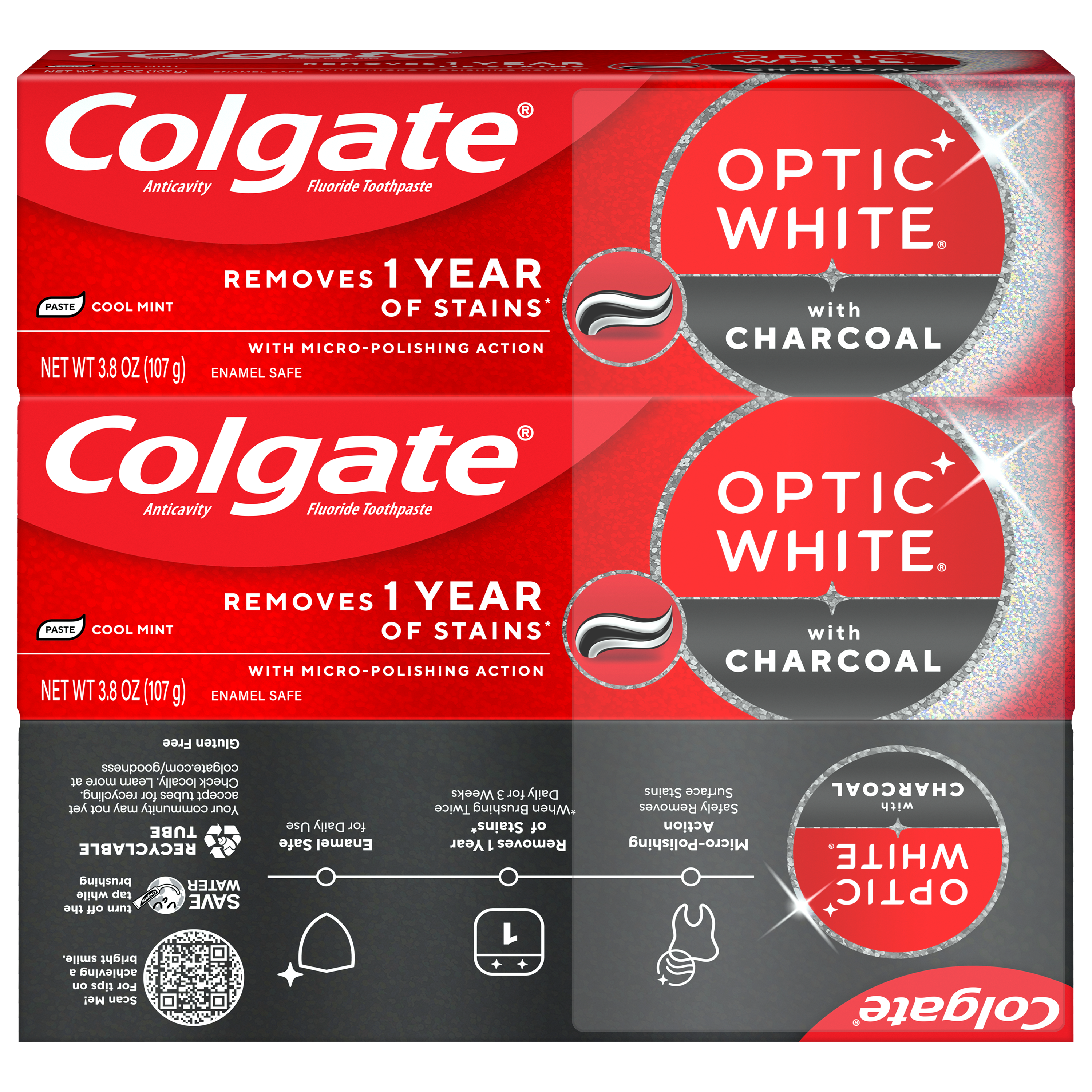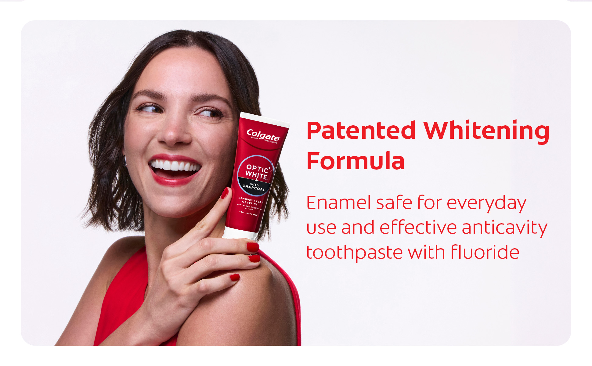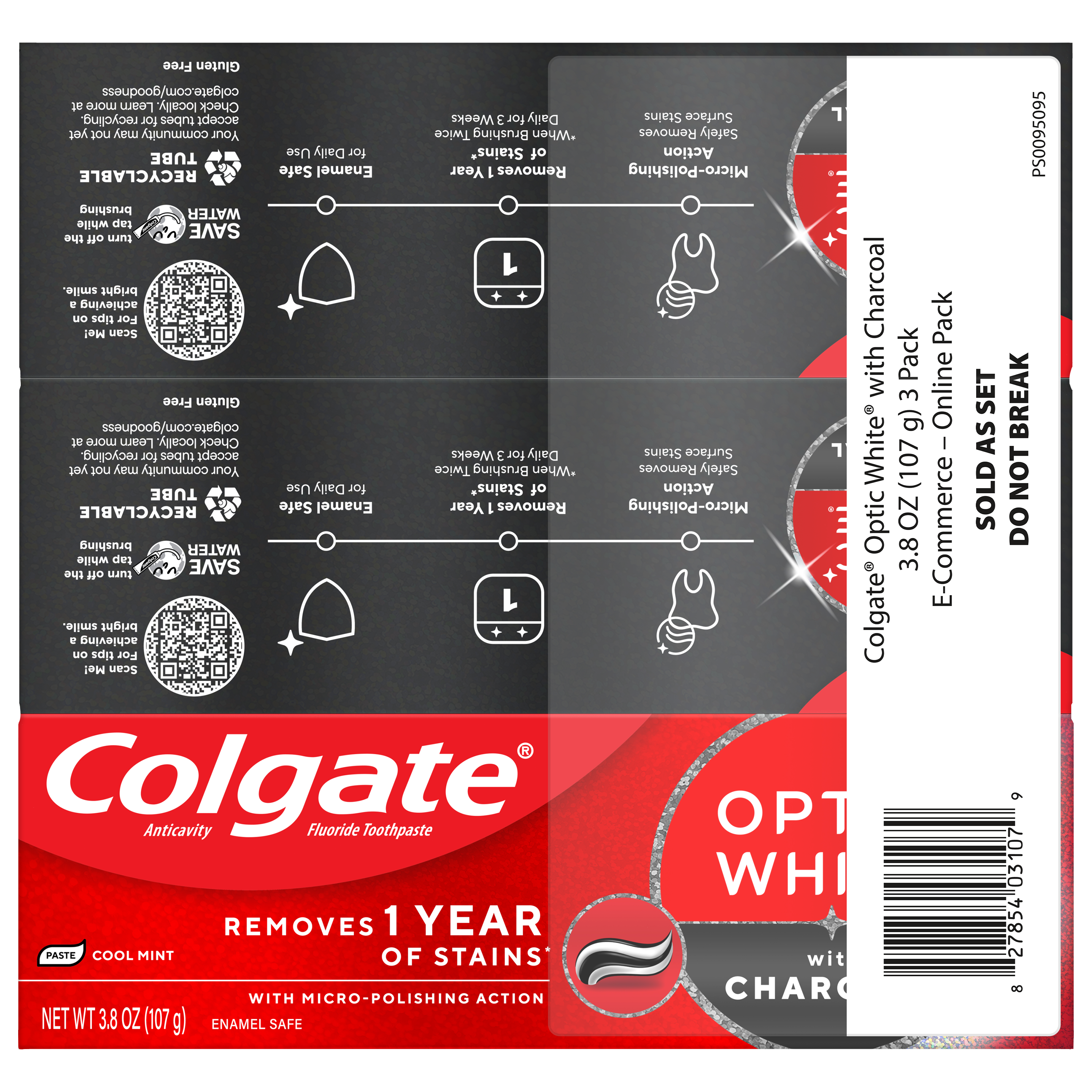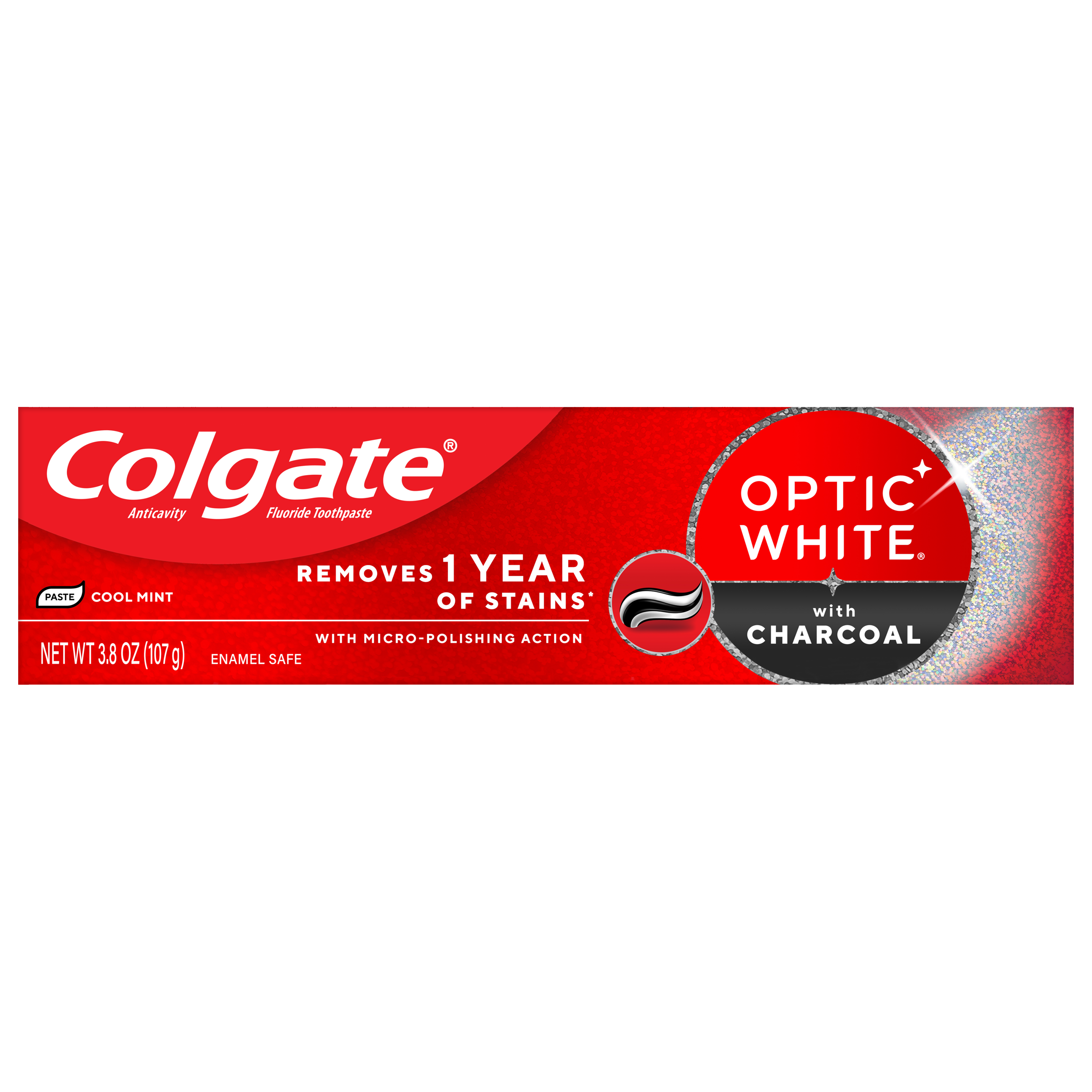 SKU 61057846 Consumer Unit - GTIN 00827854031079 Case - GTIN 10827854031076 Product Category Oral Care Product Sub Category Toothpaste Product Equity (Brand) Colgate Product Sub Brand Colgate Optic White TP Product Title Colgate Optic White with Charcoal Teeth Whitening Toothpaste, Anticavity Toothpaste with Fluoride, Cool Mint Flavor, 3.8 OZ Product Description Colgate Optic White with Charcoal Toothpaste removes 1 year of stains* while freshening breath with its cool mint flavor. With effective micropolishers, this teeth whitening toothpaste safely removes surface stains. Enamel safe for daily use, Optic White with Charcoal delivers a refreshing experience with a sweet peppermint flavor. Optic White with Charcoal removes 5X more surface stains with micro-polishing action** for a brighter smile. Micro-Polishing Action: Safely Removes Surface StainsColgate Optic White with Charcoal uses micropolishers to brush away surface stains and help prevent new ones from forming. This black toothpaste with black and white stripes is designed to remove 1 year of stains*.Enamel Safe ToothpasteOptic White with Charcoal is a patented whitening formula that is enamel safe for everyday use and an effective anticavity toothpaste with fluoride.Cool Mint ToothpasteOur sweet peppermint toothpaste freshens breath with a cool mint flavor that lasts from the first taste to the finish.*when brushing twice daily for 3 weeks**vs. ordinary, non-whitening toothpaste after 2 weeks of continued use eCommerce Copy- Long Description Help remove everyday surface stains with the Colgate Optic White Whitening Toothpaste with Charcoal. This whitening toothpaste pack removes 95% of daily surface stains* for a brighter smile. Get ready to reveal a smile that’s ready to shine with the Colgate Optic White Whitening Toothpaste with Charcoal. The Colgate Optic White Whitening Toothpaste with Charcoal uses a patented whitening formula to remove 95% of daily surface stains*. Using micro-polishing actions, this whitening stain removal toothpaste removes 5X more surface stains.** Plus, this toothpaste comes in a refreshing Cool Mint toothpaste flavor so you can enjoy minty freshness every time you brush. Colgate Optic White Toothpaste with Charcoal is a sugar free and vegan toothpaste that is enamel-safe for daily use. This teeth whitening toothpaste is also an anticavity fluoride toothpaste to help prevent cavities. For whitening that works, choose the Colgate Optic White Whitening with Charcoal Toothpaste Pack. *after 2 weeks of twice daily use **vs. ordinary, non whitening toothpaste after 2 weeks of continued use Bullet 1 One 3.8 oz tube of Colgate Optic White with Charcoal Toothpaste Bullet 2 Removes 1 year of stains* (*when brushing twice daily for three weeks) Bullet 3 Safely removes 5X more surface stains with micro-polishing action* (*vs. ordinary, non-whitening toothpaste after 2 weeks of continued use) Bullet 4 Cool Mint flavor with sweet peppermint and anise for a refreshing taste Bullet 5 Enamel safe for daily use Bullet 6 Optic White with Charcoal is a fluoride toothpaste that provides cavity protection Bullet 7 Optic White with Charcoal is a vegan toothpaste Amazon RPC B0G5VM1YYX AMZ URL https://www.amazon.com/dp/B0G5VM1YYX
