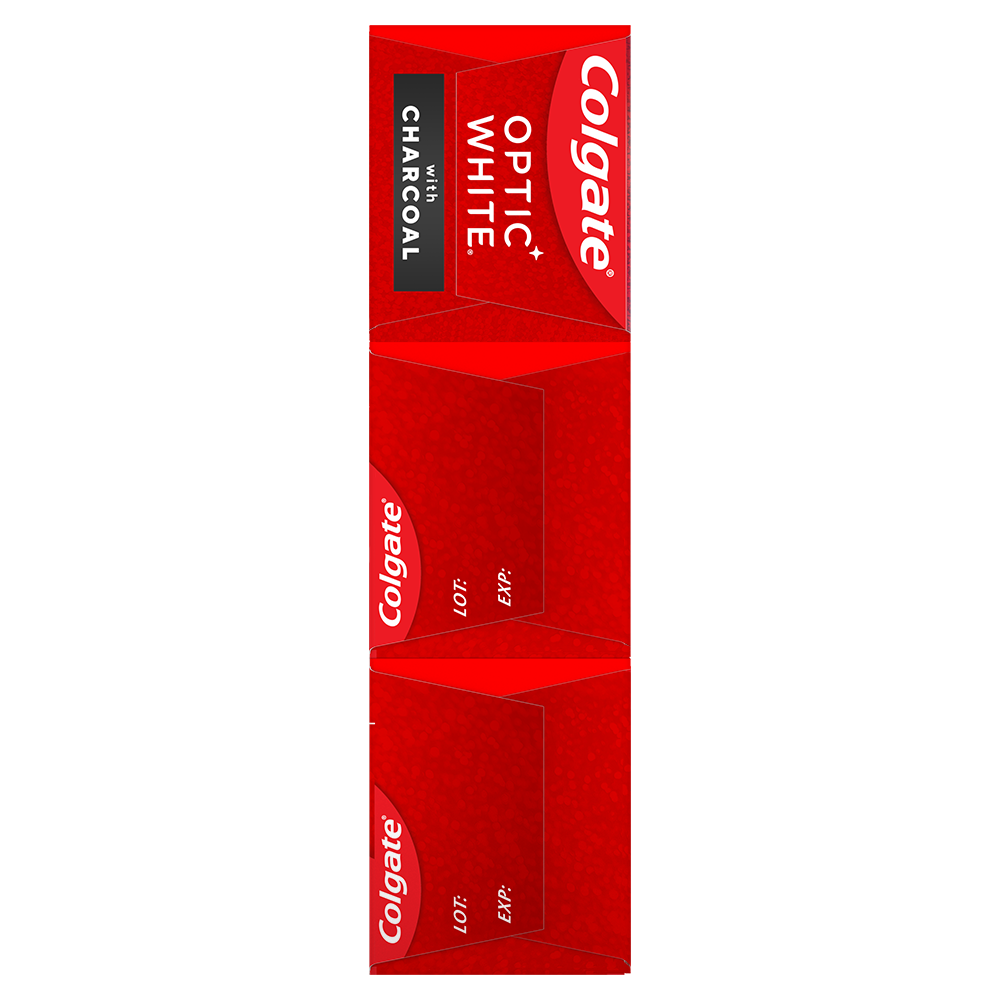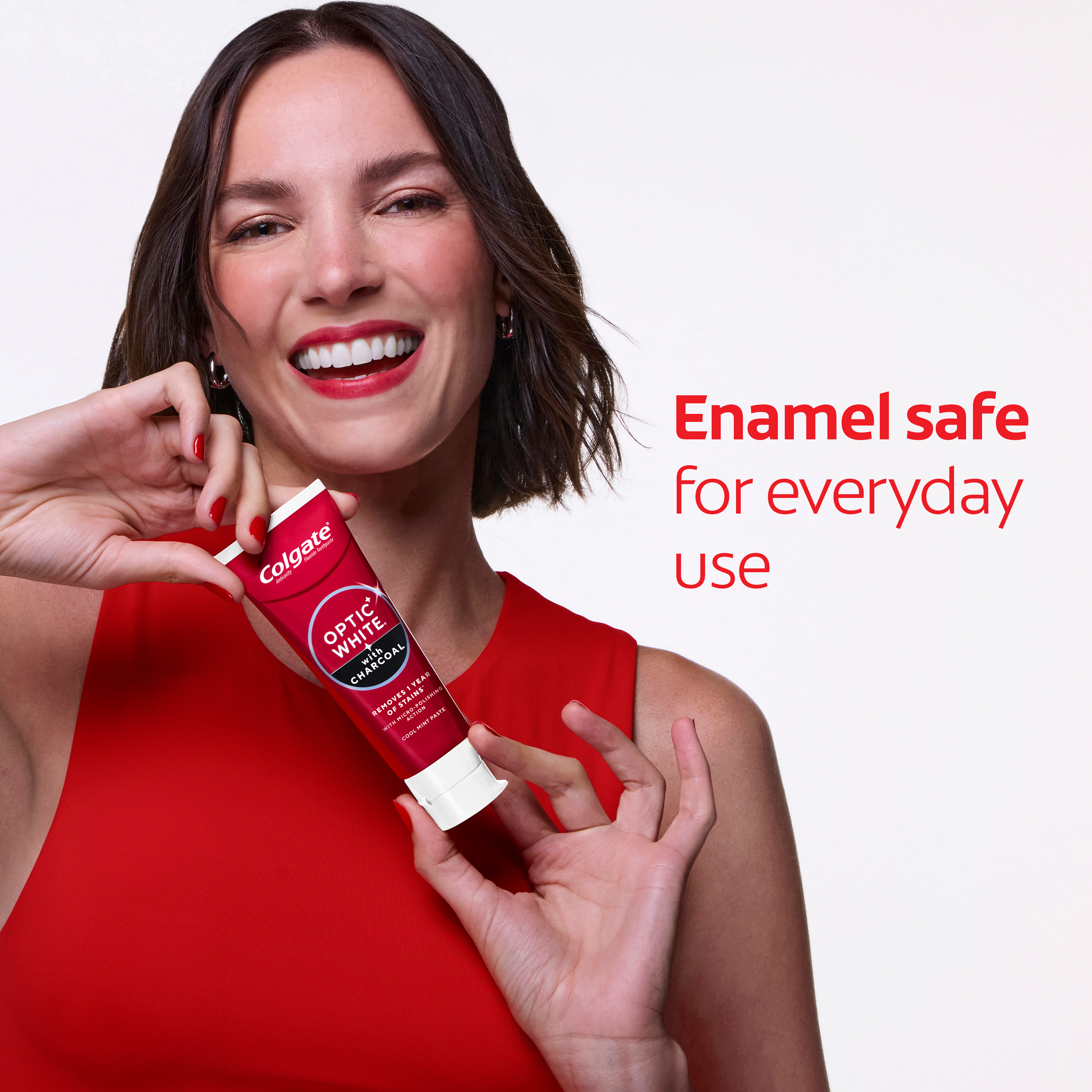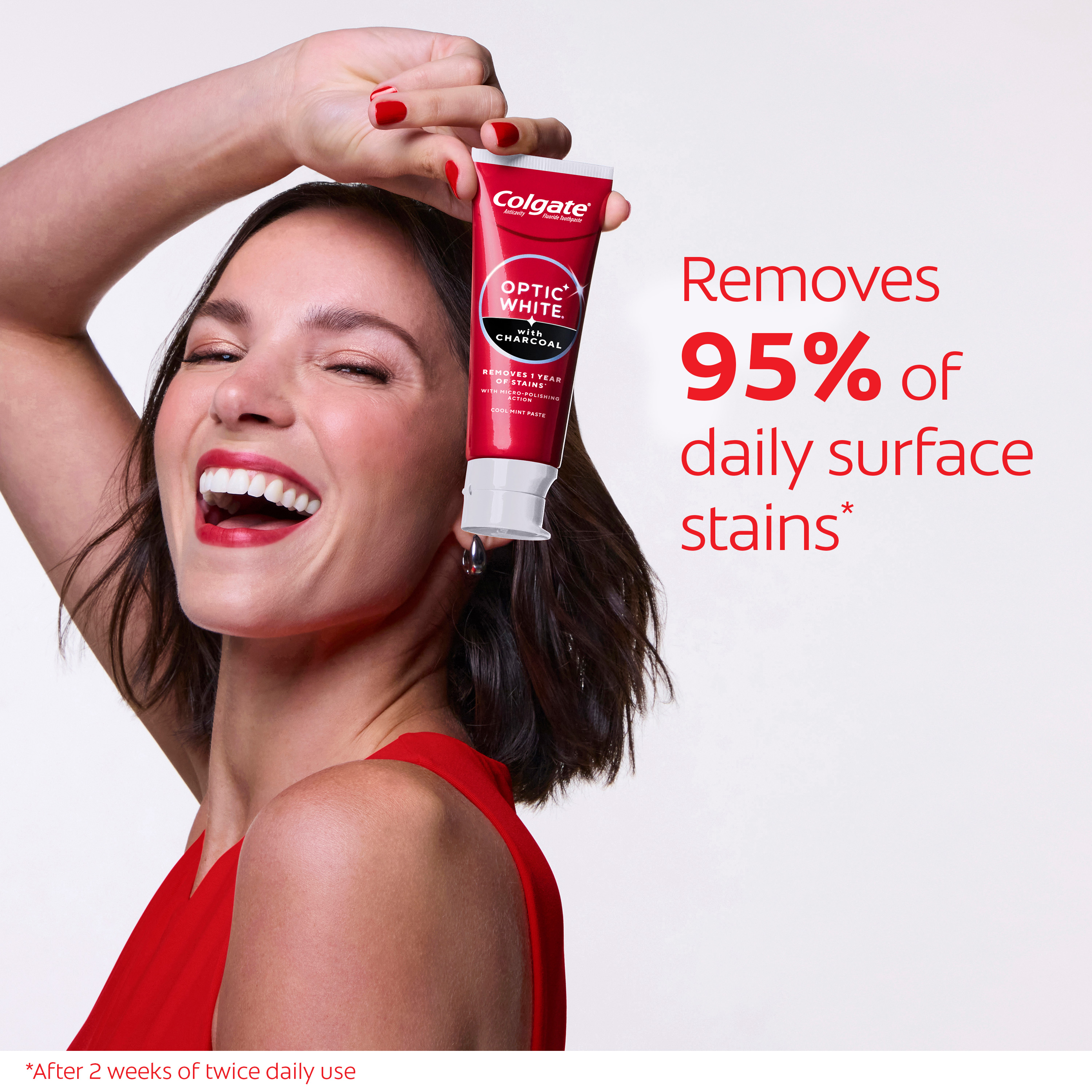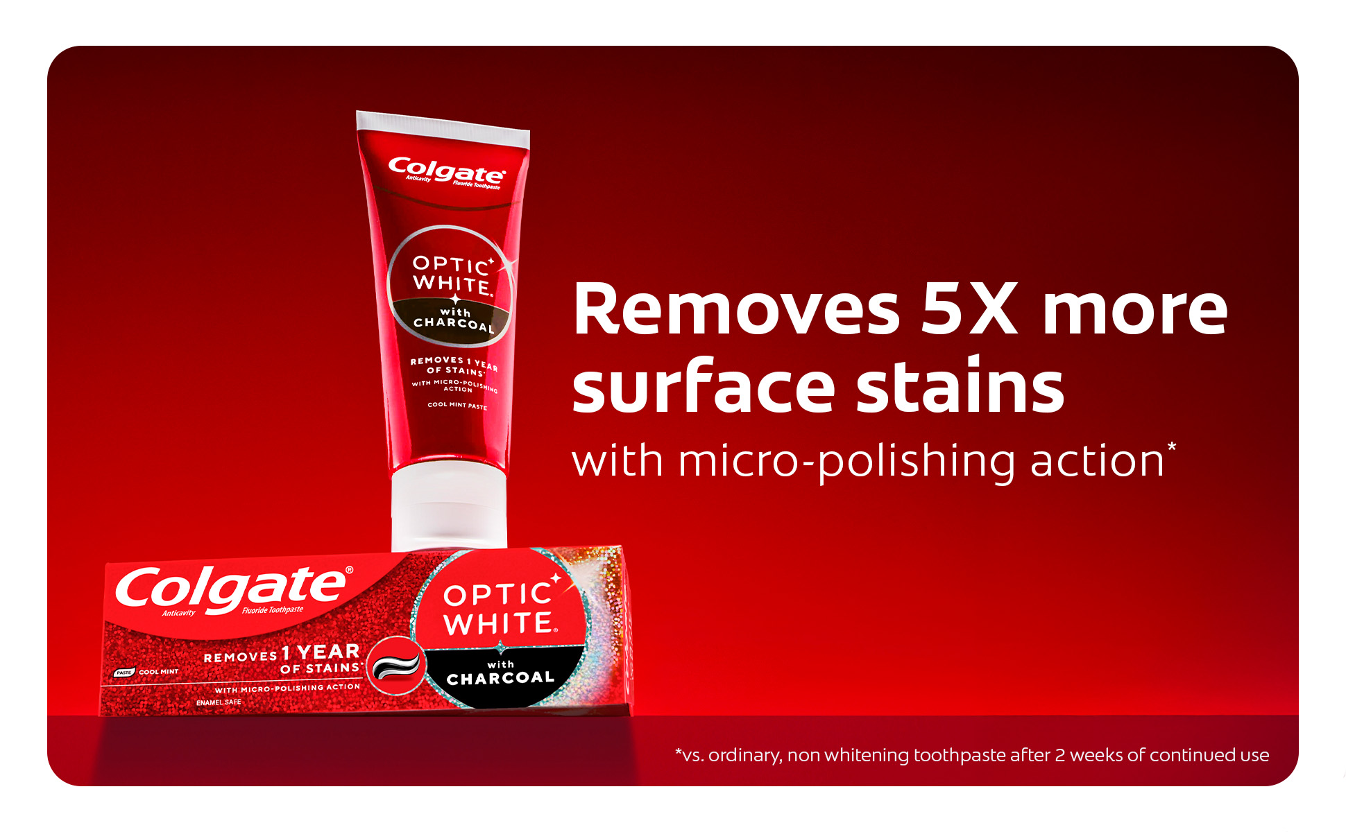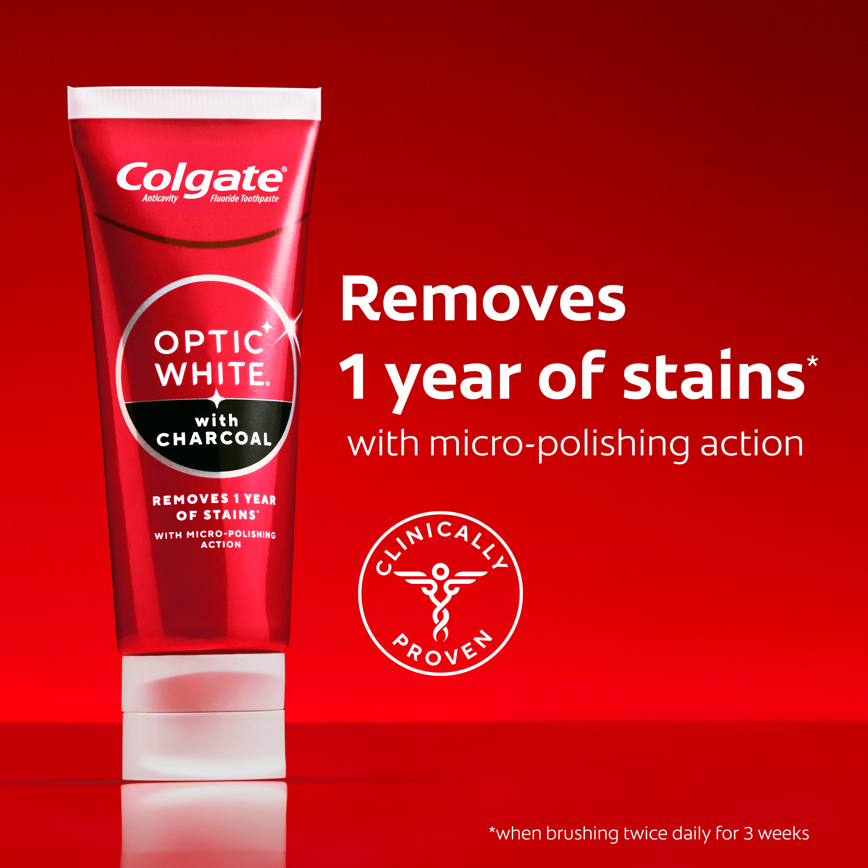 SKU 61057846 Consumer Unit - GTIN 00827854031079 Case - GTIN 10827854031076 Product Category Oral Care Product Sub Category Toothpaste Product Equity (Brand) Colgate Product Sub Brand Colgate Optic White TP Product Title Colgate Optic White with Charcoal Teeth Whitening Toothpaste, Anticavity Toothpaste with Fluoride, Cool Mint Flavor, 3.8 OZ Product Description Colgate Optic White with Charcoal Toothpaste removes 1 year of stains* while freshening breath with its cool mint flavor. With effective micropolishers, this teeth whitening toothpaste safely removes surface stains. Enamel safe for daily use, Optic White with Charcoal delivers a refreshing experience with a sweet peppermint flavor. Optic White with Charcoal removes 5X more surface stains with micro-polishing action** for a brighter smile. Micro-Polishing Action: Safely Removes Surface StainsColgate Optic White with Charcoal uses micropolishers to brush away surface stains and help prevent new ones from forming. This black toothpaste with black and white stripes is designed to remove 1 year of stains*.Enamel Safe ToothpasteOptic White with Charcoal is a patented whitening formula that is enamel safe for everyday use and an effective anticavity toothpaste with fluoride.Cool Mint ToothpasteOur sweet peppermint toothpaste freshens breath with a cool mint flavor that lasts from the first taste to the finish.*when brushing twice daily for 3 weeks**vs. ordinary, non-whitening toothpaste after 2 weeks of continued use eCommerce Copy- Long Description Help remove everyday surface stains with the Colgate Optic White Whitening Toothpaste with Charcoal. This whitening toothpaste pack removes 95% of daily surface stains* for a brighter smile. Get ready to reveal a smile that’s ready to shine with the Colgate Optic White Whitening Toothpaste with Charcoal. The Colgate Optic White Whitening Toothpaste with Charcoal uses a patented whitening formula to remove 95% of daily surface stains*. Using micro-polishing actions, this whitening stain removal toothpaste removes 5X more surface stains.** Plus, this toothpaste comes in a refreshing Cool Mint toothpaste flavor so you can enjoy minty freshness every time you brush. Colgate Optic White Toothpaste with Charcoal is a sugar free and vegan toothpaste that is enamel-safe for daily use. This teeth whitening toothpaste is also an anticavity fluoride toothpaste to help prevent cavities. For whitening that works, choose the Colgate Optic White Whitening with Charcoal Toothpaste Pack. *after 2 weeks of twice daily use **vs. ordinary, non whitening toothpaste after 2 weeks of continued use Bullet 1 One 3.8 oz tube of Colgate Optic White with Charcoal Toothpaste Bullet 2 Removes 1 year of stains* (*when brushing twice daily for three weeks) Bullet 3 Safely removes 5X more surface stains with micro-polishing action* (*vs. ordinary, non-whitening toothpaste after 2 weeks of continued use) Bullet 4 Cool Mint flavor with sweet peppermint and anise for a refreshing taste Bullet 5 Enamel safe for daily use Bullet 6 Optic White with Charcoal is a fluoride toothpaste that provides cavity protection Bullet 7 Optic White with Charcoal is a vegan toothpaste Amazon RPC B0G5VM1YYX AMZ URL https://www.amazon.com/dp/B0G5VM1YYX