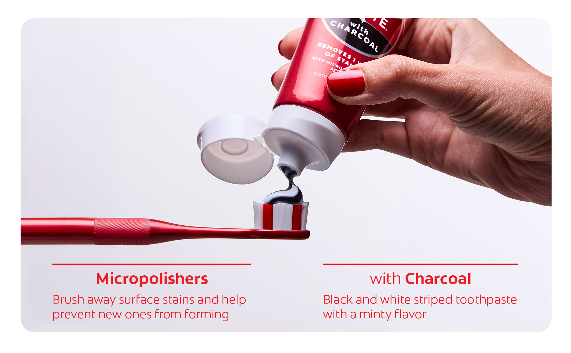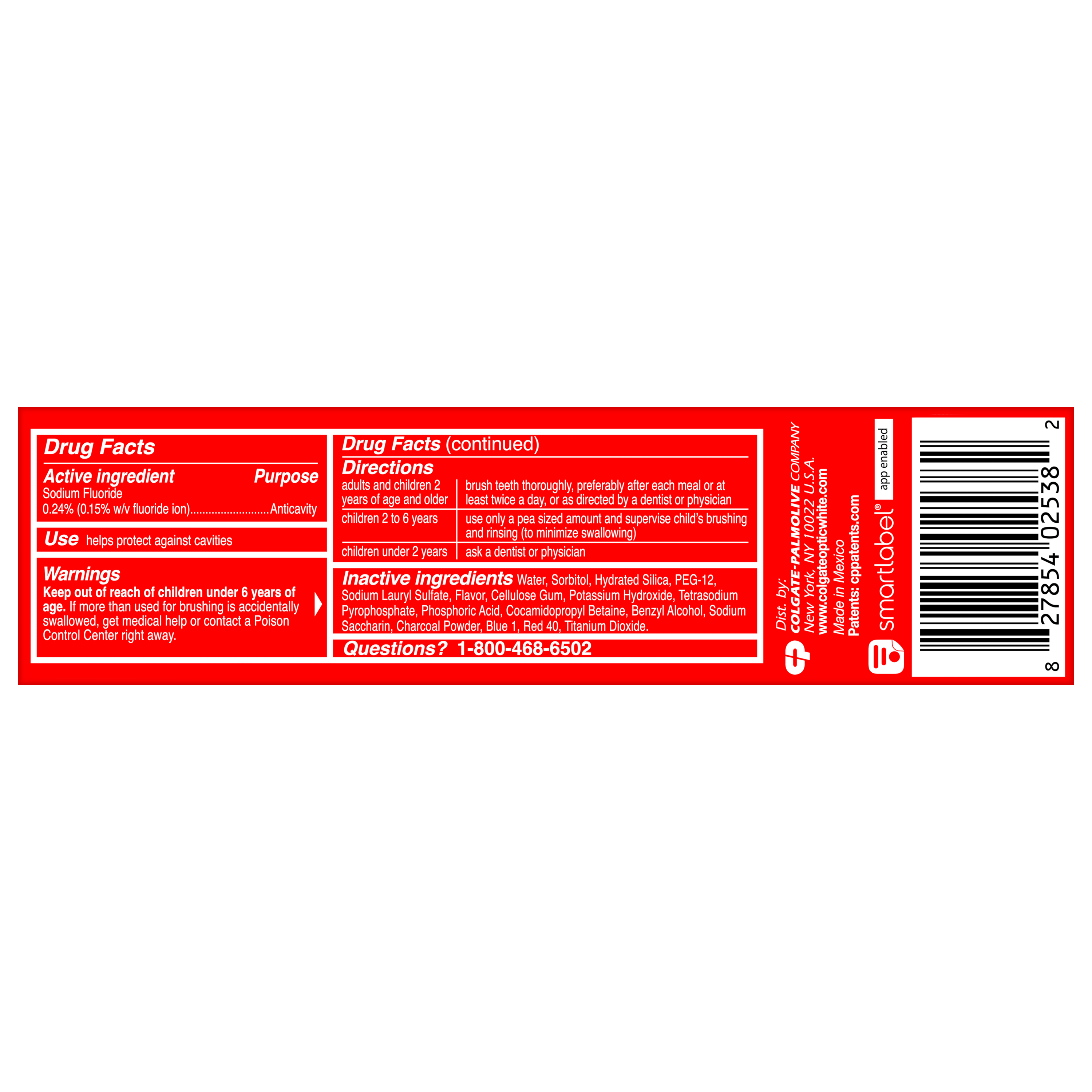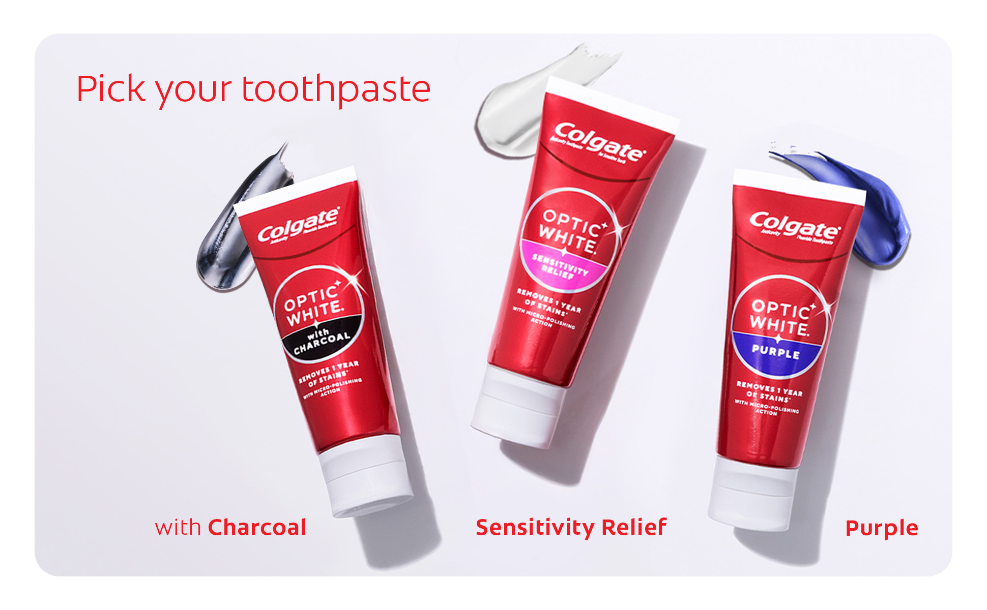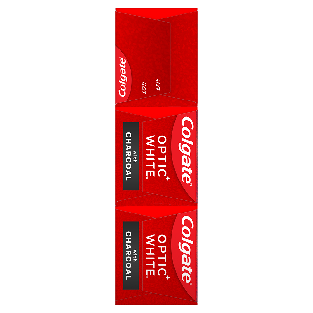 SKU 61057846 Consumer Unit - GTIN 00827854031079 Case - GTIN 10827854031076 Product Category Oral Care Product Sub Category Toothpaste Product Equity (Brand) Colgate Product Sub Brand Colgate Optic White TP Product Title Colgate Optic White with Charcoal Teeth Whitening Toothpaste, Anticavity Toothpaste with Fluoride, Cool Mint Flavor, 3.8 OZ Product Description Colgate Optic White with Charcoal Toothpaste removes 1 year of stains* while freshening breath with its cool mint flavor. With effective micropolishers, this teeth whitening toothpaste safely removes surface stains. Enamel safe for daily use, Optic White with Charcoal delivers a refreshing experience with a sweet peppermint flavor. Optic White with Charcoal removes 5X more surface stains with micro-polishing action** for a brighter smile. Micro-Polishing Action: Safely Removes Surface StainsColgate Optic White with Charcoal uses micropolishers to brush away surface stains and help prevent new ones from forming. This black toothpaste with black and white stripes is designed to remove 1 year of stains*.Enamel Safe ToothpasteOptic White with Charcoal is a patented whitening formula that is enamel safe for everyday use and an effective anticavity toothpaste with fluoride.Cool Mint ToothpasteOur sweet peppermint toothpaste freshens breath with a cool mint flavor that lasts from the first taste to the finish.*when brushing twice daily for 3 weeks**vs. ordinary, non-whitening toothpaste after 2 weeks of continued use eCommerce Copy- Long Description Help remove everyday surface stains with the Colgate Optic White Whitening Toothpaste with Charcoal. This whitening toothpaste pack removes 95% of daily surface stains* for a brighter smile. Get ready to reveal a smile that’s ready to shine with the Colgate Optic White Whitening Toothpaste with Charcoal. The Colgate Optic White Whitening Toothpaste with Charcoal uses a patented whitening formula to remove 95% of daily surface stains*. Using micro-polishing actions, this whitening stain removal toothpaste removes 5X more surface stains.** Plus, this toothpaste comes in a refreshing Cool Mint toothpaste flavor so you can enjoy minty freshness every time you brush. Colgate Optic White Toothpaste with Charcoal is a sugar free and vegan toothpaste that is enamel-safe for daily use. This teeth whitening toothpaste is also an anticavity fluoride toothpaste to help prevent cavities. For whitening that works, choose the Colgate Optic White Whitening with Charcoal Toothpaste Pack. *after 2 weeks of twice daily use **vs. ordinary, non whitening toothpaste after 2 weeks of continued use Bullet 1 One 3.8 oz tube of Colgate Optic White with Charcoal Toothpaste Bullet 2 Removes 1 year of stains* (*when brushing twice daily for three weeks) Bullet 3 Safely removes 5X more surface stains with micro-polishing action* (*vs. ordinary, non-whitening toothpaste after 2 weeks of continued use) Bullet 4 Cool Mint flavor with sweet peppermint and anise for a refreshing taste Bullet 5 Enamel safe for daily use Bullet 6 Optic White with Charcoal is a fluoride toothpaste that provides cavity protection Bullet 7 Optic White with Charcoal is a vegan toothpaste Amazon RPC B0G5VM1YYX AMZ URL https://www.amazon.com/dp/B0G5VM1YYX