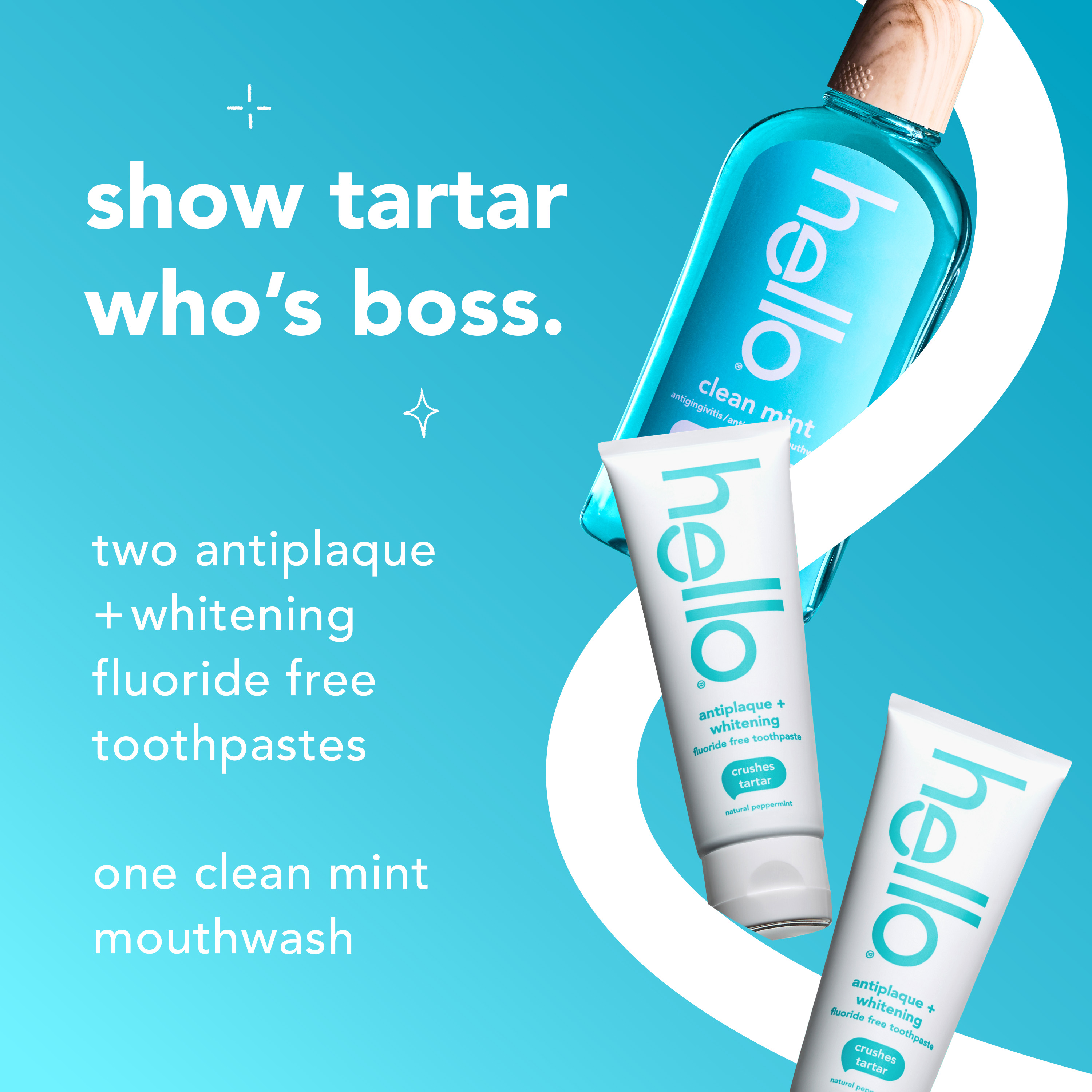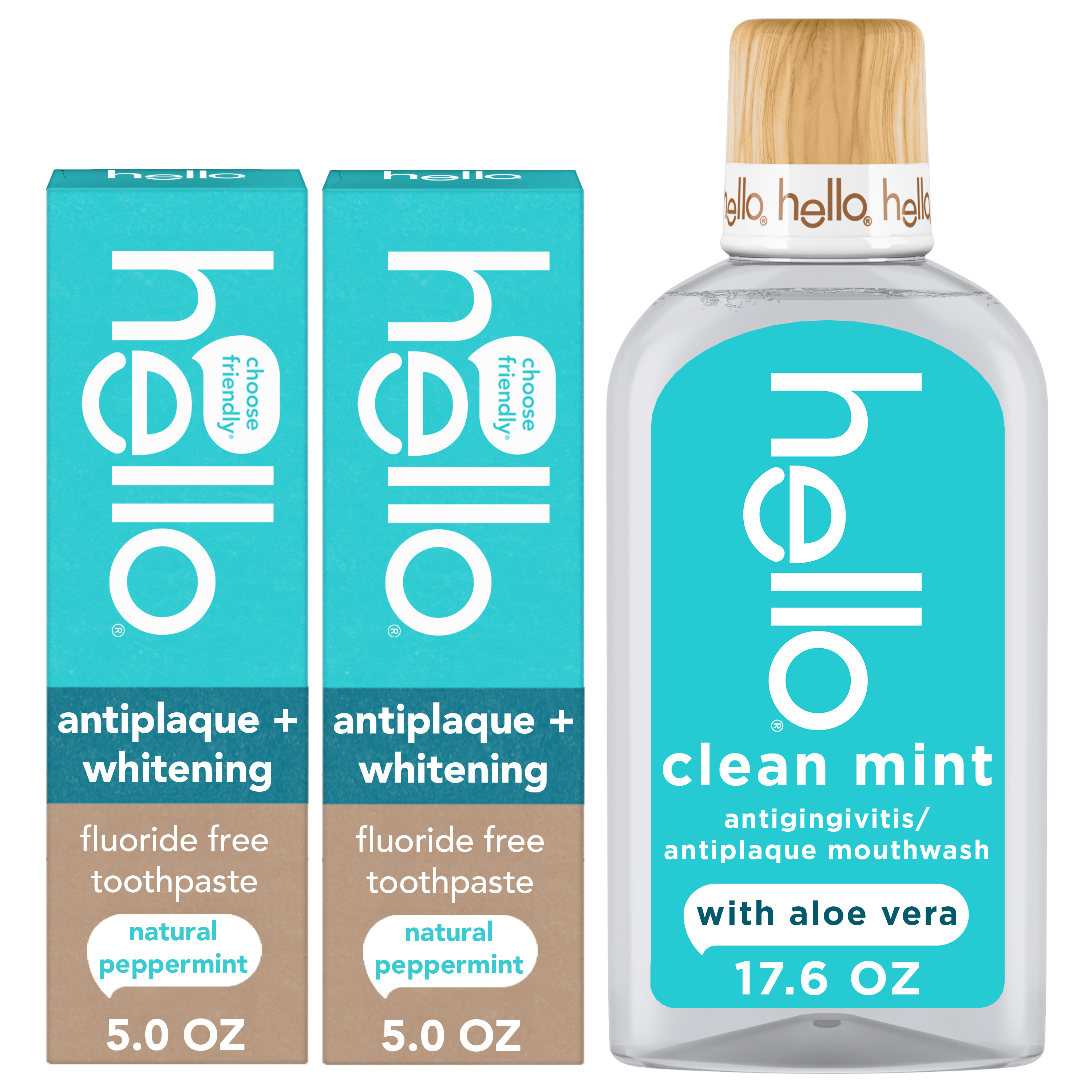 SKU 61057982 Consumer Unit - GTIN 00827854031222 Case - GTIN 10827854031229 Product Category Oral Care Product Sub Category Oral Care SUC Mixed Product Equity (Brand) hello Product Sub Brand Hello Oral Care SBR MXD Product Title hello Antiplaque Whitening Fluoride Free Toothpastes and Clean Mint Alcohol Free Mouthwash Bundle Pack, Whitening Toothpaste and Antigingivitis Gum Mouthwash Pack, No Alcohol for Zero Burning Product Description Say hello to an oral care combo designed to make the mundane moments magical. This bundle includes the hello Antiplaque Whitening Fluoride Free Toothpaste and Clean Mint Alcohol Free Mouthwash*. hello Clean Mint Mouthwash is a friendly fluoride free mouthwash that freshens like crazy and is specially formulated to promote healthy gums and moisturize. Thoughtfully crafted with refreshing farm grown mint, aloe vera, coconut oil, and zero alcohol, this no alcohol mouthwash offers a gentle, minty fresh zing without the sting. This oral care pack also includes two tubes of hello Antiplaque Whitening Fluoride Free Toothpaste. These fluoride free whitening toothpastes come in a fun peppermint toothpaste flavor and are thoughtfully formulated with high-quality ingredients like farm grown peppermint and coconut oil to help tame bad breath. hello Antiplaque Whitening Toothpaste can help brush away plaque so you can show tartar who’s boss, and it naturally whitens with mighty minerals by removing surface stains. Both the whitening toothpastes and the mint mouthwash are free from artificial flavors, sweeteners, SLS, dyes, and fluoride, and are not tested on animals. *this formula does not contain ethyl alcohol Bullet 1 WHAT’S IN THE BUNDLE: Two (2) 5.0 oz tubes of hello Antiplaque Whitening Fluoride Free Toothpaste (natural peppermint flavor) and one (1) 17.6 fl oz bottle of hello Clean Mint Fluoride Free and Alcohol Free Mouthwash* with Aloe Vera (natural mint flavor) Bullet 2 SEE YA STAINS, HELLO FRESHNESS: The fluoride free toothpaste naturally whitens with mighty minerals by removing surface stains; the mint mouthwash kicks bad breath straight to the curb with the help of natural mint and a touch of coconut oil and aloe vera Bullet 3 RINSE WITHOUT THE WINCE: Experience incredible minty freshness without feeling the burn using hello Clean Mint Alcohol Free* Aloe Vera Mouthwash Bullet 4 GOODBYE PLAQUE: The friendly fluoride free mouthwash works as an antigingivitis and antiplaque mouthwash and promotes healthy gums by fighting plaque and the whitening toothpaste pack can also help brush away plaque so you can show tartar who’s boss Bullet 5 NO-BRAINER: Both the no alcohol mouthwash* and whitening toothpastes are made with no artificial flavors, sweeteners, dyes, SLS, or fluoride and are not tested on animals Amazon RPC B0GBYLZHSF AMZ URL https://www.amazon.com/dp/B0GBYLZHSF