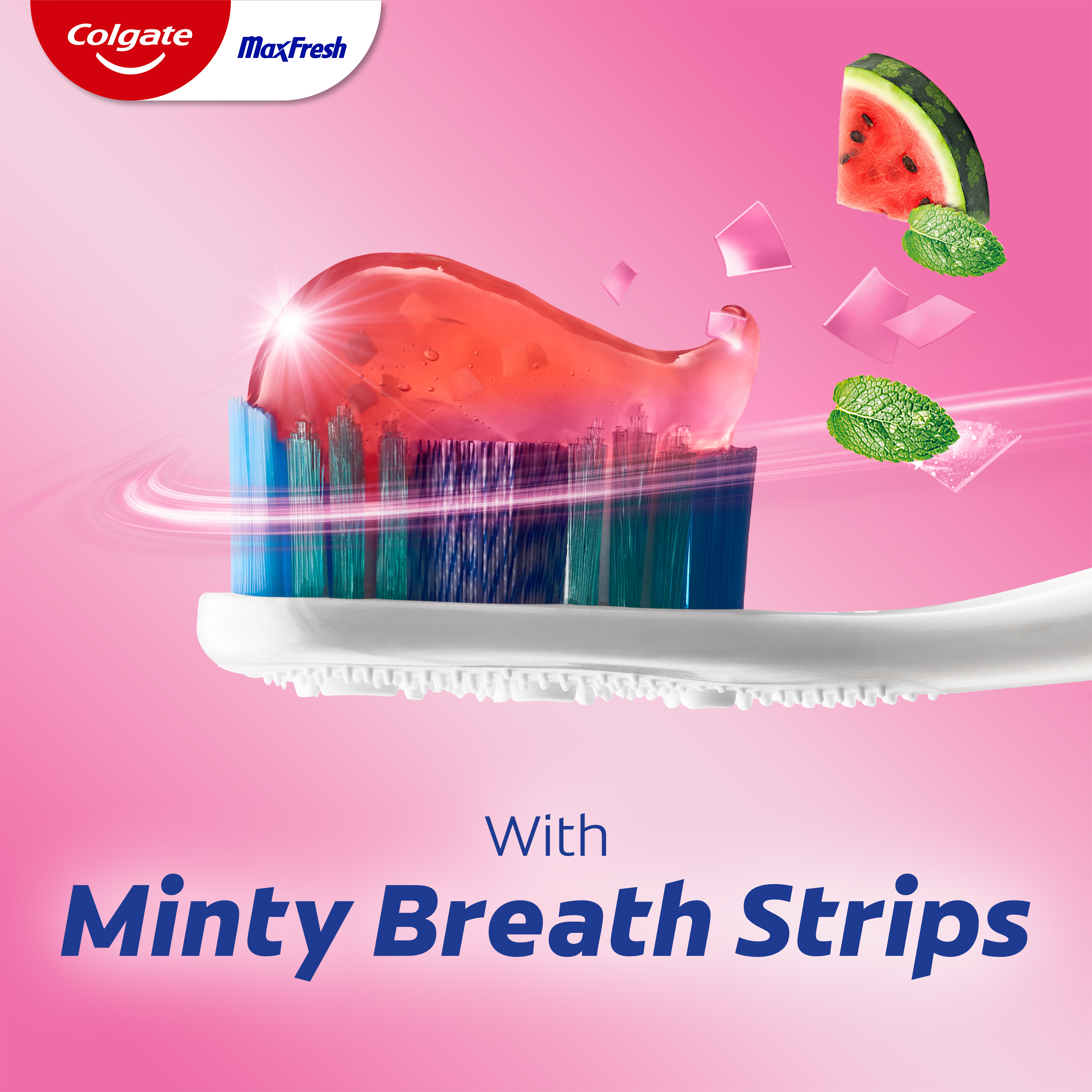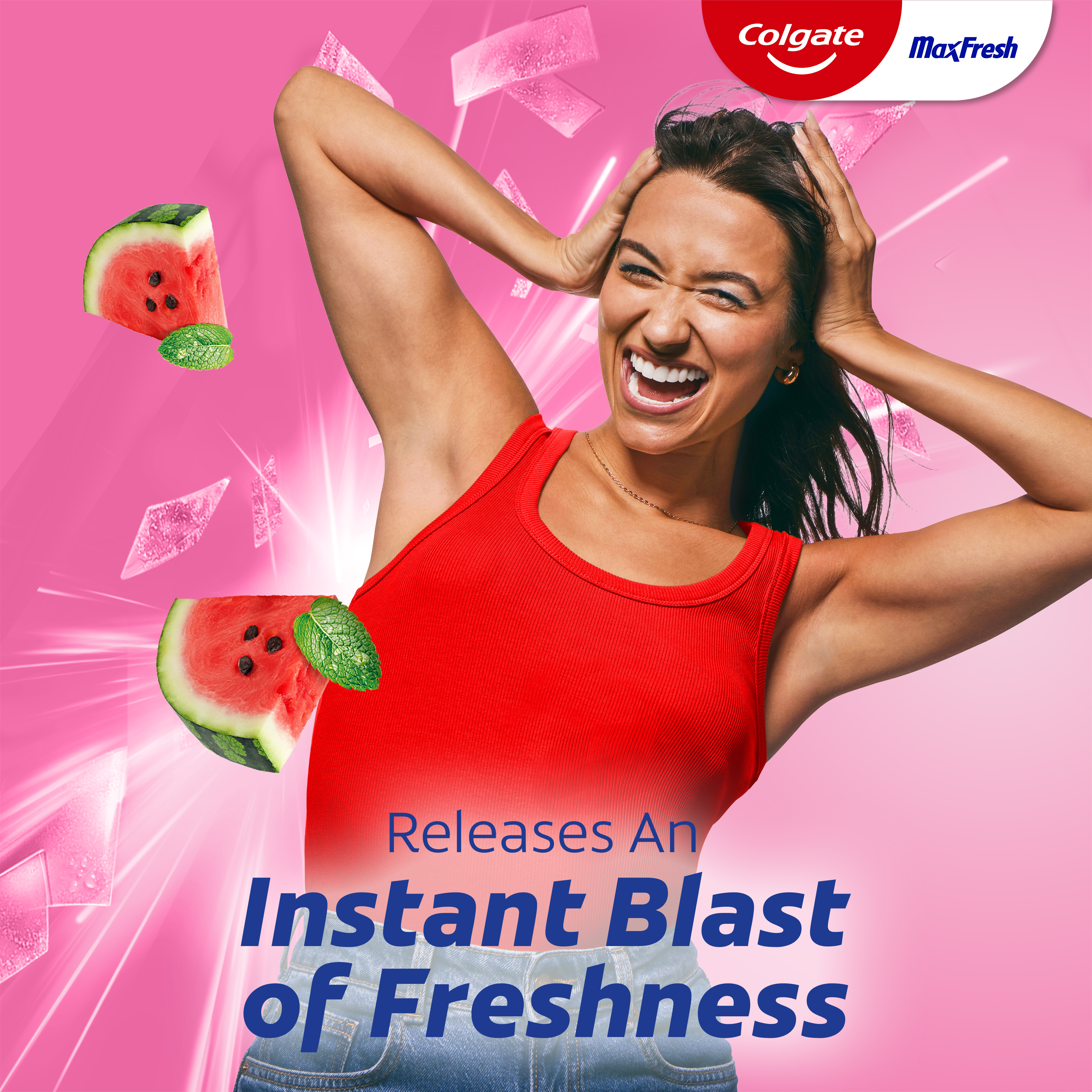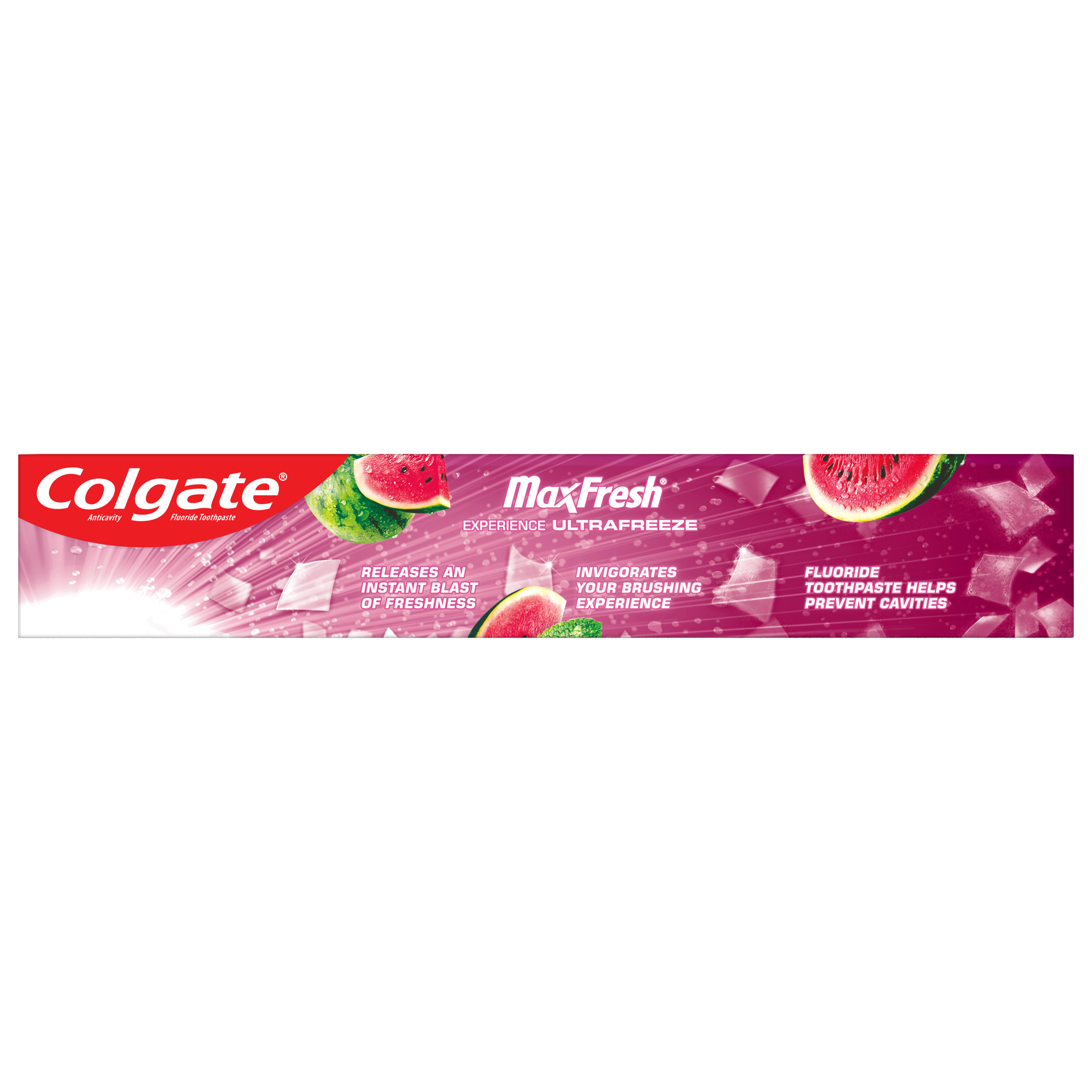 SKU 61058478 Consumer Unit - GTIN 00827854031383 Case - GTIN 10827854031380 Product Category Oral Care Product Sub Category Toothpaste Product Equity (Brand) Colgate Product Sub Brand Colgate Max Fresh TP Product Title Colgate Max Fresh Anticavity Travel Size Toothpaste, Watermelon Blast with Mint, 1.9 oz Product Description Release an instant blast of fruit-flavored freshness with Colgate Max Fresh Anticavity Fresh Breath Toothpaste in Watermelon Blast with Mint. This travel size toothpaste delivers a refreshing blend of tropical fruit and mint flavor every time you brush during your travels. Infuse your brushing routine with delicious juicy watermelon flavor and minty freshness with Colgate Max Fresh Toothpaste. Powered by Ultrafreeze, this mint toothpaste provides delicious fruit flavor and minty cool breath. This fruit-flavored watermelon toothpaste is formulated with hundreds of mini breath strips and releases an instant blast of freshness every time you brush. Invigorate your brushing experience with this deliciously fruity and refreshingly minty tube of Colgate Max Fresh Toothpaste. Colgate Max Fresh Toothpaste is more than just an adult toothpaste for bad breath. It is also a fluoride toothpaste and helps prevent cavities. Packed with hundreds of mini breath strips, Colgate Max Fresh Watermelon Blast Toothpaste offers delicious fruit flavor and a refreshing cool. Get long-lasting fresh breath with Colgate Max Fresh Toothpaste. eCommerce Copy- Long Description Release an instant blast of fruit-flavored freshness with Colgate Max Fresh Anticavity Fluoride Toothpaste in Watermelon Blast with Mint. This fresh breath toothpaste delivers a refreshing blend of fruit and mint flavor every time you brush. Enjoy the vibrant fruity flavor of juicy watermelon and infuse your brushing routine with delicious fruit flavor and minty freshness with this anticavity toothpaste. Invigorate your brushing experience with this deliciously fruity and refreshingly minty tube of Colgate Max Fresh Toothpaste. Powered by Ultrafreeze, this cooling mint toothpaste offers a refreshingly cool taste that leaves your breath feeling minty fresh. The fruit-flavored watermelon toothpaste is formulated with hundreds of mini breath strips and releases an instant blast of freshness every time you brush. Colgate Max Fresh cavity protection toothpaste is an adult toothpaste for bad breath. It is a fluoride toothpaste that helps prevent cavities and is packed with hundreds of mini breath strips. Colgate Max Fresh Watermelon Blast Toothpaste offers delicious fruit flavor and a refreshing cool. The fluoride-based gluten free toothpaste formula helps fight cavities. Get long-lasting fresh breath with Colgate Max Fresh Toothpaste. Bullet 1 Includes one (1) 1.9 oz tube of Colgate Max Fresh Anticavity Fresh Breath Toothpaste, Travel Size Toothpaste for Adults in Watermelon Blast with Mint Bullet 2 This travel size fresh breath toothpaste delivers a refreshing blend of juicy watermelon flavor with a hint of mint Bullet 3 Powered by Ultrafreeze, Colgate Max Fresh Toothpaste offers a refreshingly cool taste that leaves your breath feeling minty fresh Bullet 4 More than just an adult toothpaste for bad breath, Colgate Max Fresh Toothpaste uses a fluoride-based formula to fight cavities Bullet 5 This fruity flavored mint toothpaste, with hundreds of mini breath strips, releases an instant blast of freshness every time you brush Bullet 6 Experience a fruity explosion of minty and fruity freshness when you brush with Colgate Max Fresh Watermelon Blast Adult Toothpaste Bullet 7 Refresh your daily oral care routine and get long-lasting fresh breath with Colgate Max Fresh Toothpaste Active Ingredients Sodium Fluoride 0.24% (0.14% w/v fluoride ion)