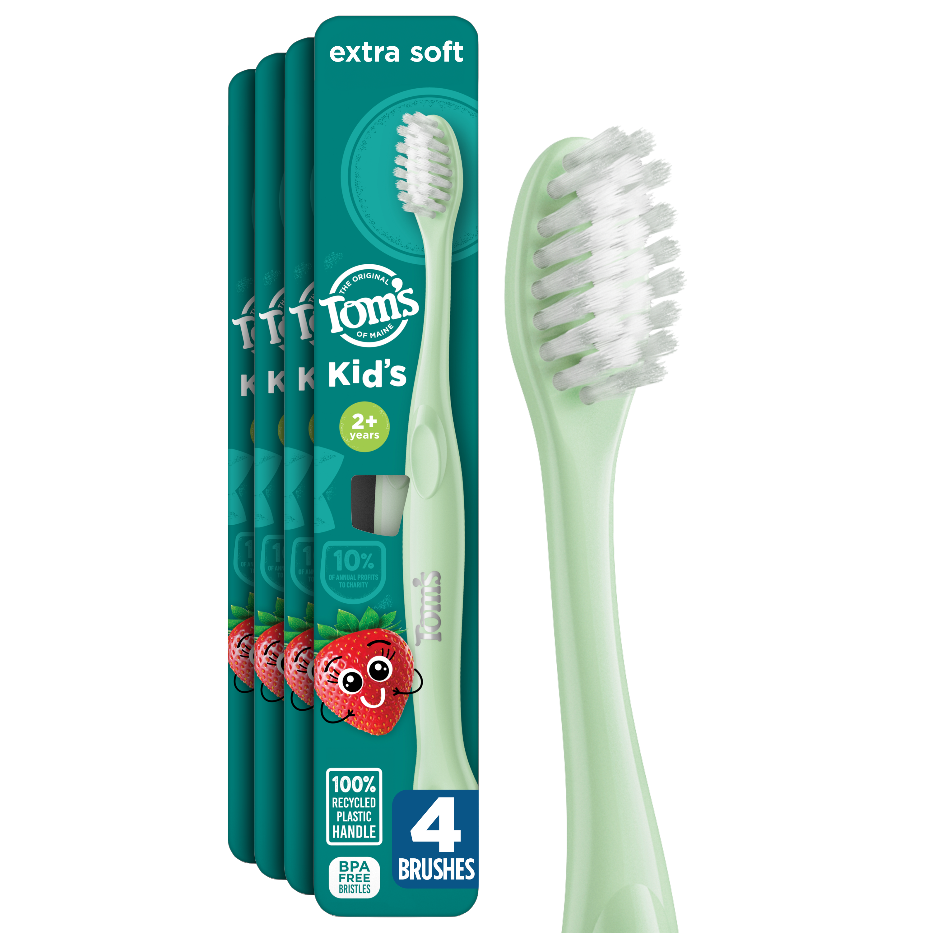 SKU 61060194 Consumer Unit - GTIN 00827854032564 Case - GTIN 10827854032561 Product Category Oral Care Product Sub Category Manual TB Product Equity (Brand) Tom's of Maine Product Sub Brand Tom's Kids Man TB Product Title Tom's of Maine Extra Soft Kids Toothbrush, 4 Count Product Description Make brushing fun for kids with the Tom’s of Maine Extra Soft Kids Toothbrush. Designed for both children and toddlers ages 2 and up, this playful green kids toothbrush features extra soft toothbrush bristles that offer a gentle yet thorough clean when brushing both baby and adult teeth. The extra soft toothbrush is thoughtfully crafted with BPA-free and dye-free bristles and the handle is colored with food-grade mineral-based pigments. In addition, the kids toothbrush handle is also made from 100% recycled plastic—over 95% recovered from PET bottles—and features a convenient built-in thumb rest for easy control and maneuverability while brushing teeth. This extra soft kids toothbrush uses multi-height bristles to help clean big and small teeth, ensuring a thorough clean. Whether your child is just starting to brush or learning to take care of their own oral hygiene, this Tom’s of Maine kids toothbrush delivers comfort and care every step of the way. Bullet 1 Includes four (4) Tom’s of Maine Extra Soft Kids Toothbrushes, BPA-Free Extra Soft Bristle Toothbrush for Kids, Green Bullet 2 The extra soft, BPA-free and dye-free toothbrush bristles provide an effective clean for both baby and adult teeth Bullet 3 This extra soft toddler toothbrush cleans both baby teeth and adult teeth using extra soft, multi-height bristles Bullet 4 This kids toothbrush is specially crafted for children ages 2 and up and features a built-in thumb rest for easy handling for little hands Bullet 5 The Tom's of Maine kids toothbrush is made from 100% recycled plastic—over 95% recovered from PET bottles Bullet 6 This small toothbrush for kids is thoughtfully designed for toddlers just starting out and kids learning to brush on their own Bullet 7 Encourage good oral care habits early on and make teeth brushing fun for kids with the Tom’s of Maine Extra Soft Kids Toothbrush
