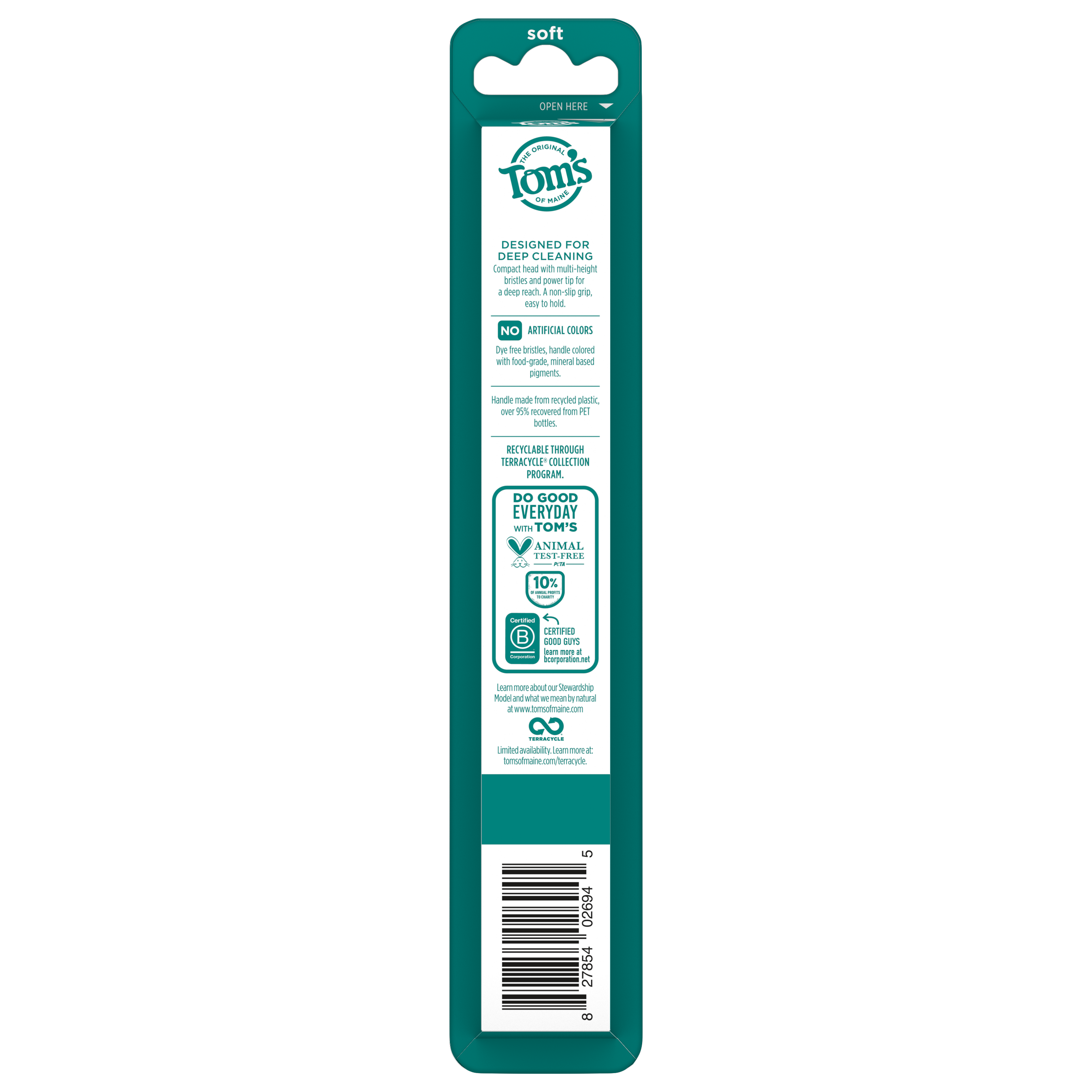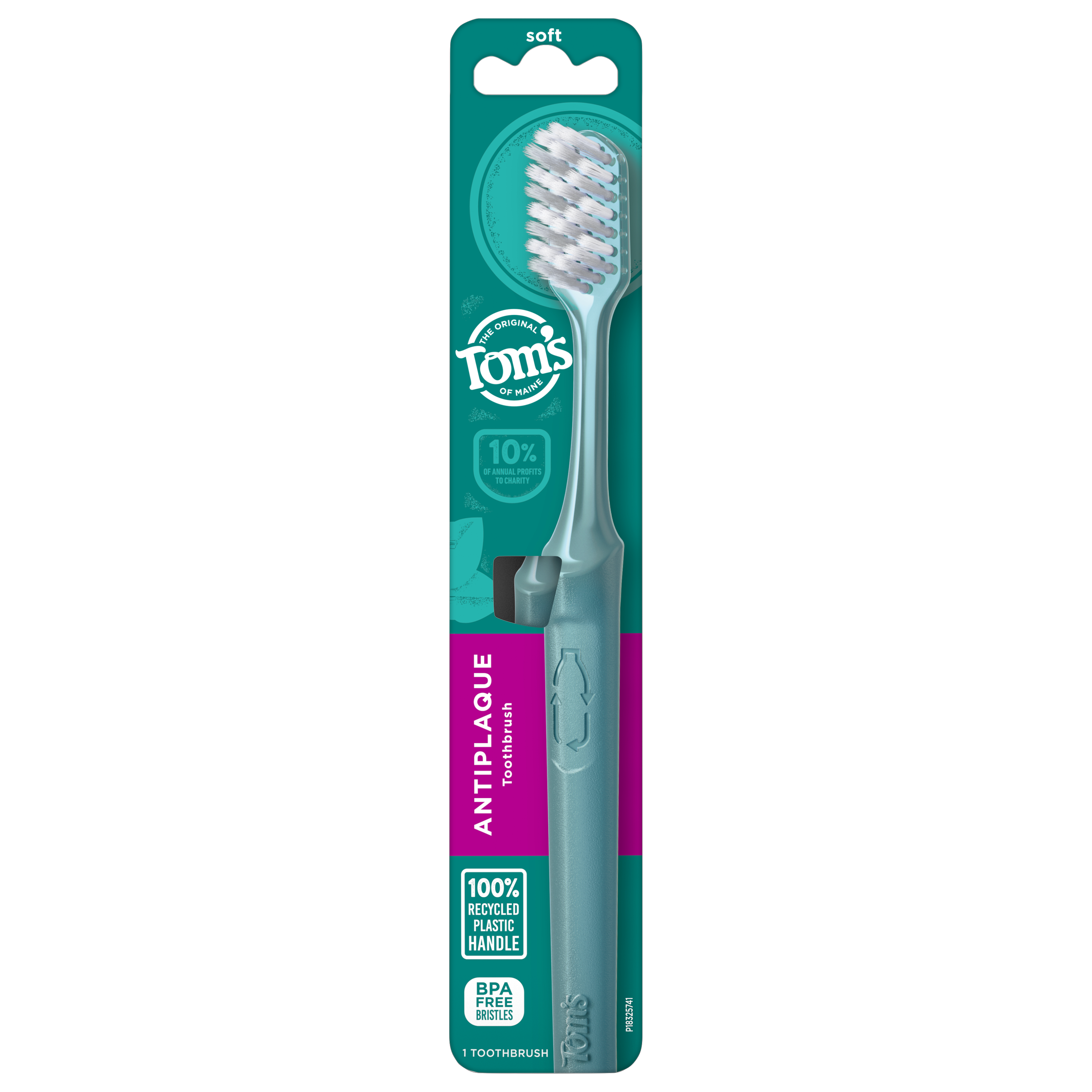 SKU 61060420 Consumer Unit - GTIN 00827854032687 Case - GTIN 10827854032684 Product Category Oral Care Product Sub Category Manual TB Product Equity (Brand) Tom's of Maine Product Sub Brand Tom's Man TB Product Title Tom’s of Maine Antiplaque Adult Soft Toothbrush, 4 Count Product Description Experience a deep clean you can feel good about with the Tom’s of Maine Antiplaque Adult Soft Toothbrush. Thoughtfully crafted with multi-height, plant-based BPA free bristles, this soft bristle toothbrush for adults is designed for deep cleaning. This adult toothbrush features a raised power tip and compact head for better reach* on those tricky spots for a complete brushing experience. Plus, this soft toothbrush features a handle made from 100% recycled plastic—over 95% recovered from PET bottles—so you can care for your smile and feel good about your soft adult toothbrush at the same time. The recycled handle also features a non-slip grip that’s easy to hold. The Tom’s of Maine Antiplaque Adult Soft Toothbrush is ideal for anyone looking for a soft bristle toothbrush that is designed to provide a deep clean. *vs. an ordinary toothbrush eCommerce Copy- Long Description Experience a deep clean you can feel good about with the Tom’s of Maine Antiplaque Adult Soft Toothbrush. Thoughtfully crafted with multi-height, plant-based BPA free bristles, this soft bristle toothbrush for adults is designed for deep cleaning. This adult toothbrush features a raised power tip and compact head for better reach* on those tricky spots for a complete brushing experience. Plus, this soft toothbrush features a handle made from 100% recycled plastic—over 95% recovered from PET bottles—so you can care for your smile and feel good about your soft adult toothbrush at the same time. The recycled handle also features a non-slip grip that’s easy to hold. The Tom’s of Maine Antiplaque Adult Soft Toothbrush is ideal for anyone looking for a soft bristle toothbrush that is designed to provide a deep clean. *vs. an ordinary toothbrush Bullet 1 Includes four (4) Tom’s of Maine Antiplaque Adult Soft Toothbrushes, Soft Bristle Toothbrush for Adults Bullet 2 This adult toothbrush is crafted with soft, plant-based bristles designed to provide a thorough clean Bullet 3 To help with a deep clean, the soft bristle toothbrush features a raised power tip and compact head for better reach* Bullet 4 This Tom’s of Maine toothbrush uses a non-slip grip on the toothbrush handle to make it easy to hold and maneuver when brushing Bullet 5 This soft toothbrush is made from 100% recycled plastic, with over 95% recovered from PET bottles, for a brushing experience you can feel good about Bullet 6 Tom’s of Maine Antiplaque Adult Soft Toothbrush is ideal for anyone who needs a soft bristled toothbrush that delivers an effective deep clean