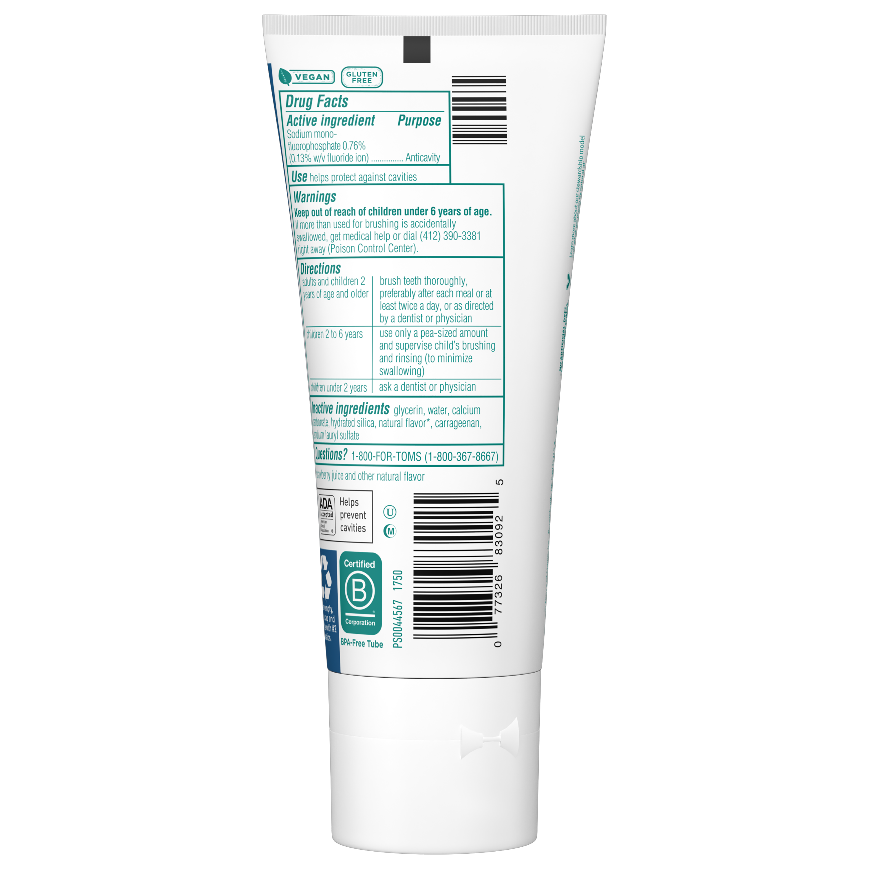 SKU 683092 Consumer Unit - GTIN 00077326830925 Case - GTIN 10077326830922 Product Category Oral Care Product Sub Category Toothpaste Product Equity (Brand) Tom's of Maine Product Sub Brand Tom's Kids TP Product Title Tom's of Maine Kids Toothpaste, Natural Toothpaste, Kids Toothpaste, Silly Strawberry, 4.2 Ounce, 3-Pack eCommerce Copy- Long Description Silly Enough for Kids - Good Enough for Moms and Dads! Our Toothpaste for Children uses calcium and silica to gently clean, and the delicious real fruit flavor appeals to your child's taste - not artificial sparkles and bubble gum flavors. Bullet 1 FIGHTS CAVITIES: Tom's of Maine Natural Children's Anticavity Toothpaste fights cavities while gently cleaning teeth. Bullet 2 TASTE THEY LOVE: Toms toothpaste uses real fruit flavor that your kids will love - not artificial sparkles and bubble gum flavoring. Bullet 3 ADA APPROVED: Toms natural toothpaste is ADA approved so parents trust their kids teeth are getting only the best. Bullet 4 CERTIFIED B CORP: Tom's of Maine meets the highest standards of verified social and environmental performance, public transparency, and legal accountability to balance profit and purpose. Active Ingredients Sodium Monofluorophosphate 0.76% (0.13% w/v fluoride ion) Walmart RPC 16680121 Walmart URL (Computed) https://www.walmart.com/ip/a/16680121