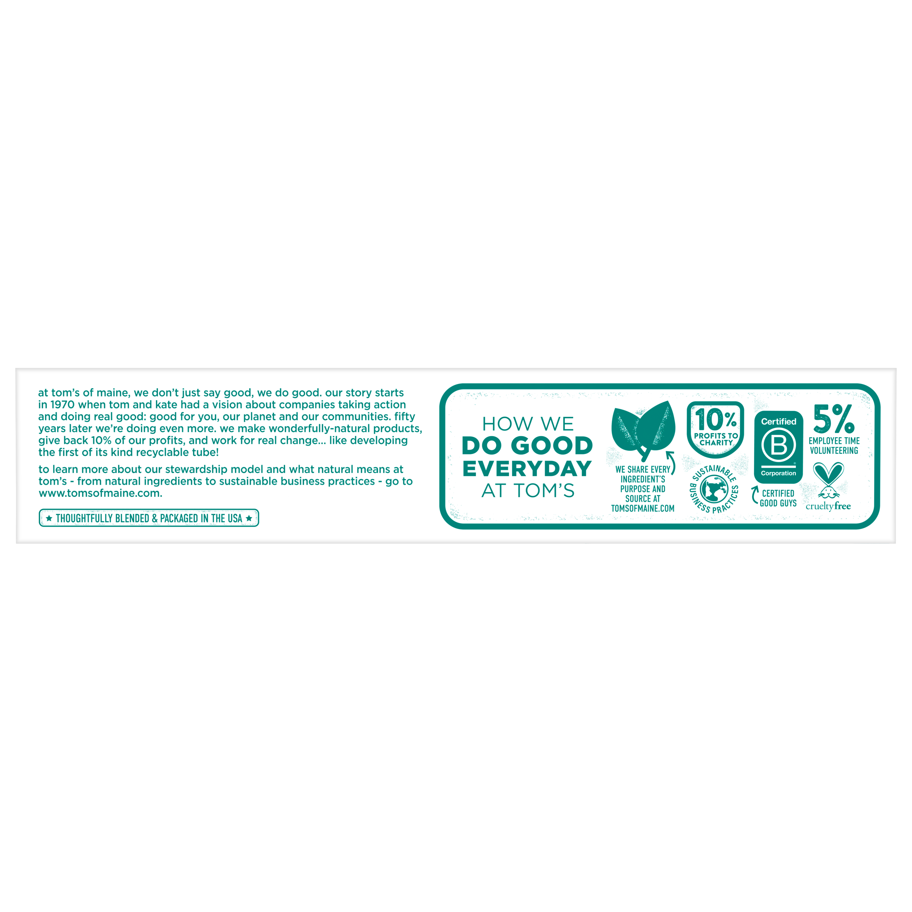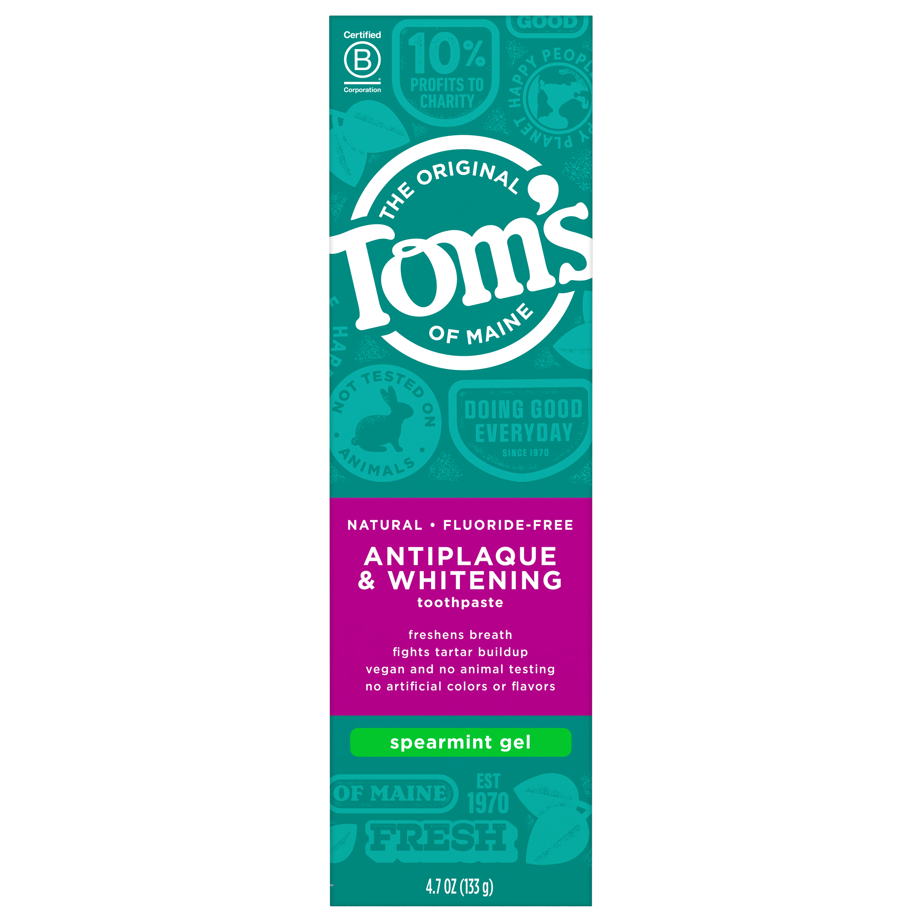 SKU 683108 Consumer Unit - GTIN 00077326831083 Case - GTIN 10077326831080 Product Category Oral Care Product Sub Category Toothpaste Product Equity (Brand) Tom's of Maine Product Sub Brand Tom's AP & Whitening TP Product Title Tom's of Maine Fluoride-Free Antiplaque & Whitening Natural Toothpaste, Spearmint, 4.7 oz. Product Description Get squeaky clean teeth with Tom's of Maine Fluoride-Free Antiplaque & Whitening Toothpaste. This fluoride-free toothpaste uses naturally derived ingredients to help prevent tartar buildup and remove surface stains. The result? A brighter, whiter smile. Plus, the natural flavor of Spearmint will make you look forward to brushing. Now that's fresh. Check to be sure that your tube has the blue recycling flag on it, squeeze out as much of the toothpaste from the tube as you can, replace the cap, and place the tube in your recycling bin. Order Tom's of Maine toothpaste and discover our range of natural dental care products. At Tom's of Maine, we want to empower families to live more naturally. With more than 5 years experience combining scientific know-how, naturally derived ingredients and a bit of ingenuity, we make products that are good for you and the planet. As a Certified B Corp, we hold ourselves to the highest social and environmental standards. Plus, we're committed to supporting local communities for meaningful change, donating 1% of our profits to charities supporting health, education and the environment. We call this "doing good, for real," and it impacts everything we do. eCommerce Copy- Long Description Get squeaky clean teeth with Tom's of Maine Fluoride-Free Antiplaque & Whitening Toothpaste. This fluoride-free toothpaste uses naturally derived ingredients to help prevent tartar buildup and remove surface stains. The result? A brighter, whiter smile. Plus, the natural flavor of Spearmint will make you look forward to brushing. Now that's fresh. Check to be sure that your tube has the blue recycling flag on it, squeeze out as much of the toothpaste from the tube as you can, replace the cap, and place the tube in your recycling bin. Order Tom's of Maine toothpaste and discover our range of natural dental care products. At Tom's of Maine, we want to empower families to live more naturally. With more than 50 years experience combining scientific know-how, naturally derived ingredients and a bit of ingenuity, we make products that are good for you and the planet. As a Certified B Corp, we hold ourselves to the highest social and environmental standards. Plus, we're committed to supporting local communities for meaningful change, donating 10% of our profits to charities supporting health, education and the environment. We call this "doing good, for real," and it impacts everything we do. Bullet 1 WHAT YOU'LL GET: One 4.7-ounce tube of Tom's of Maine Natural Fluoride-Free Antiplaque & Whitening Toothpaste in Spearmint Flavor Bullet 2 FLUORIDE-FREE TOOTHPASTE: Helps fight tartar buildup with antiplaque formula Bullet 3 WHITEN TEETH: Natural toothpaste helps remove surface stains for a brighter, whiter smile Bullet 4 DO MORE GOOD: Look for the blue recycling flag on your tube, squeeze out as much of the toothpaste from the tube as you can, replace the cap, and recycle Bullet 5 TAKE CARE OF YOURSELF NATURALLY: Contains no artificial sweeteners, preservatives, colors or flavors and is not tested on animals