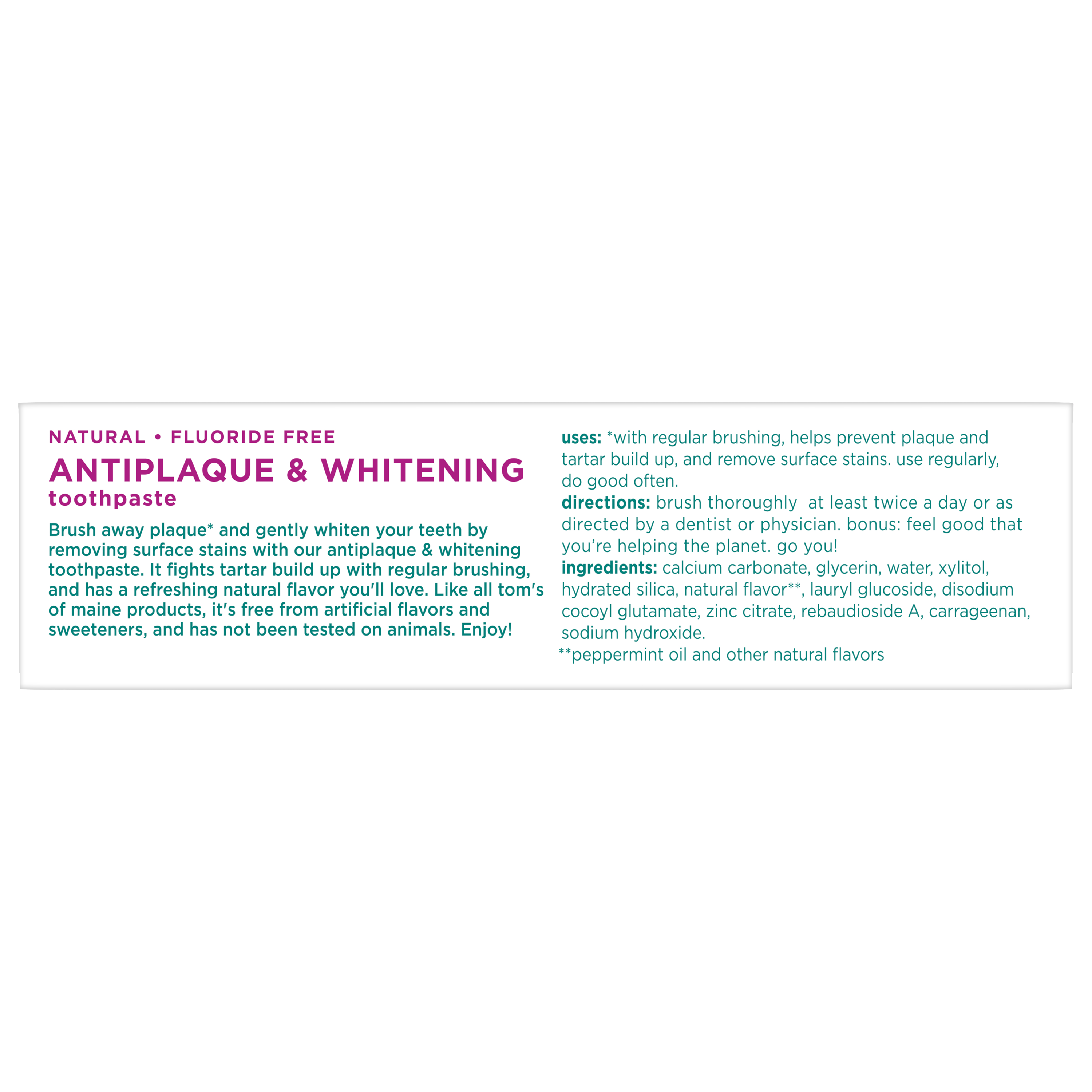 SKU 683186 Consumer Unit - GTIN 00077326159019 Case - GTIN 00077326831861 Product Category Oral Care Product Sub Category Toothpaste Product Equity (Brand) Tom's of Maine Product Sub Brand Tom's AP & Whitening TP Product Title Toms of Maine Fluoride-Free Antiplaque & Whitening Natural Toothpaste, Peppermint, Travel Size, 1 oz. Product Description Get squeaky clean teeth on the go with Tom's of Maine Fluoride-Free Antiplaque & Whitening Travel Size Toothpaste. This fluoride-free toothpaste uses naturally derived ingredients to help prevent tartar buildup and remove surface stains. The result? A brighter, whiter smile. Plus, the natural flavor of Peppermint will make you look forward to brushing. Now that's fresh. Check to be sure that your tube has the blue recycling flag on it, squeeze out as much of the toothpaste from the tube as you can, replace the cap, and place the tube in your recycling bin. Order Tom's of Maine toothpaste and discover our range of natural personal care products. At Tom's of Maine, we want to empower families to live more naturally. With more than 5 years experience combining scientific know-how, naturally derived ingredients and a bit of ingenuity, we make products that are good for you and the planet. As a Certified B Corp, we hold ourselves to the highest social and environmental standards. Plus, we're committed to supporting local communities for meaningful change, donating 1% of our profits to charities supporting health, education and the environment. We call this "doing good, for real," and it impacts everything we do. eCommerce Copy- Long Description Get squeaky clean teeth on the go with Tom's of Maine Fluoride-Free Antiplaque & Whitening Travel Size Toothpaste. This fluoride-free toothpaste uses naturally derived ingredients to help prevent tartar buildup and remove surface stains. The result? A brighter, whiter smile. Plus, the natural flavor of Peppermint will make you look forward to brushing. Now that's fresh. Check to be sure that your tube has the blue recycling flag on it, squeeze out as much of the toothpaste from the tube as you can, replace the cap, and place the tube in your recycling bin. Order Tom's of Maine toothpaste and discover our range of natural personal care products. At Tom's of Maine, we want to empower families to live more naturally. With more than 50 years experience combining scientific know-how, naturally derived ingredients and a bit of ingenuity, we make products that are good for you and the planet. As a Certified B Corp, we hold ourselves to the highest social and environmental standards. Plus, we're committed to supporting local communities for meaningful change, donating 10% of our profits to charities supporting health, education and the environment. We call this "doing good, for real," and it impacts everything we do. Bullet 1 WHAT YOU'LL GET: One 1-ounce tube of Tom's of Maine Fluoride-Free Antiplaque & Whitening Toothpaste in Peppermint Flavor Bullet 2 FLUORIDE-FREE TOOTHPASTE: Natural toothpaste helps fight tartar buildup with antiplaque formula Bullet 3 WHITEN TEETH: Travel-size toothpaste helps remove surface stains for a brighter smile Bullet 4 DO MORE GOOD: Look for the blue recycling flag on your tube, squeeze out as much of the toothpaste from the tube as you can, replace the cap, and recycle Bullet 5 TAKE CARE OF YOURSELF NATURALLY: Contains no artificial preservatives, colors or flavors and is not tested on animals Amazon RPC B000OZN29M AMZ URL https://www.amazon.com/dp/B000OZN29M Walmart RPC 36297243 Walmart URL (Computed) https://www.walmart.com/ip/a/36297243 Target RPC 86482720 Target URL https://www.target.com/p/a/-/A-86482720
