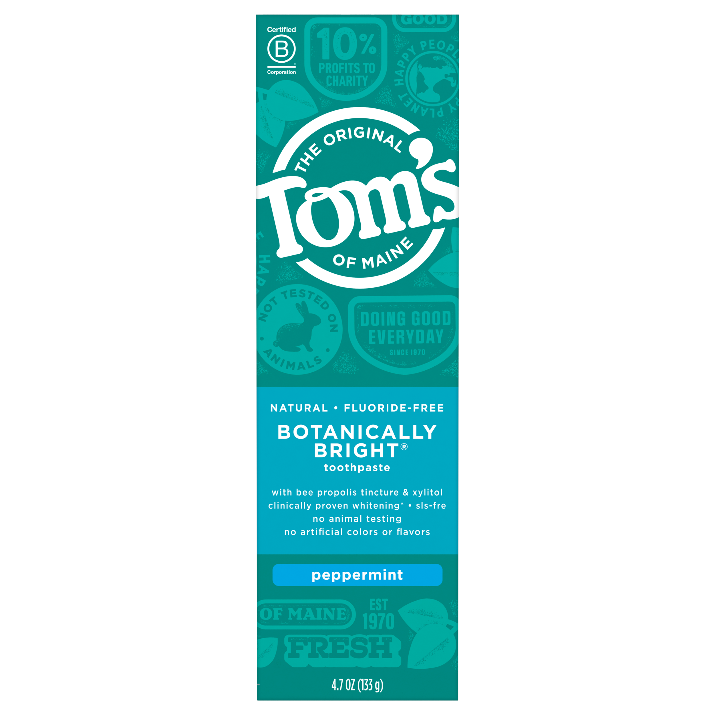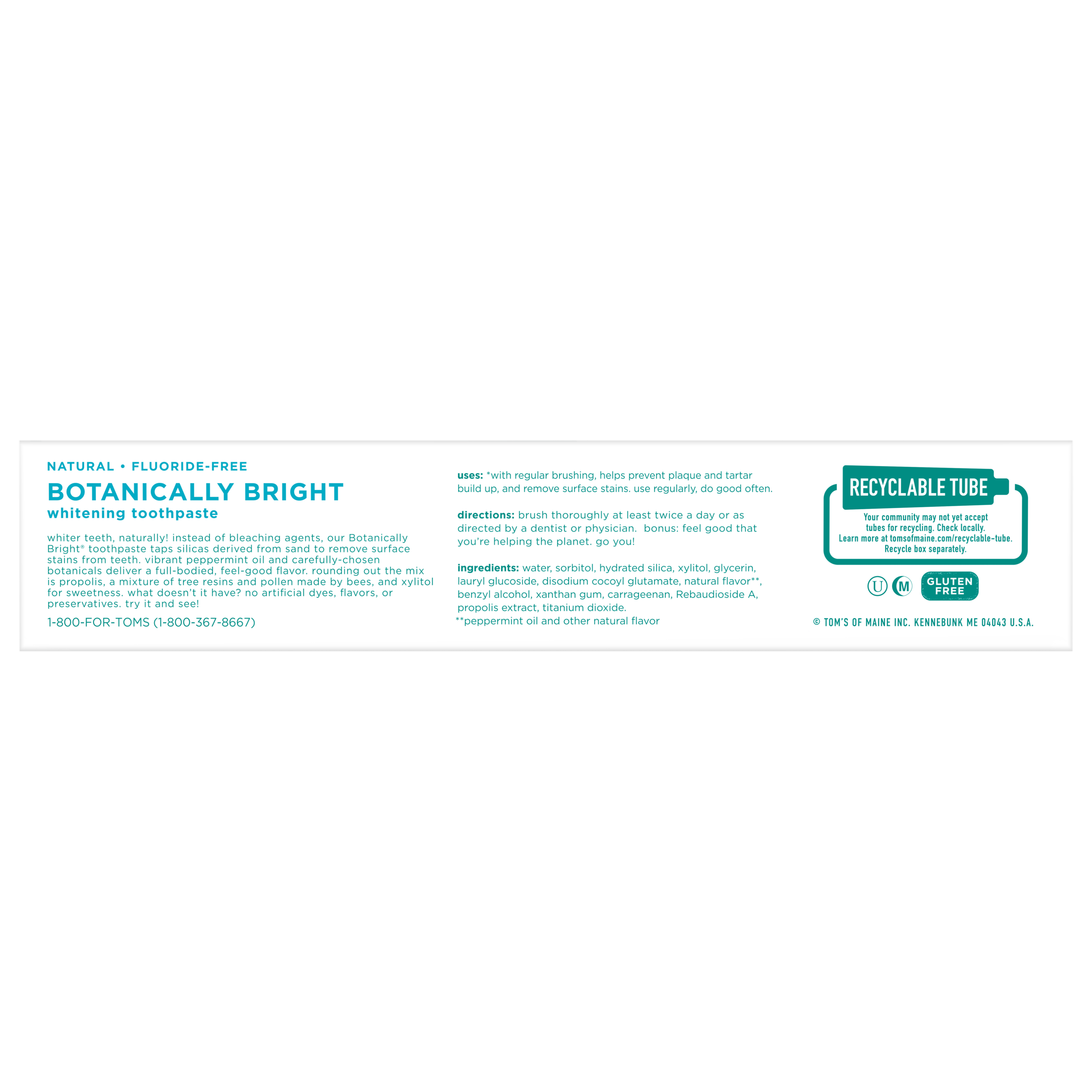 SKU 683213 Consumer Unit - GTIN 00077326832134 Case - GTIN 10077326832131 Product Category Oral Care Product Sub Category Toothpaste Product Equity (Brand) Tom's of Maine Product Sub Brand Tom's Botanical TP Product Title Tom's of Maine Natural Fluoride-Free SLS-Free Botanically Bright Toothpaste, Peppermint, 4.7 oz. Product Description Brighten your smile with the foamy, clean feeling of Tom's of Maine Fluoride-Free Botanically Bright Toothpaste. Finally, a SLS-free toothpaste that you love to use. Bee propolis tincture leaves your mouth feeling clean and healthy, while this fluoride-free formula helps remove surface stains for a whiter smile. Plus, enjoy the natural taste of Peppermint every time you brush. Check to be sure that your tube has the blue recycling flag on it, squeeze out as much of the toothpaste from the tube as you can, replace the cap, and place the tube in your recycling bin. Order Tom's of Maine toothpaste and discover our range of natural dental care products. At Tom's of Maine, we want to empower families to live more naturally. With more than 5 years experience combining scientific know-how, naturally derived ingredients and a bit of ingenuity, we make products that are good for you and the planet. As a Certified B Corp, we hold ourselves to the highest social and environmental standards. Plus, we're committed to supporting local communities for meaningful change, donating 1% of our profits to charities supporting health, education and the environment. We call this "doing good, for real," and it impacts everything we do. eCommerce Copy- Long Description Brighten your smile with the foamy, clean feeling of Tom's of Maine Fluoride-Free Botanically Bright Toothpaste. Finally, a SLS-free toothpaste that you love to use. Bee propolis tincture leaves your mouth feeling clean and healthy, while this fluoride-free formula helps remove surface stains for a whiter smile. Plus, enjoy the natural taste of Peppermint every time you brush. Check to be sure that your tube has the blue recycling flag on it, squeeze out as much of the toothpaste from the tube as you can, replace the cap, and place the tube in your recycling bin. Order Tom's of Maine toothpaste and discover our range of natural dental care products. At Tom's of Maine, we want to empower families to live more naturally. With more than 50 years experience combining scientific know-how, naturally derived ingredients and a bit of ingenuity, we make products that are good for you and the planet. As a Certified B Corp, we hold ourselves to the highest social and environmental standards. Plus, we're committed to supporting local communities for meaningful change, donating 10% of our profits to charities supporting health, education and the environment. We call this "doing good, for real," and it impacts everything we do. Bullet 1 WHAT YOU'LL GET: One 4.7-ounce tube of Tom's of Maine Botanically Bright Toothpaste in Peppermint Flavor Bullet 2 WHITER, BRIGHTER SMILE: Whitening toothpaste gently cleans and brightens by removing surface stains Bullet 3 SLS-FREE TOOTHPASTE: This natural toothpaste is SLS-free and fluoride-free for a confident smile Bullet 4 DO MORE GOOD: Look for the blue recycling flag on your tube, squeeze out as much of the toothpaste from the tube as you can, replace the cap, and recycle Bullet 5 TAKE CARE OF YOURSELF NATURALLY: Contains no artificial flavors, colors or preservatives and is not tested on animals CVS RPC 458434
