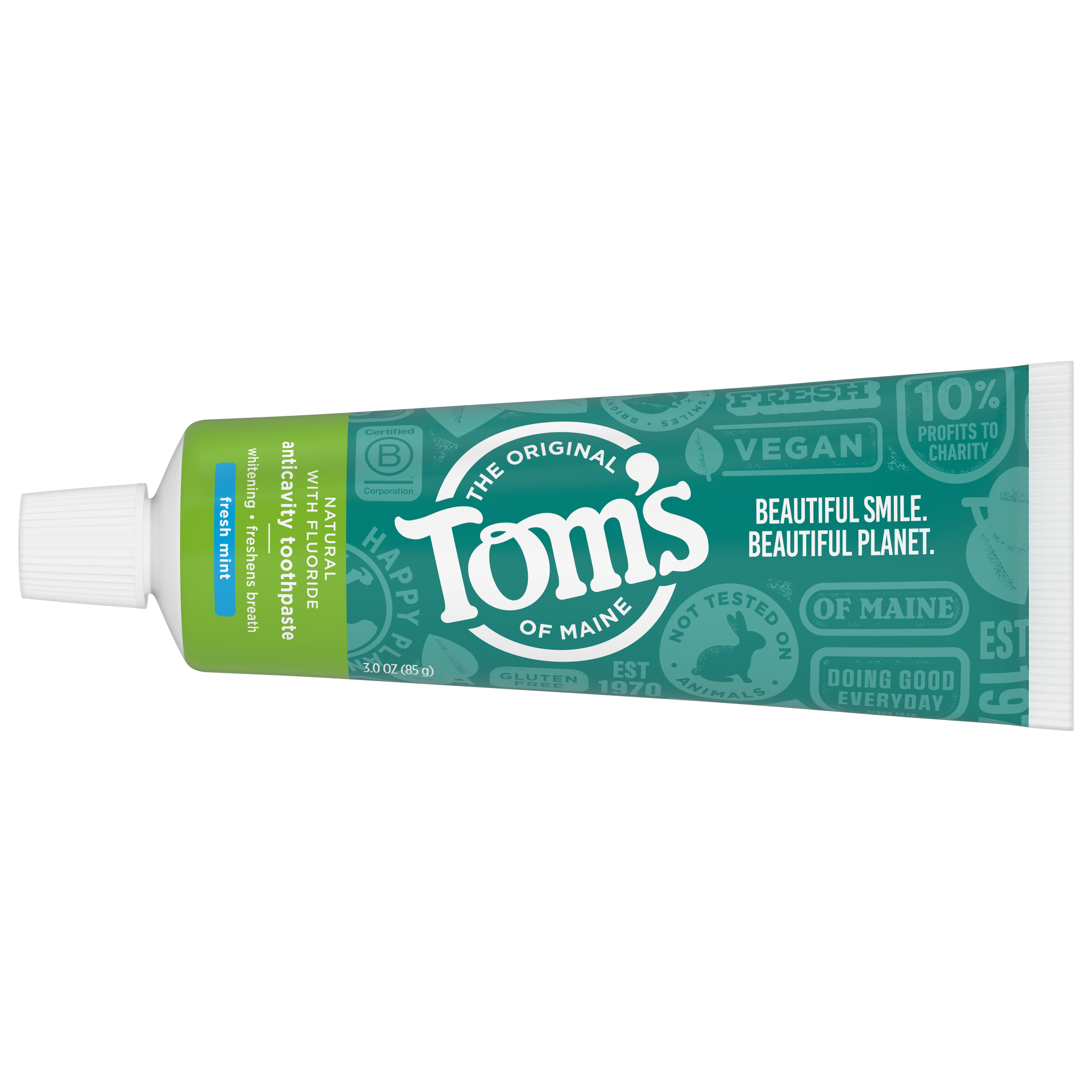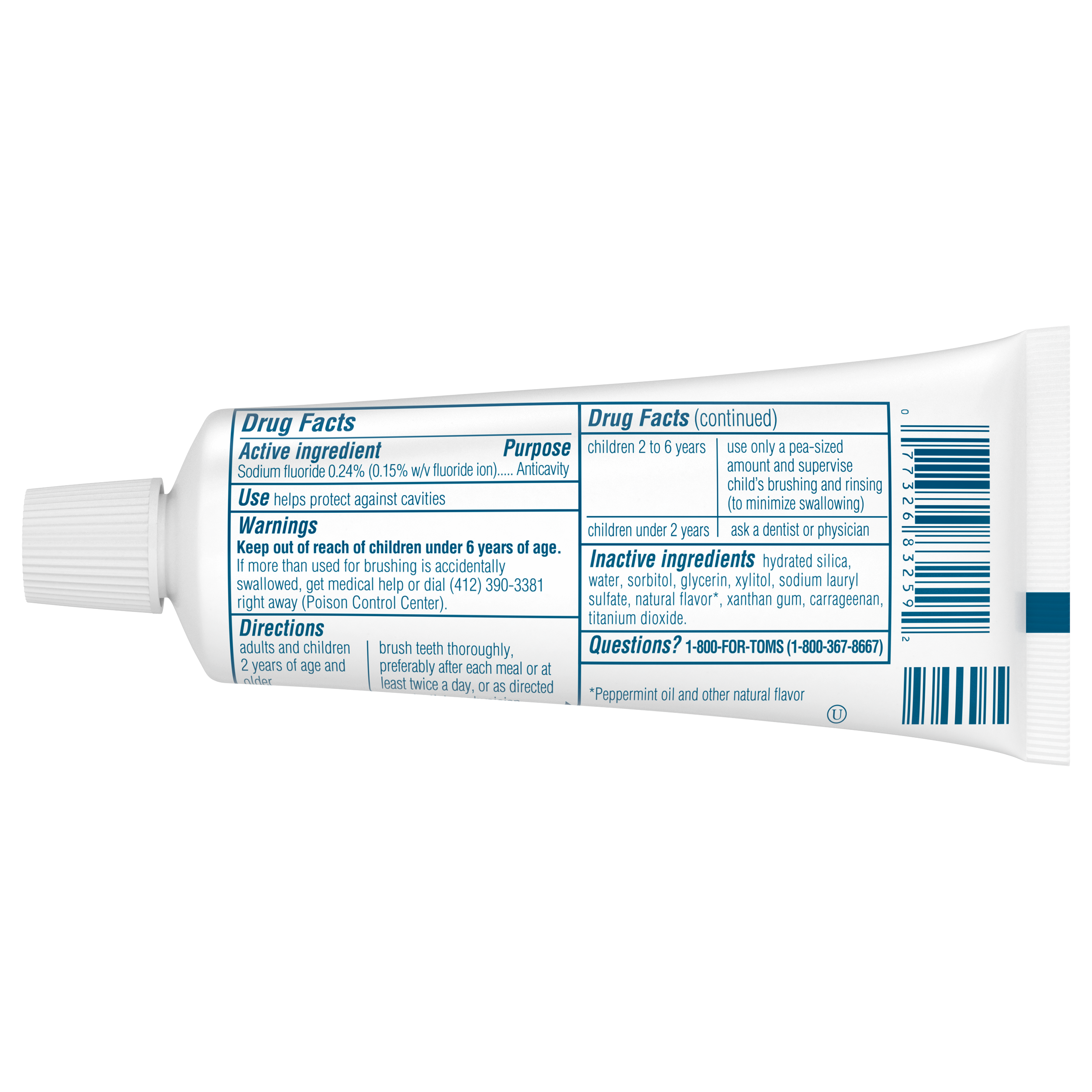 SKU 683259 Consumer Unit - GTIN 00077326832592 Case - GTIN 10077326832599 Product Category Oral Care Product Sub Category Toothpaste Product Equity (Brand) Tom's of Maine Product Sub Brand Tom's Grab & Go TP Product Title Tom's of Maine Travel Size Anticavity Fresh Mint Toothpaste, 3oz Product Description Take Tom's on the road. This great-tasting, everyday natural toothpaste whitens teeth with naturally sourced silicas, helps fight cavities with naturally derived fluoride, and freshens breath with pure peppermint leaf oil. Comes in a 3. ounce, TSA Accepted Travel size, making it the perfect travel companion. eCommerce Copy- Long Description Take Tom's on the road. This great-tasting, everyday natural toothpaste whitens teeth with naturally sourced silicas, helps fight cavities with naturally derived fluoride, and freshens breath with pure peppermint leaf oil. Comes in a 3.0 ounce, TSA Accepted Travel size, making it the perfect travel companion. Bullet 1 No artificial flavors, colors, or preservatives Bullet 2 No animal ingredients Bullet 3 Not tested on animals Bullet 4 Fluoride free Bullet 5 Gluten free Active Ingredients Sodium fluoride 0.24% (0.15% w / v fluoride ion)