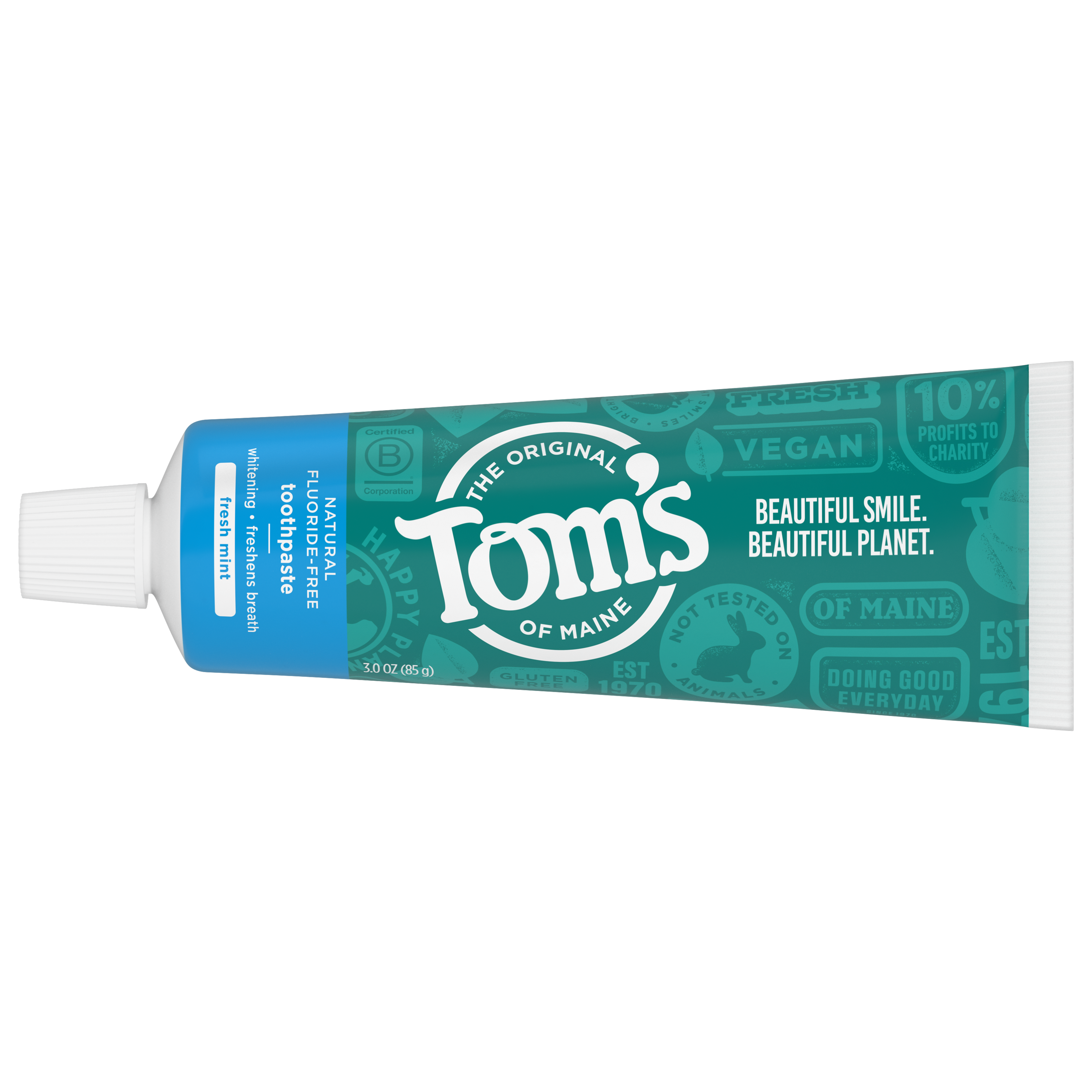 SKU 683260 Consumer Unit - GTIN 00077326832608 Case - GTIN 10077326832605 Product Category Oral Care Product Sub Category Toothpaste Product Equity (Brand) Tom's of Maine Product Sub Brand Tom's Grab & Go TP Product Title Tom's of Maine Travel Size Fluoride-Free Fresh Mint Toothpaste, 3oz Product Description Take Tom's on the road. This great-tasting, everyday natural toothpaste whitens teeth with naturally sourced silicas and freshens breath with pure peppermint leaf oil. And it's fluoride-free. Comes in a 3. ounce, TSA Accepted Travel size, making it the perfect travel companion. We produce this toothpaste without fluoride because we respect our customers' diverse needs and interests. eCommerce Copy- Long Description Take Tom's on the road. This great-tasting, everyday natural toothpaste whitens teeth with naturally sourced silicas and freshens breath with pure peppermint leaf oil. And it's fluoride-free. Comes in a 3.0 ounce, TSA Accepted Travel size, making it the perfect travel companion. We produce this toothpaste without fluoride because we respect our customers' diverse needs and interests. Bullet 1 No artificial flavors, colors, or preservatives Bullet 2 No animal ingredients Bullet 3 Not tested on animals Bullet 4 Fluoride free Bullet 5 Gluten free