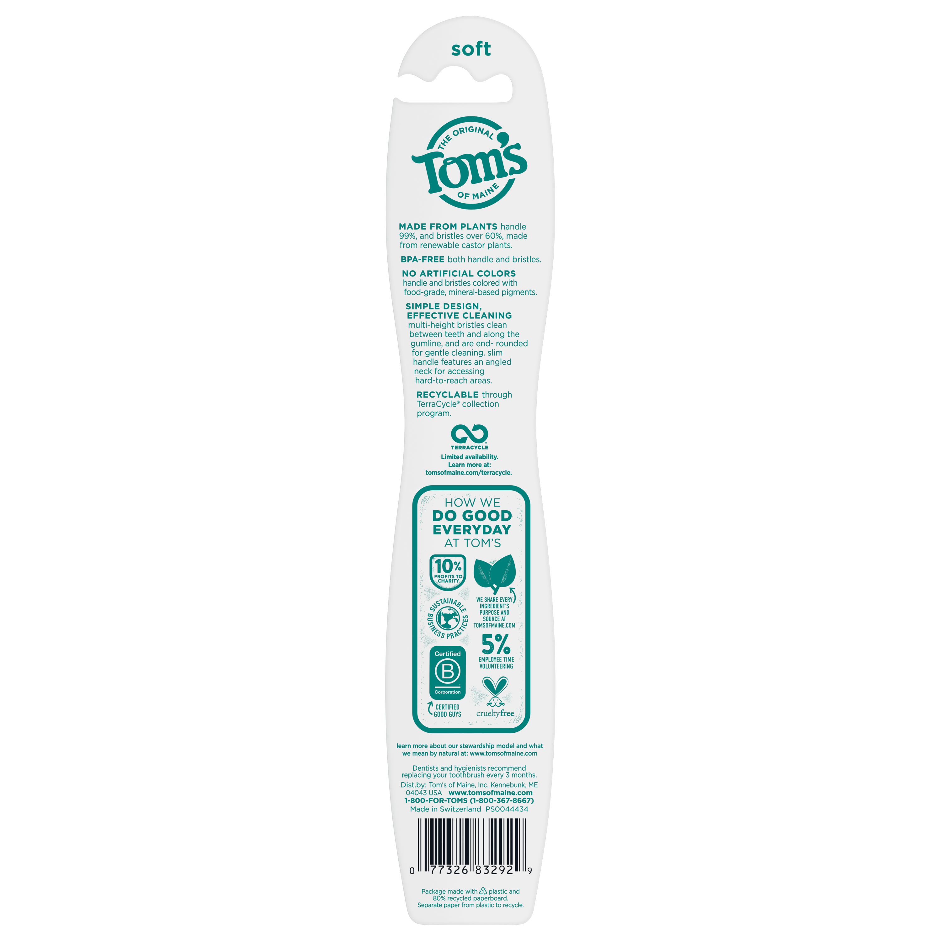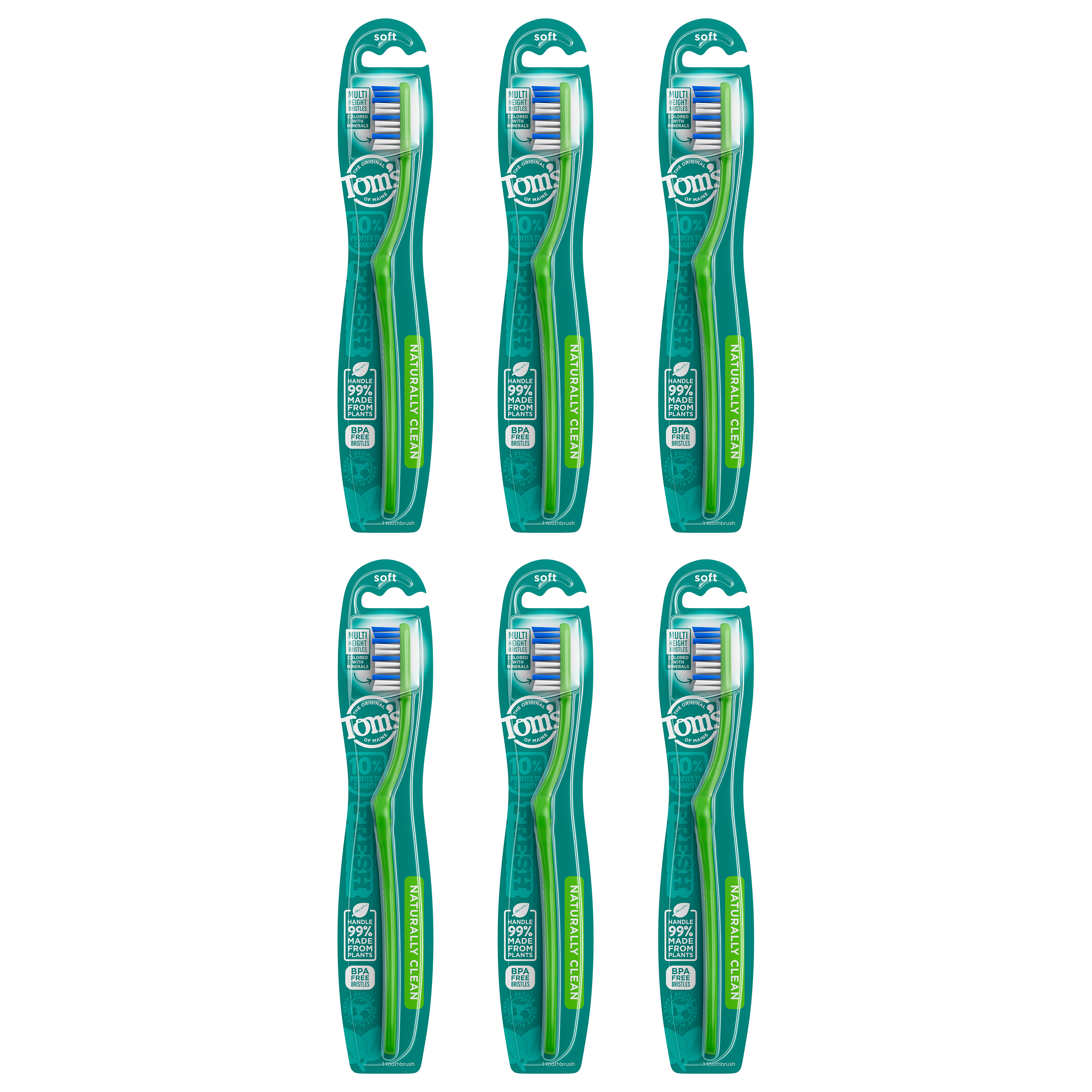 SKU 683292 Consumer Unit - GTIN 00077326832929 Case - GTIN 10077326832926 Product Category Oral Care Product Sub Category Manual TB Product Equity (Brand) Tom's of Maine Product Sub Brand Tom's Man TB Product Title Tom's of Maine Naturally Clean Toothbrush, Soft, 6-Pack eCommerce Copy- Long Description Tom's of Maine Naturally Clean Toothbrush gives you many reasons to smile. The angled neck and multi-height bristles effectively clean teeth and remove plaque. Each handle is made from renewable castor oil plants and the soft bristles are BPA-free. Plus, the toothbrush can be recycled through Tom's of Maine TerraCycle collection program. Order Tom's of Maine toothbrushes, and try their other natural dental care products. Tom's of Maine products use only ingredients that meet its stewardship standards for natural, sustainable and responsible, helping empower families to live more naturally. Tom's of Maine is a Certified B Corp and meets the highest standards of social and environmental performance, as well as public transparency. The company donates 10% of profits to charities committed to children's health, education and the environment. Thank you for supporting Tom's of Maine. Bullet 1 WHAT YOU'LL GET: Contains one Tom's of Maine Naturally Clean Toothbrush with Soft Bristles Bullet 2 MADE FROM PLANTS: Natural toothbrush handle is 99% made from renewable castor oil plants Bullet 3 CLEANS TEETH & GUMS: Angled neck and multi-height bristles effectively clean between teeth and along gumline Bullet 4 RECYCLABLE TOOTHBRUSH: Can be recycled through the Tom's of Maine TerraCycle collection program Bullet 5 TAKE CARE OF YOURSELF NATURALLY: Each toothbrush is BPA-free and contains no artificial colors for dye-free bristles Amazon RPC B01F3FOCBY AMZ URL https://www.amazon.com/dp/B01F3FOCBY